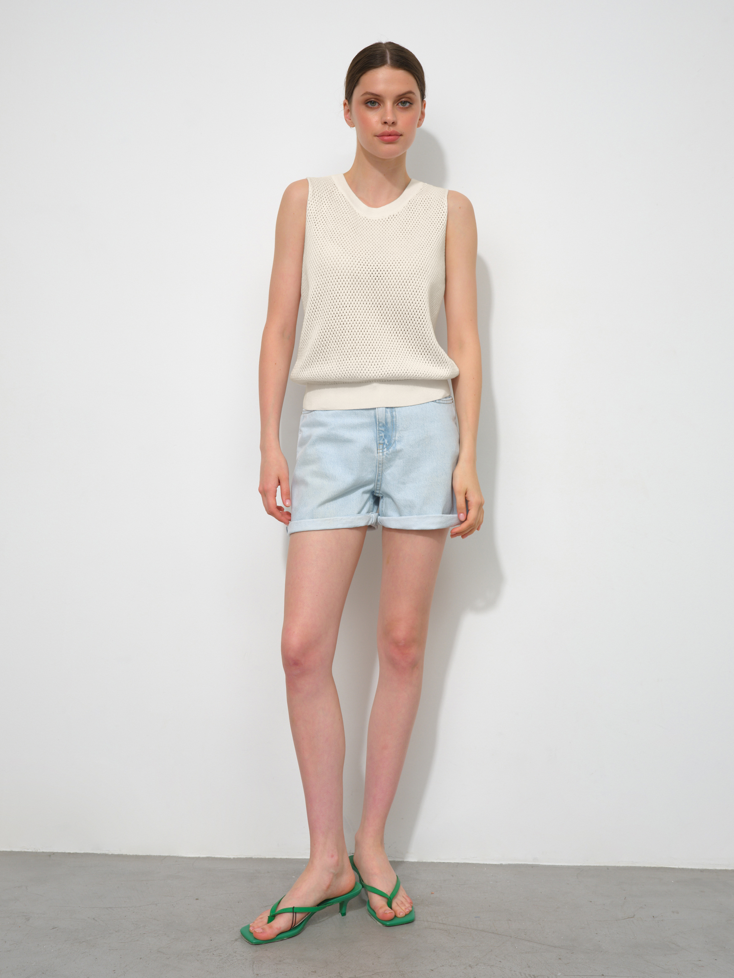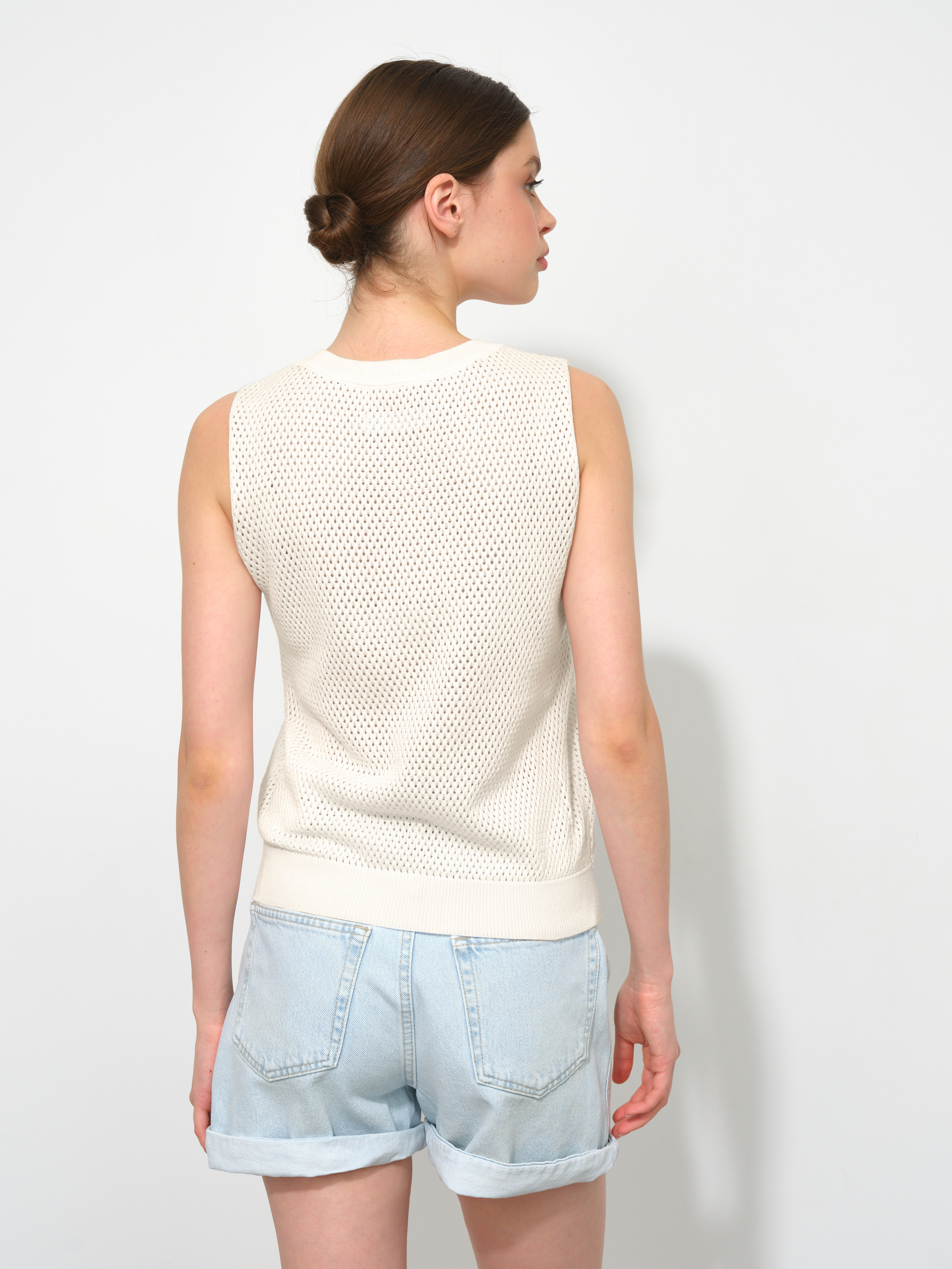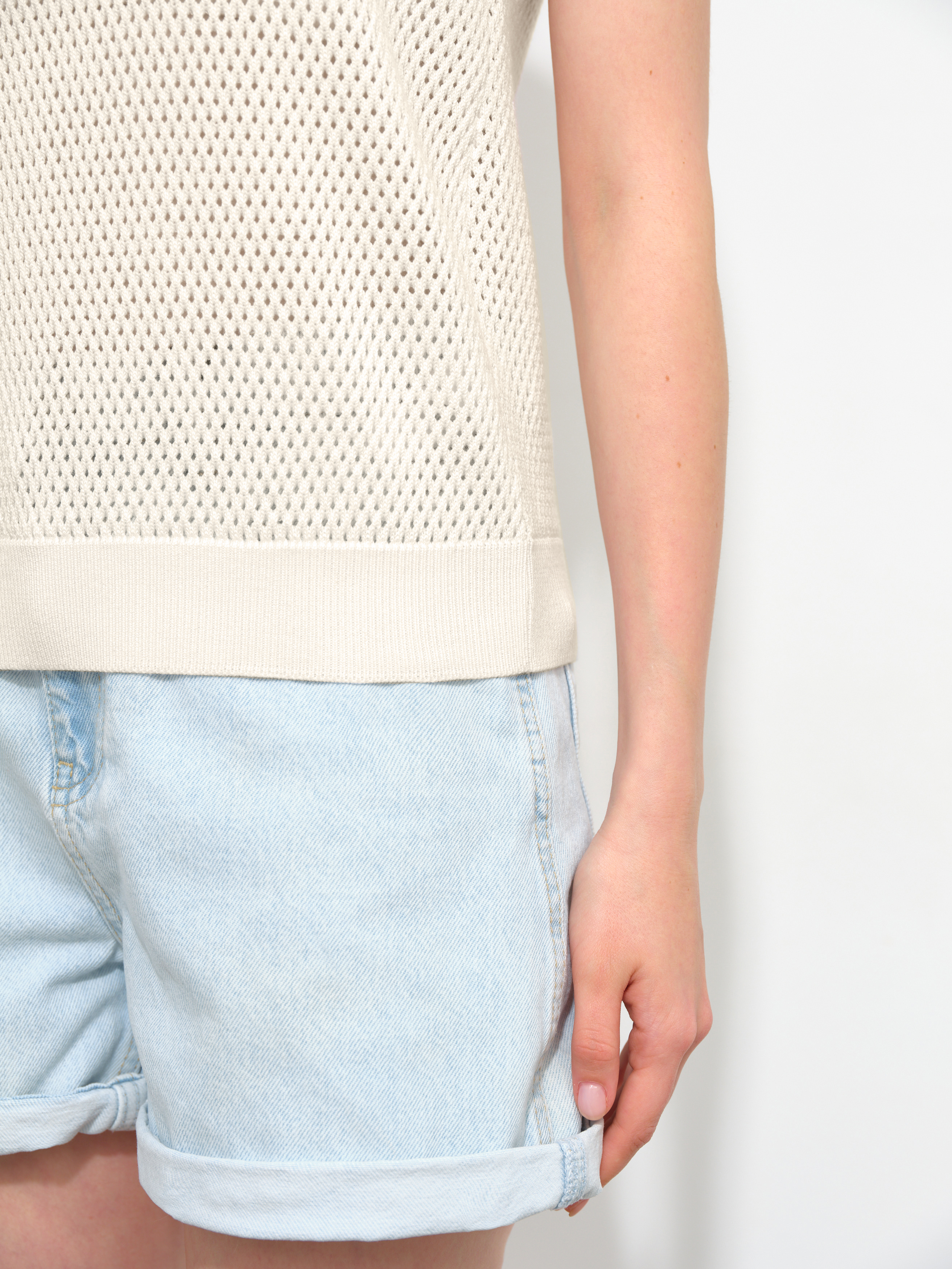 Ваш пропуск в лето – трикотажный перфорированный топ из натурального хлопка-премиум. Выделяется на фоне текстильных маечек сетчатой текстурой и способностью моделировать сексуальный силуэт без облегания. Максимальные дышащие характеристики при минимальном просвечивании. Резинка по нижнему краю позволит скорректировать длину посадки под себя. Идеальные пары образует со свободными круизными брюками и юбками-миди из весенней коллекции 99colorspace. Прекрасен в качестве нижнего слоя под плотные осенние жакеты.