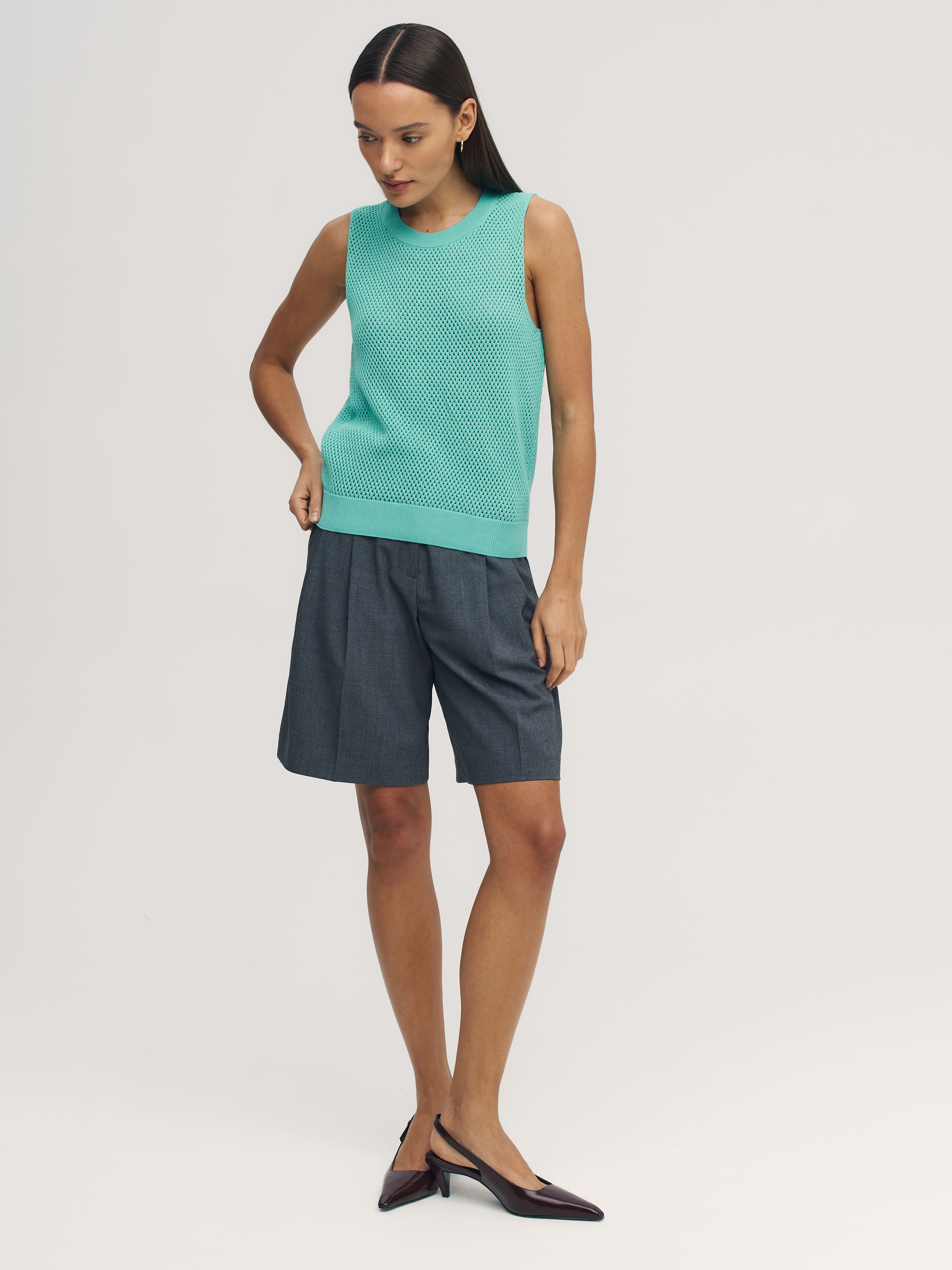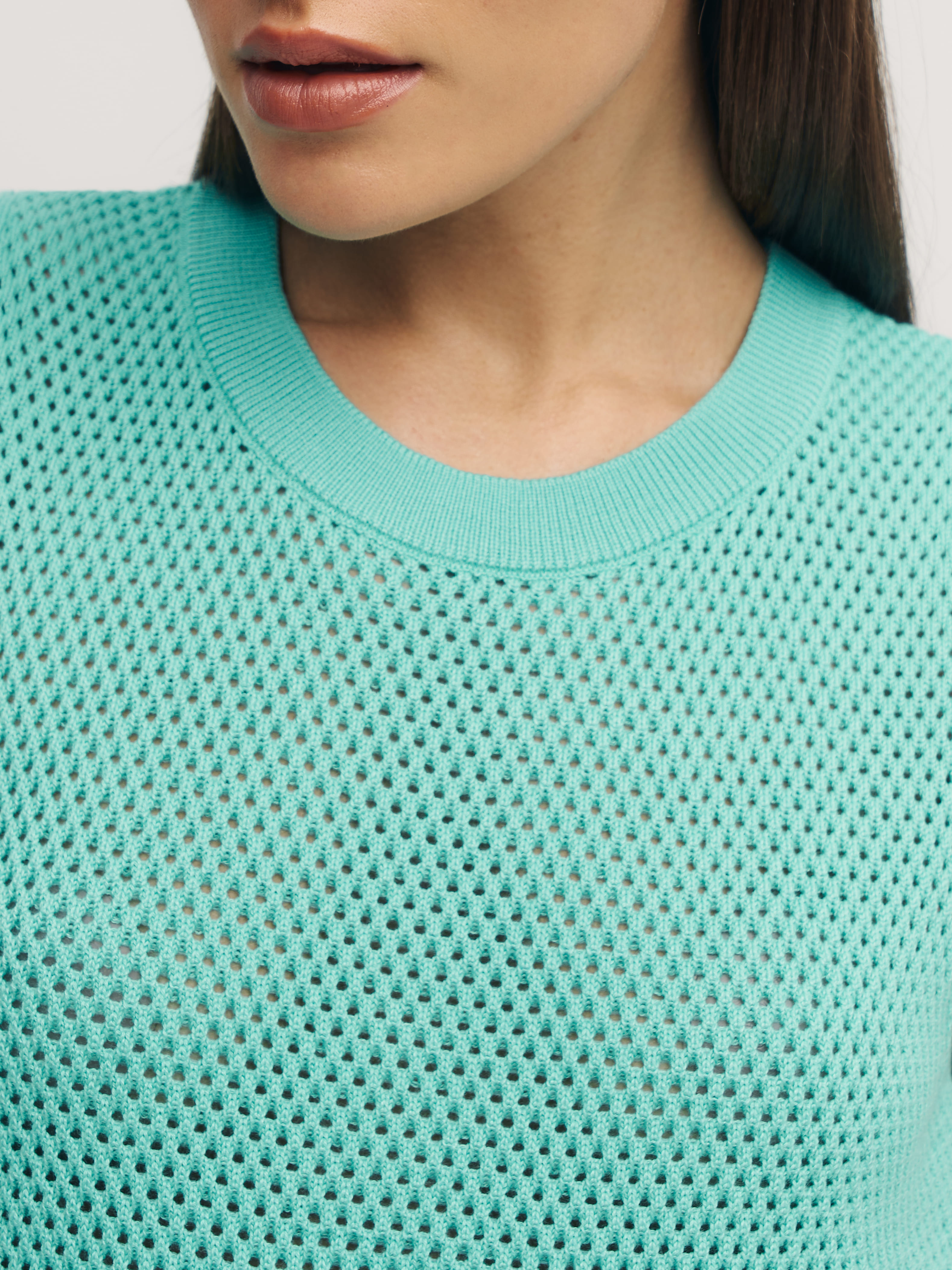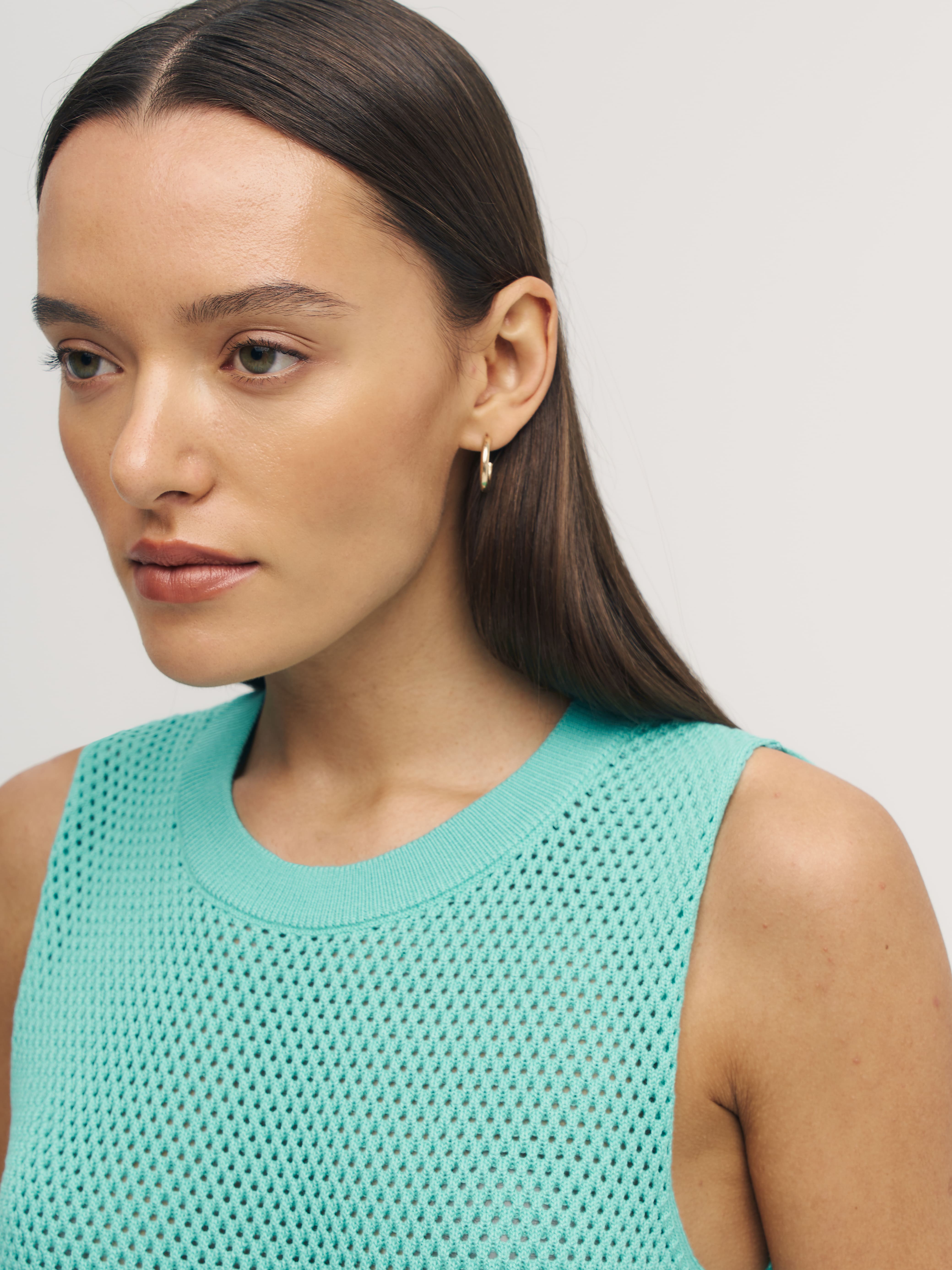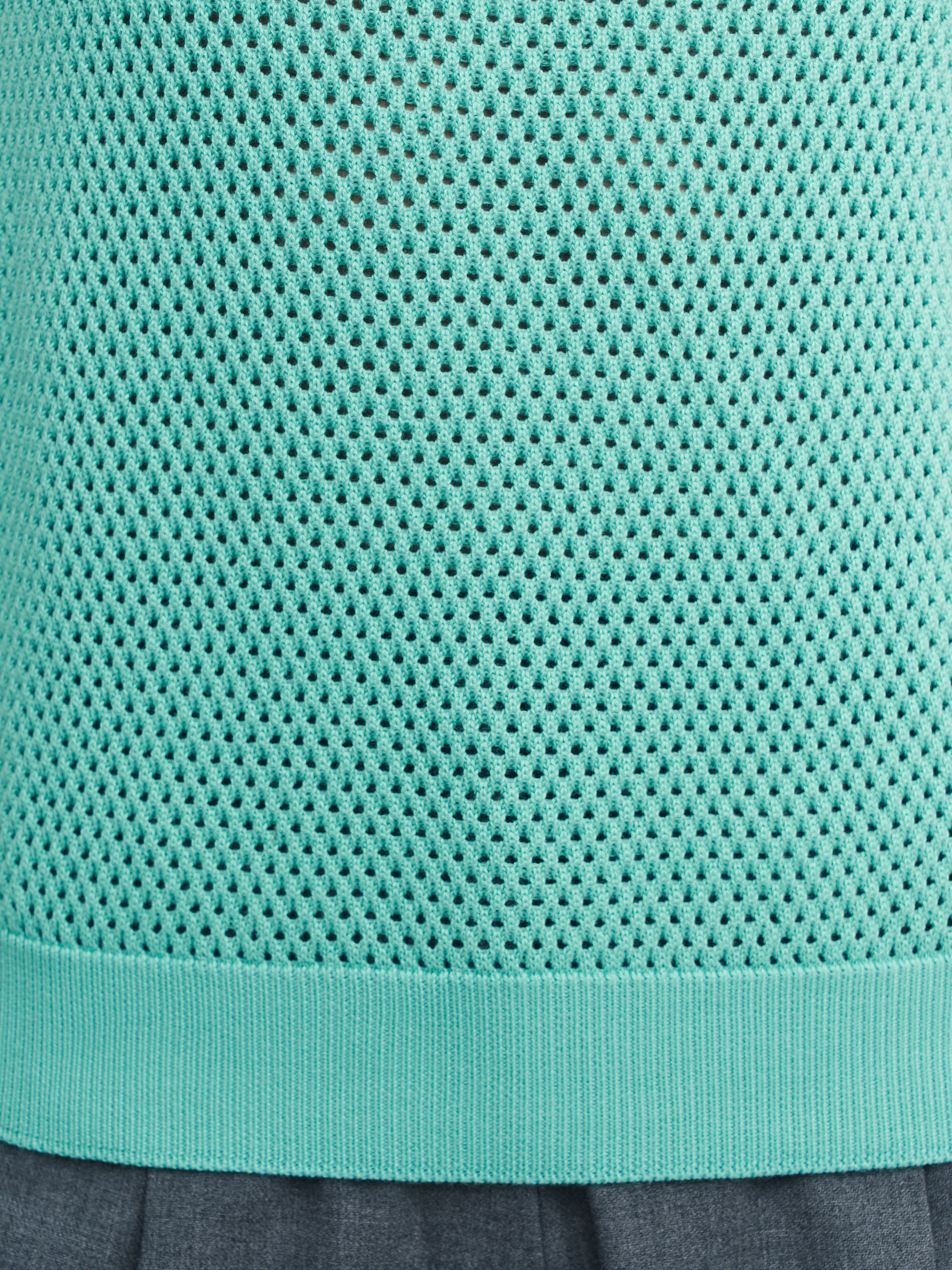 Ваш пропуск в лето – трикотажный перфорированный топ из натурального хлопка-премиум. Выделяется на фоне текстильных маечек сетчатой текстурой и способностью моделировать сексуальный силуэт без облегания. Максимальные дышащие характеристики при минимальном просвечивании. Резинка по нижнему краю позволит скорректировать длину посадки под себя. Идеальные пары образует со свободными круизными брюками и юбками-миди из весенней коллекции 99colorspace. Прекрасен в качестве нижнего слоя под плотные осенние жакеты.