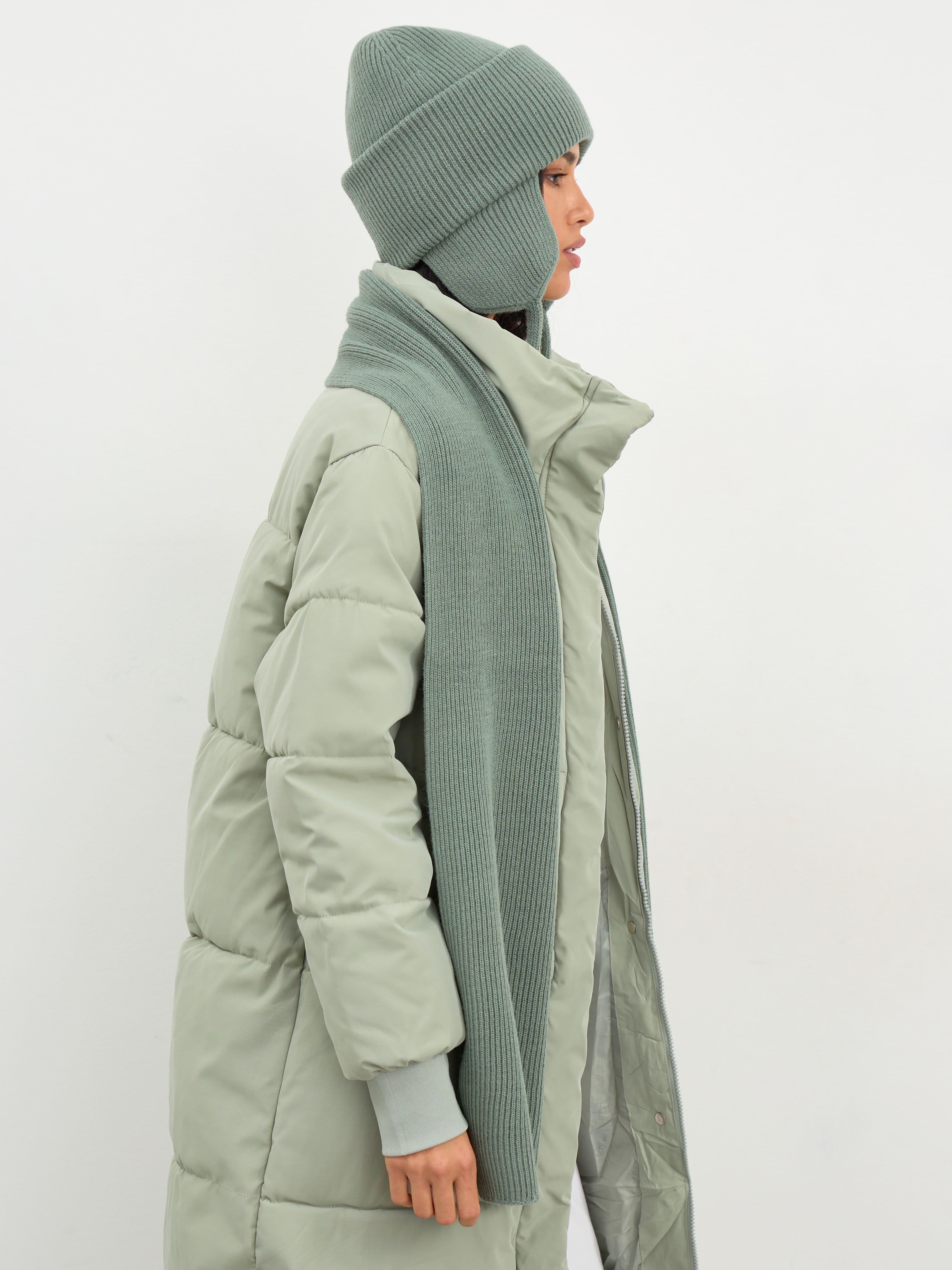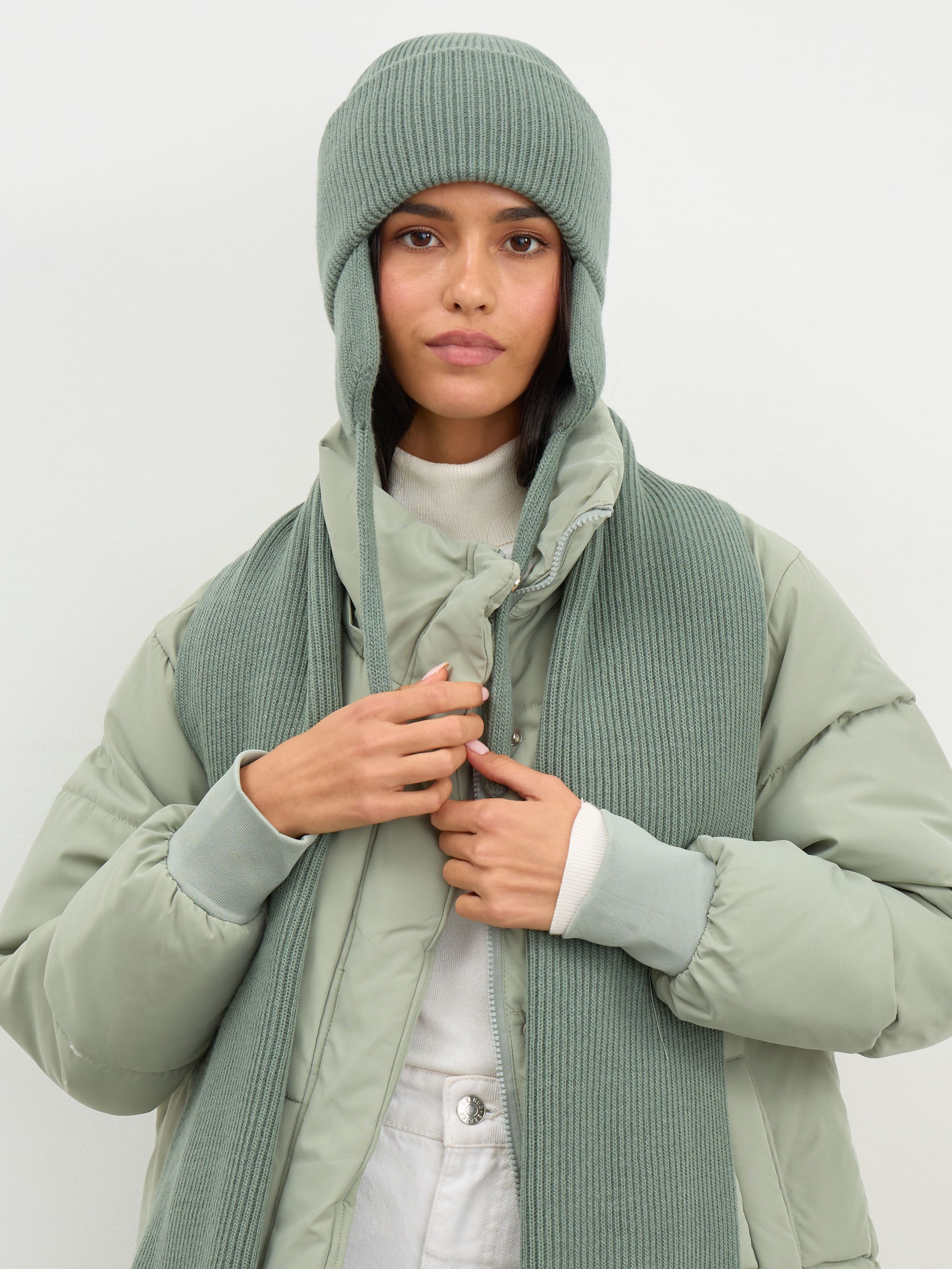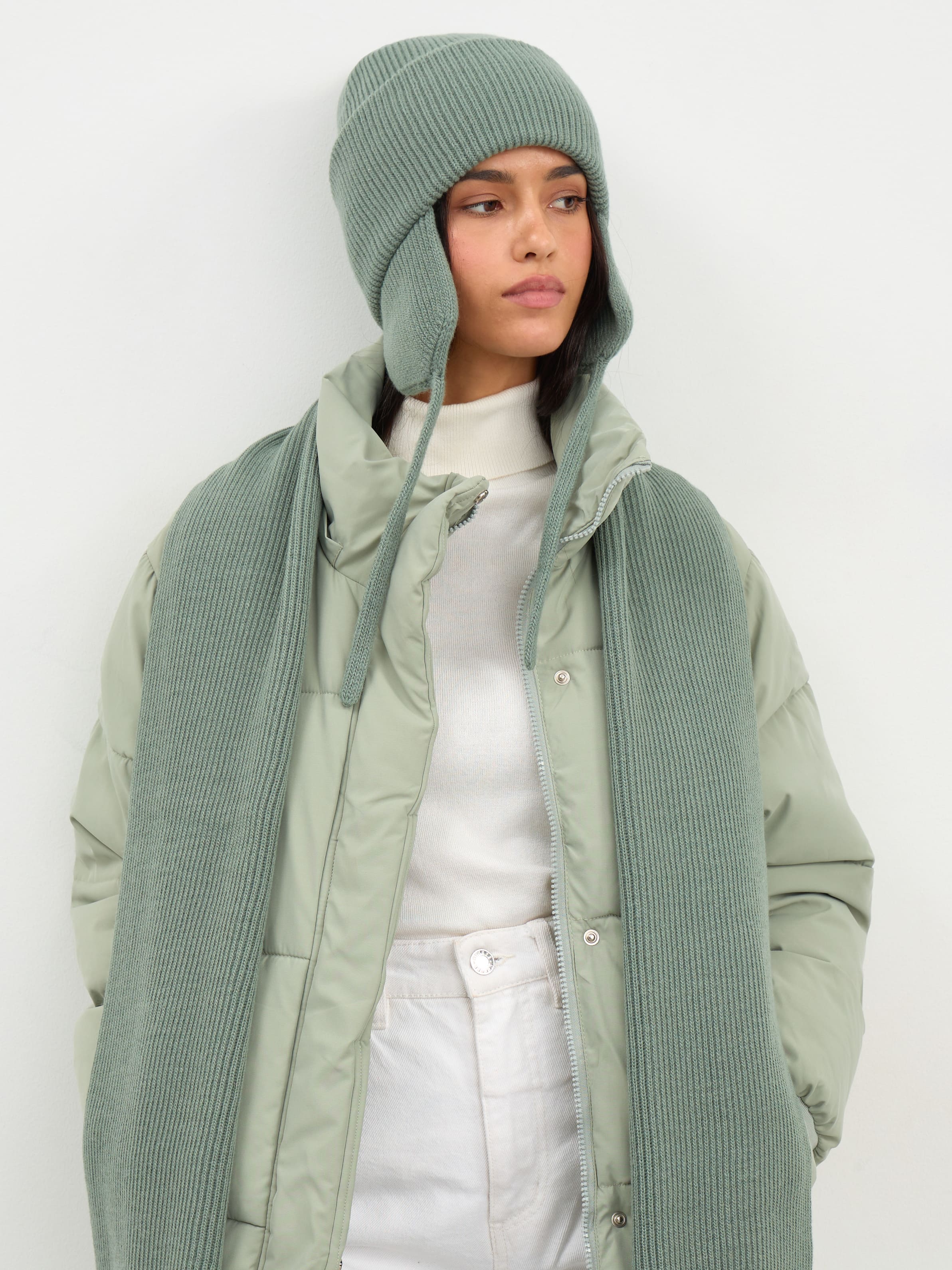 Необычность этого зимнего комплекта из чесаной шерсти заключается в одной детали – милых ушках на шапке. Мы добавили их по просьбам поклонниц бренда, которые хотели максимально защищающий головной убор для ветреной погоды. При этом мы сохранили на шапке бини отворот, дающий дополнительное утепление. Длина шарфа позволяет уложить его в несколько оборотов вокруг шеи.