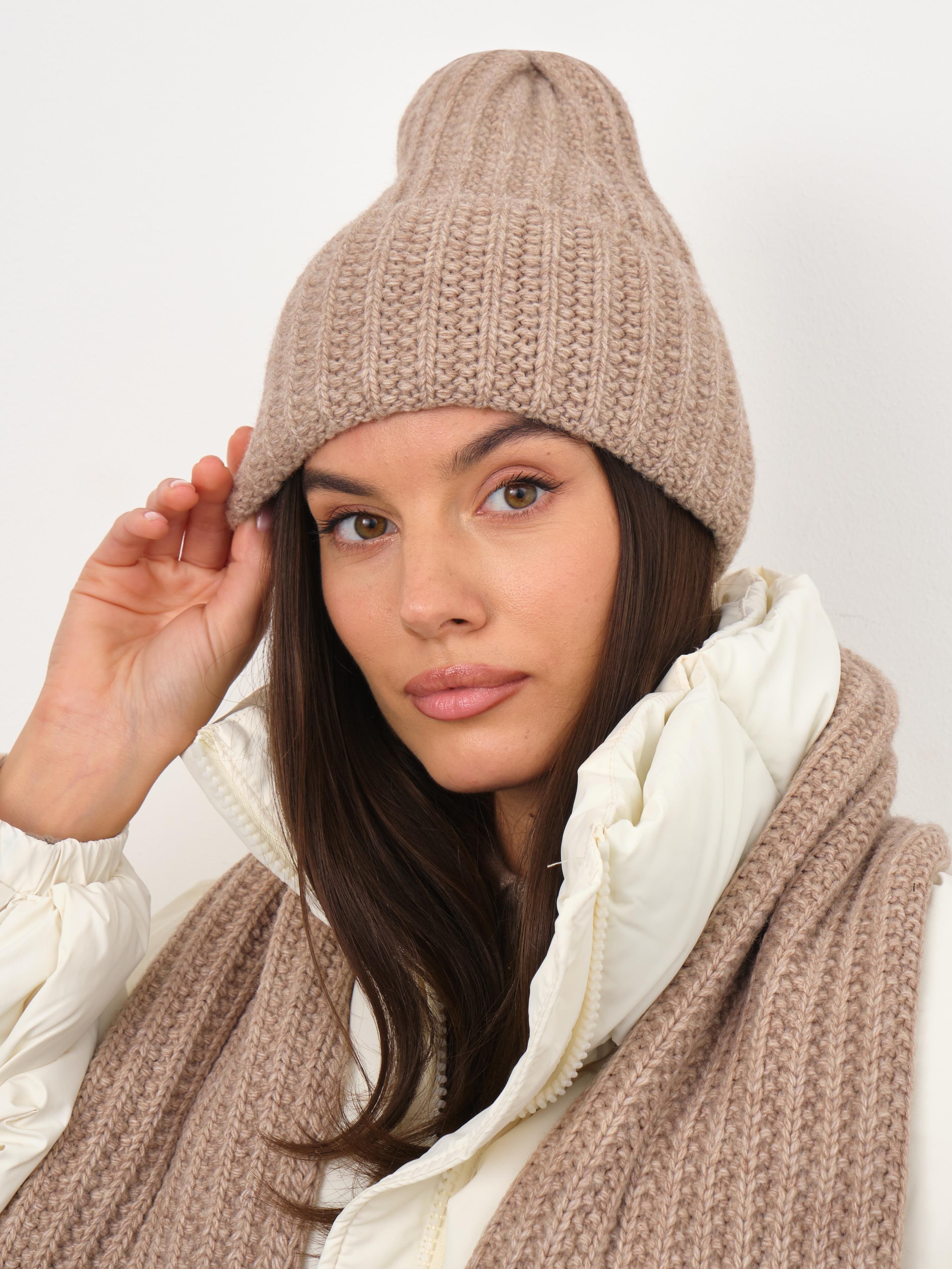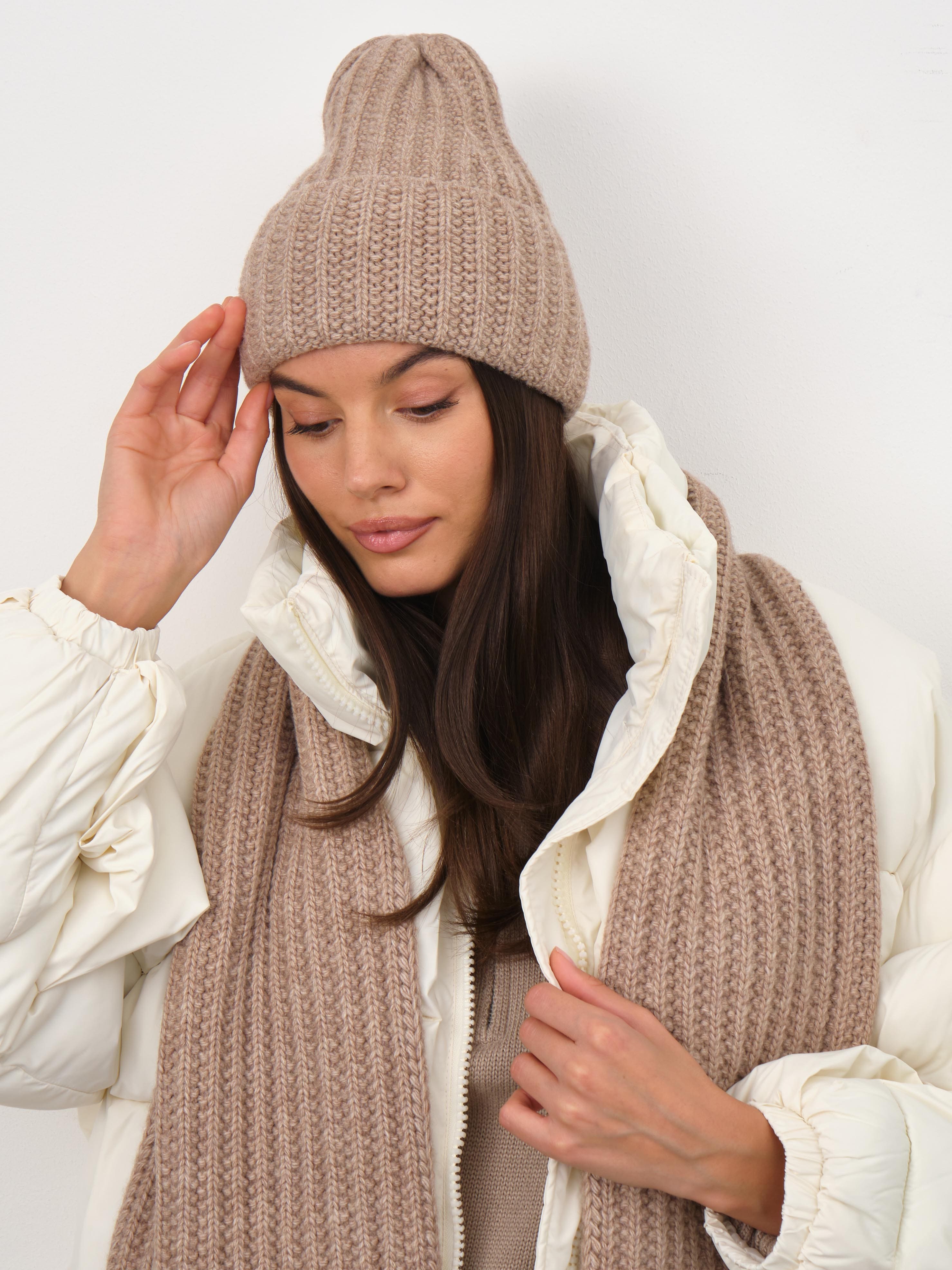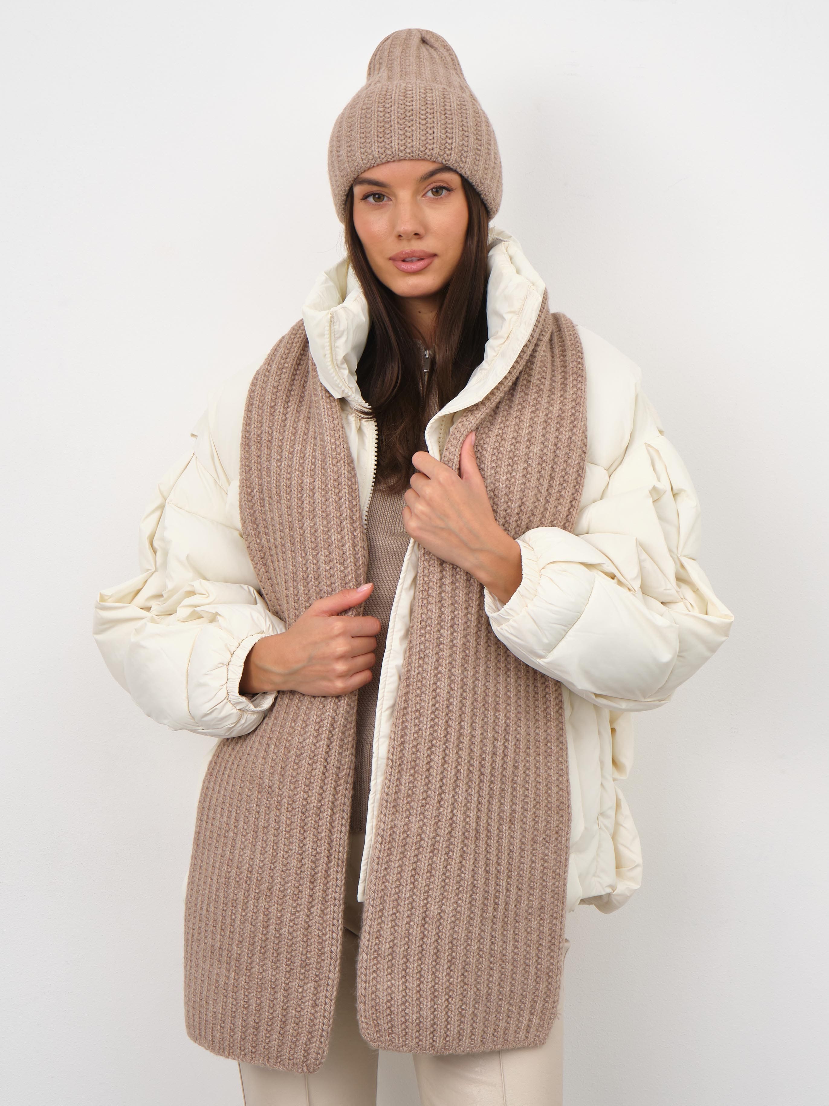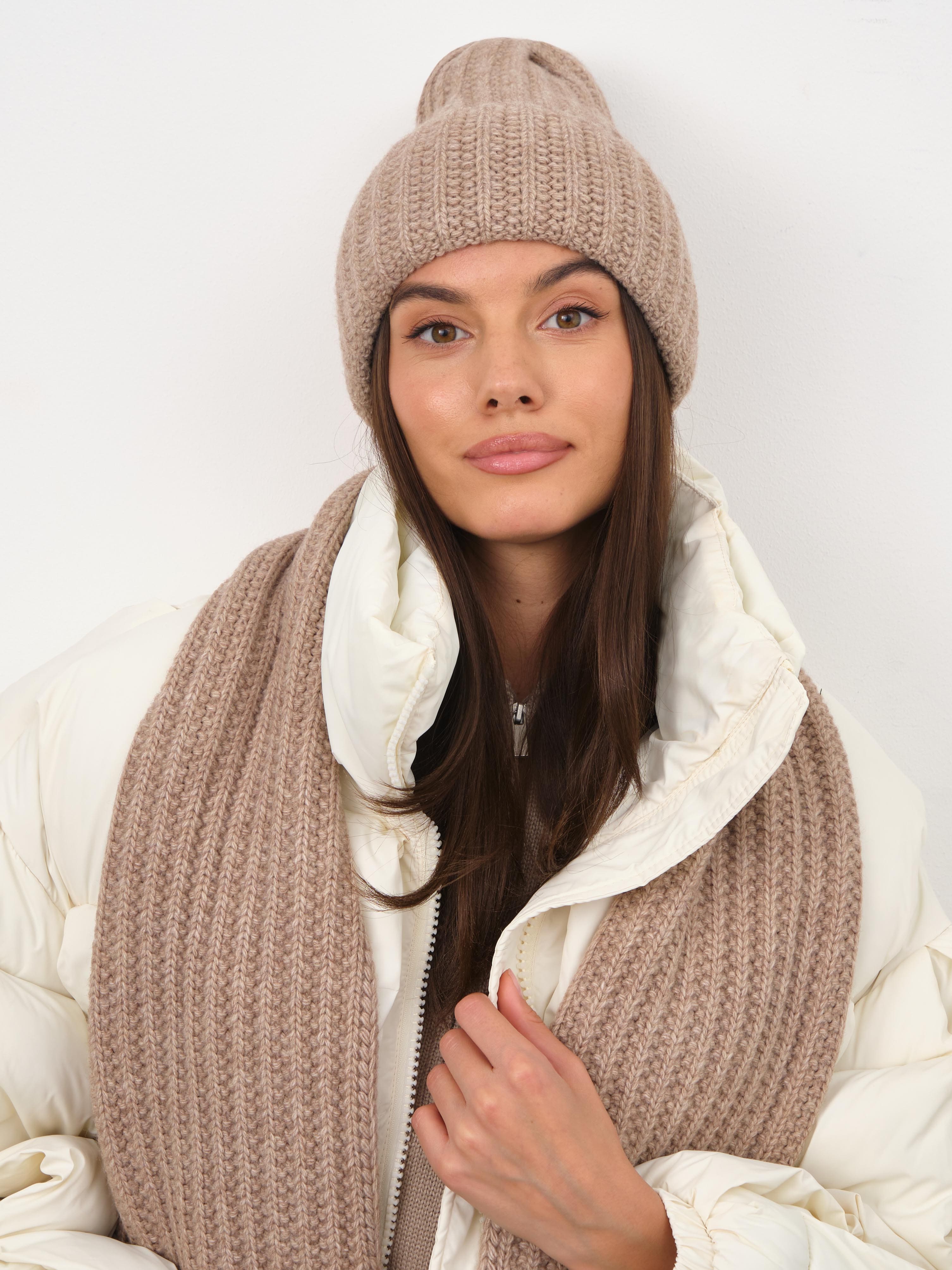 Этот уютный фактурный комплект мы посвятили самым холодным зимним дням. Длительный согревающий эффект в нем создает шерсть тонкорунного мериноса. Ее волокна отлично хранят тепло, позволяя воздуху свободно циркулировать между вязаными петельками. В таких вещах можно часами гулять по городу и зажигать на горнолыжном курорте – холодно точно не будет. Длина шарфа позволяет уложить его в несколько оборотов вокруг шеи. Бини-тыковка с вытянутой макушкой – это возможность стянуть волосы в пучок и полностью спрятать под шапкой.