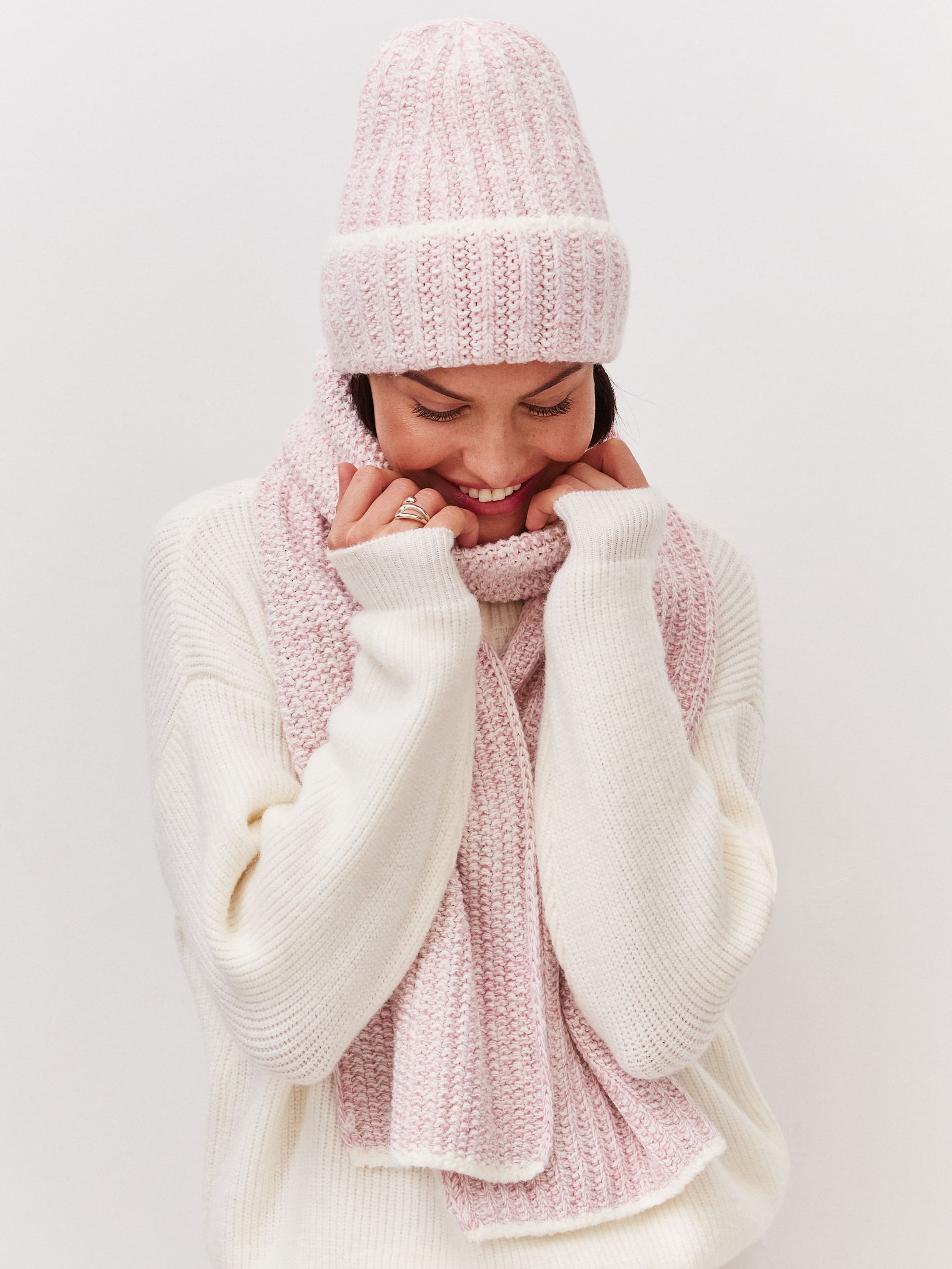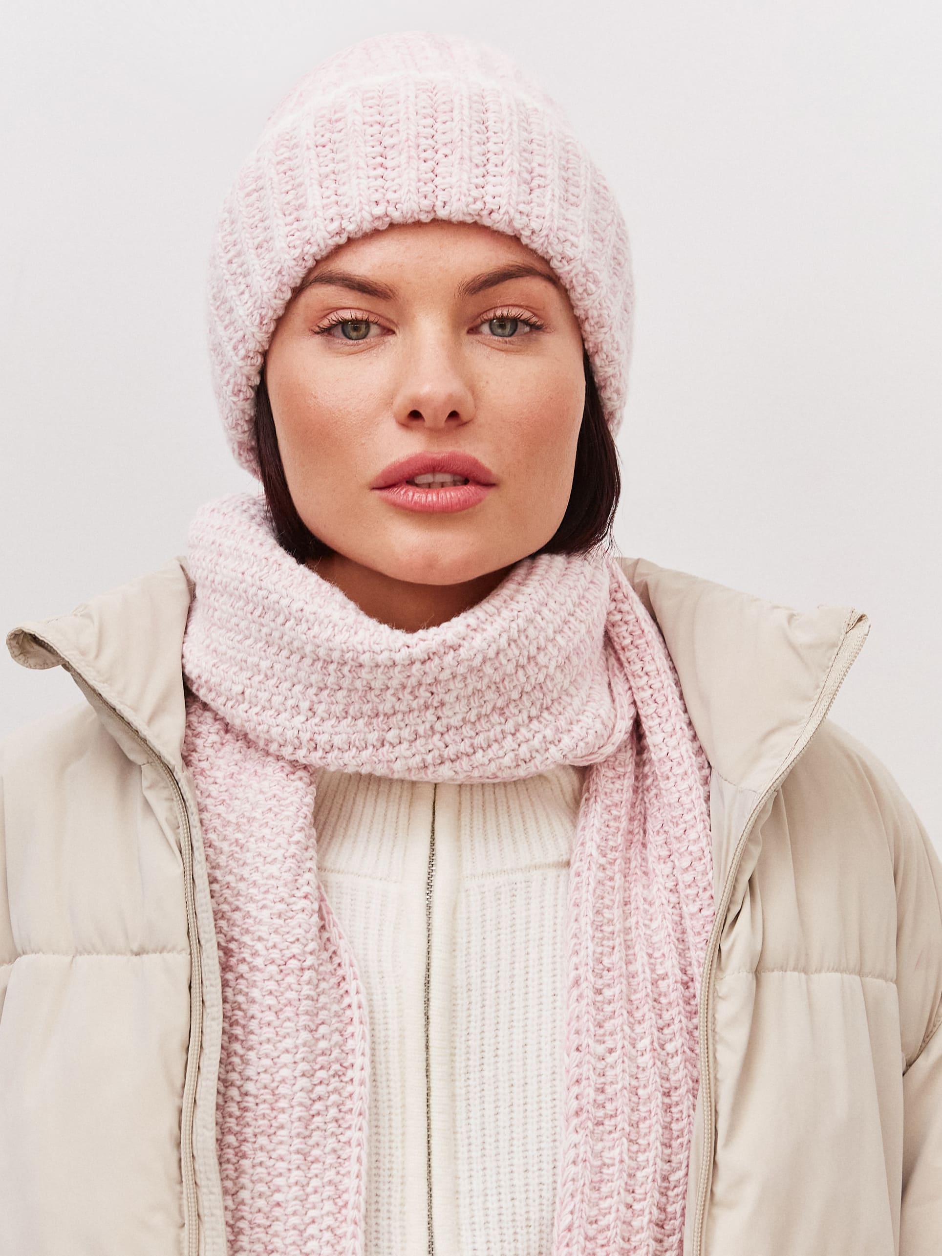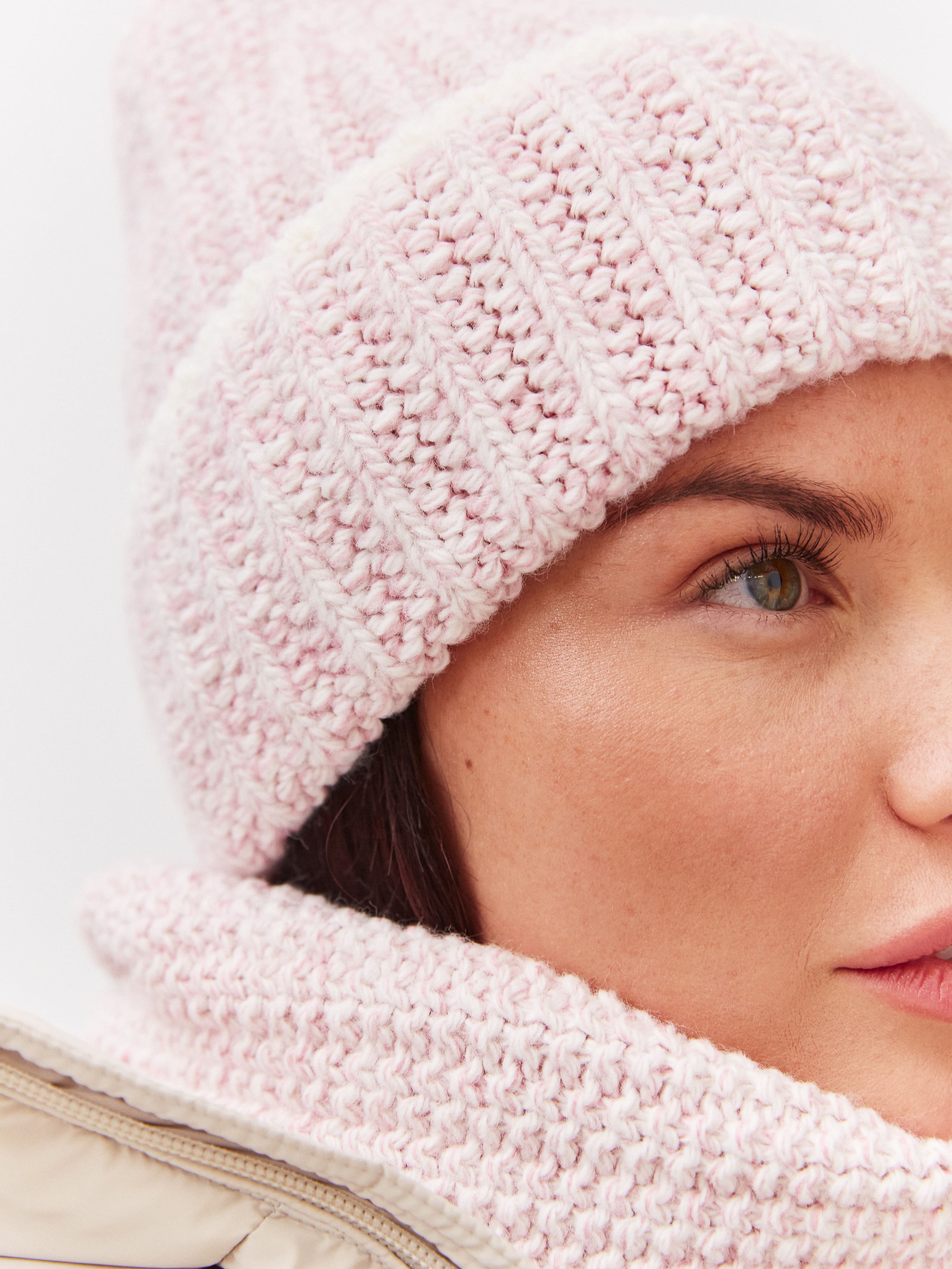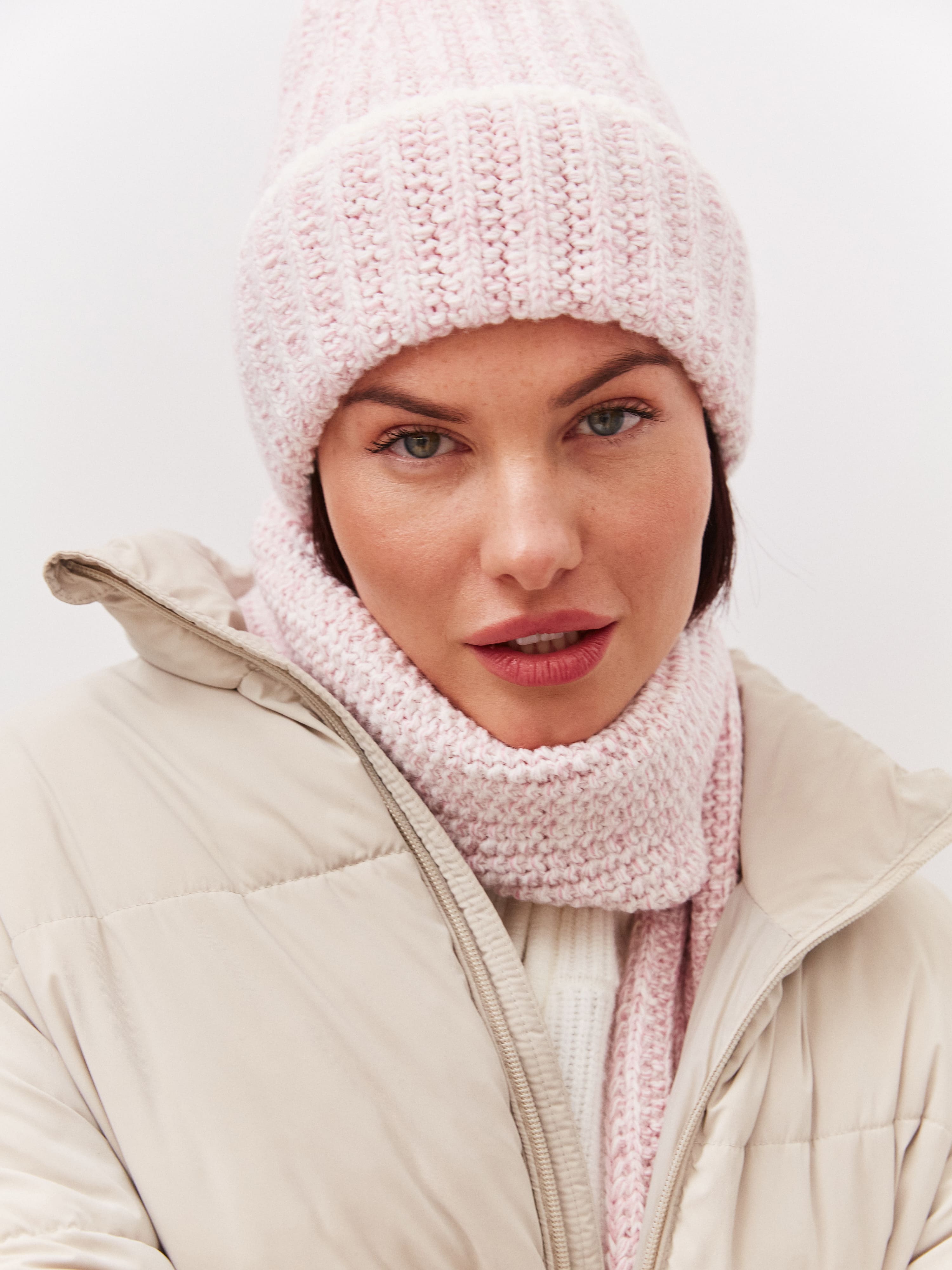 Этот уютный фактурный комплект мы посвятили самым холодным зимним дням. Длительный согревающий эффект в нем создает шерсть тонкорунного мериноса. Ее волокна отлично хранят тепло, позволяя воздуху свободно циркулировать между вязаными петельками. В таких вещах можно часами гулять по городу и зажигать на горнолыжном курорте – холодно точно не будет. Длина шарфа позволяет уложить его в несколько оборотов вокруг шеи. Бини-тыковка с вытянутой макушкой – это возможность стянуть волосы в пучок и полностью спрятать под шапкой.