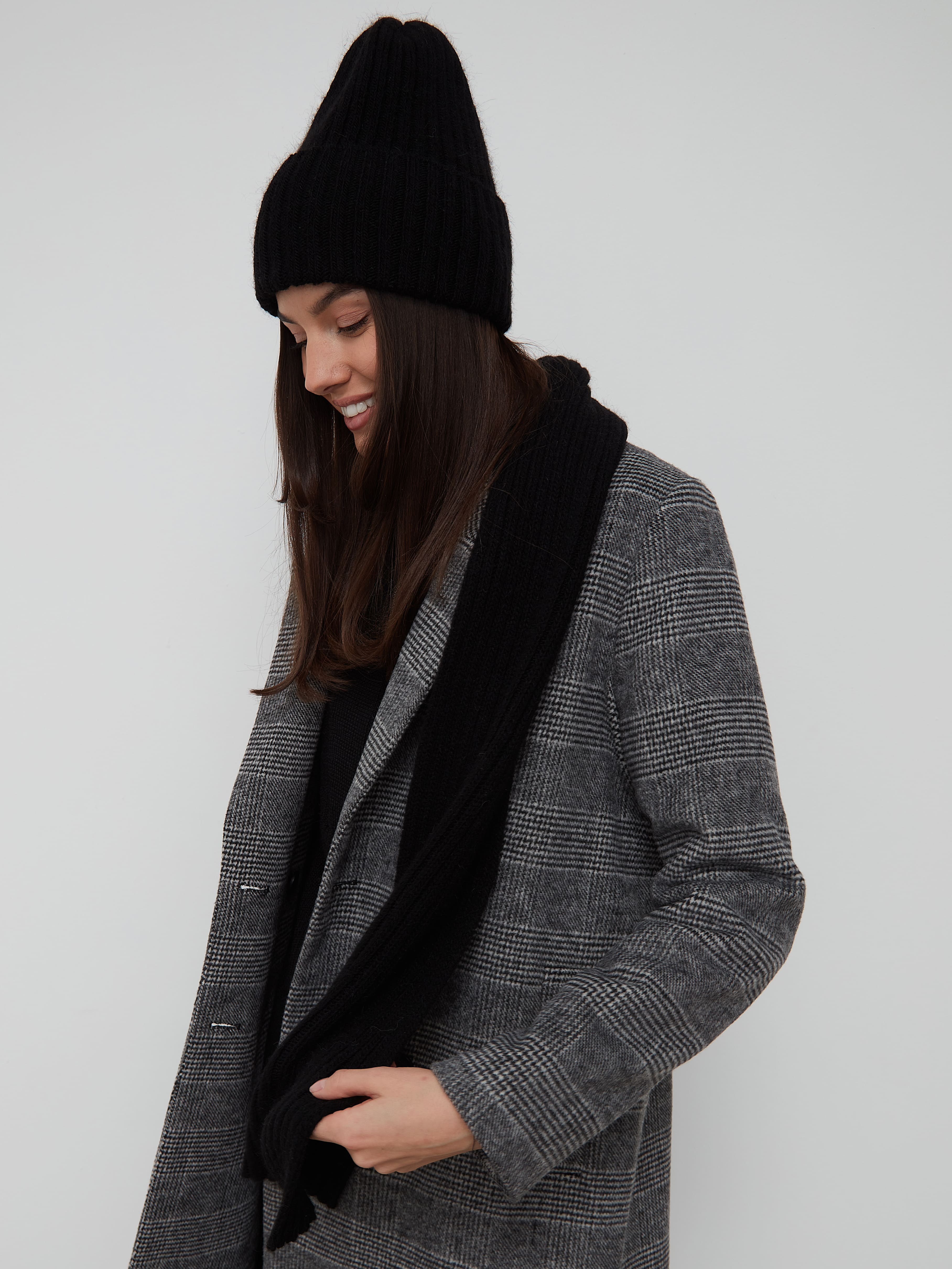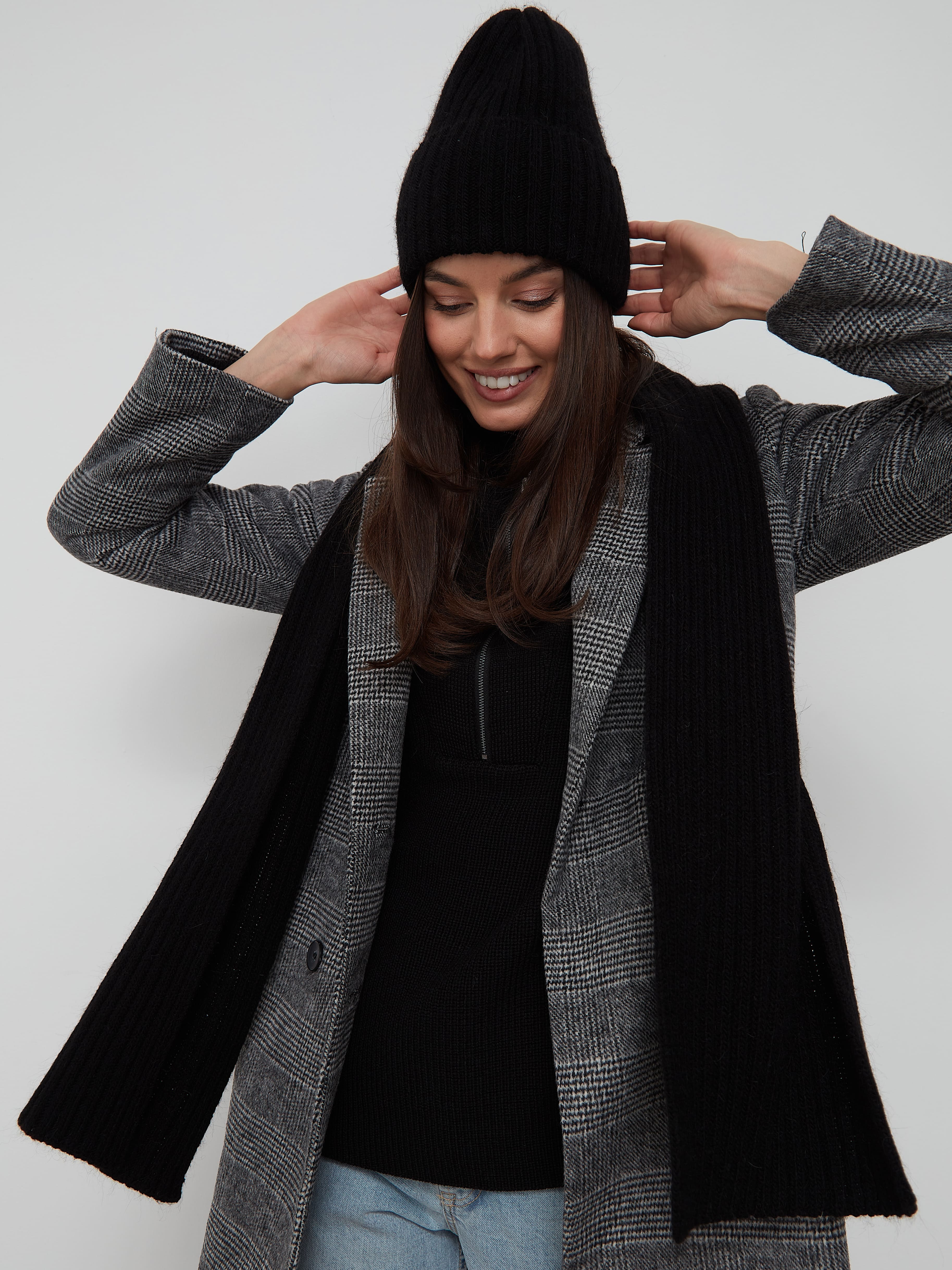 Трикотажный комплект: однослойная яркая шапка, в меру объемная и высокая за счет отворота, ширину которого можно регулировать, с шарфиком создадут трендовый ансамбль, который добавит выразительности любому аутфиту для повседневной носки.