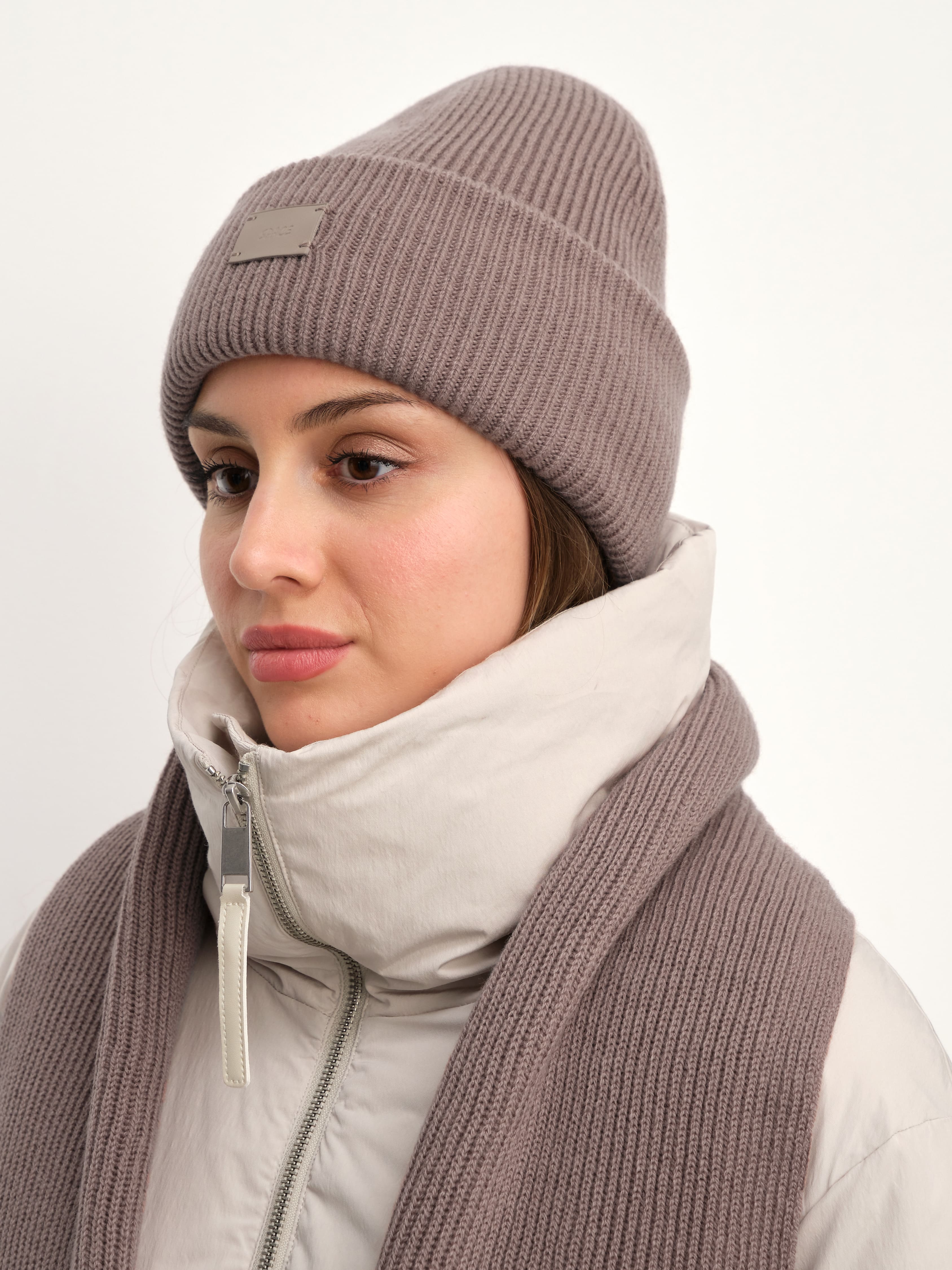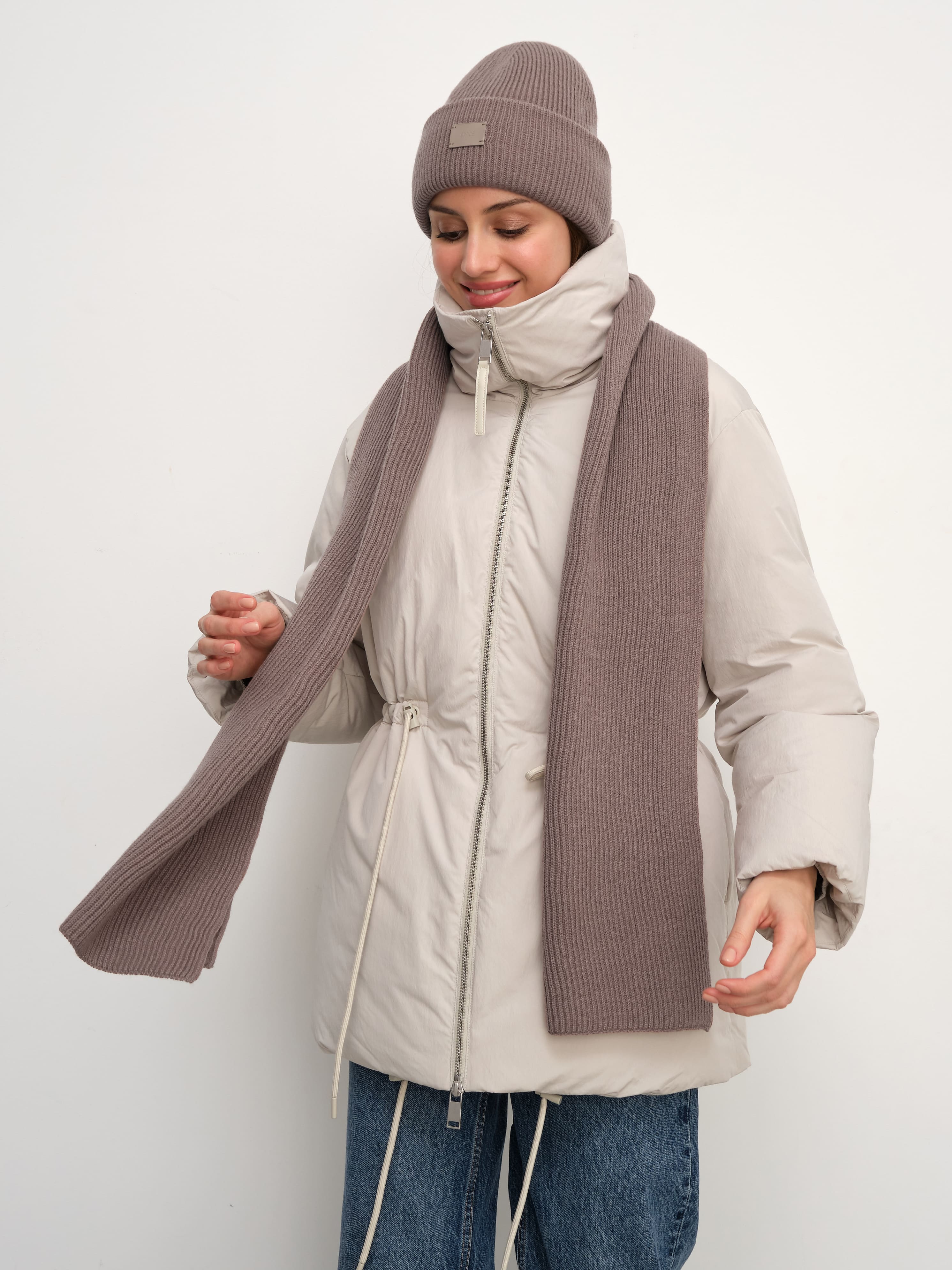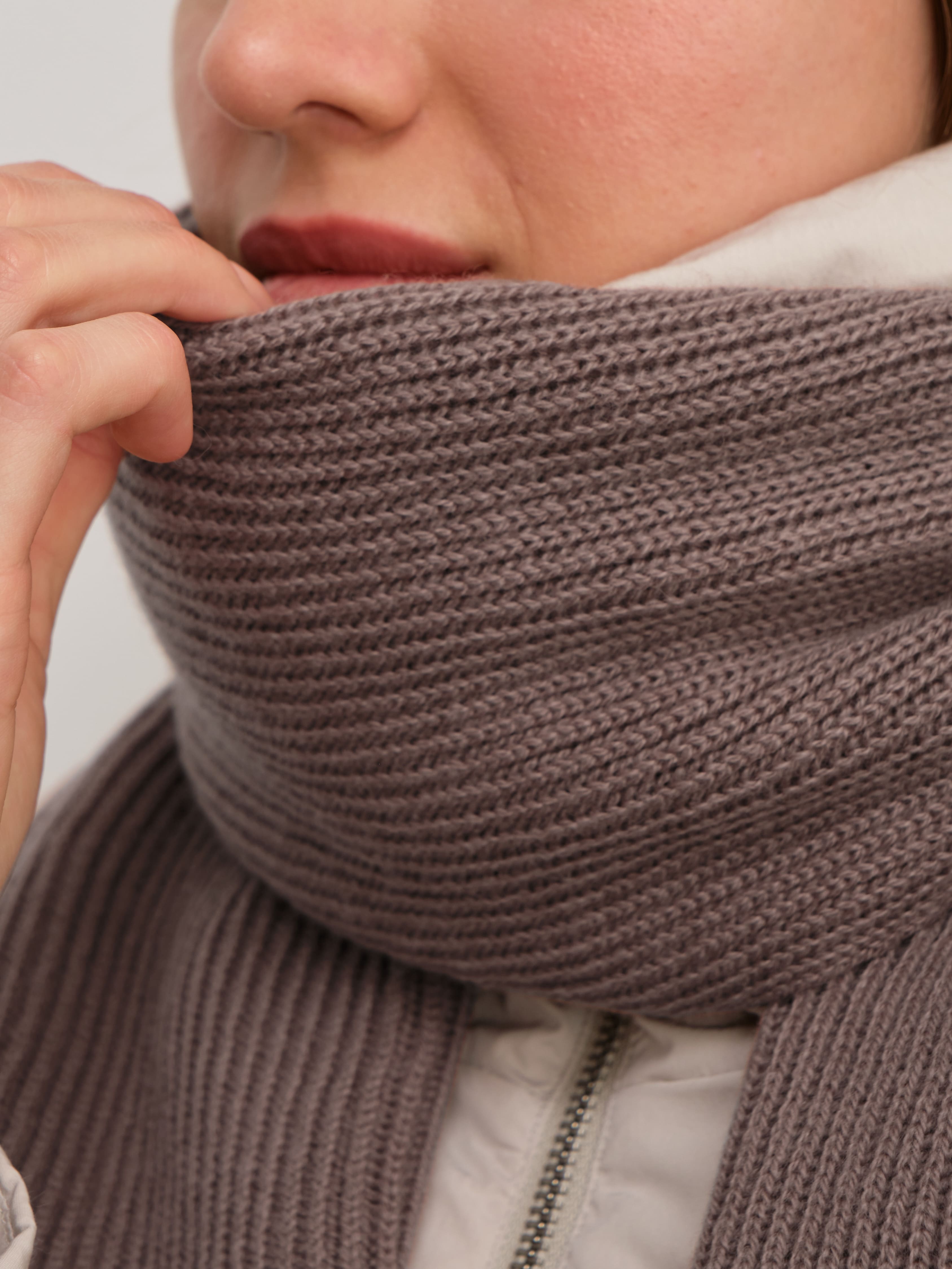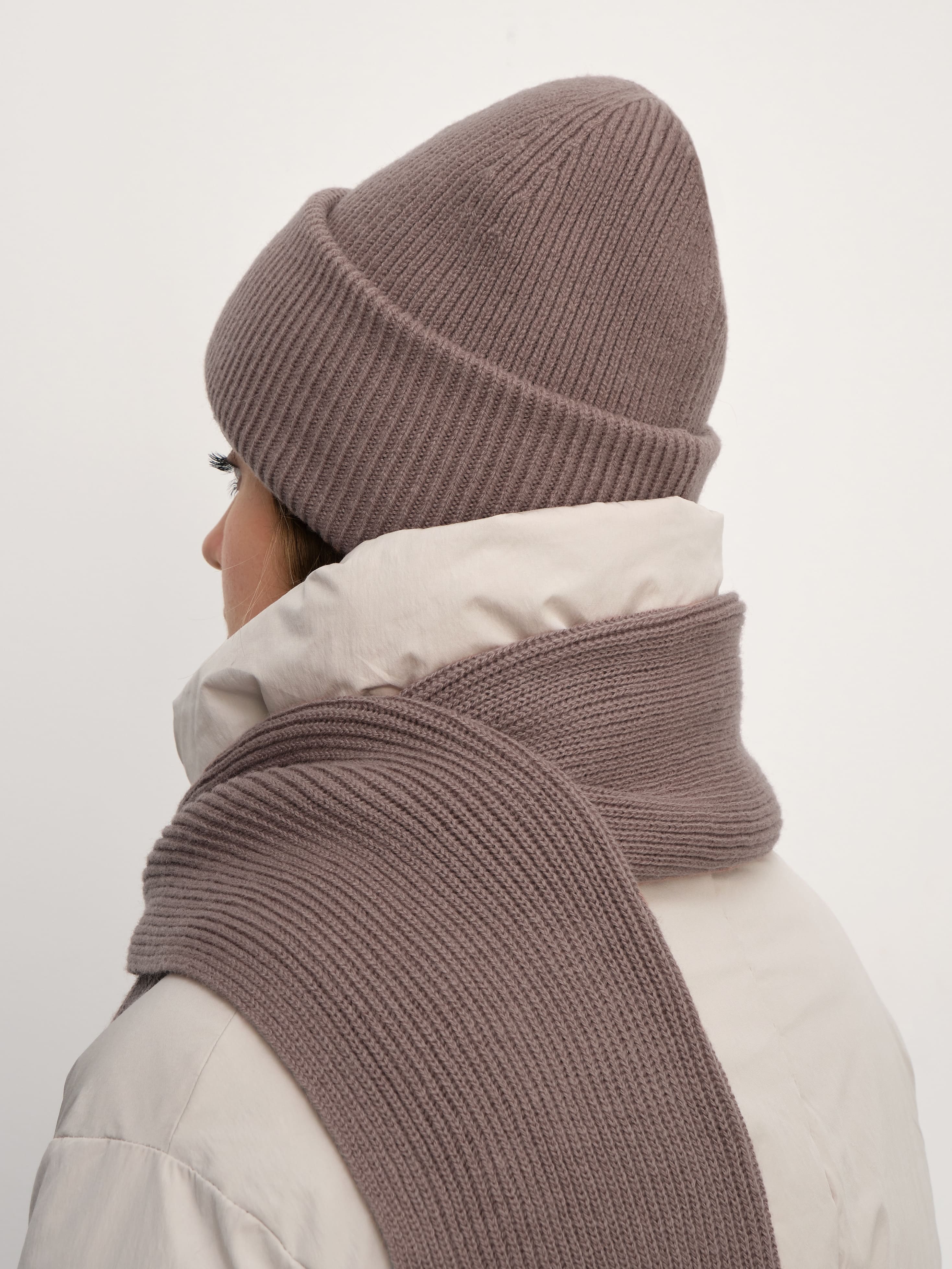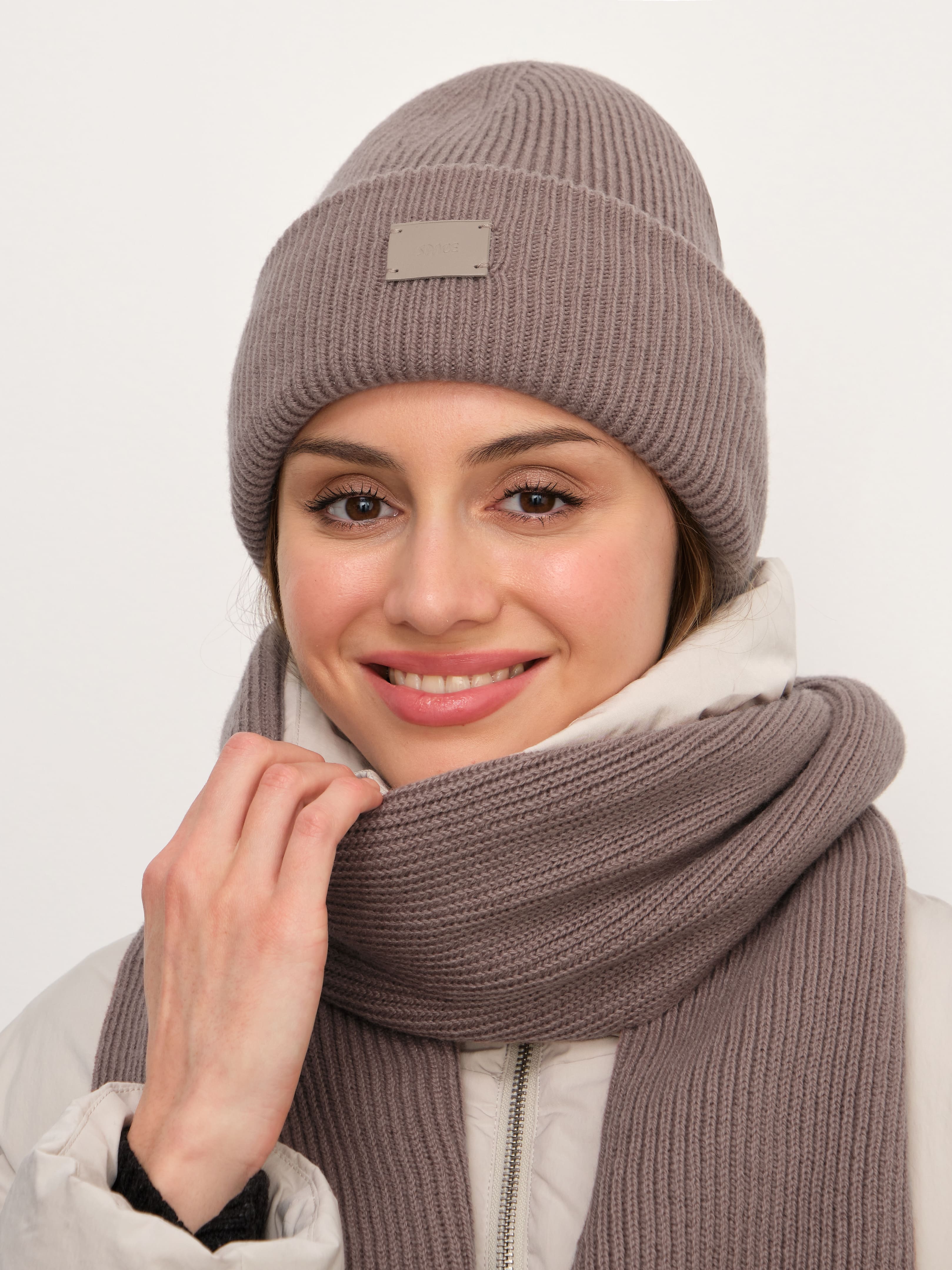 В этом аккуратном теплом комплекте целых 70% мериносовой шерсти. Это делает его идеальным и для первых осенних заморозков, и для зимних метелей. Благодаря плотному переплетению нитей, аксессуары не просто хорошо защищают от ветра, но и не теряют форму после пары стирок. Объемный, связанный в мелкий рубчик, шарф станет прекрасным дополнением к любимому пуховику. А стильная шапка бини с удобным отворотом и плотной посадкой прекрасно защитит шейно-ушную зону.
