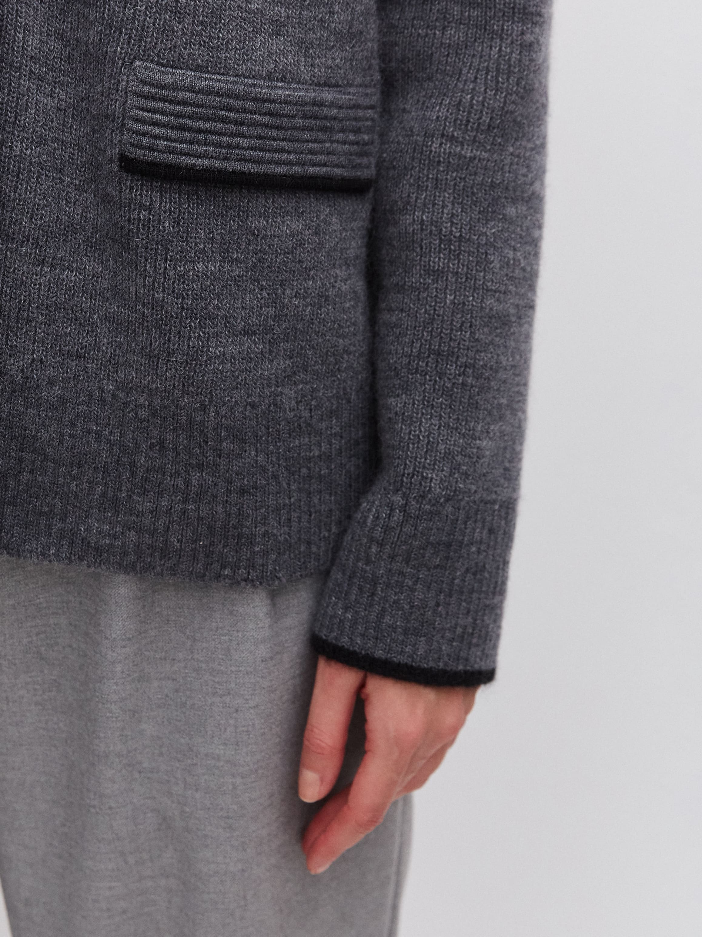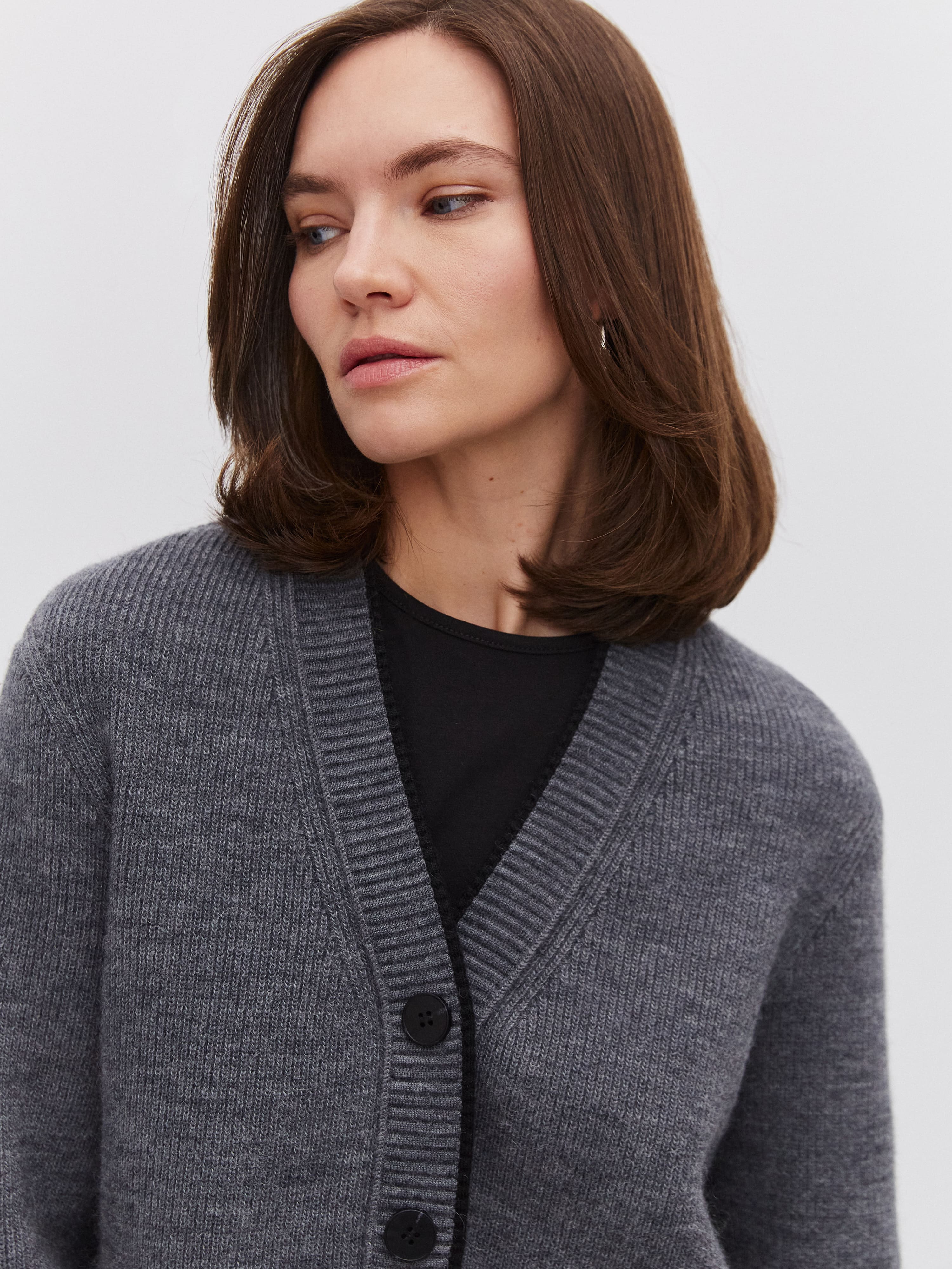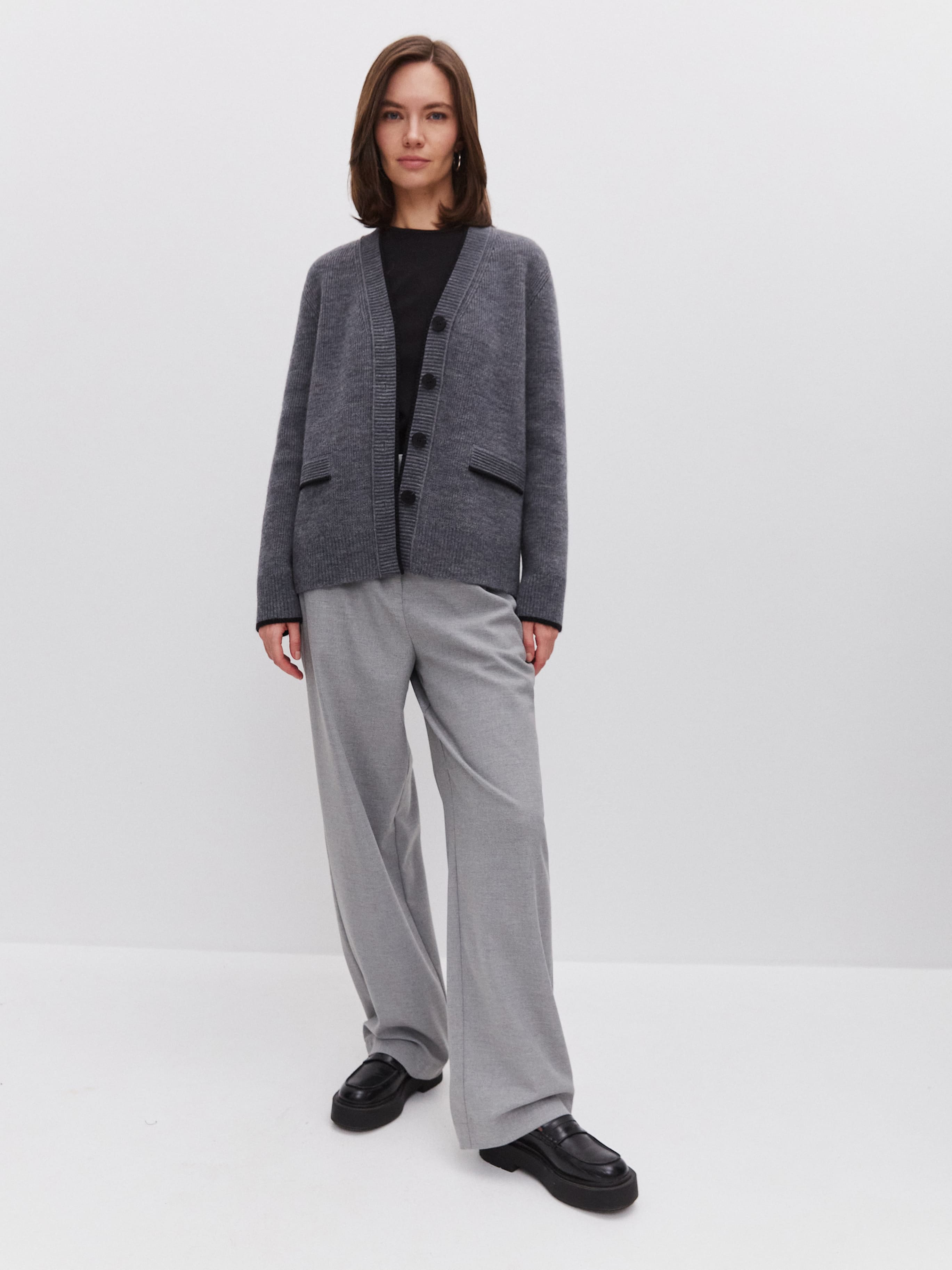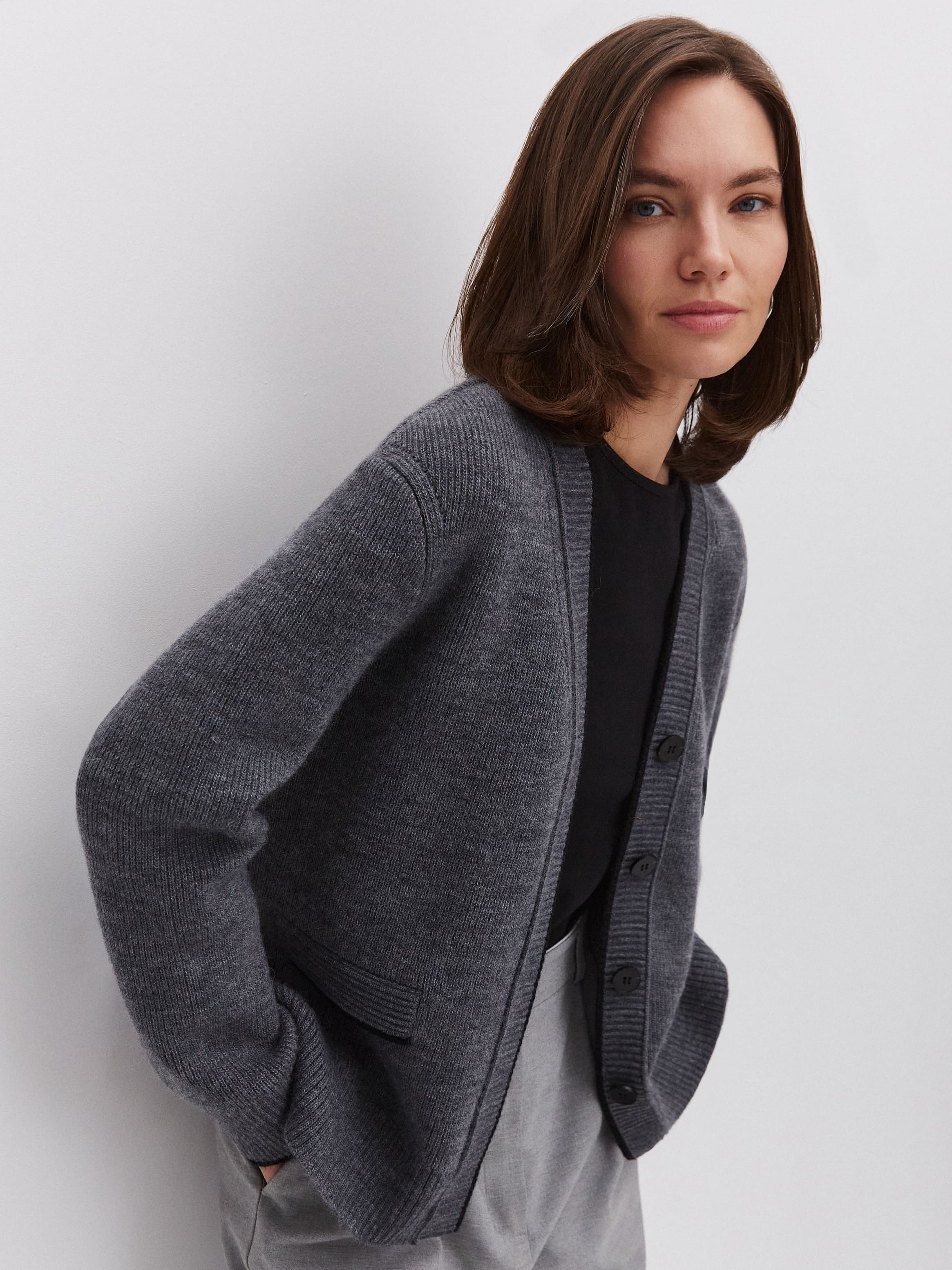 Лаконичный мягкий кардиган с отделкой – это уютно, тепло и нескучно! Текстурированные планка и клапаны с контрастным кантом придают образу приятную собранность. По низу и манжетам полотно укреплено широкой вязаной резинкой. Состав: премиальная мериносовая шерсть + натуральный мохер, создающий легкий пушистый ореол на поверхности изделия. Способность кардигана поддерживать комфортную температуру в помещении и вне его протестирована на практике. Поэтому уверенно сообщаем: теперь можно не отказываться от прогулок и шопинга в любую погоду.