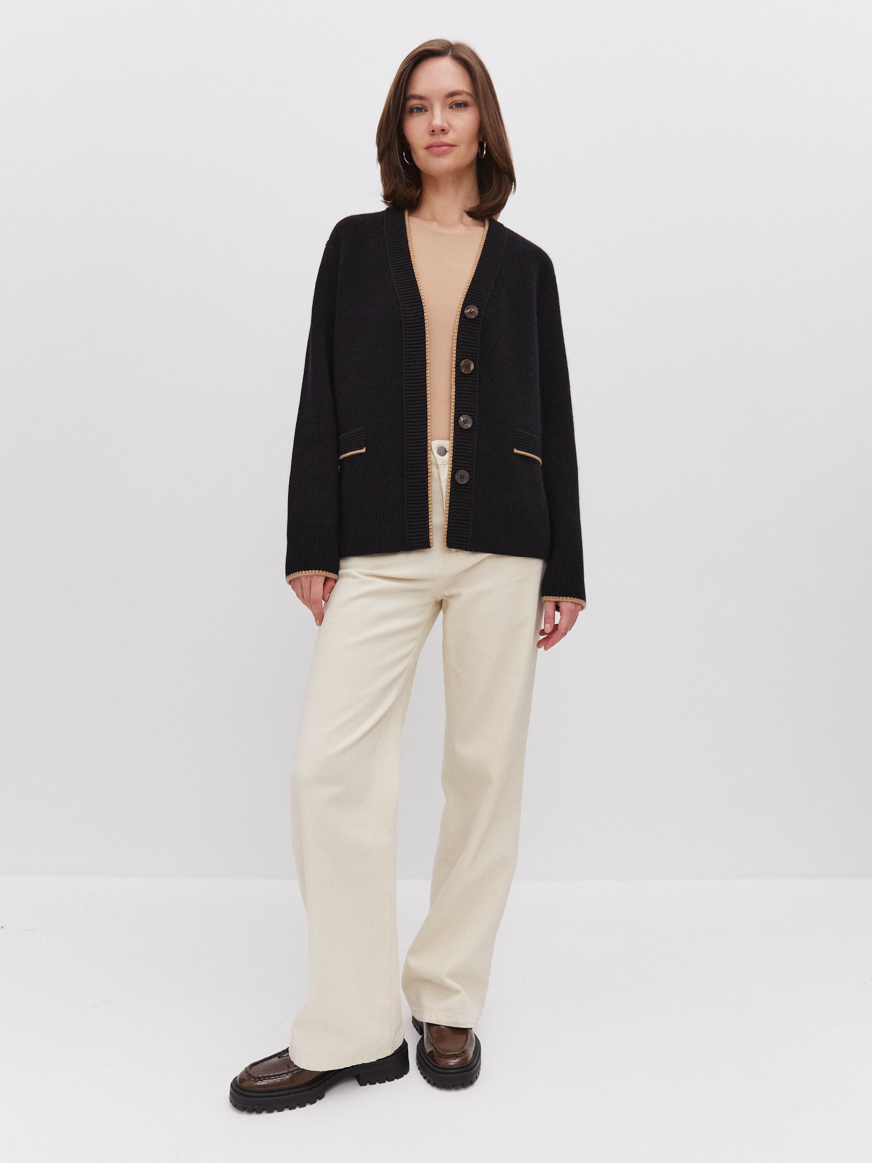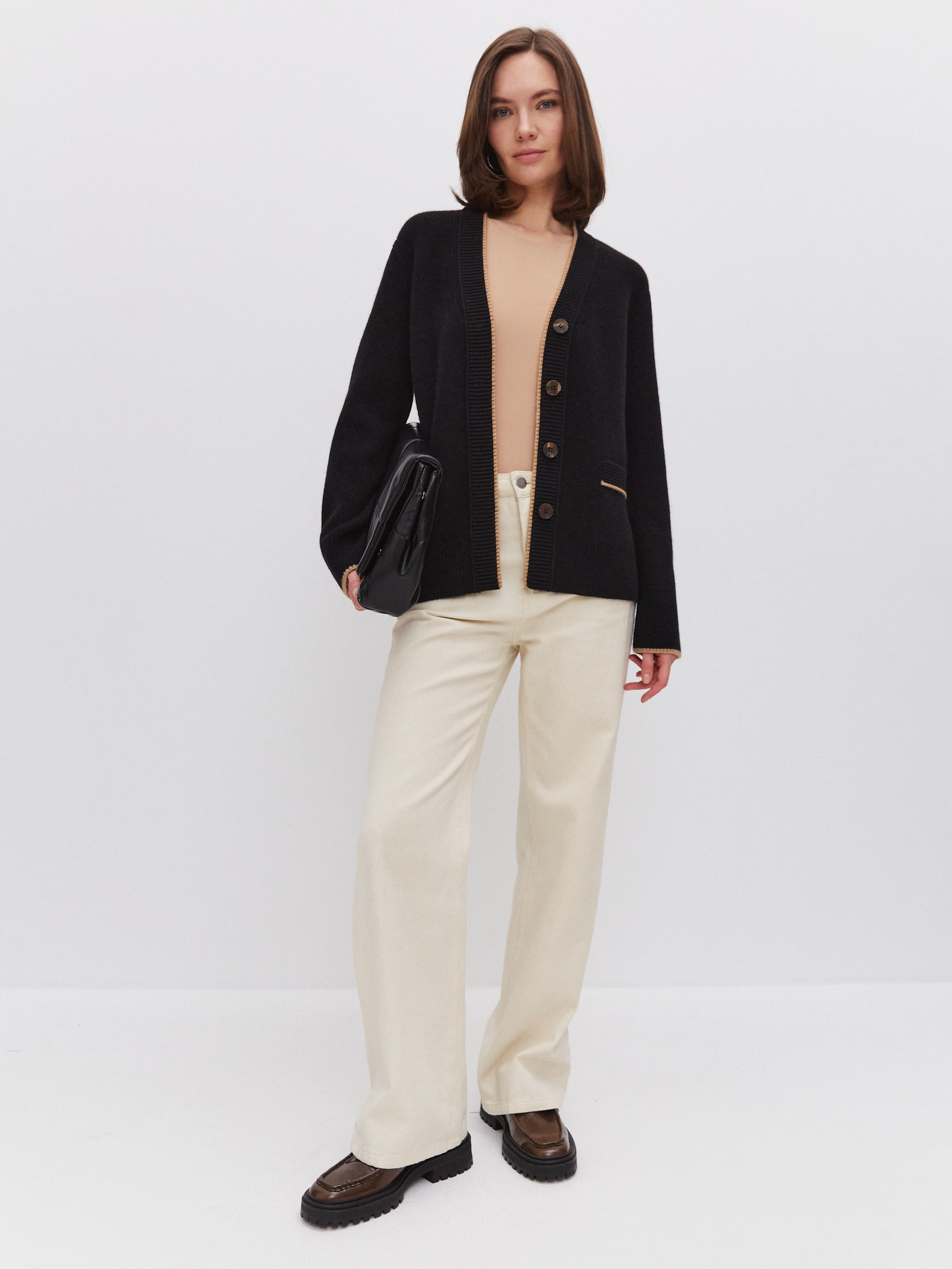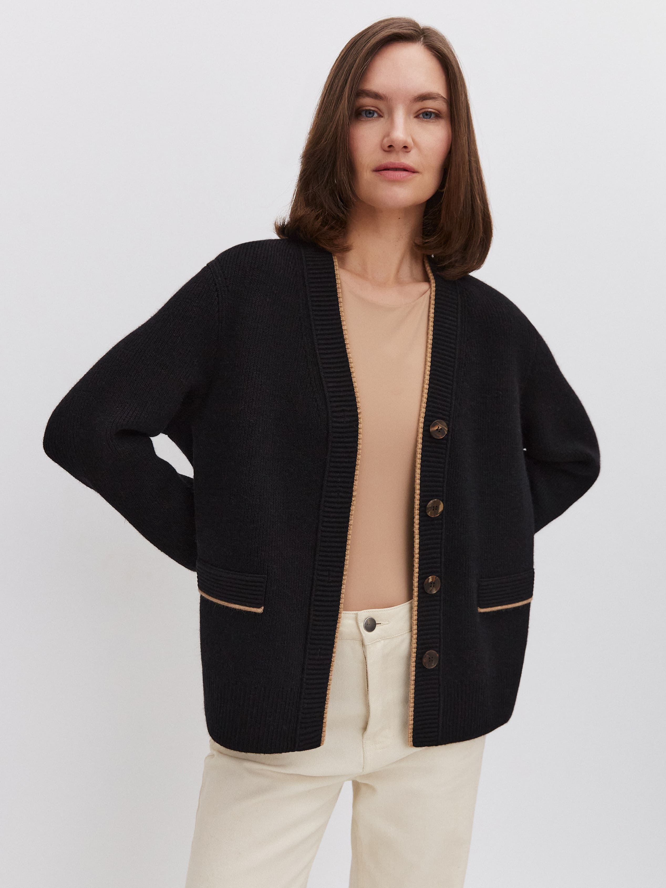 Лаконичный мягкий кардиган с отделкой – это уютно, тепло и нескучно! Текстурированные планка и клапаны с контрастным кантом придают образу приятную собранность. По низу и манжетам полотно укреплено широкой вязаной резинкой. Состав: премиальная мериносовая шерсть + натуральный мохер, создающий легкий пушистый ореол на поверхности изделия. Способность кардигана поддерживать комфортную температуру в помещении и вне его протестирована на практике. Поэтому уверенно сообщаем: теперь можно не отказываться от прогулок и шопинга в любую погоду.
