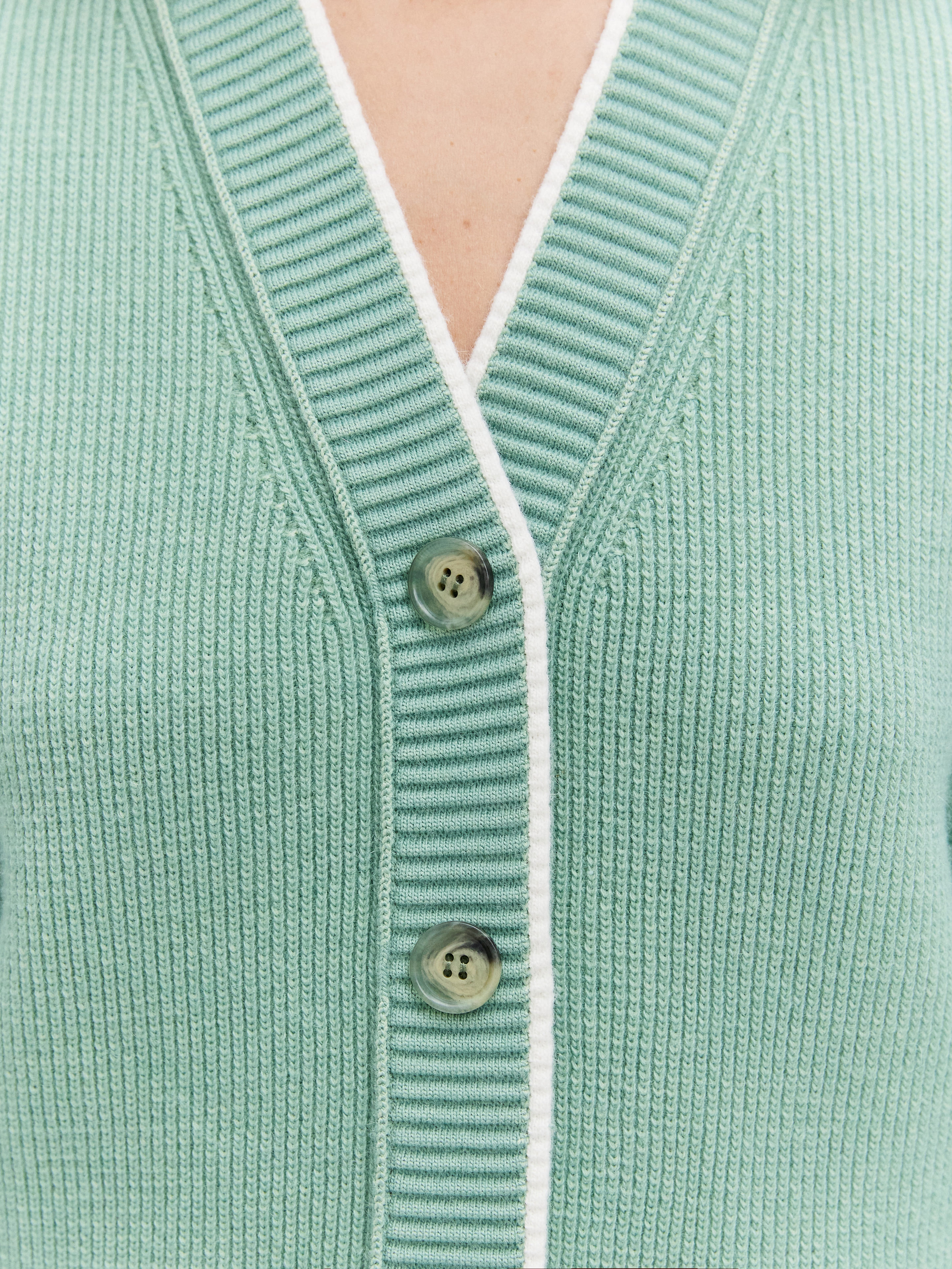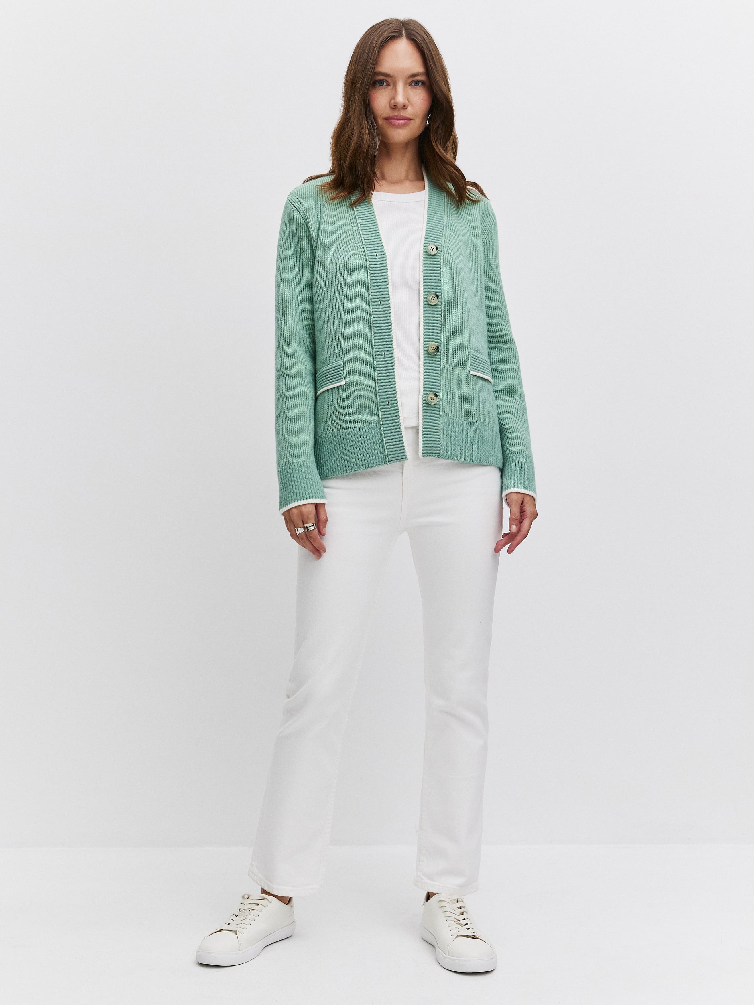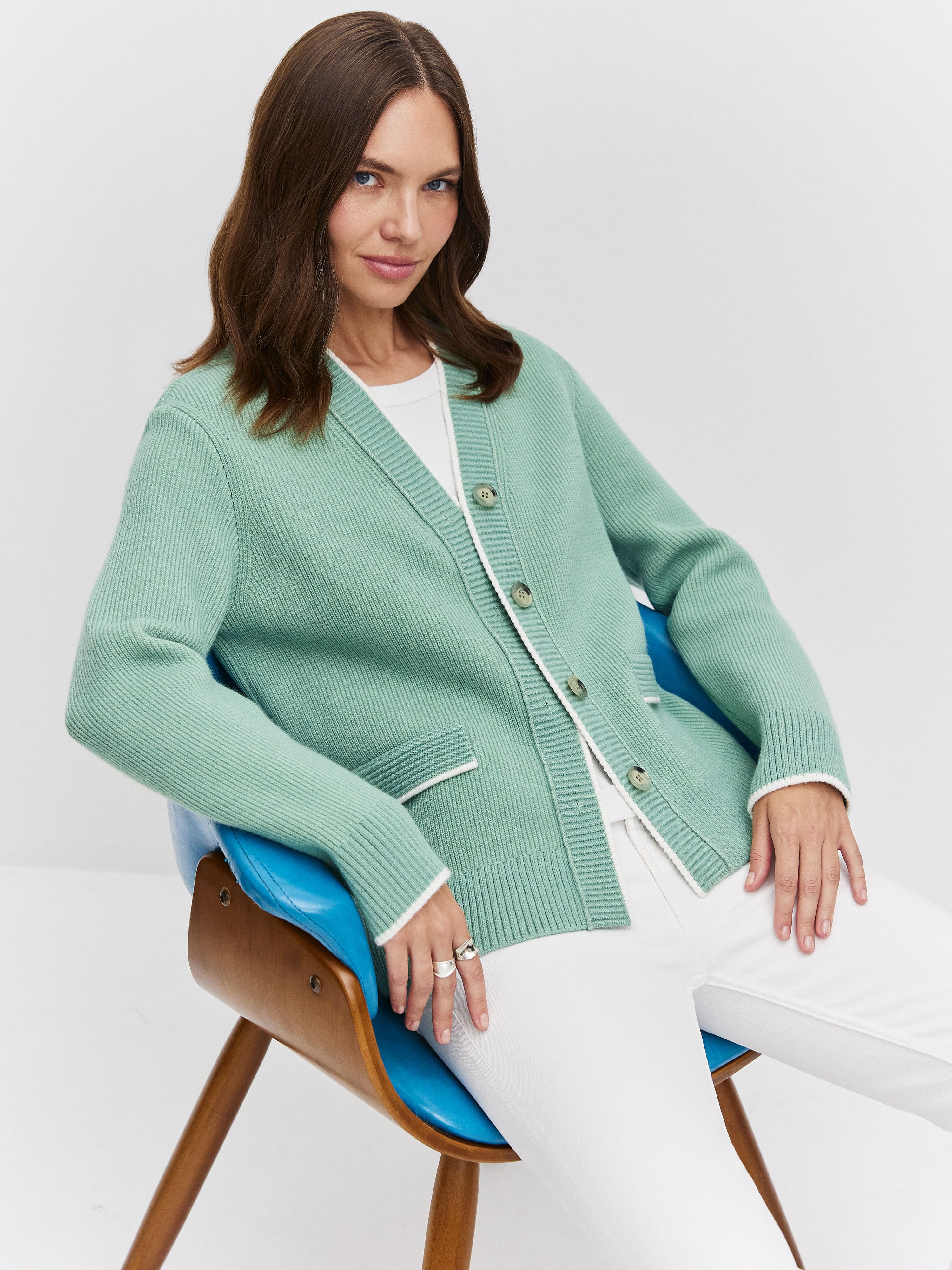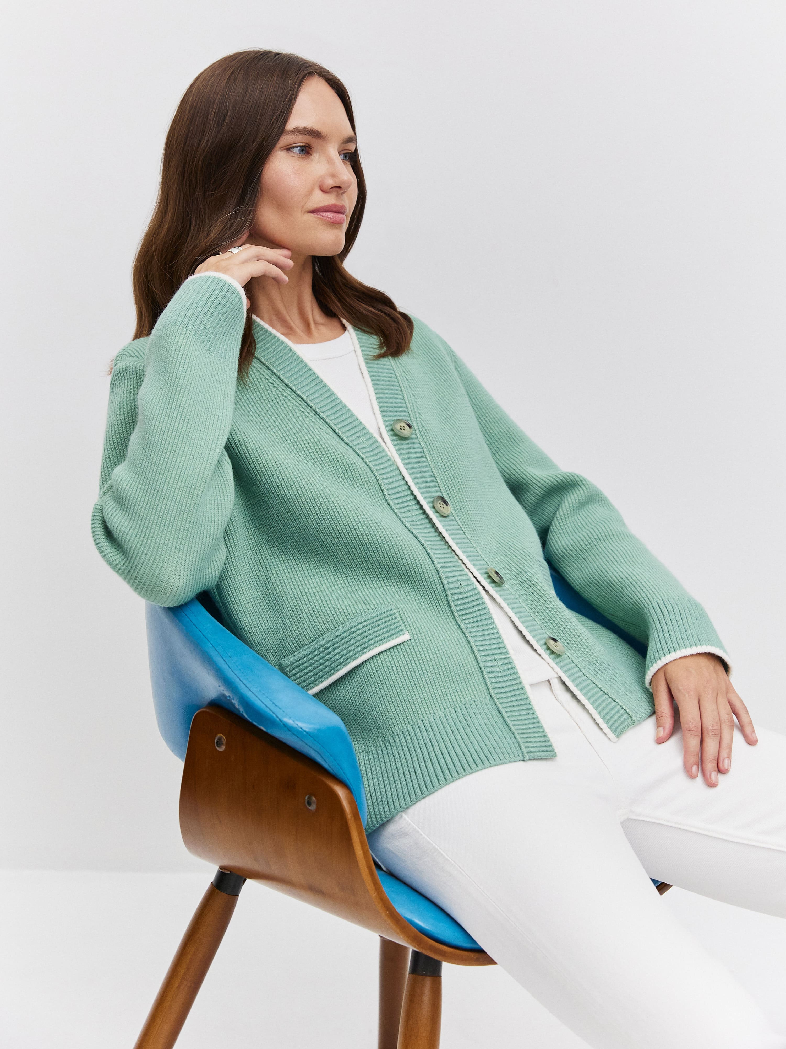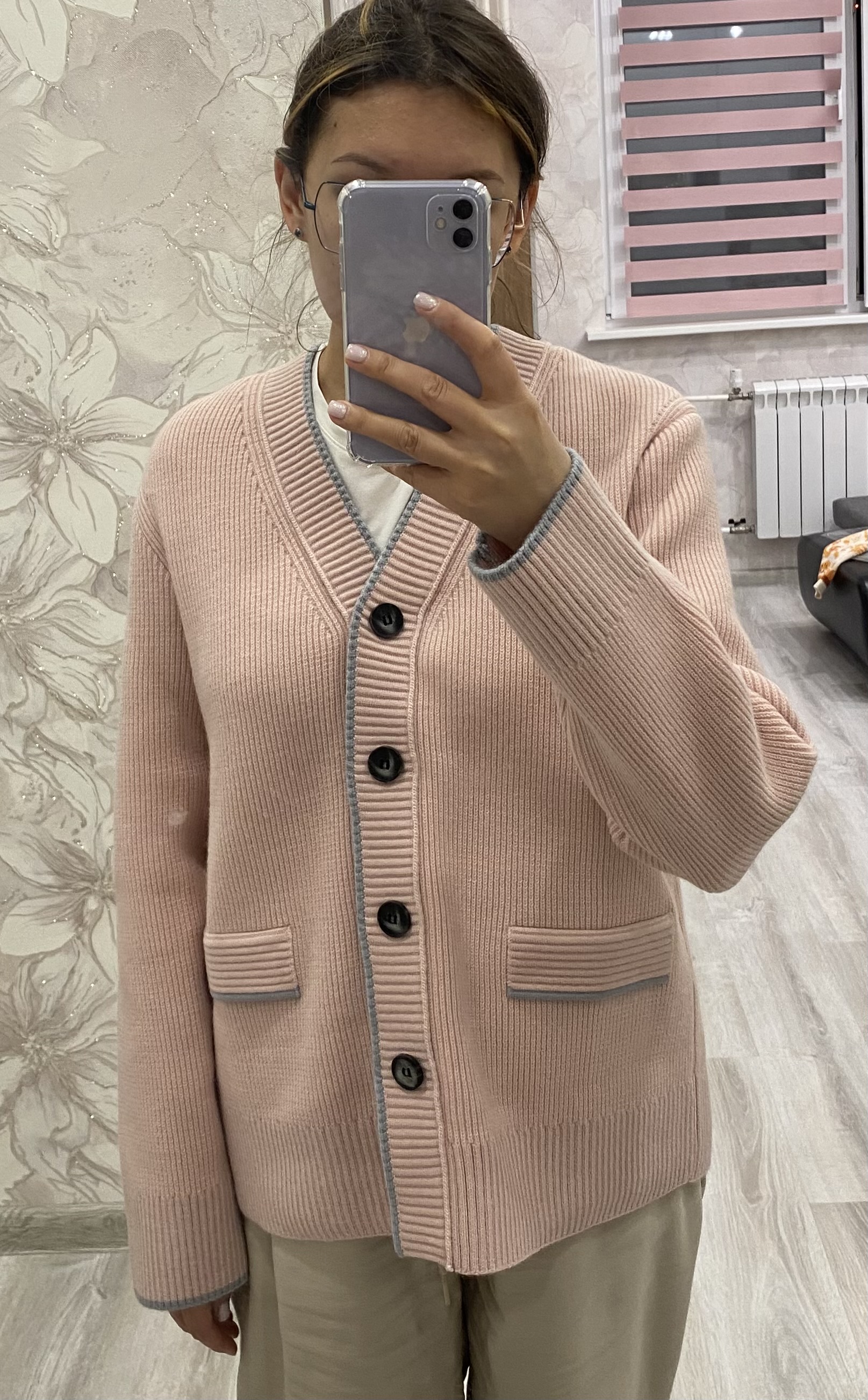 Лаконичный мягкий кардиган с отделкой – это уютно, тепло и нескучно! Текстурированные планка и клапаны с контрастным кантом придают образу приятную собранность. По низу и манжетам полотно укреплено широкой вязаной резинкой. Состав: премиальная мериносовая шерсть + натуральный мохер, создающий легкий пушистый ореол на поверхности изделия. Способность кардигана поддерживать комфортную температуру в помещении и вне его протестирована на практике. Поэтому уверенно сообщаем: теперь можно не отказываться от прогулок и шопинга в любую погоду.