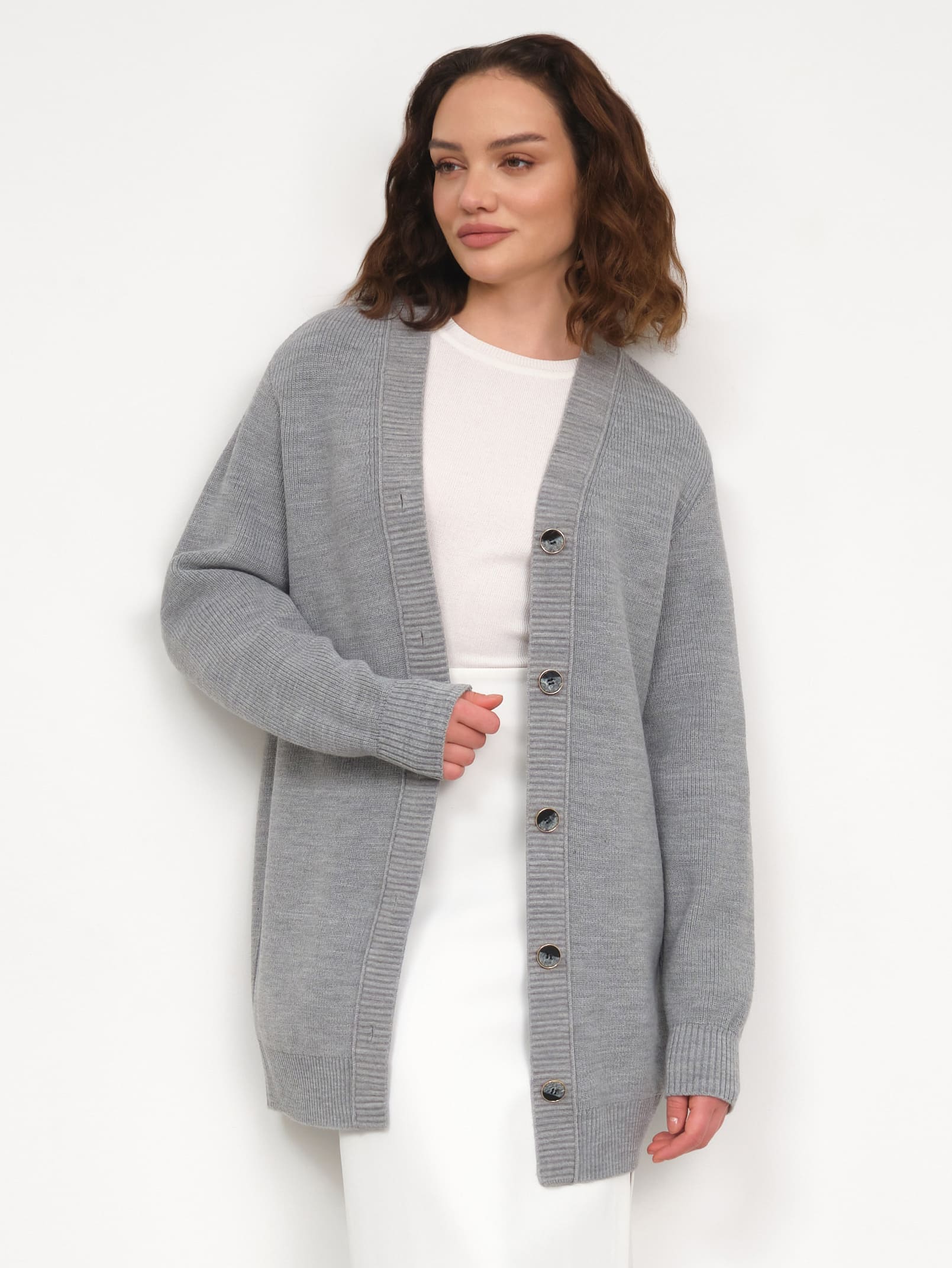 Главные преимущества этого удлиненного кардигана – чесаная мериносовая шерсть, уютная форма кокон и расслабленная линия рукава, оставляющая достаточно места для второго слоя одежды. Лучшая модель, чтобы качественно утеплиться в межсезонье и зиму, но при этом не выходить за рамки офисной формальности. Аккуратные пуговицы с металлизированным ободком делают фасон чуть более выразительным.