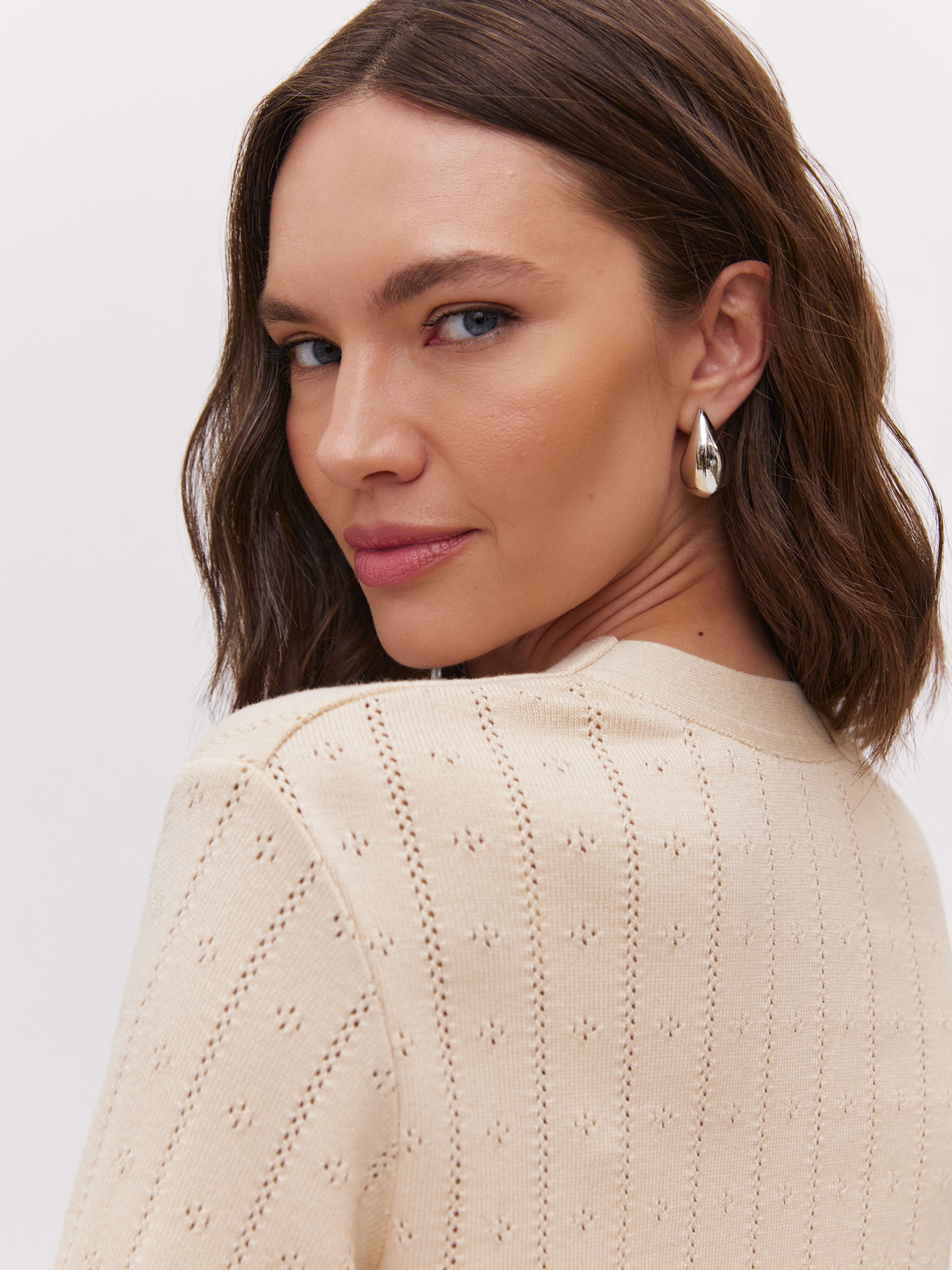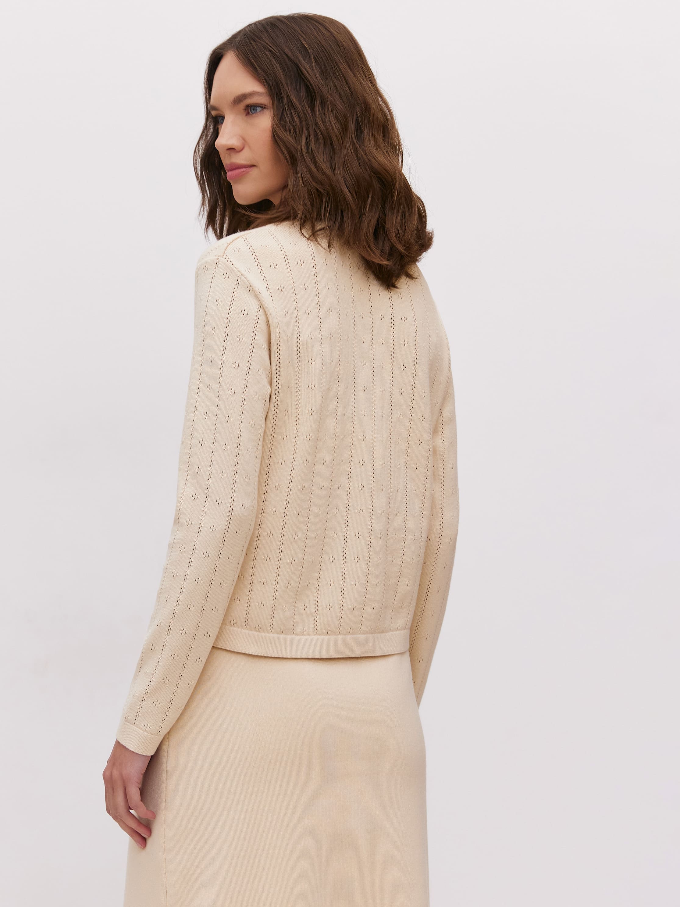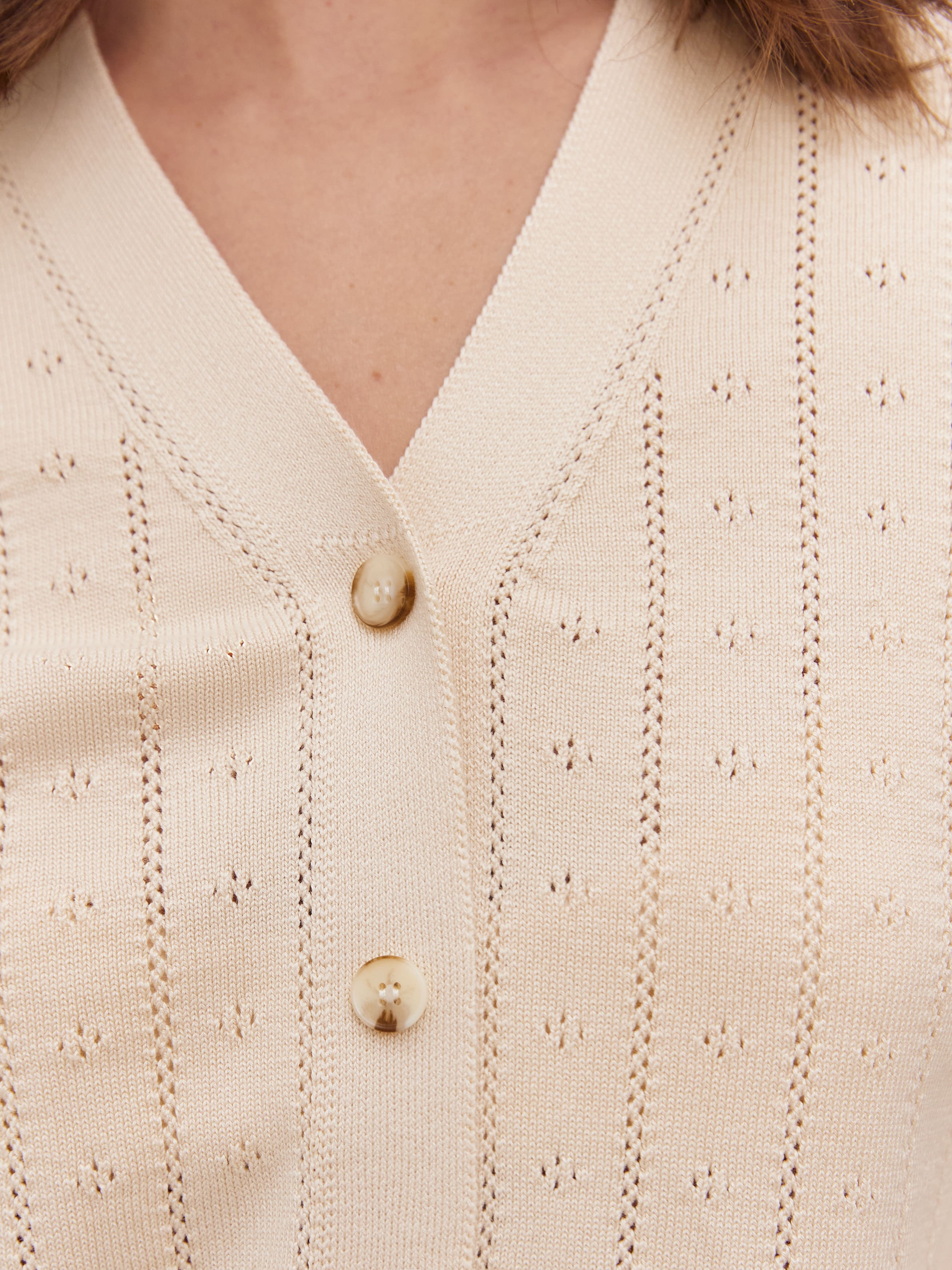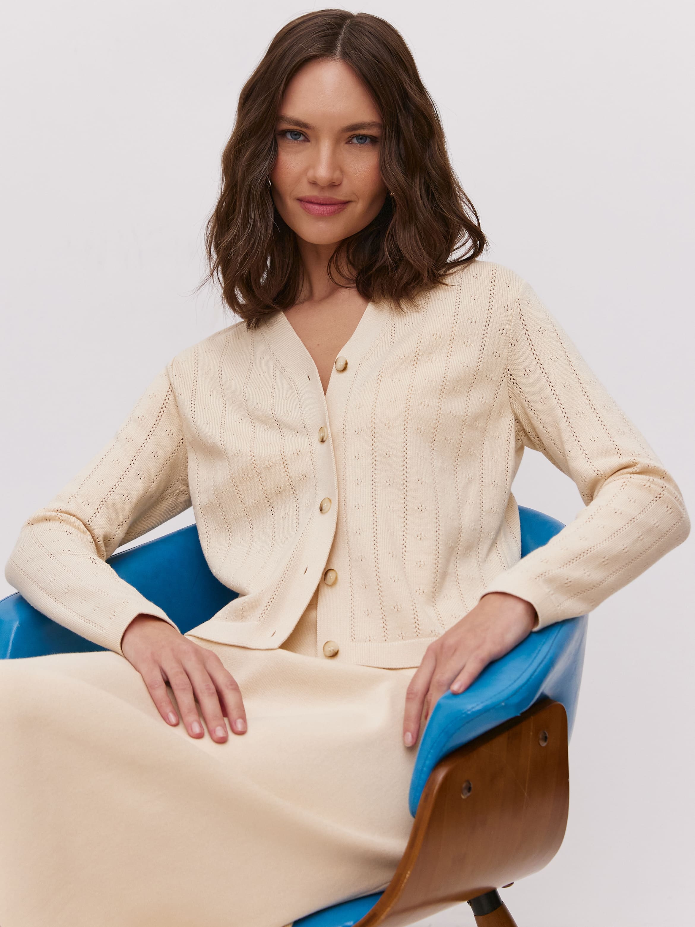 Маленький и очень тактильный кардиган из весенне-летней коллекции бренда. Утонченная классика специально для теплых вечеров. Секрет нежности трикотажа – в мягком премиальном хлопке и чувственной вискозе, объединенных в одной вещи. Нюансы модели: V-образный вырез, чуть свободная посадка и ряд роговых пуговиц. Ажурный узор вывязан по вертикали, чтобы визуально компенсировать небольшую длину изделия.