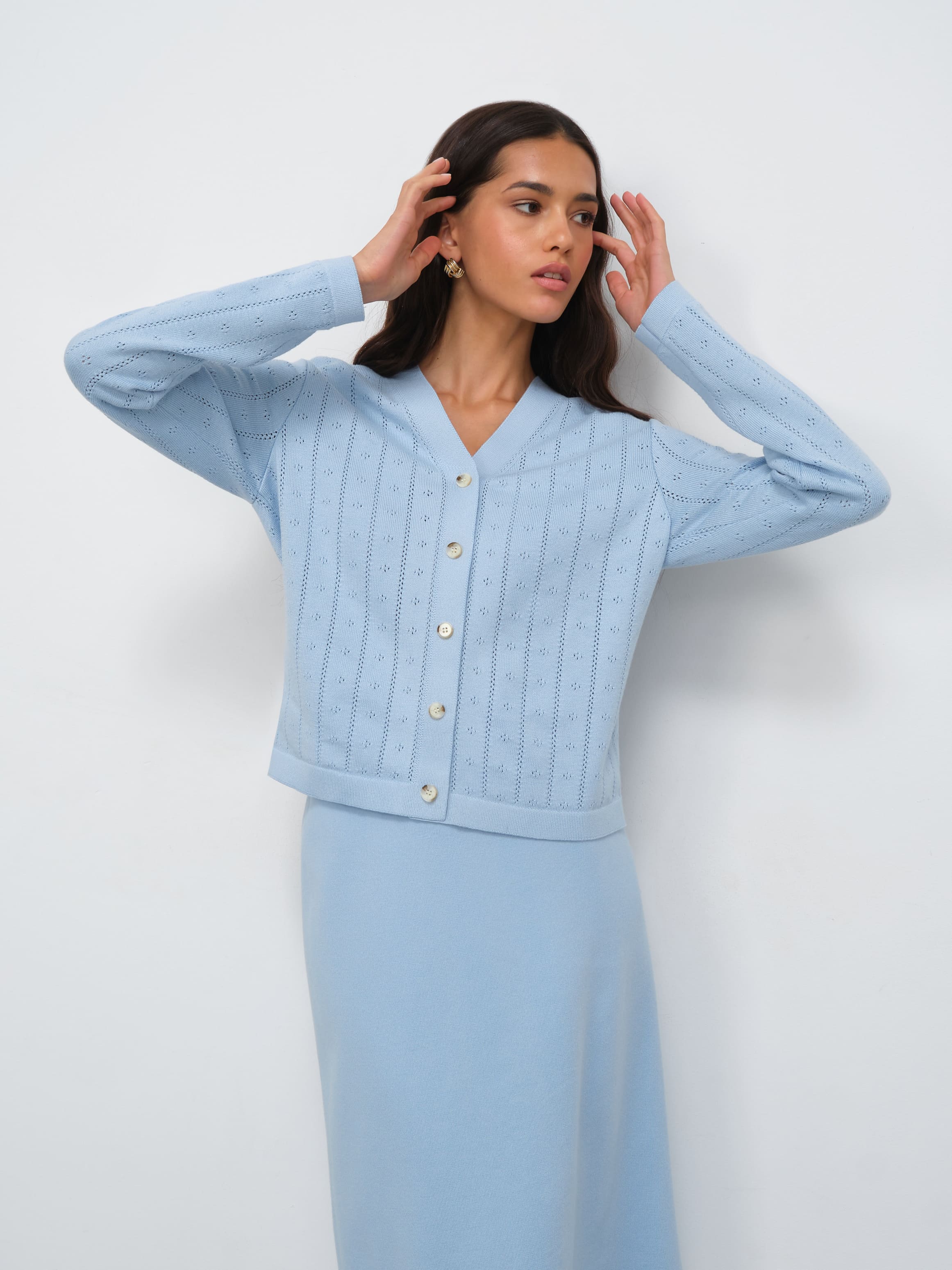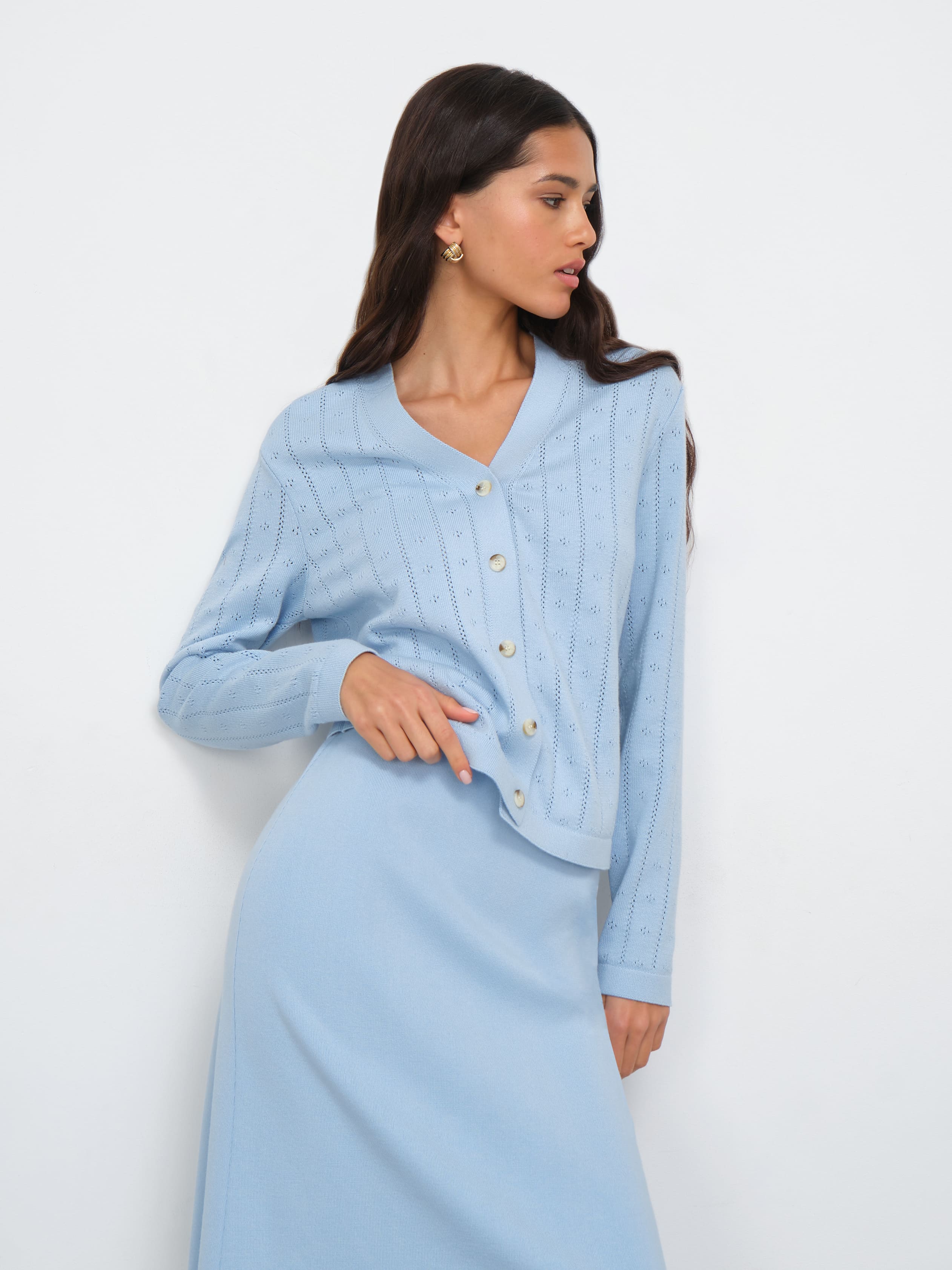 Маленький и очень тактильный кардиган из весенне-летней коллекции бренда. Утонченная классика специально для теплых вечеров. Секрет нежности трикотажа – в мягком премиальном хлопке и чувственной вискозе, объединенных в одной вещи. Нюансы модели: V-образный вырез, чуть свободная посадка и ряд роговых пуговиц. Ажурный узор вывязан по вертикали, чтобы визуально компенсировать небольшую длину изделия.
