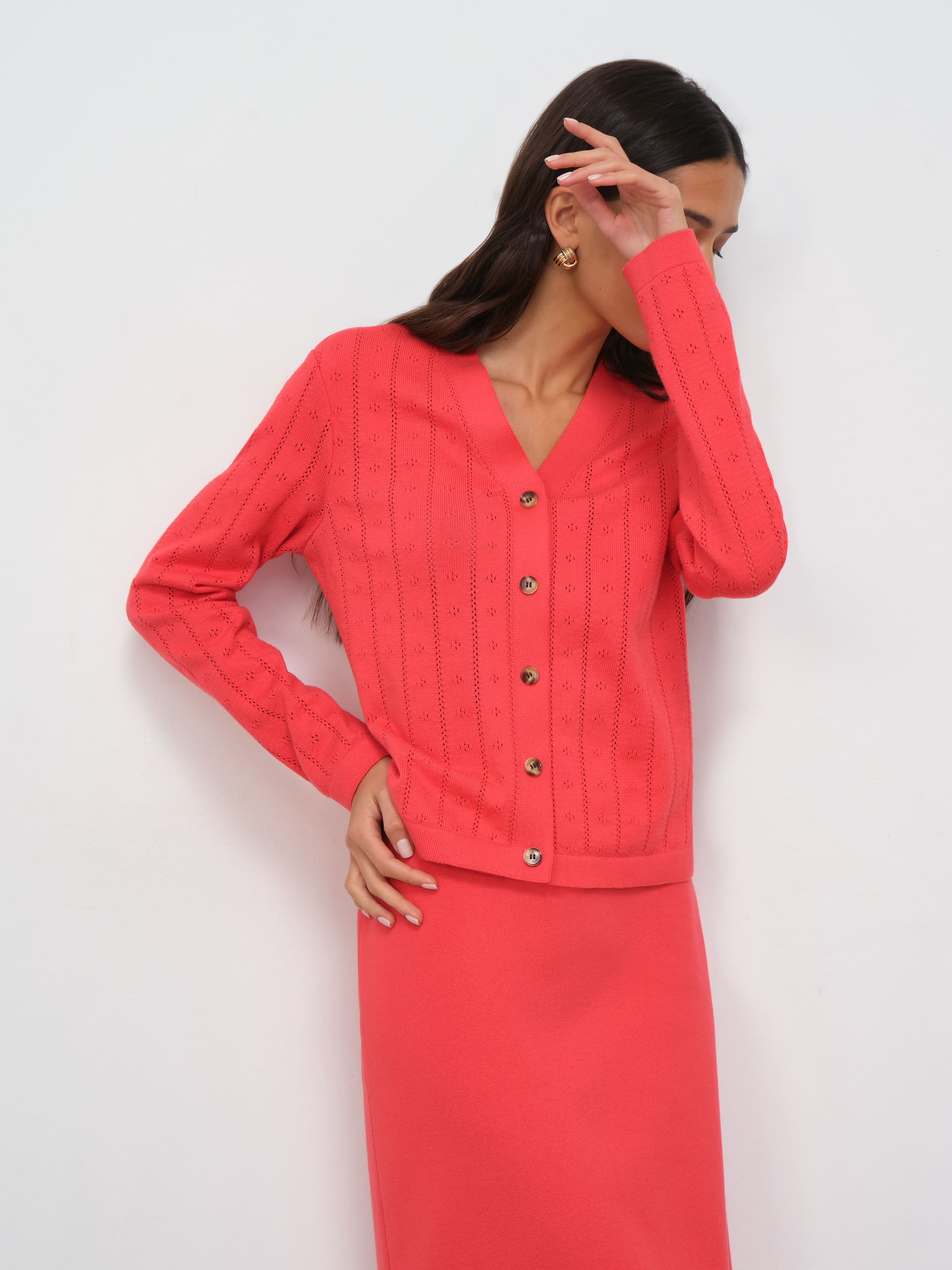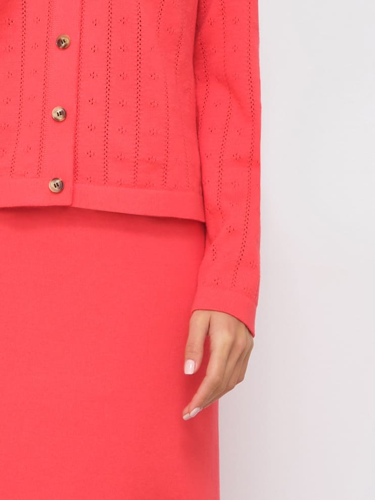 Маленький и очень тактильный кардиган из весенне-летней коллекции бренда. Утонченная классика специально для теплых вечеров. Секрет нежности трикотажа – в мягком премиальном хлопке и чувственной вискозе, объединенных в одной вещи. Нюансы модели: V-образный вырез, чуть свободная посадка и ряд роговых пуговиц. Ажурный узор вывязан по вертикали, чтобы визуально компенсировать небольшую длину изделия.