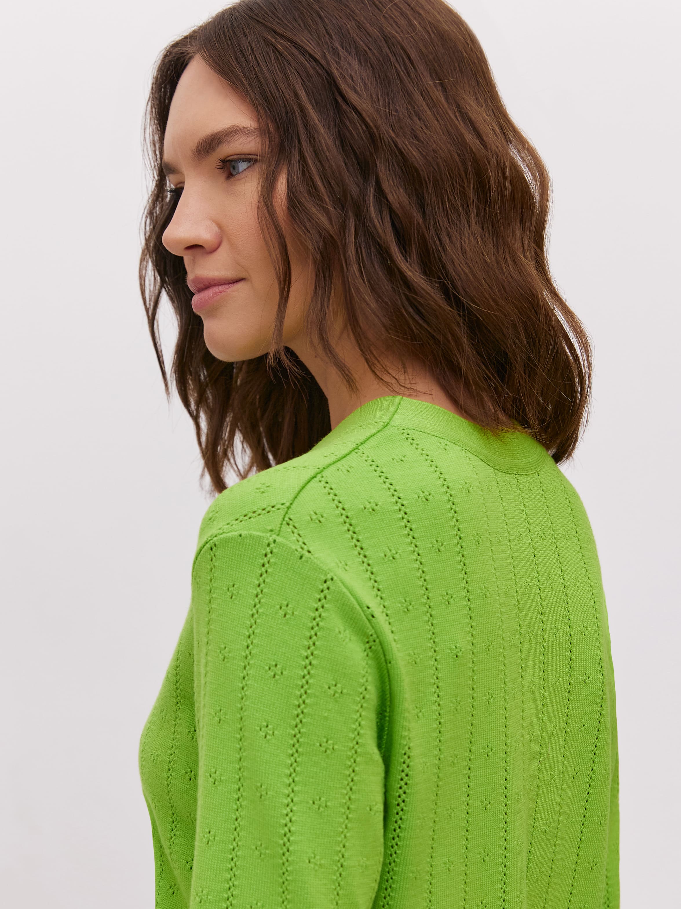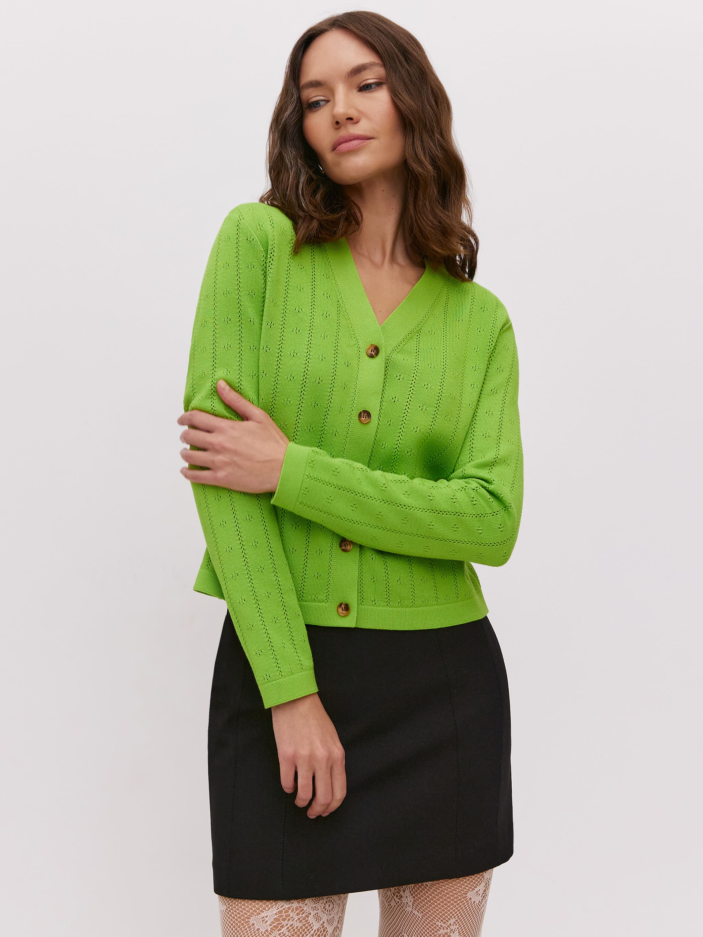Маленький и очень тактильный кардиган из весенне-летней коллекции бренда. Утонченная классика специально для теплых вечеров. Секрет нежности трикотажа – в мягком премиальном хлопке и чувственной вискозе, объединенных в одной вещи. Нюансы модели: V-образный вырез, чуть свободная посадка и ряд роговых пуговиц. Ажурный узор вывязан по вертикали, чтобы визуально компенсировать небольшую длину изделия.