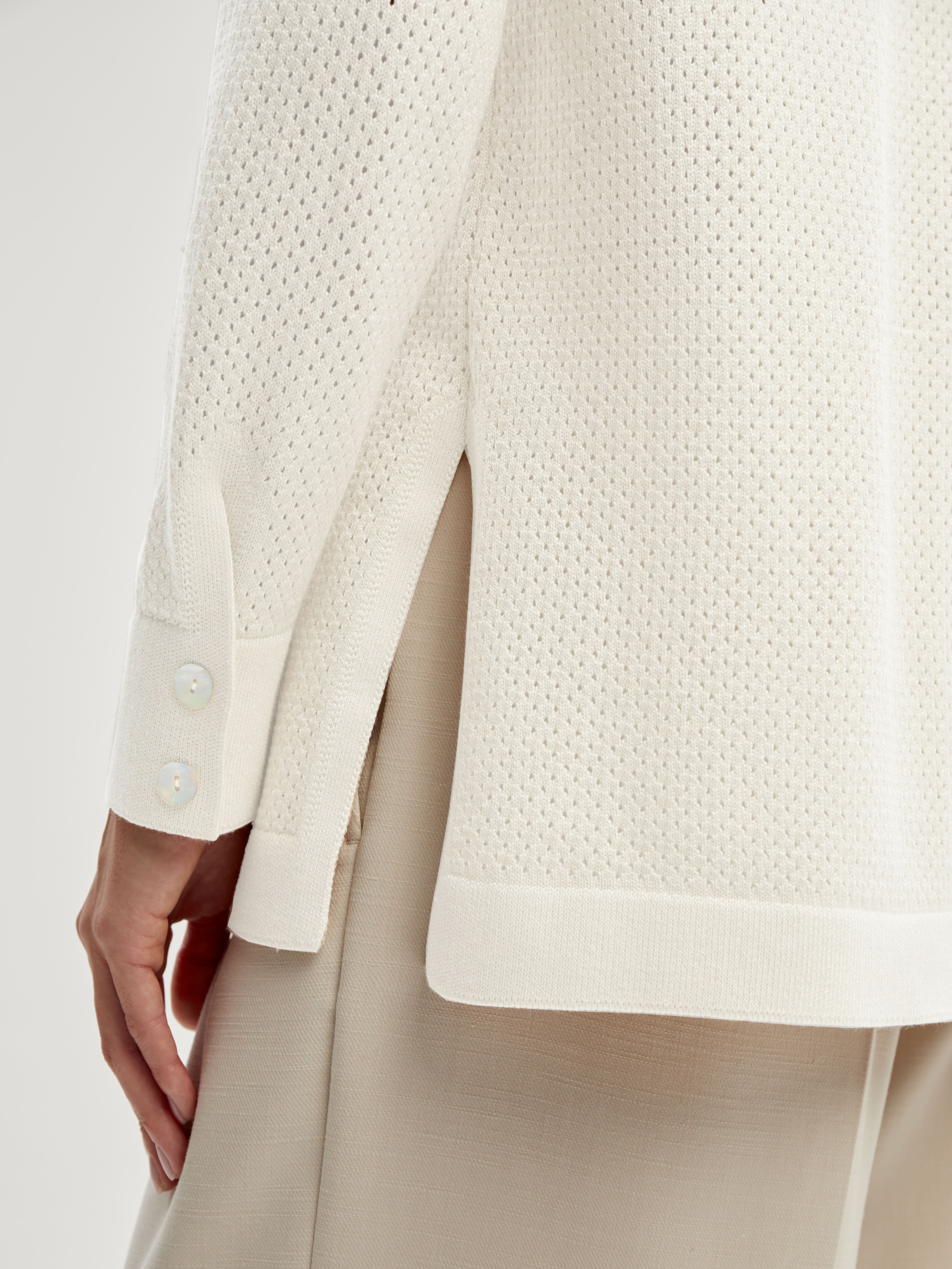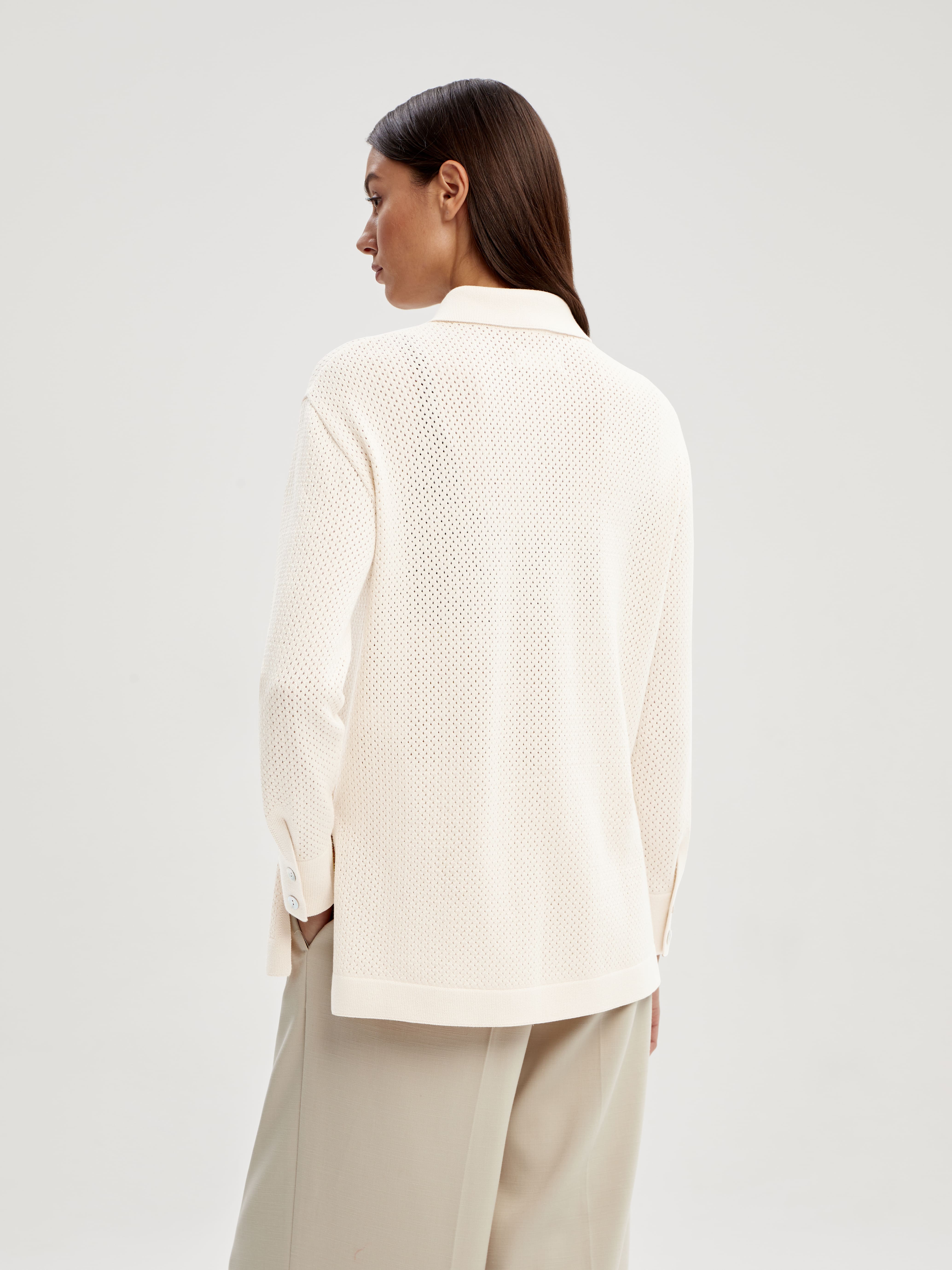 Легкая рубашка из хлопка, сбалансированного прохладной вискозой. Убедитесь, что лето в трикотаже 99colorspace – самое яркое и комфортное. Знаем, как капризны перфорированные узоры и вязаная сеточка. Поэтому дополнительно укрепили воротник и манжеты кардигана. Кайма по нижнему краю и планка из гладкого трикотажа служат «каркасом», который не позволит рубашке потерять форму. Глубокие боковые разрезы вносят в образ динамику и непринужденность. А еще с ними проще заправлять край полочки под ремень.