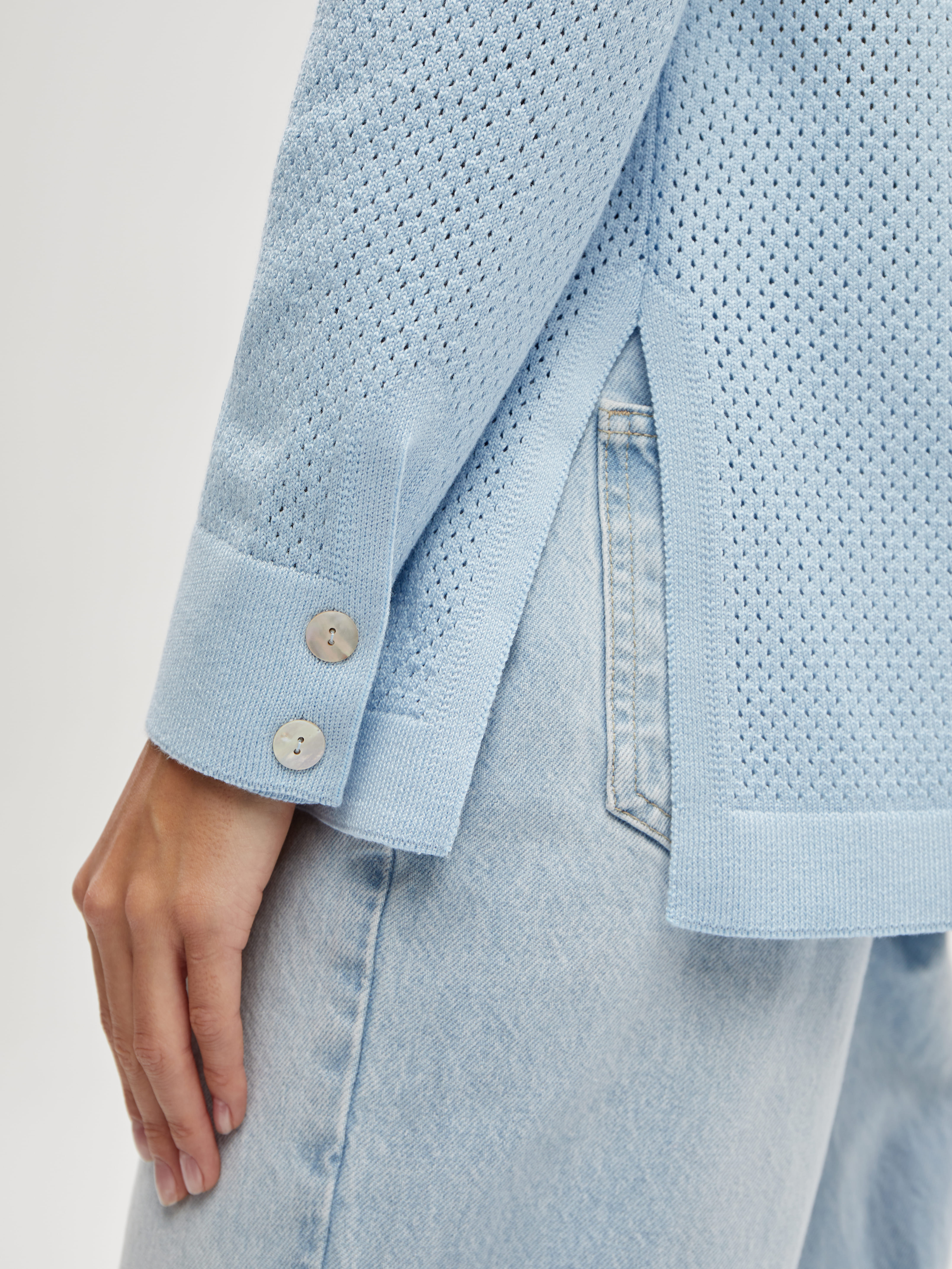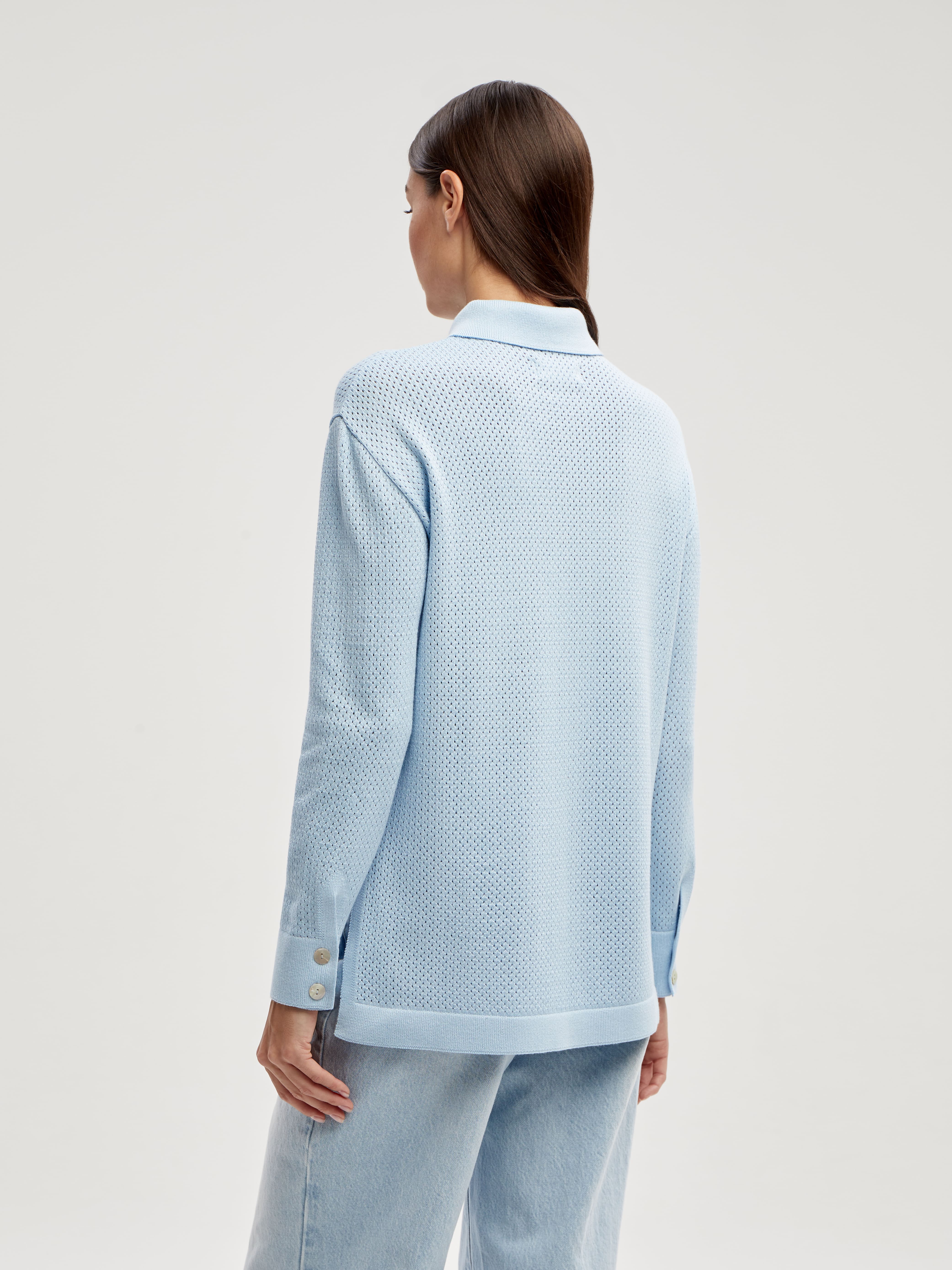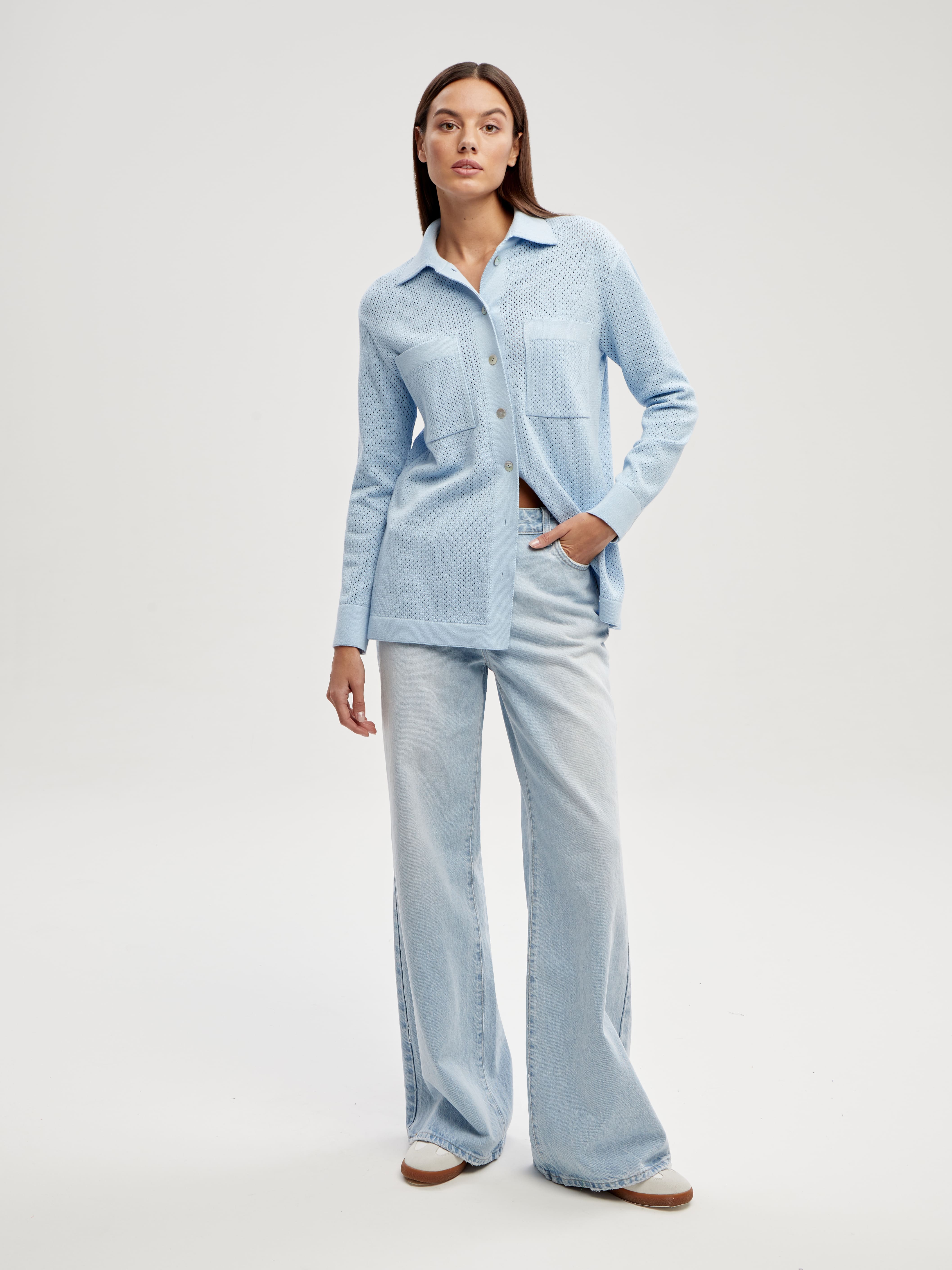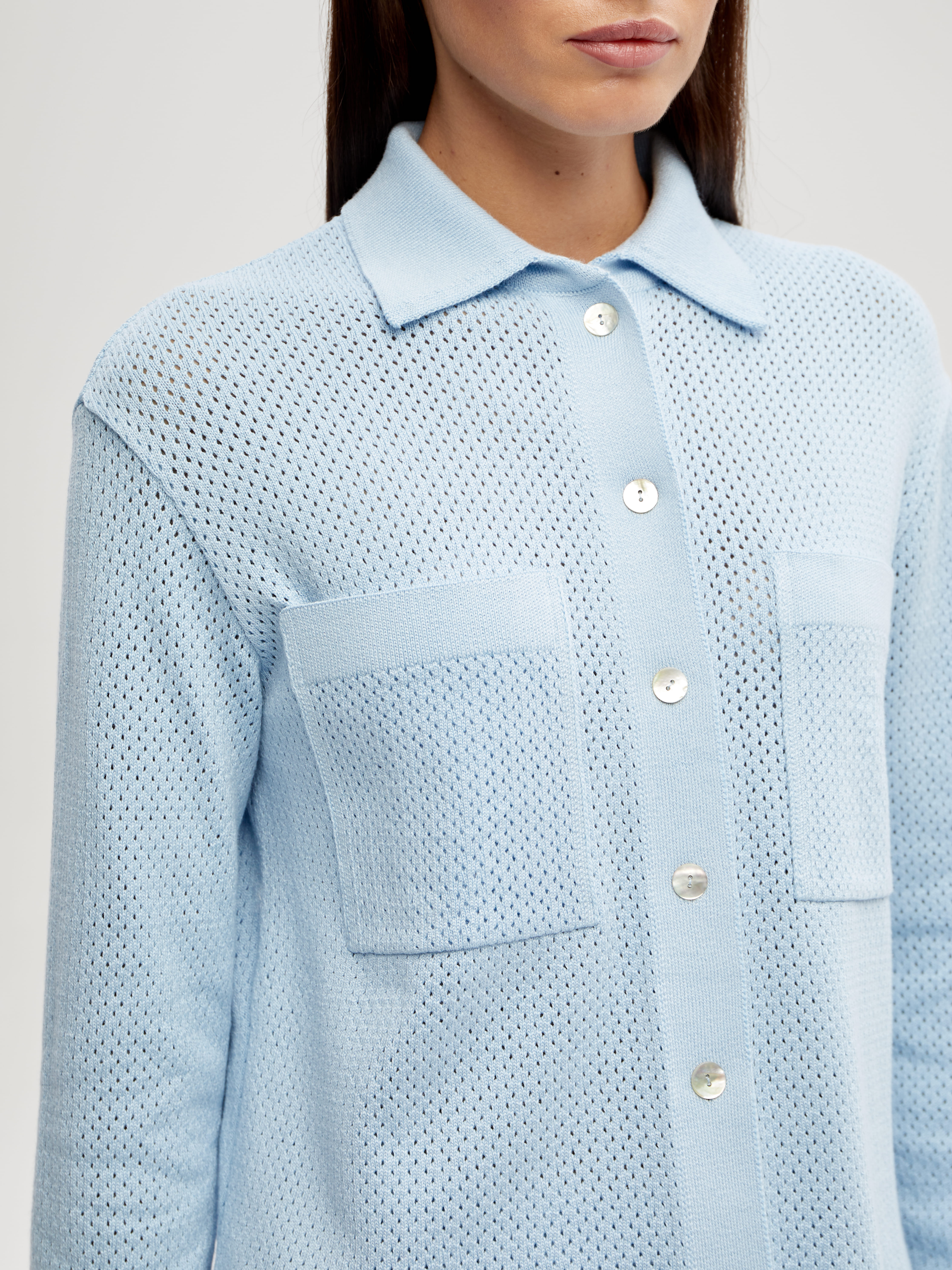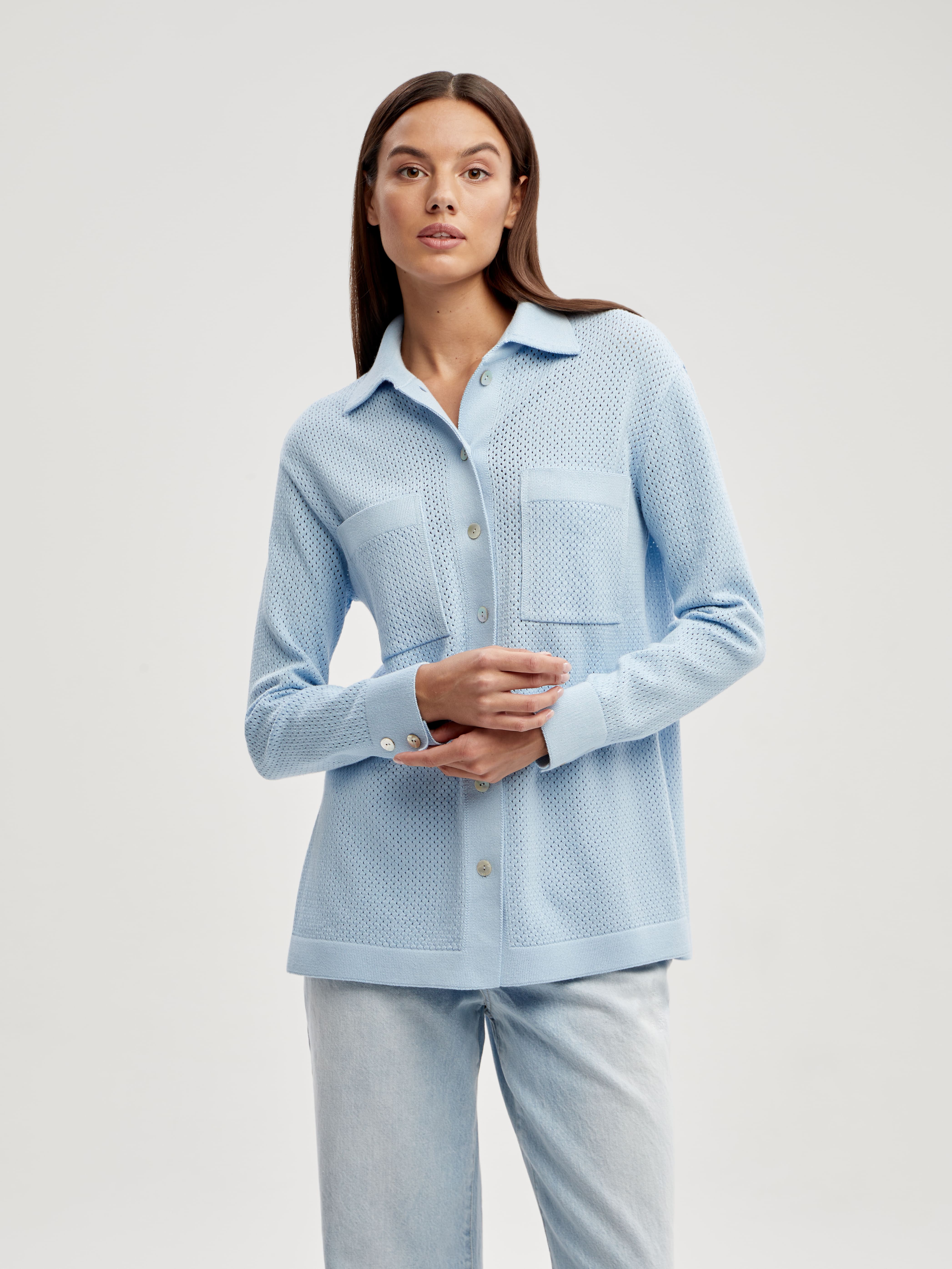 Легкая рубашка из хлопка, сбалансированного прохладной вискозой. Убедитесь, что лето в трикотаже 99colorspace – самое яркое и комфортное. Знаем, как капризны перфорированные узоры и вязаная сеточка. Поэтому дополнительно укрепили воротник и манжеты кардигана. Кайма по нижнему краю и планка из гладкого трикотажа служат «каркасом», который не позволит рубашке потерять форму. Глубокие боковые разрезы вносят в образ динамику и непринужденность. А еще с ними проще заправлять край полочки под ремень.