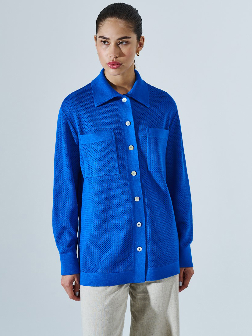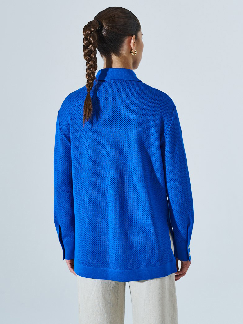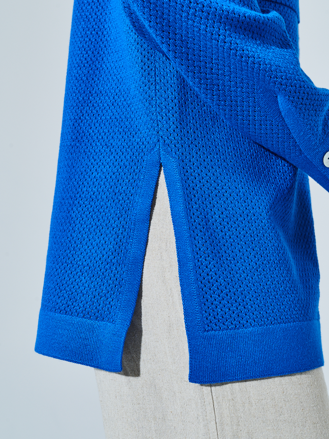 Легкая рубашка из хлопка, сбалансированного прохладной вискозой. Убедитесь, что лето в трикотаже 99colorspace – самое яркое и комфортное. Знаем, как капризны перфорированные узоры и вязаная сеточка. Поэтому дополнительно укрепили воротник и манжеты кардигана. Кайма по нижнему краю и планка из гладкого трикотажа служат «каркасом», который не позволит рубашке потерять форму. Глубокие боковые разрезы вносят в образ динамику и непринужденность. А еще с ними проще заправлять край полочки под ремень.