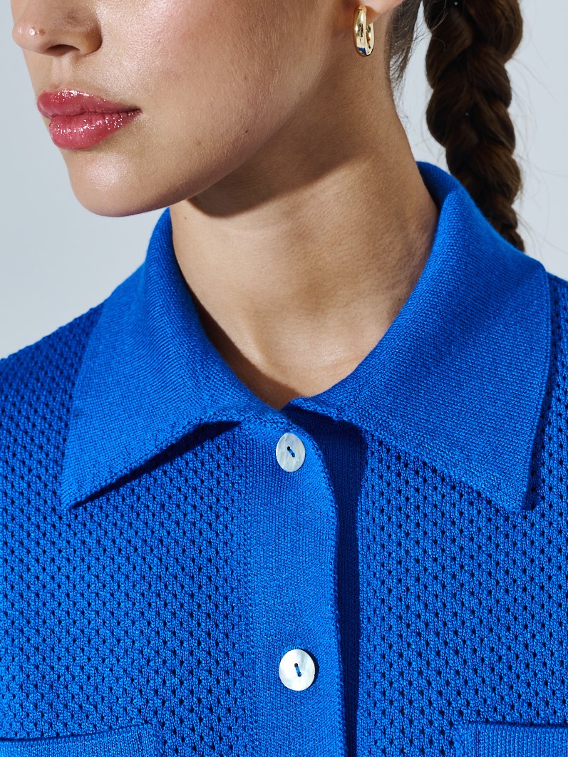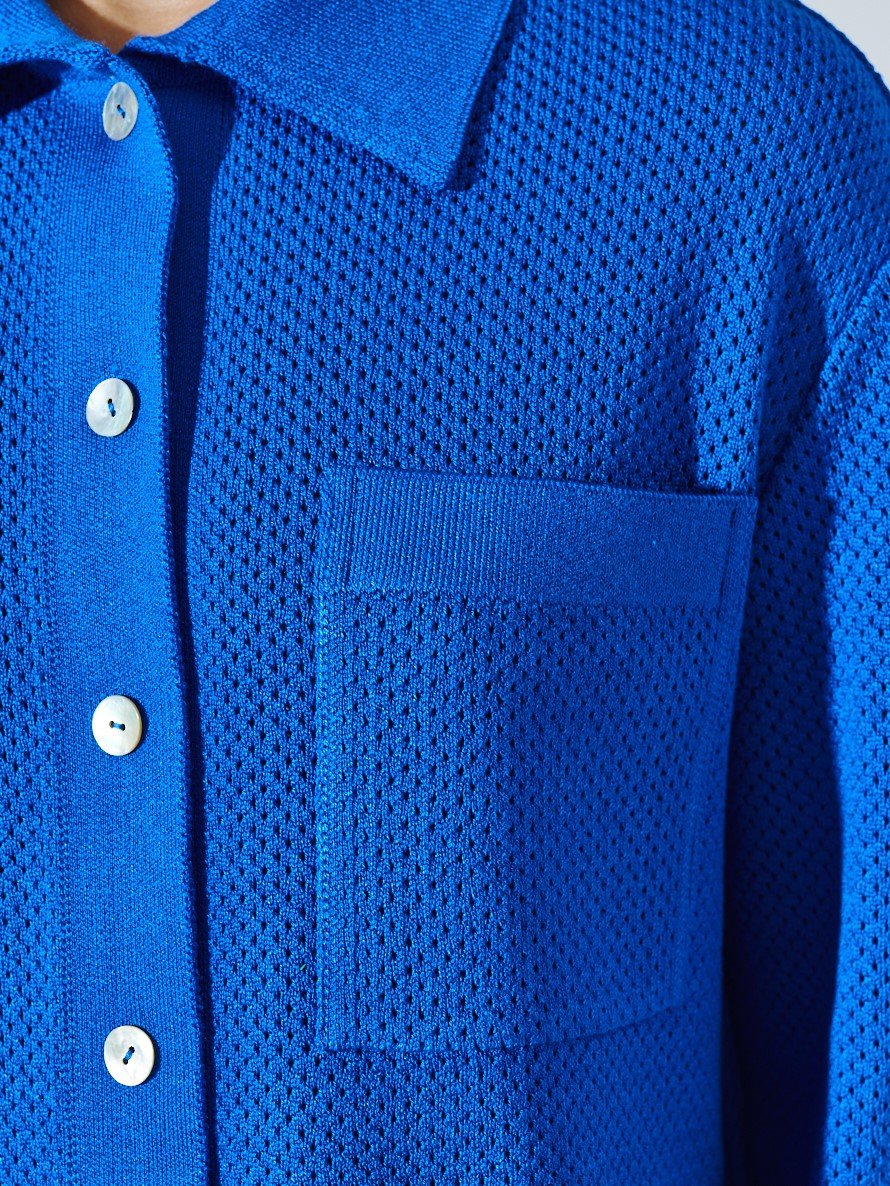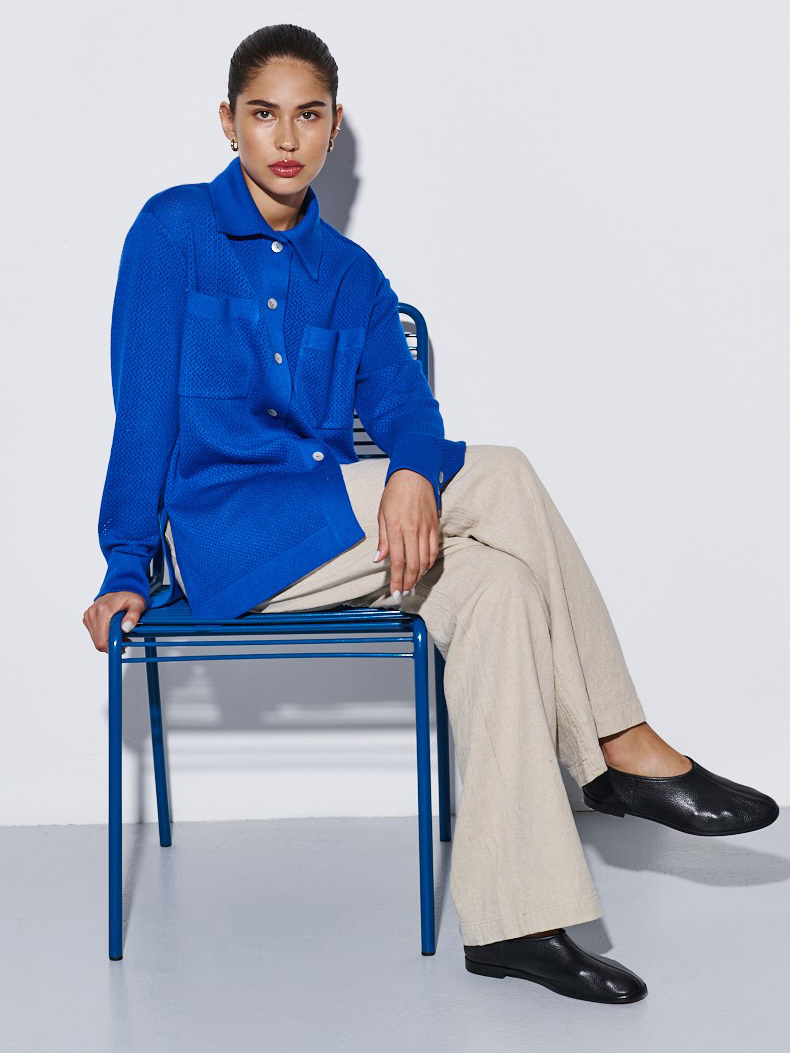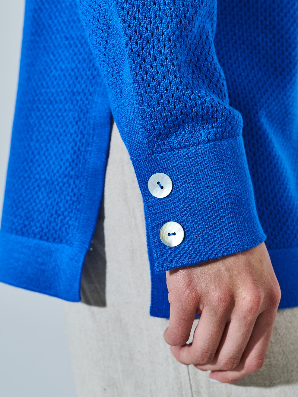 Легкая рубашка из хлопка, сбалансированного прохладной вискозой. Убедитесь, что лето в трикотаже 99colorspace – самое яркое и комфортное. Знаем, как капризны перфорированные узоры и вязаная сеточка. Поэтому дополнительно укрепили воротник и манжеты кардигана. Кайма по нижнему краю и планка из гладкого трикотажа служат «каркасом», который не позволит рубашке потерять форму. Глубокие боковые разрезы вносят в образ динамику и непринужденность. А еще с ними проще заправлять край полочки под ремень.