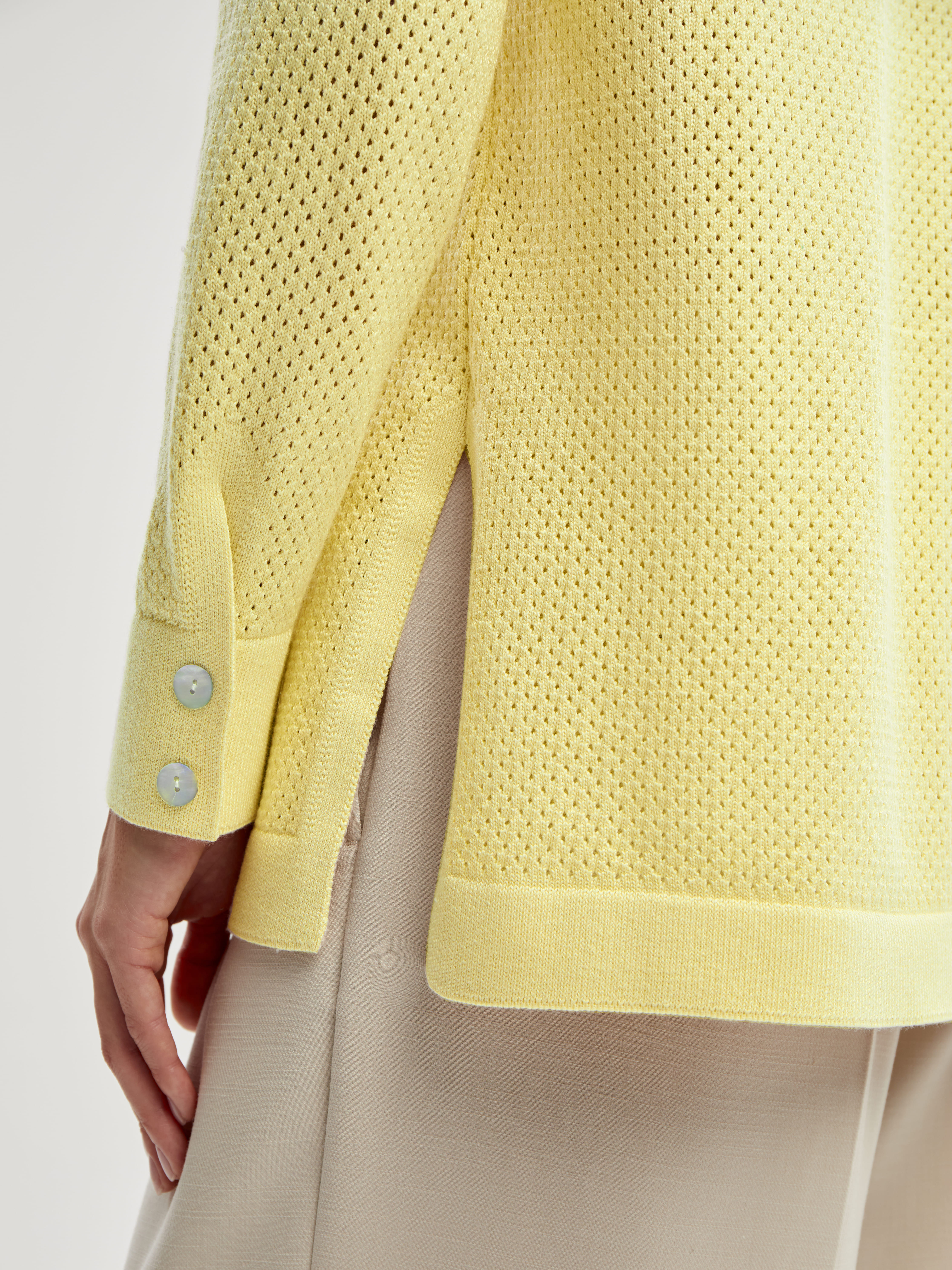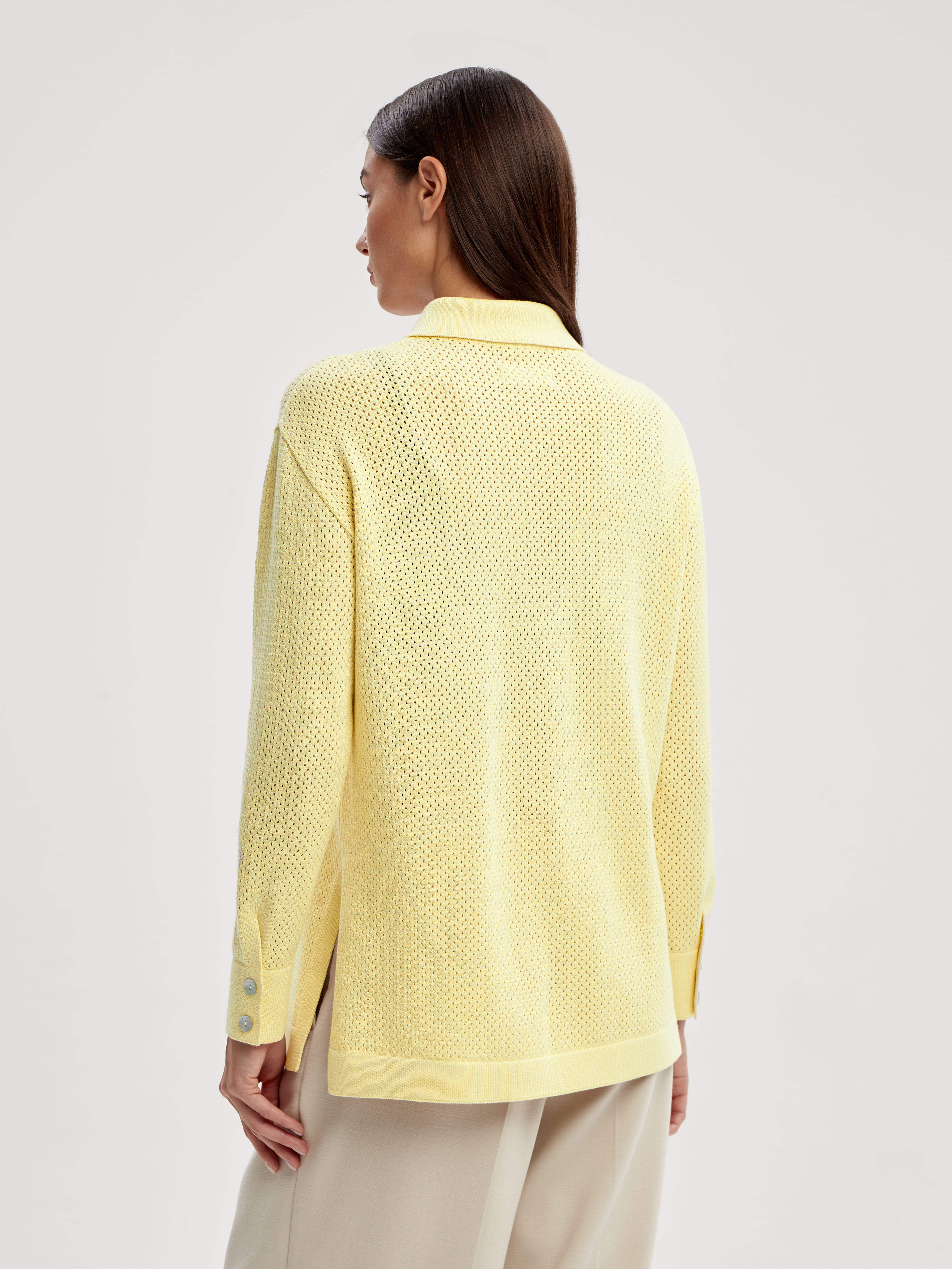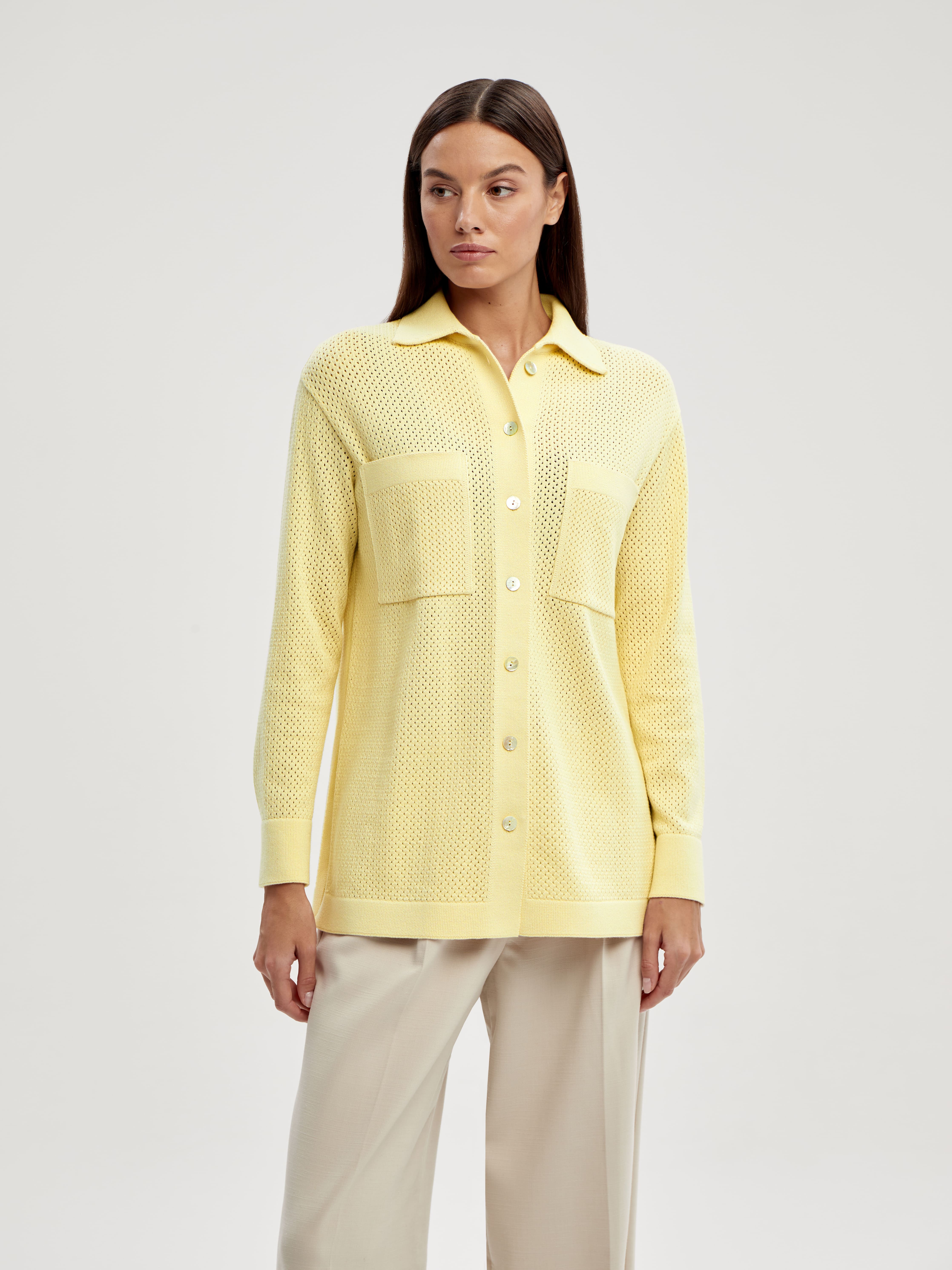 Легкая рубашка из хлопка, сбалансированного прохладной вискозой. Убедитесь, что лето в трикотаже 99colorspace – самое яркое и комфортное. Знаем, как капризны перфорированные узоры и вязаная сеточка. Поэтому дополнительно укрепили воротник и манжеты кардигана. Кайма по нижнему краю и планка из гладкого трикотажа служат «каркасом», который не позволит рубашке потерять форму. Глубокие боковые разрезы вносят в образ динамику и непринужденность. А еще с ними проще заправлять край полочки под ремень.