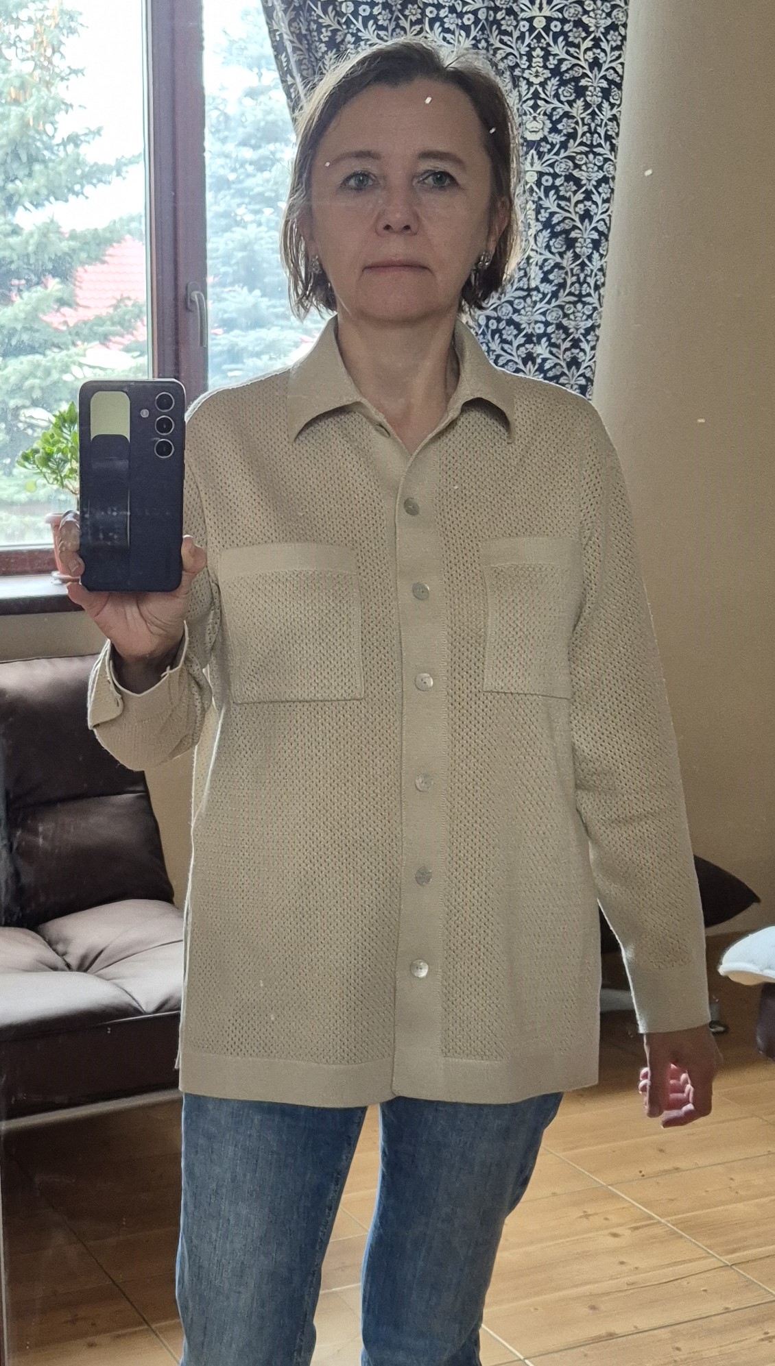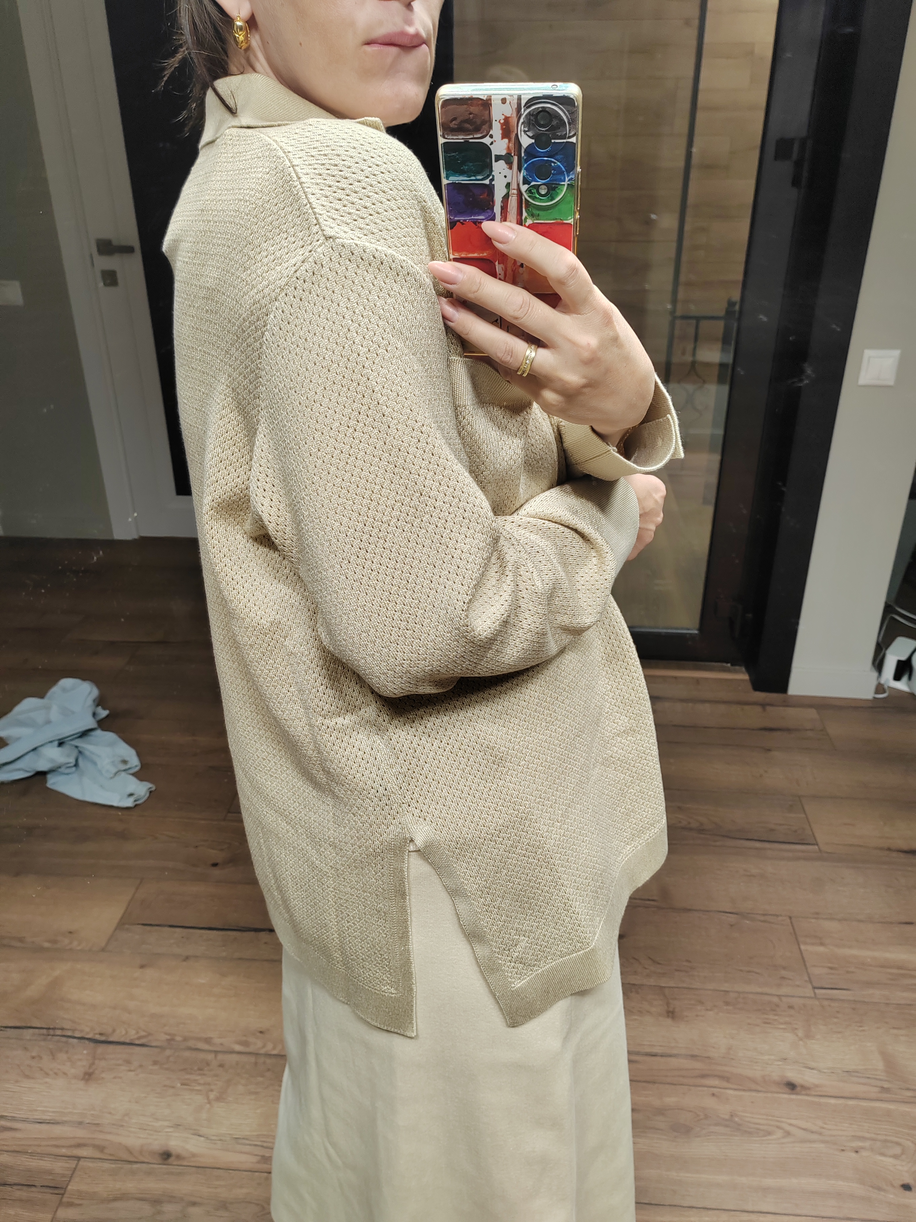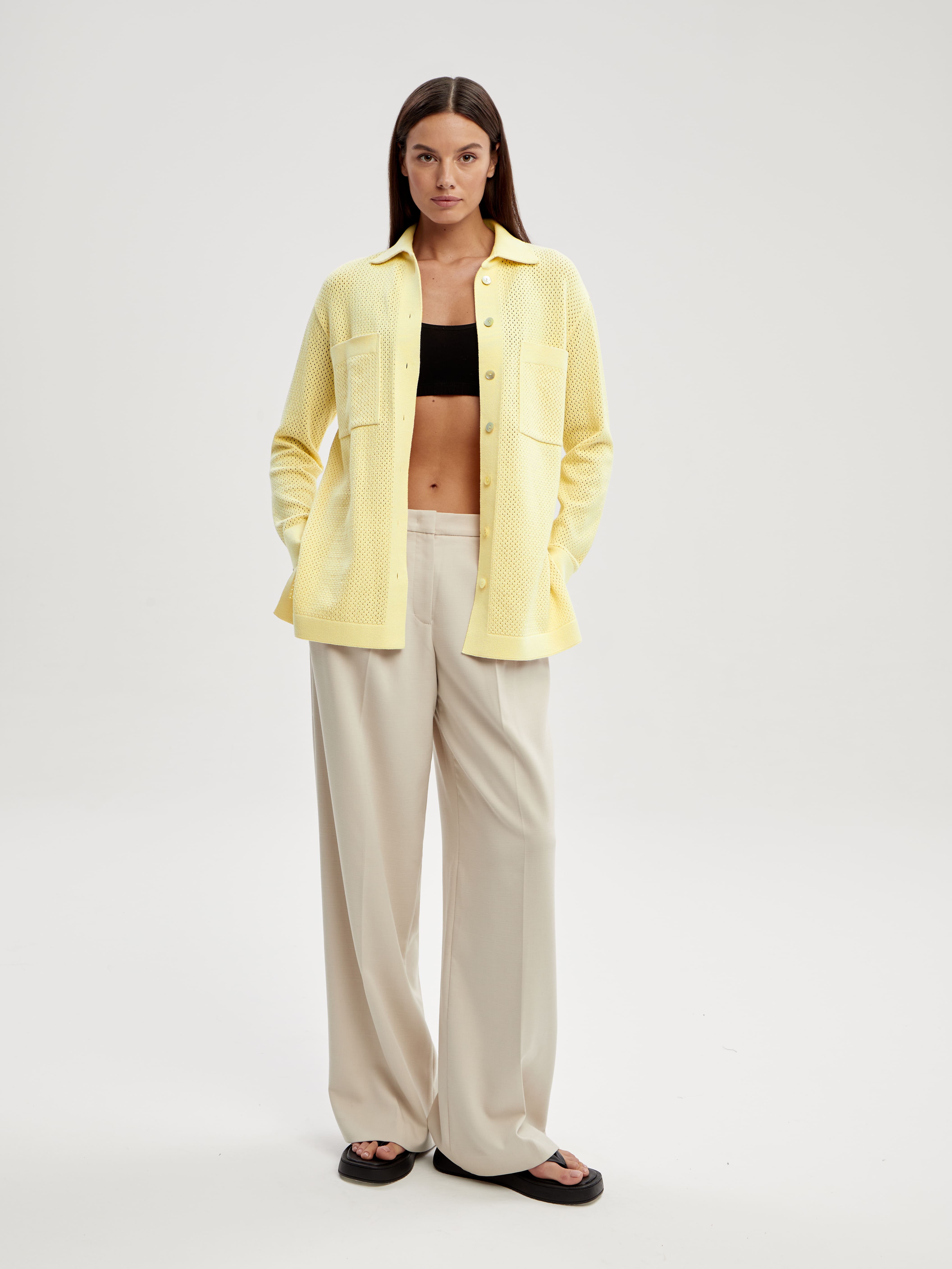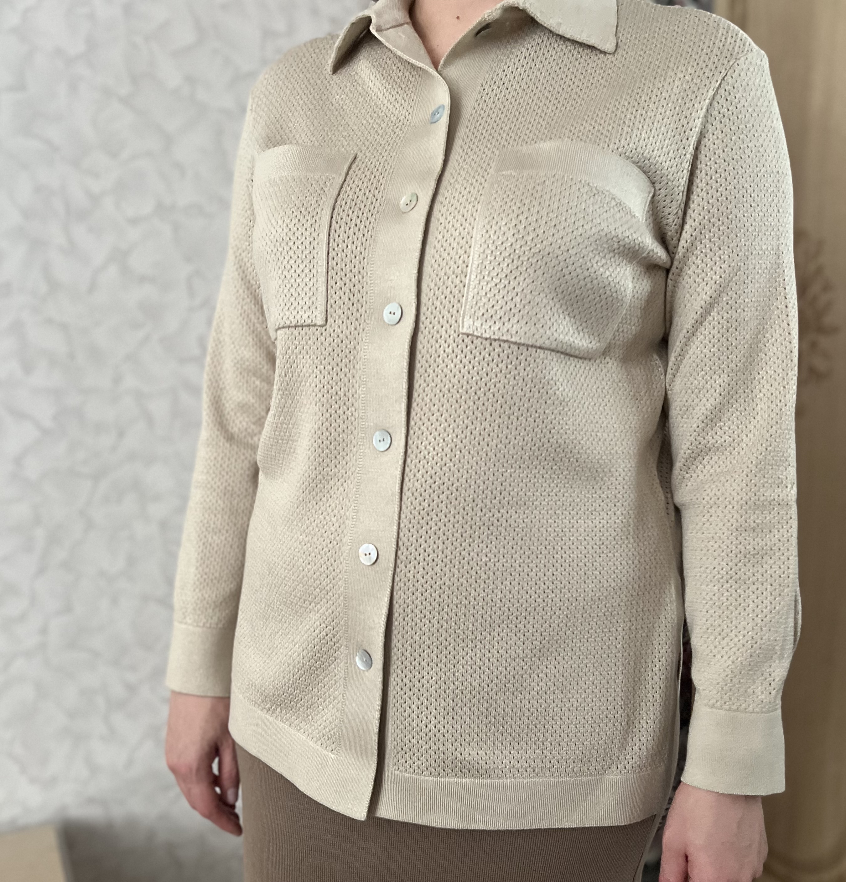 Легкая рубашка из хлопка, сбалансированного прохладной вискозой. Убедитесь, что лето в трикотаже 99colorspace – самое яркое и комфортное. Знаем, как капризны перфорированные узоры и вязаная сеточка. Поэтому дополнительно укрепили воротник и манжеты кардигана. Кайма по нижнему краю и планка из гладкого трикотажа служат «каркасом», который не позволит рубашке потерять форму. Глубокие боковые разрезы вносят в образ динамику и непринужденность. А еще с ними проще заправлять край полочки под ремень.