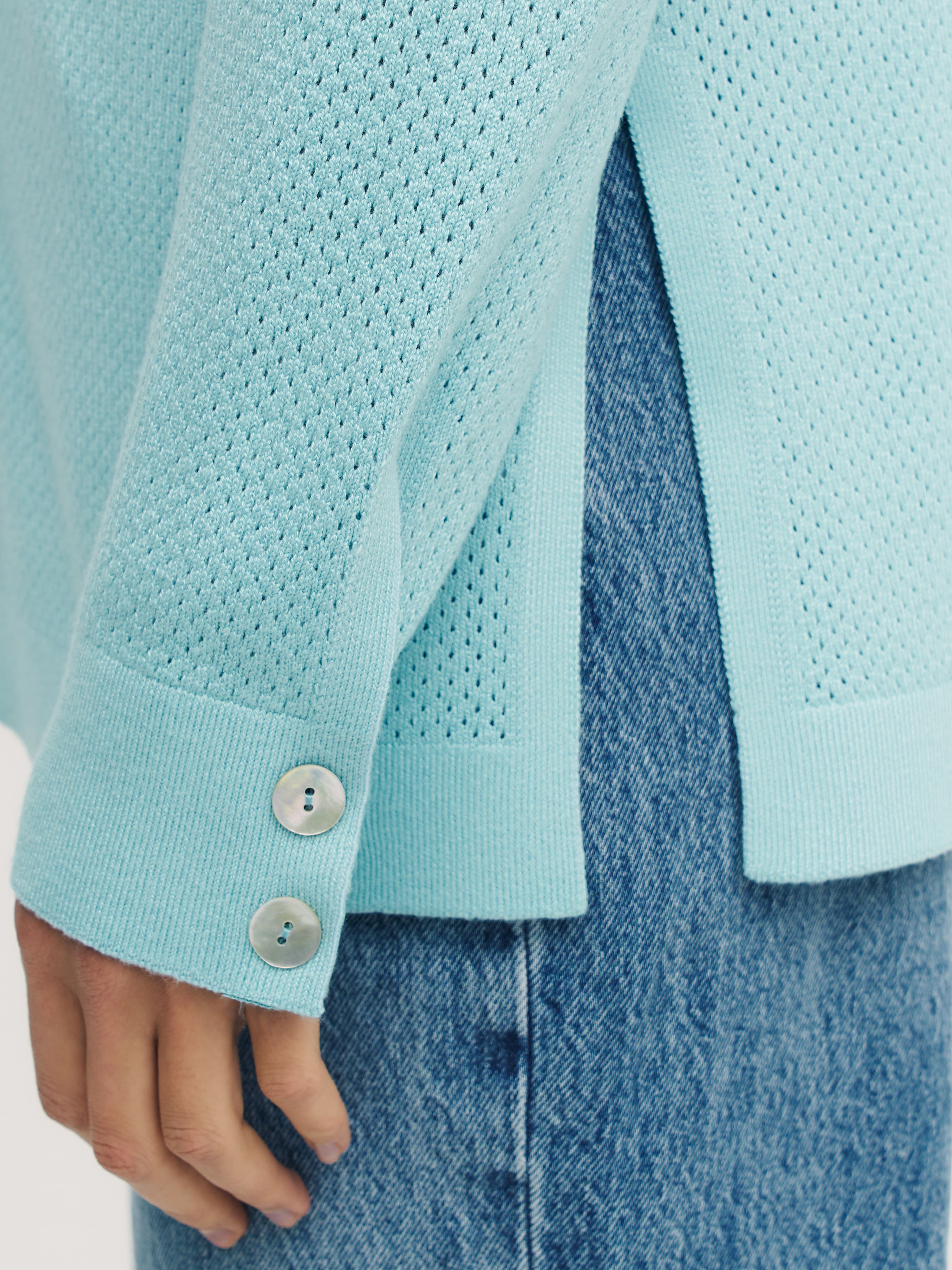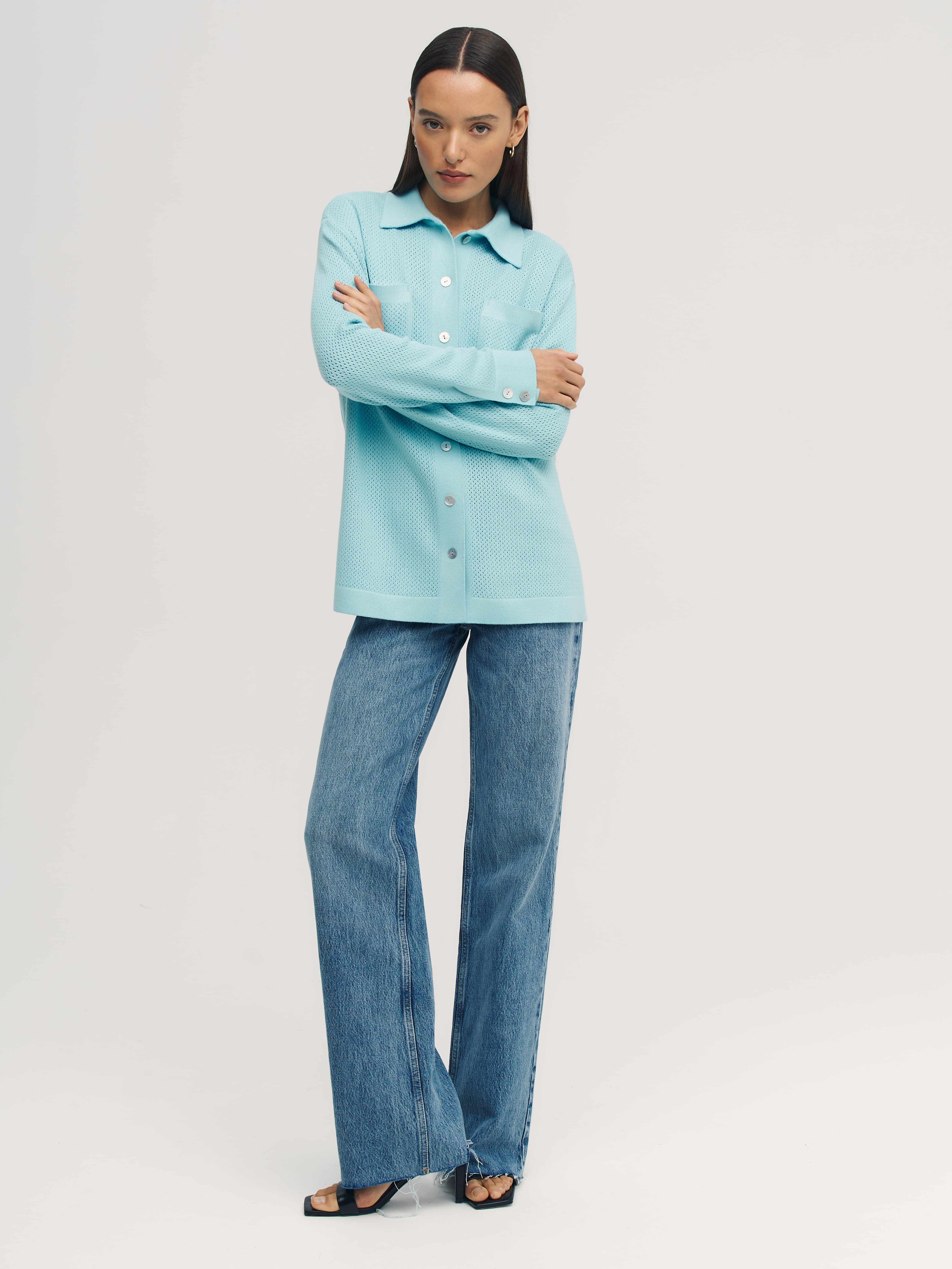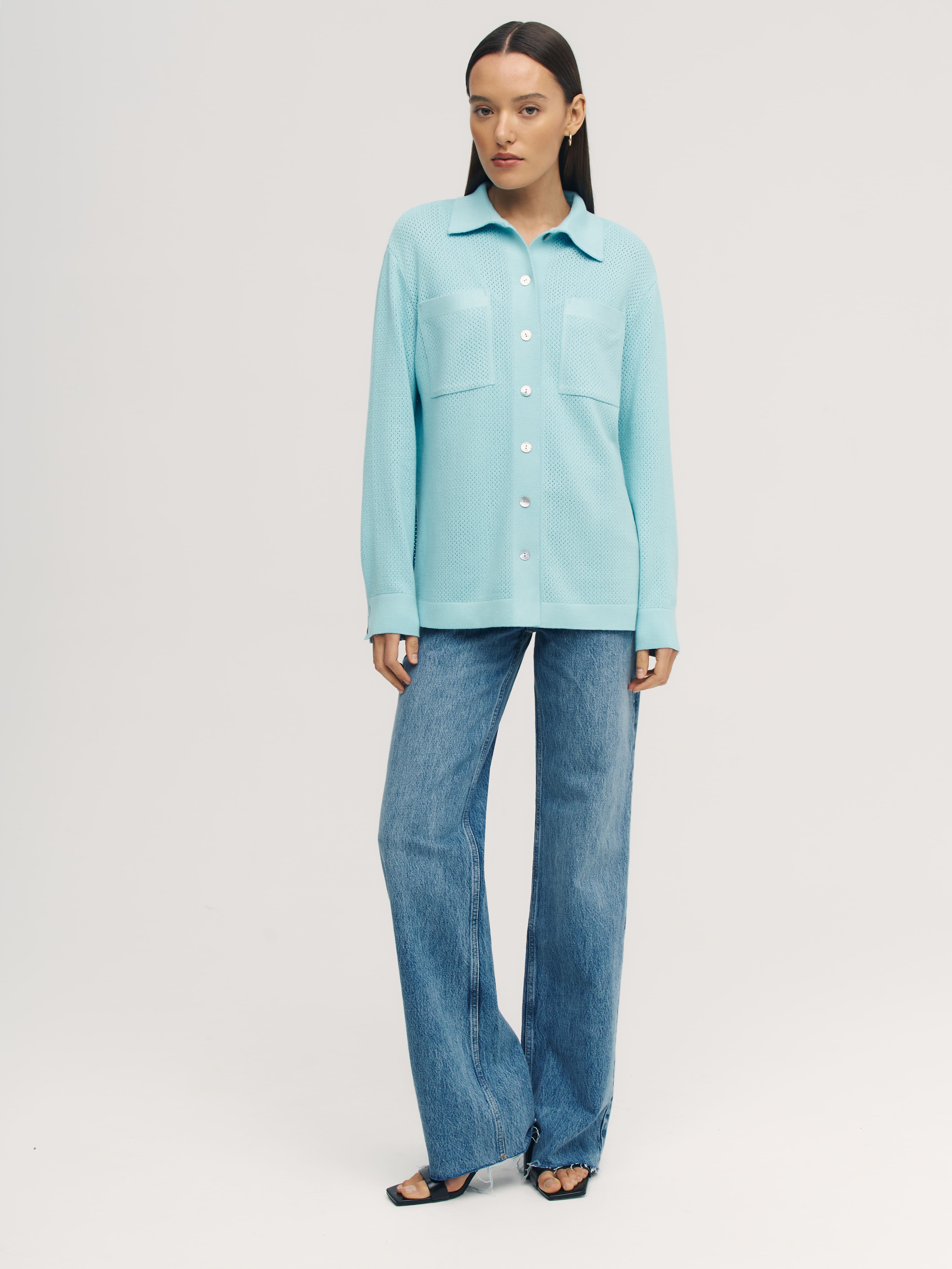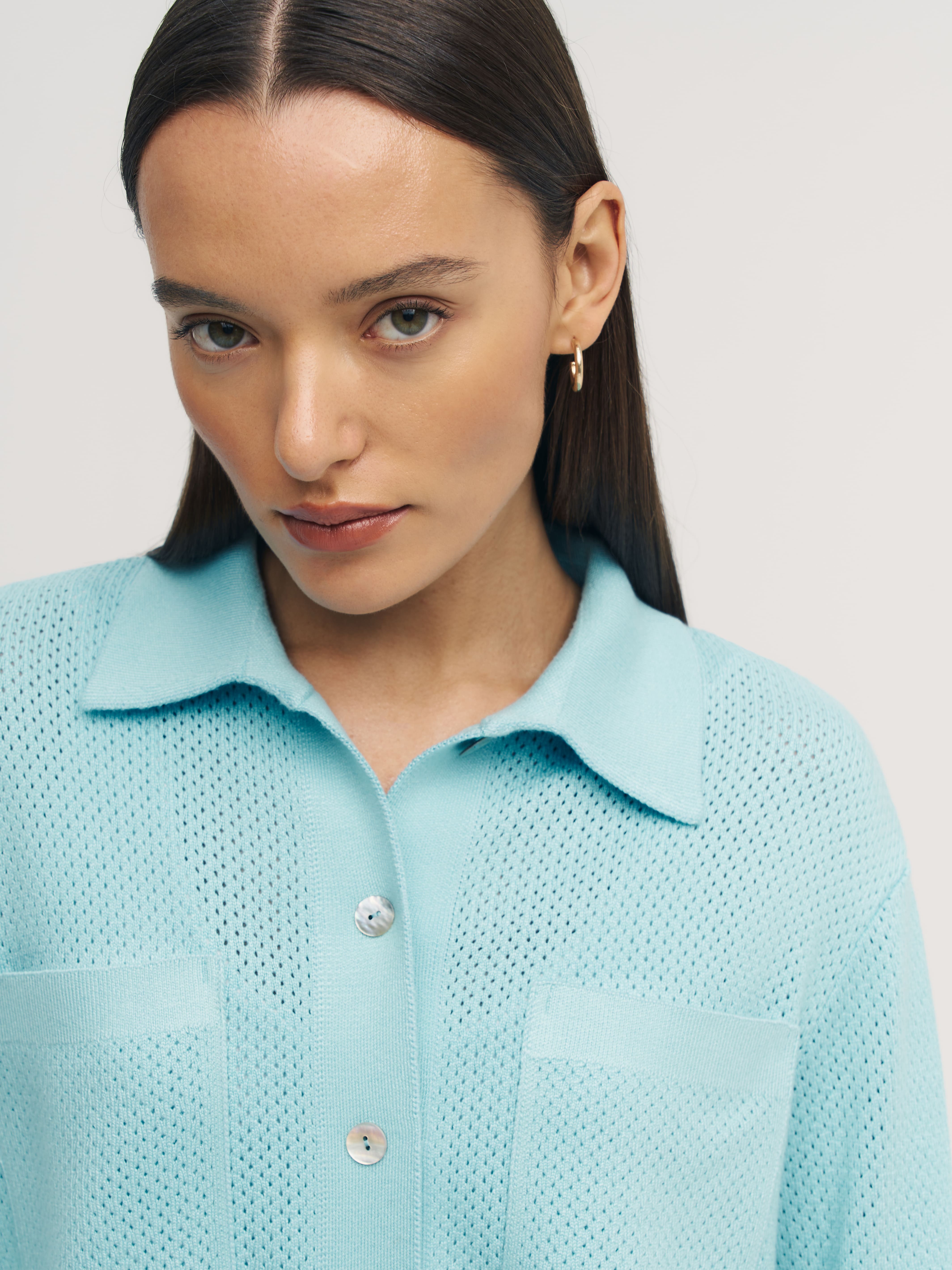 Легкая рубашка из хлопка, сбалансированного прохладной вискозой. Убедитесь, что лето в трикотаже 99colorspace – самое яркое и комфортное. Знаем, как капризны перфорированные узоры и вязаная сеточка. Поэтому дополнительно укрепили воротник и манжеты кардигана. Кайма по нижнему краю и планка из гладкого трикотажа служат «каркасом», который не позволит рубашке потерять форму. Глубокие боковые разрезы вносят в образ динамику и непринужденность. А еще с ними проще заправлять край полочки под ремень.