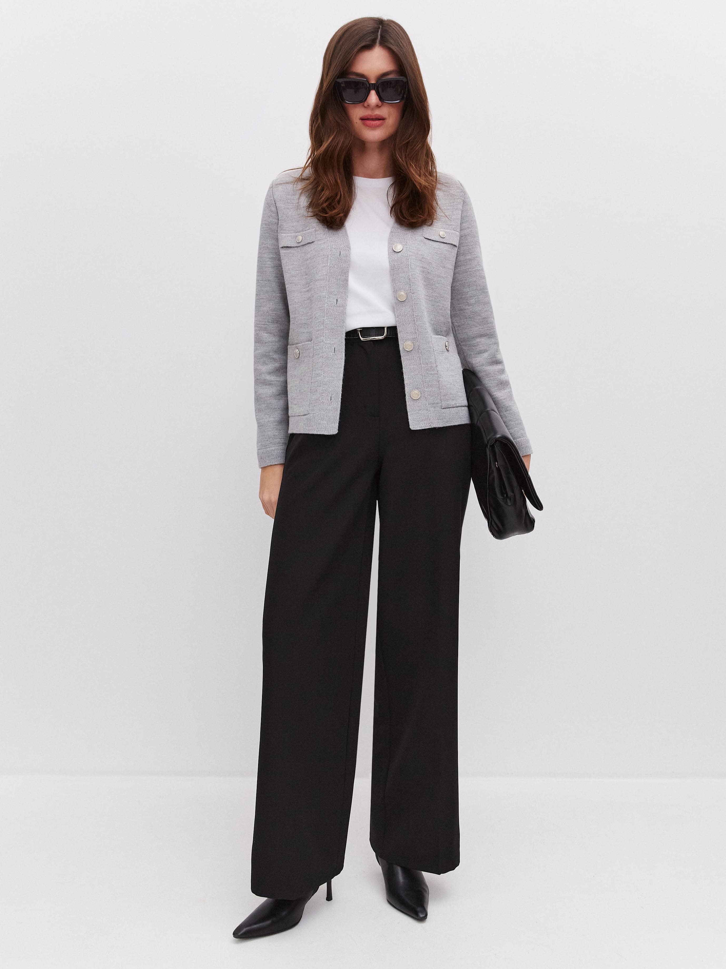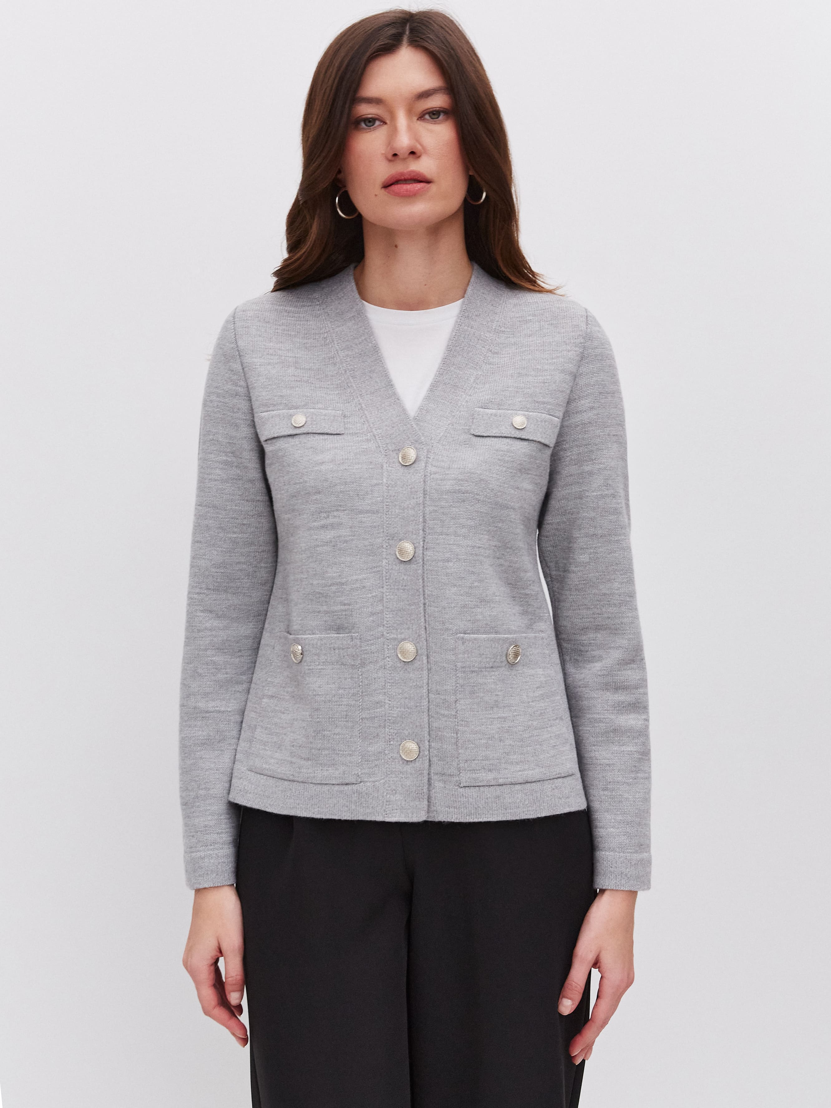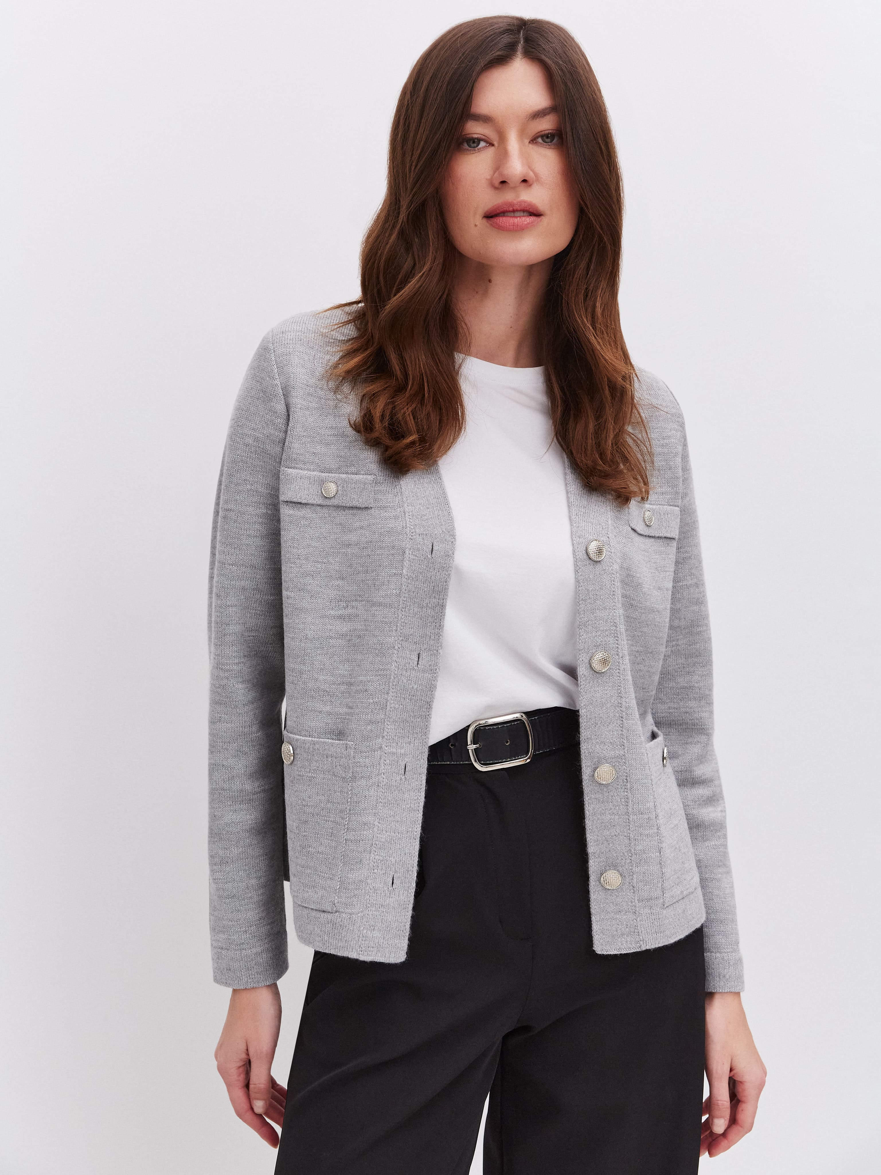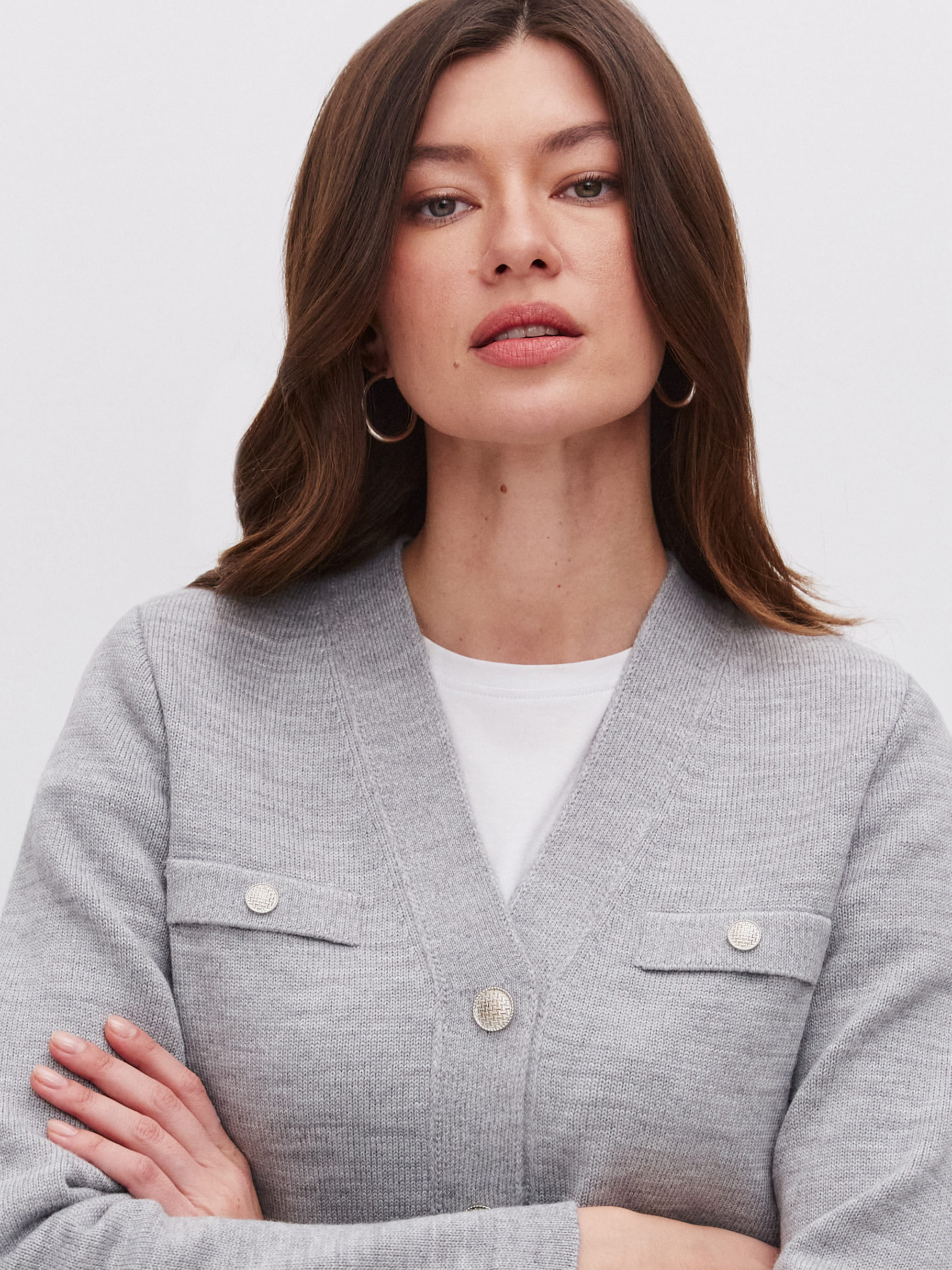 Кардиган в пиджачном стиле, который заменит самые любимые теплые кофточки. Стилизуется с чем угодно. Согревает на 200%. Связан из тонкой мериносовой шерсти extra fine, уплотненной смесью акрила и полиамида. Модель выпускается в двух дизайнерских решениях – однотонном и с контрастными деталями.