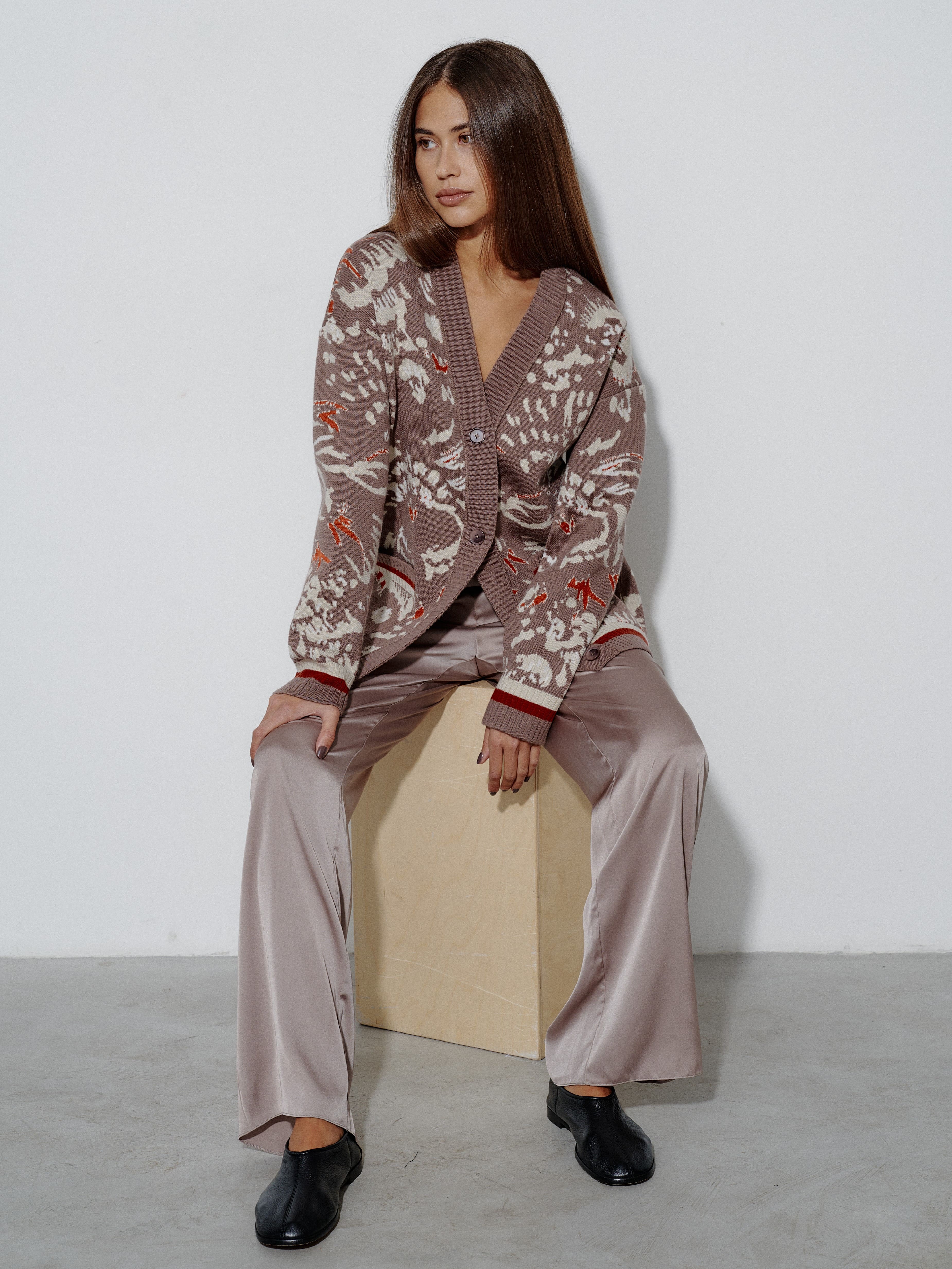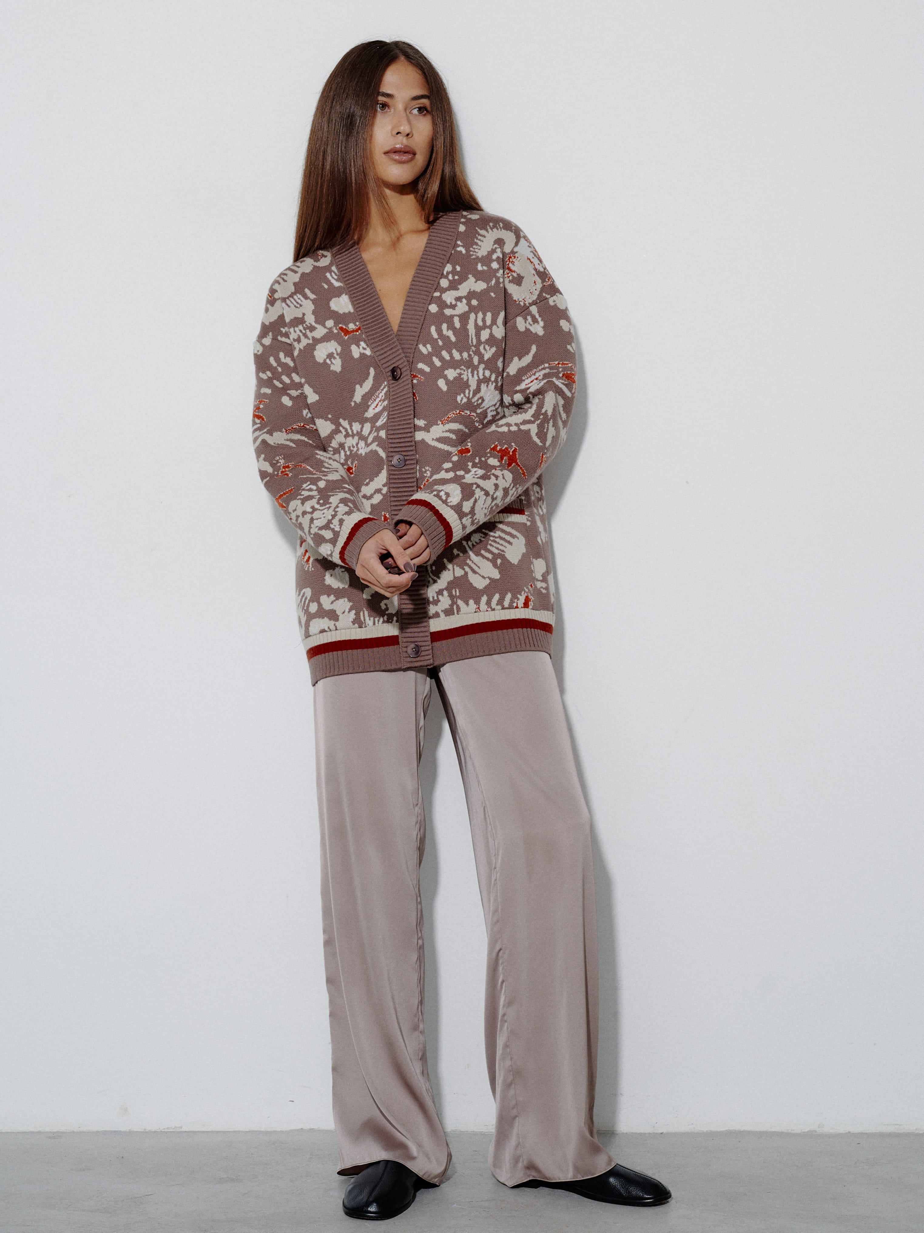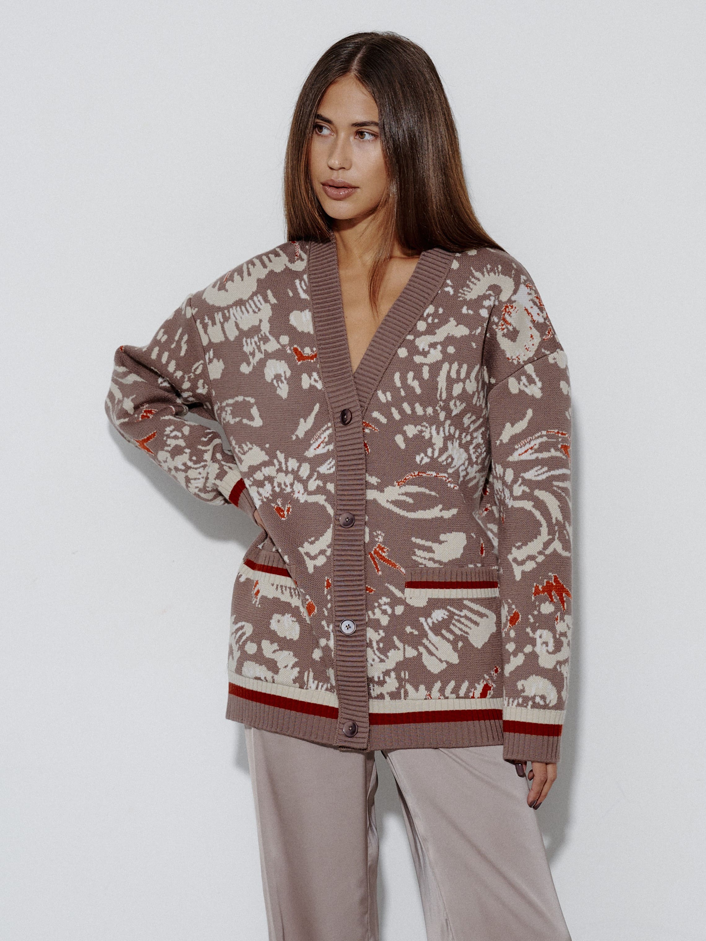 Уютный объемный кардиган, вдохновленный пожеланиями поклонниц бренда. Мы создали его как более теплую альтернативу топовой модели Гарда. Для этого вискозу в составе трикотажа заменили тонковолокнистой мериносовой шерстью, которую, для оптимального баланса, усилили легким акрилом. Авторский принт, ставший визиткой бренда, прекрасно впишется в осенние прогулки и зимние праздники в семейном кругу.
