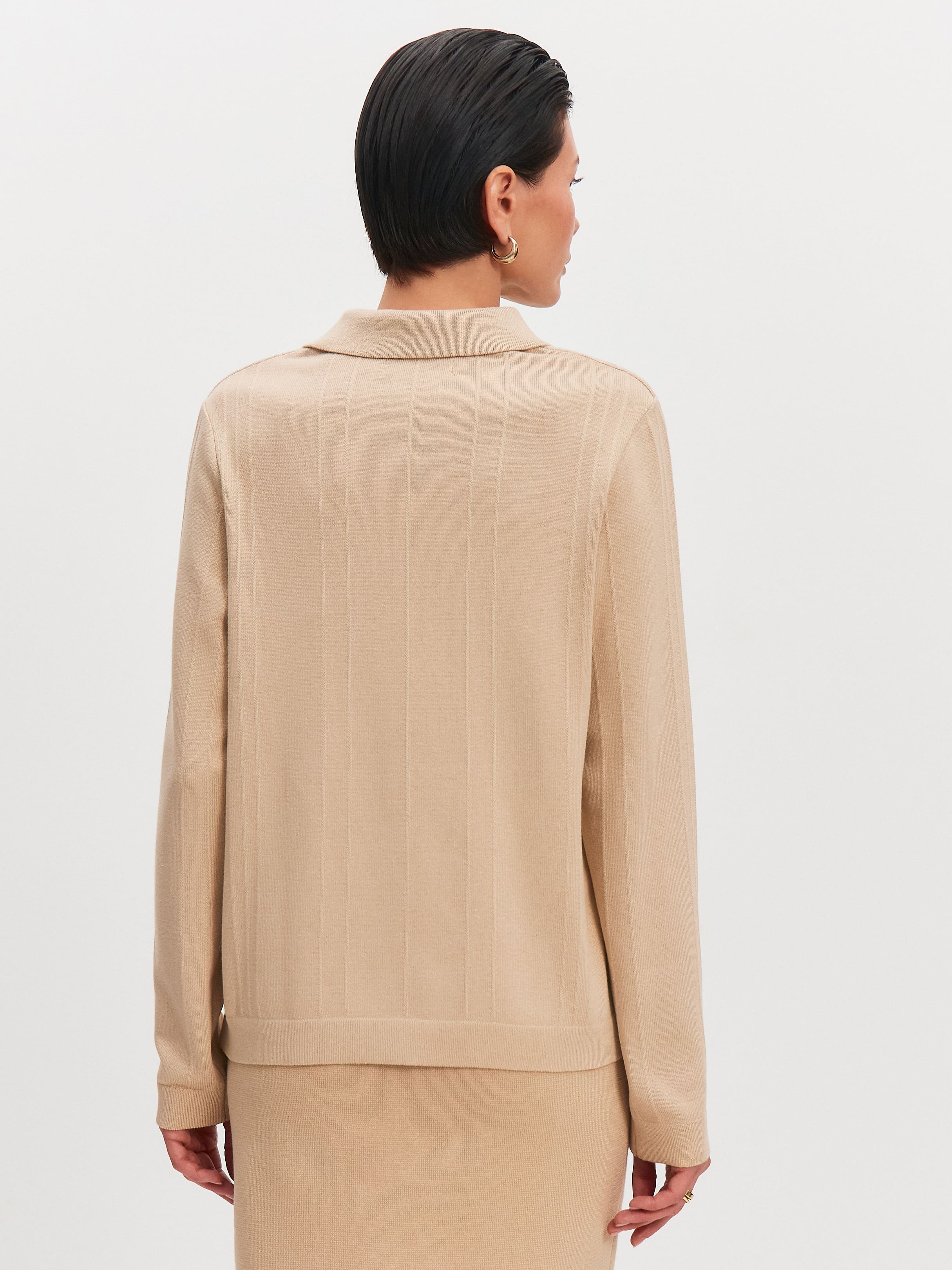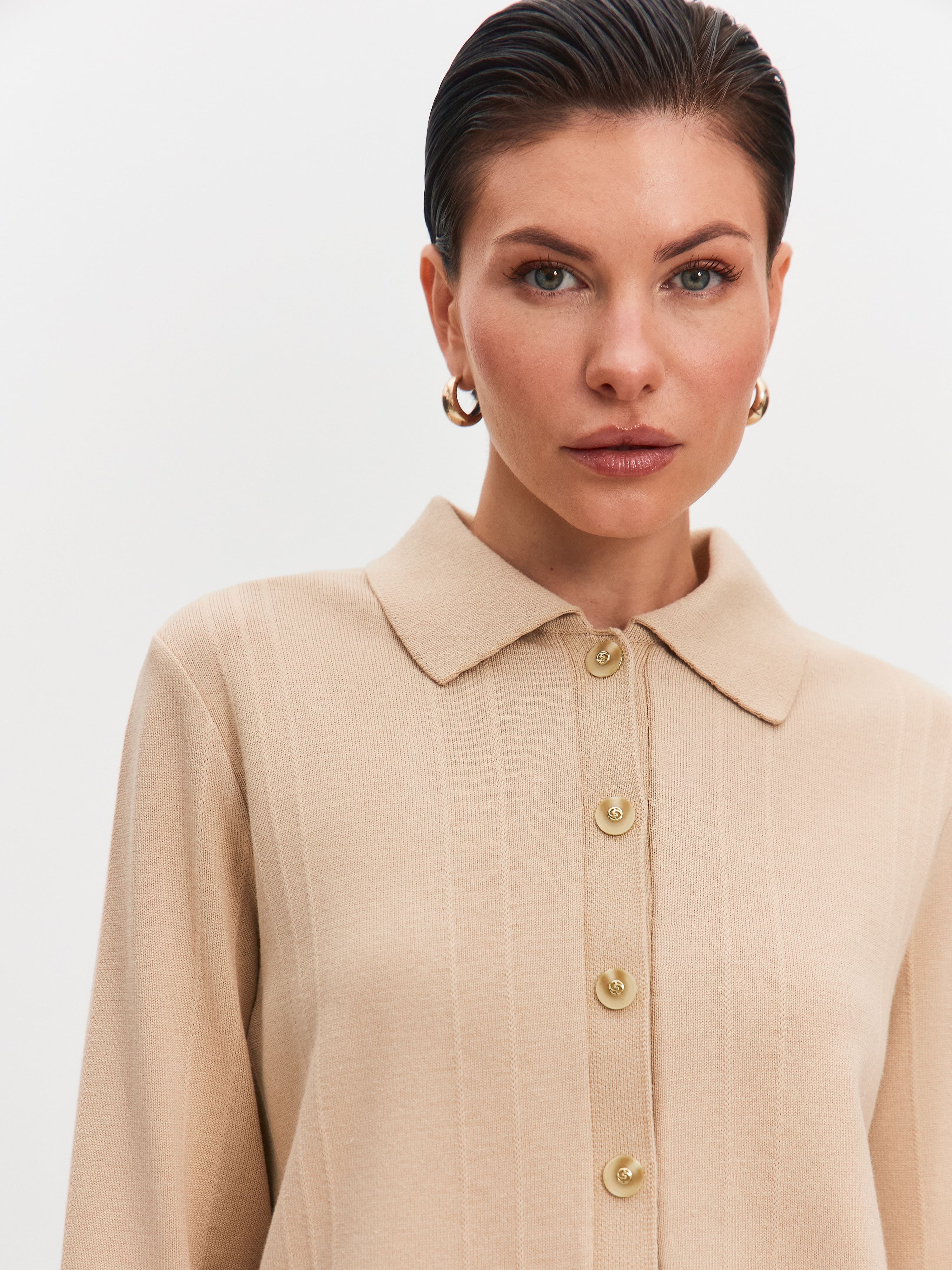 Прямой кардиган на пуговицах, декорированный тонкими вязаными строчками. По-классически сдержанный, универсальный в посадке, с приятной гладкой текстурой. Изготовлен из плотно переплетенной хлопко-вискозы, которая дышит вместе с телом. Отложной воротник, края манжет и низ аккуратно уплотнены. Добавление в состав пряжи вискозных волокон несет двойной смысл. С ними трикотаж становится шелковистым на ощупь, а хлопок приобретает устойчивость к распушению.