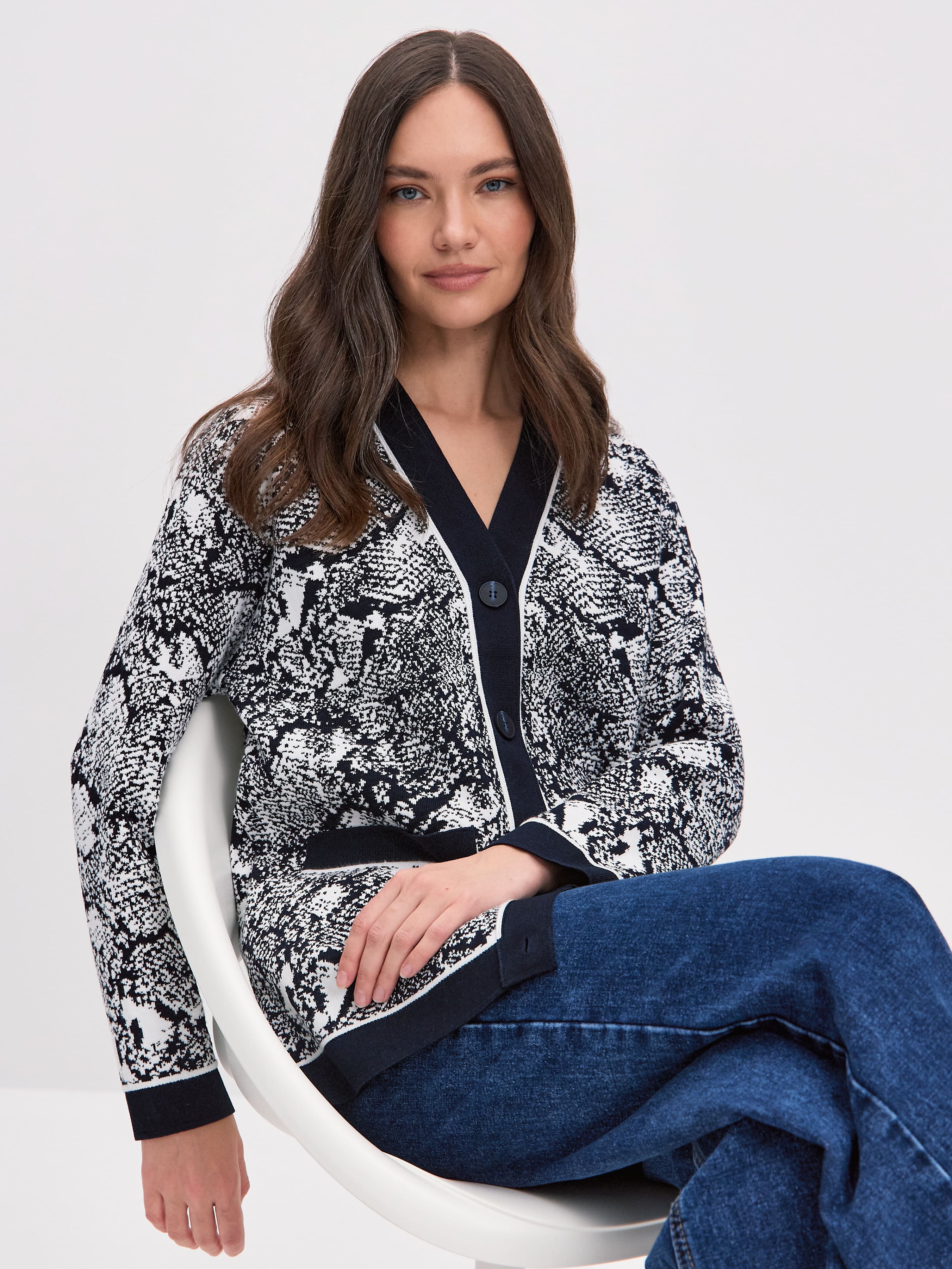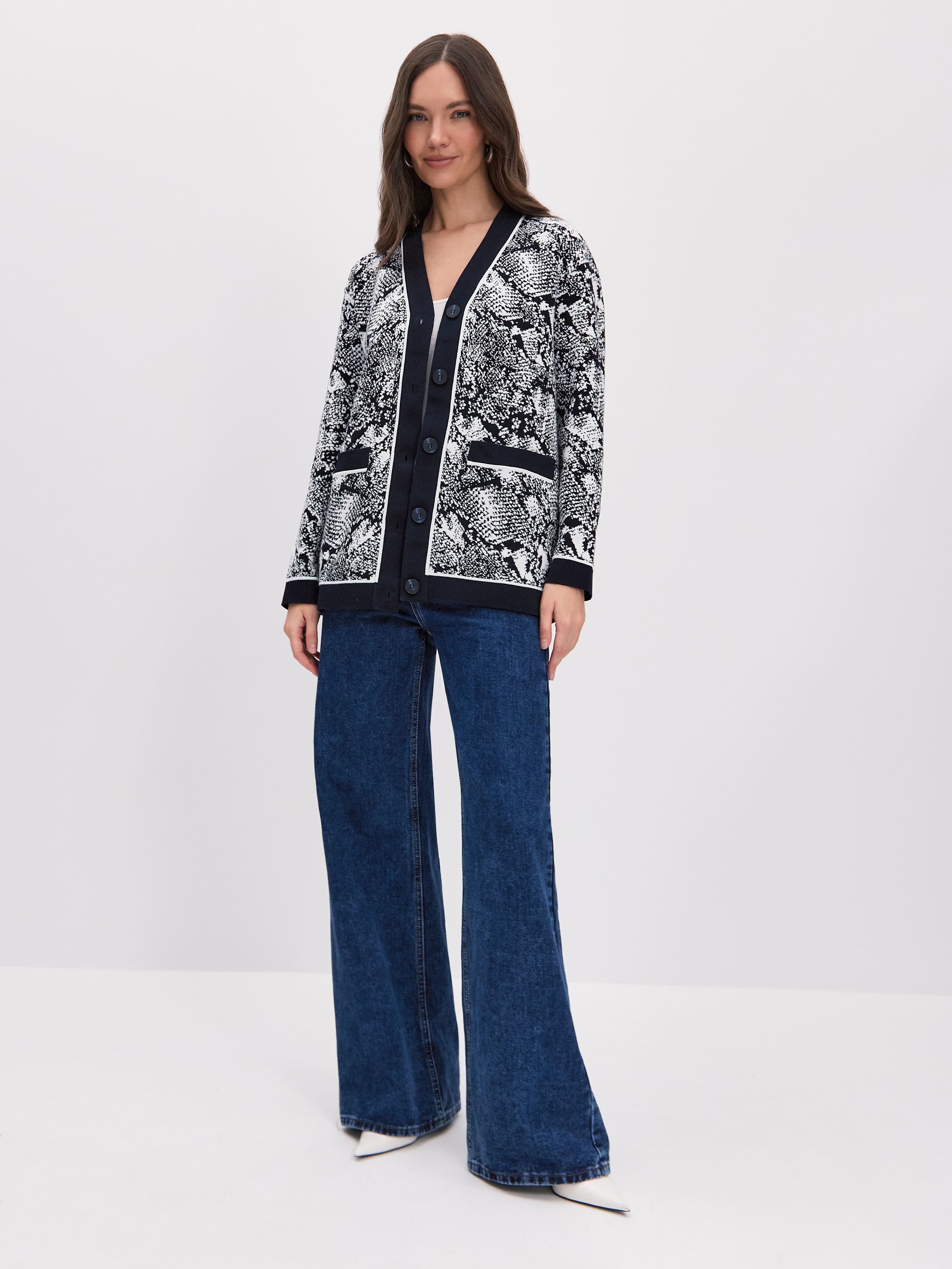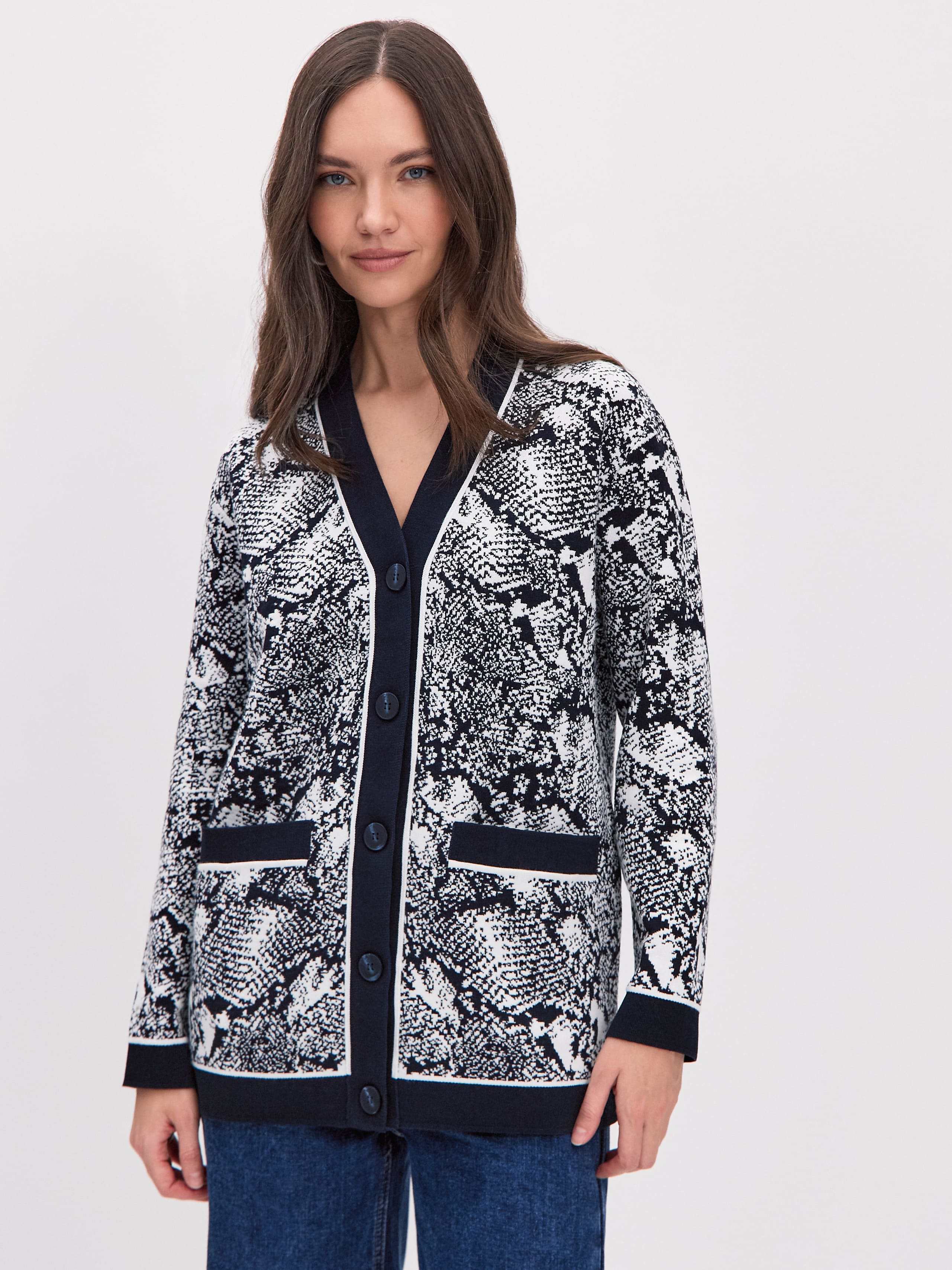 Стильный кардиган из шелковистой, приятной телу вискозы создавался, чтобы поддержать тренд на тактильность. В итоге трикотаж приобрел оптимальную плотность, но остался невероятно комфортным на ощупь. Удлиненная модель дополнительно усилена сложным принтом, так что станет ярким акцентом в любом повседневном образе.