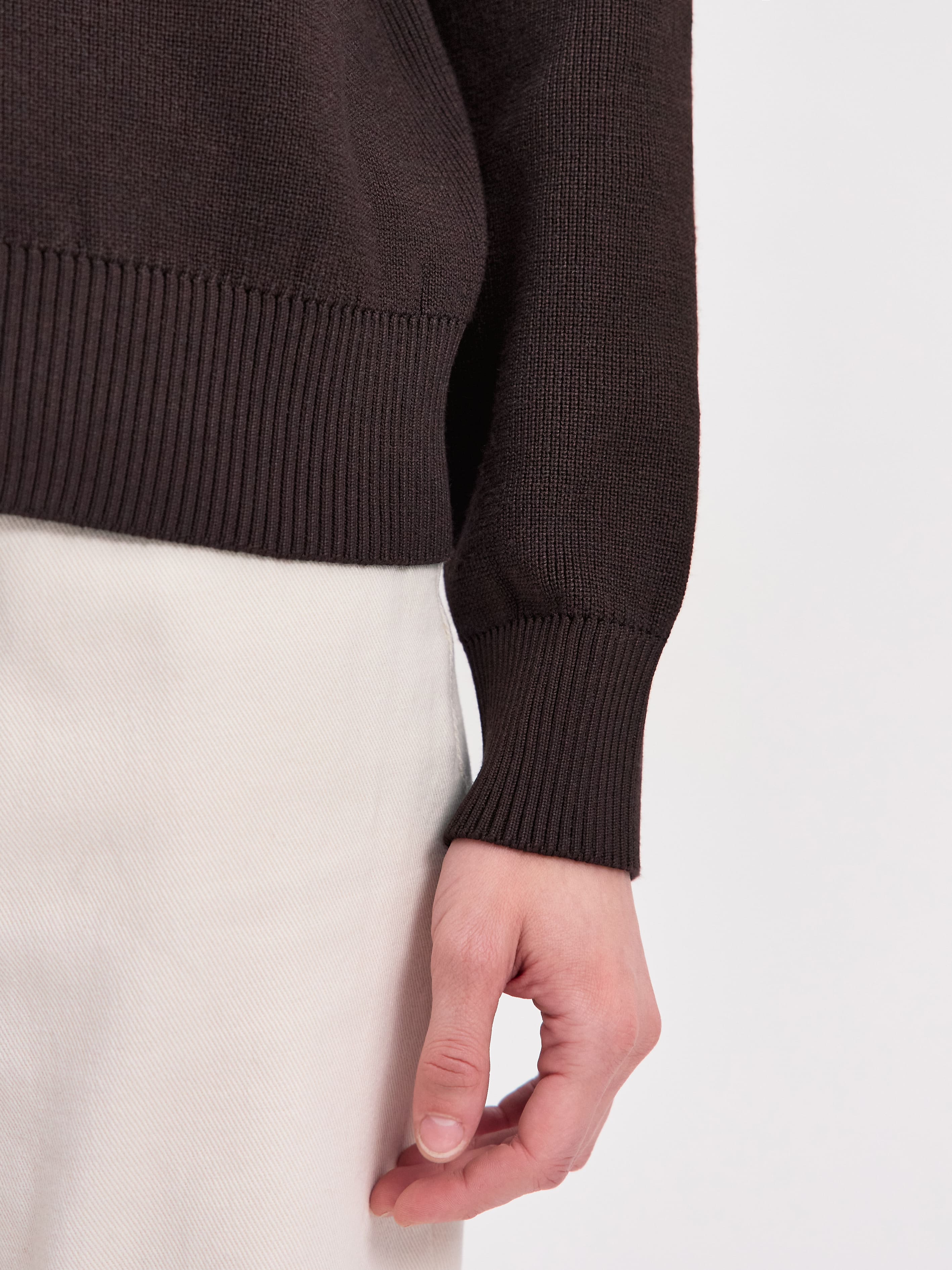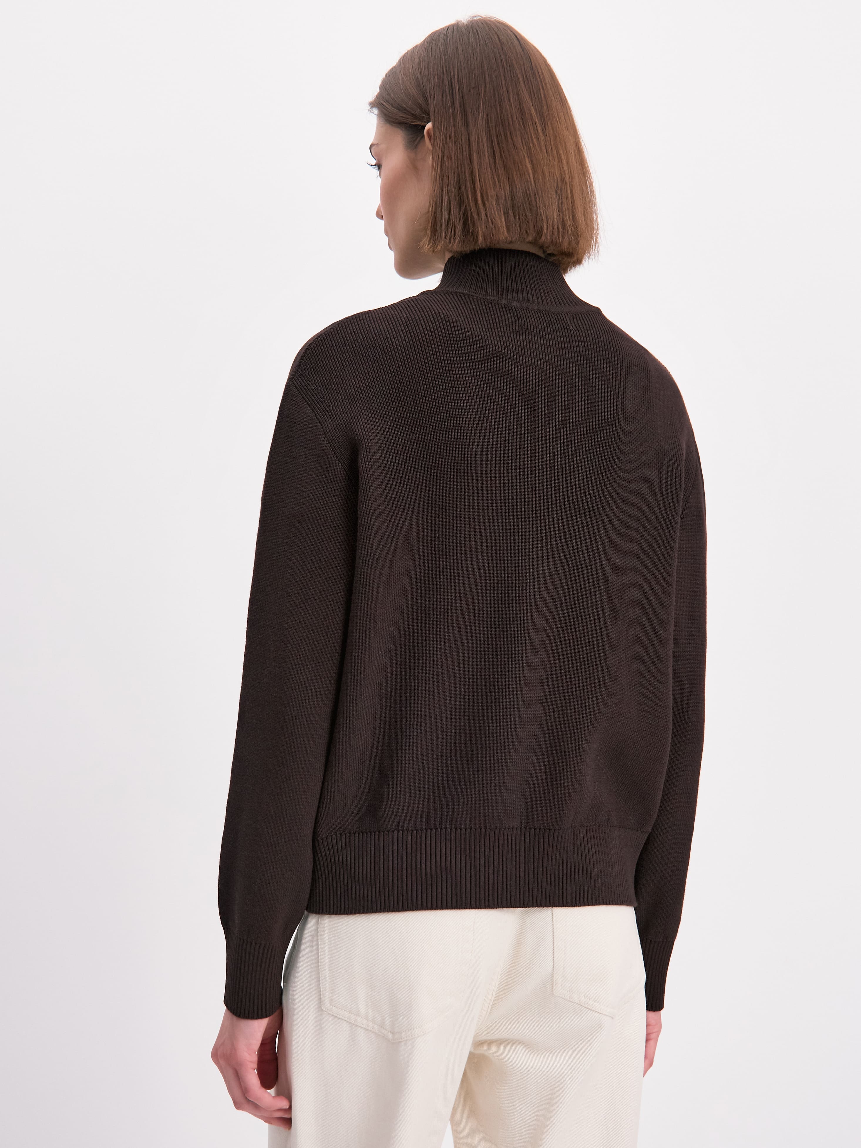 Джемпер лаконичного силуэта с чуть заниженной линией плеча для моментов, когда важно чувствовать себя комфортно и защищенно. Высокий ворот вывязан резинкой и предполагает несколько способов стайлинга, благодаря ряду крупных пуговиц. Горловину можно застегнуть до конца или оставить шею приоткрытой. Хлопковый трикотаж изделия сбалансирован вискозой, которая помогает ему удерживать форму в посадке. Идеальный вариант джемпера для морских прогулок и весенних вечеров. Плотный, дышащий,  достаточно просторный, чтобы разместить под собой нижний слой в виде футболки.