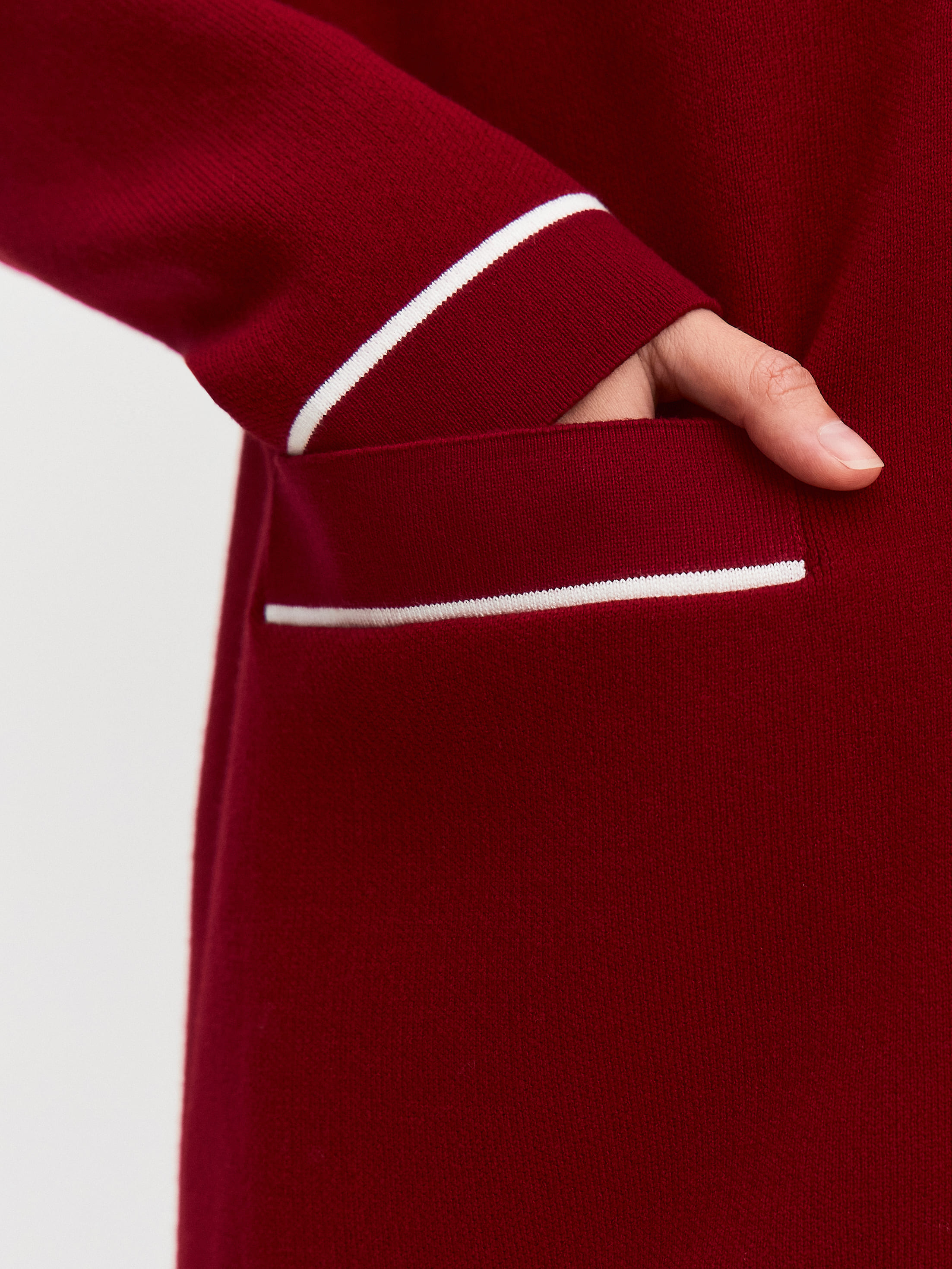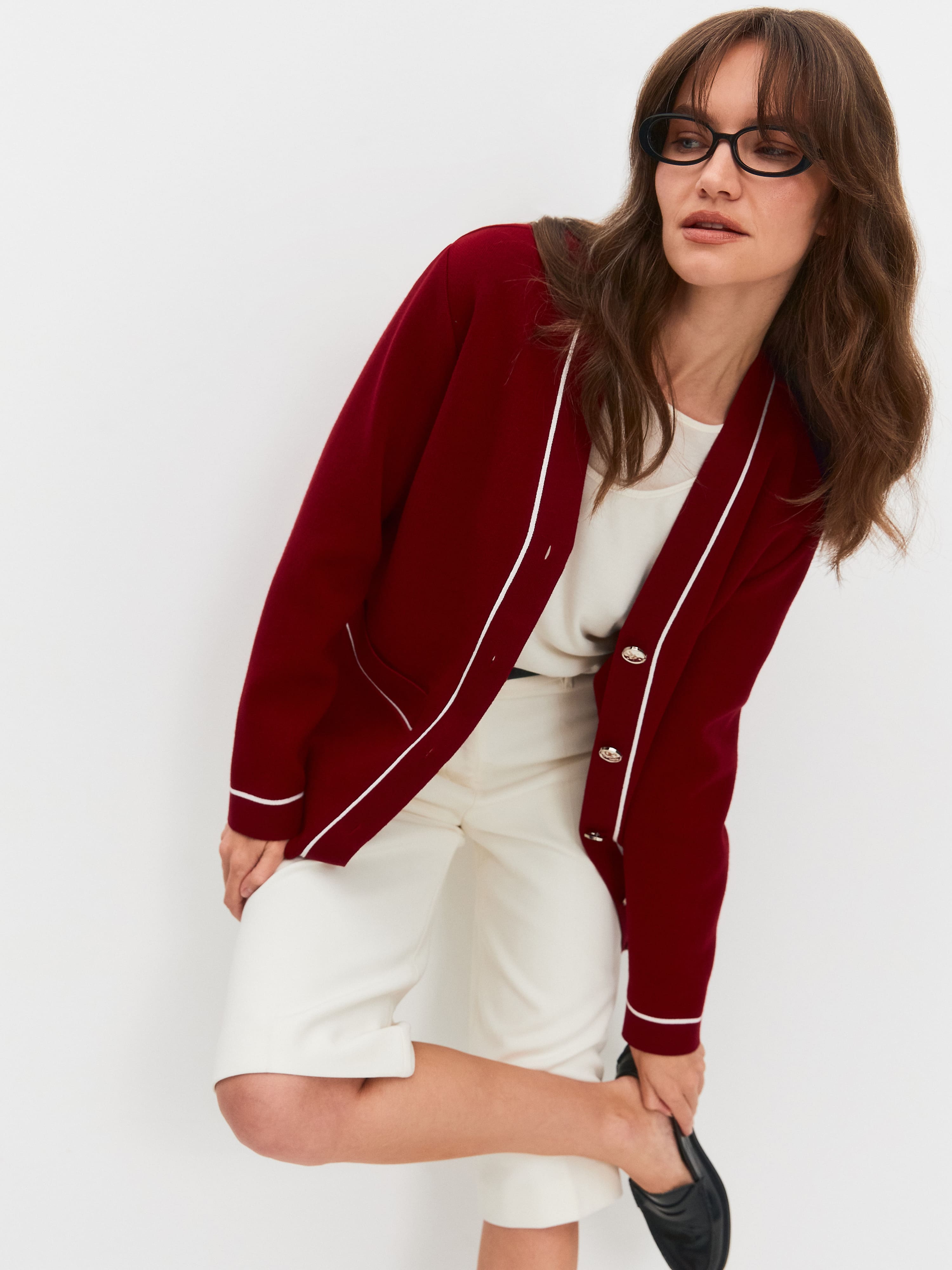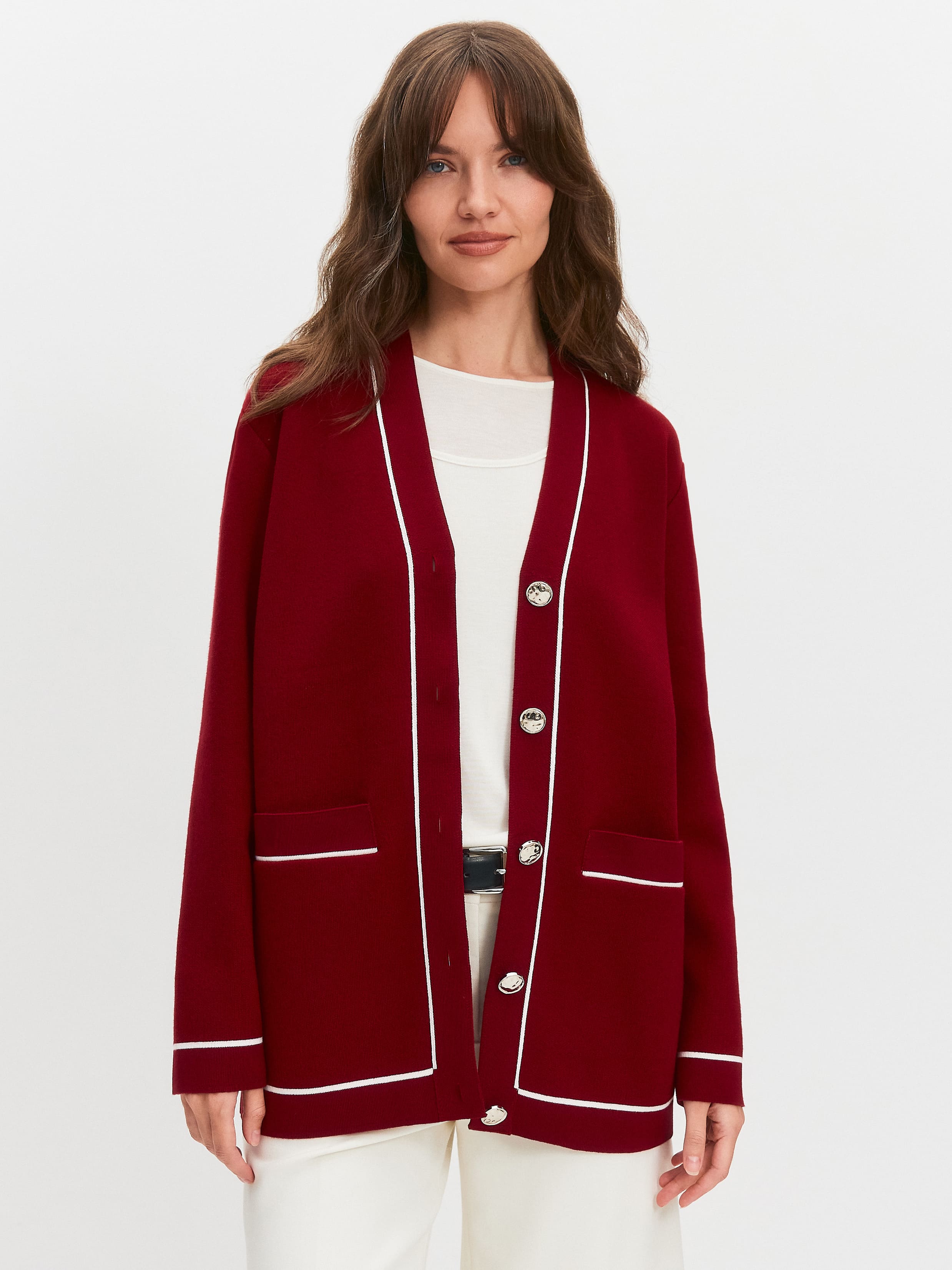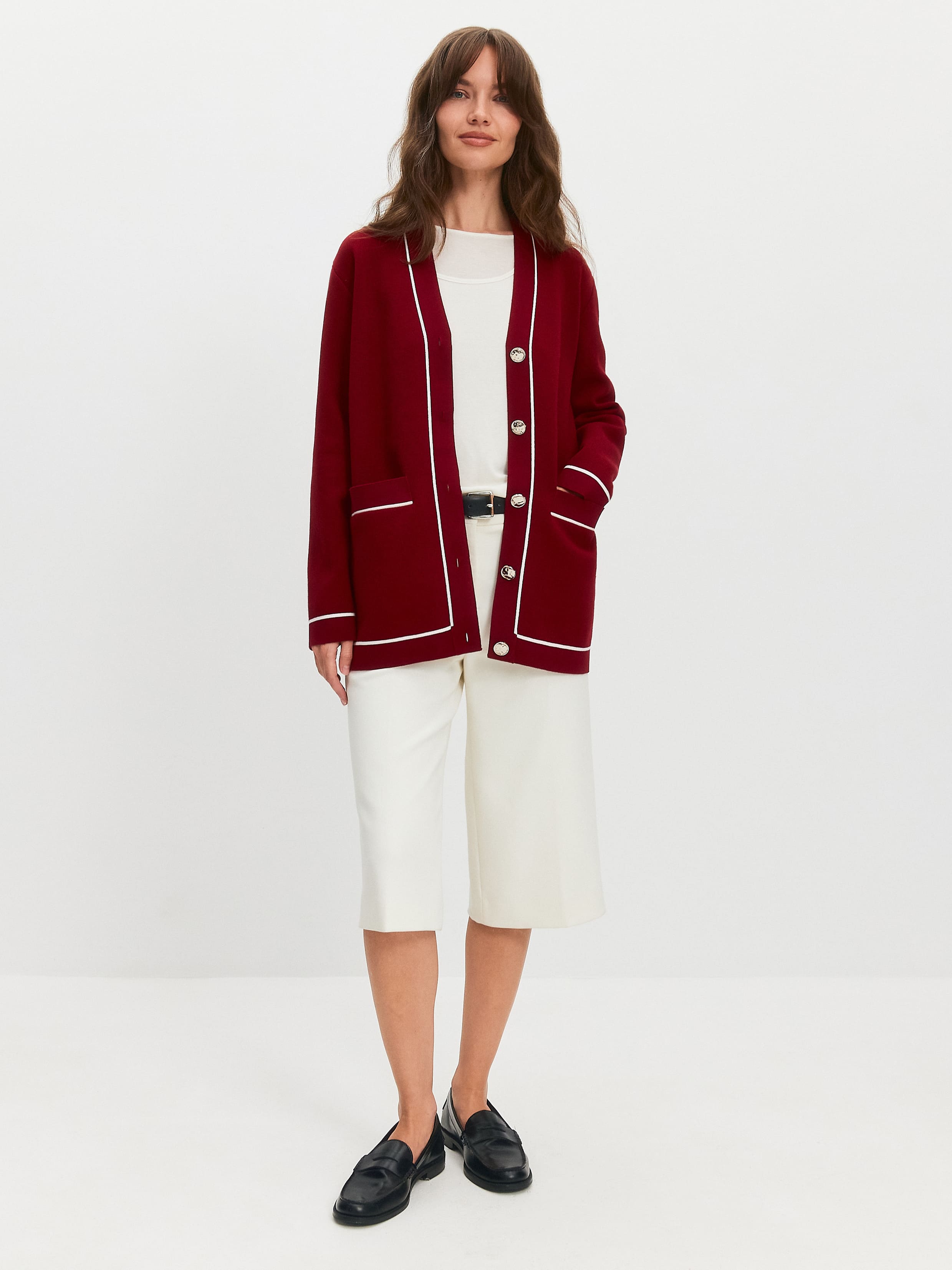 Акцентный кардиган с контрастными вязаными элементами и пуговицами с позолотой. V-образный вырез и актуальный прямой крой рифмуют модель со множеством вещей и аксессуаров. Вместительные внутренние карманы оформлены листочкой с полоской. Сочетание узкого канта вдоль планки с горизонтальными линиями на полочках структурирует и собирает силуэт. Трикотаж плотный на ощупь, шелковисто-гладкий, благодаря смешению хлопка с тонким волокном вискозы.
