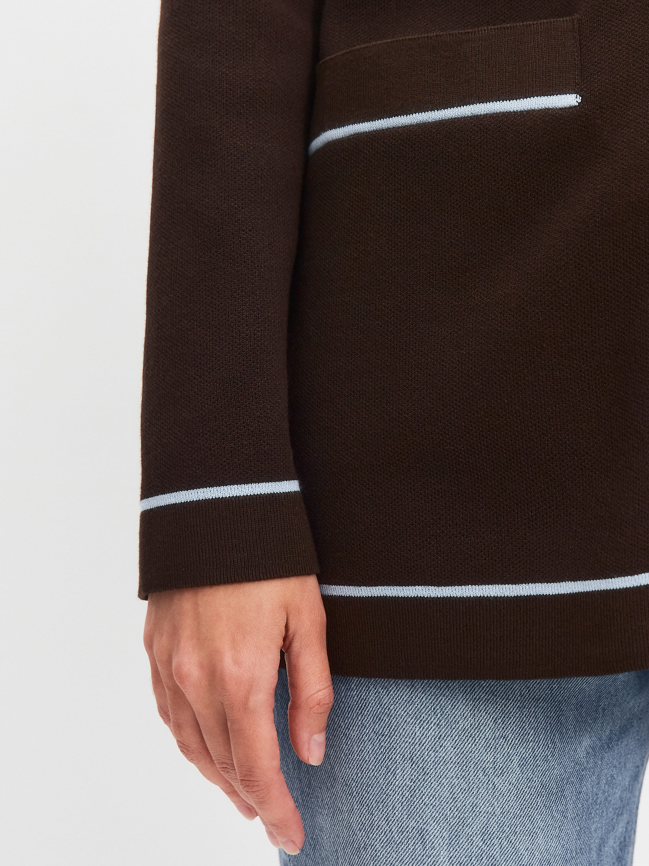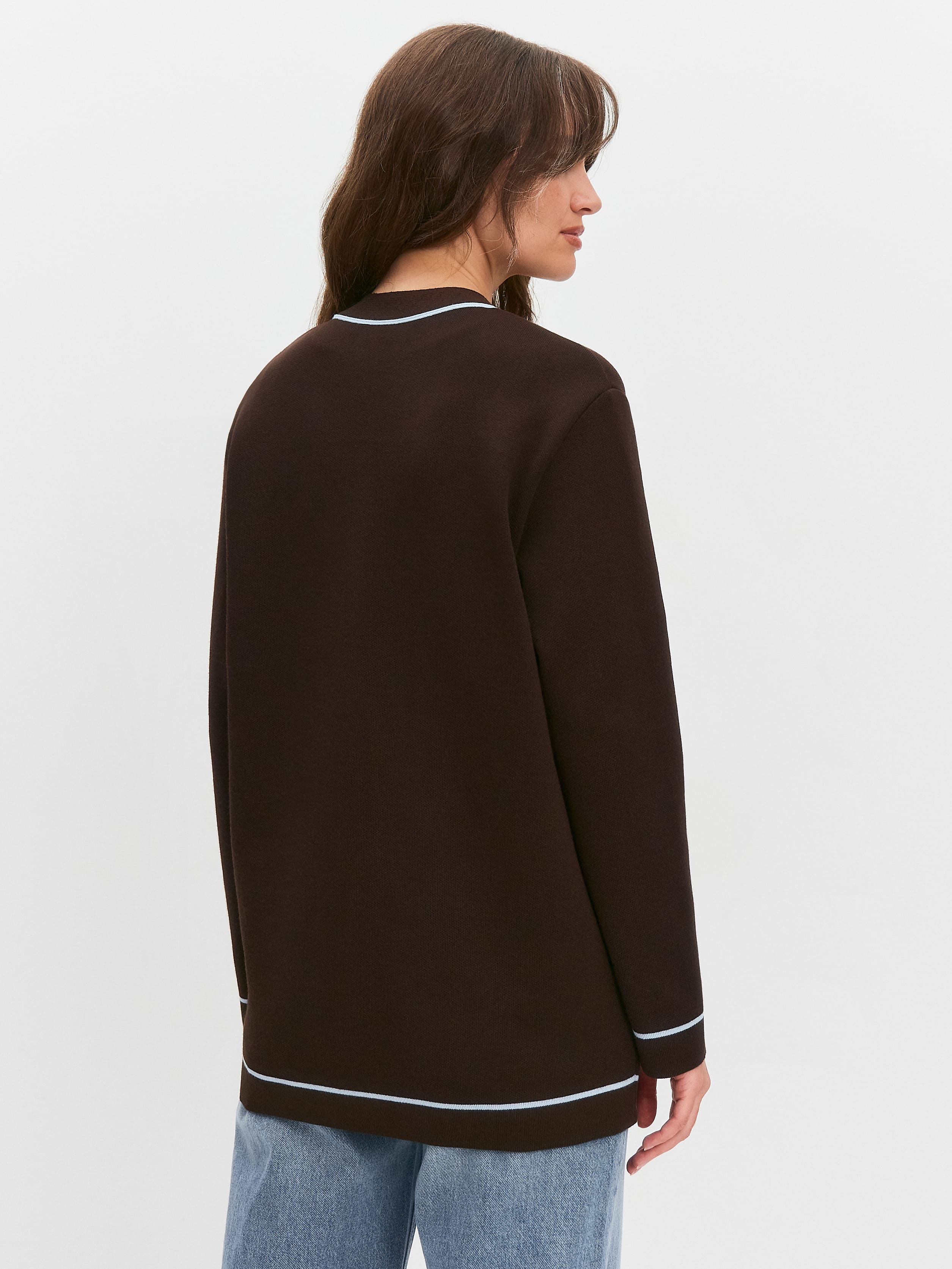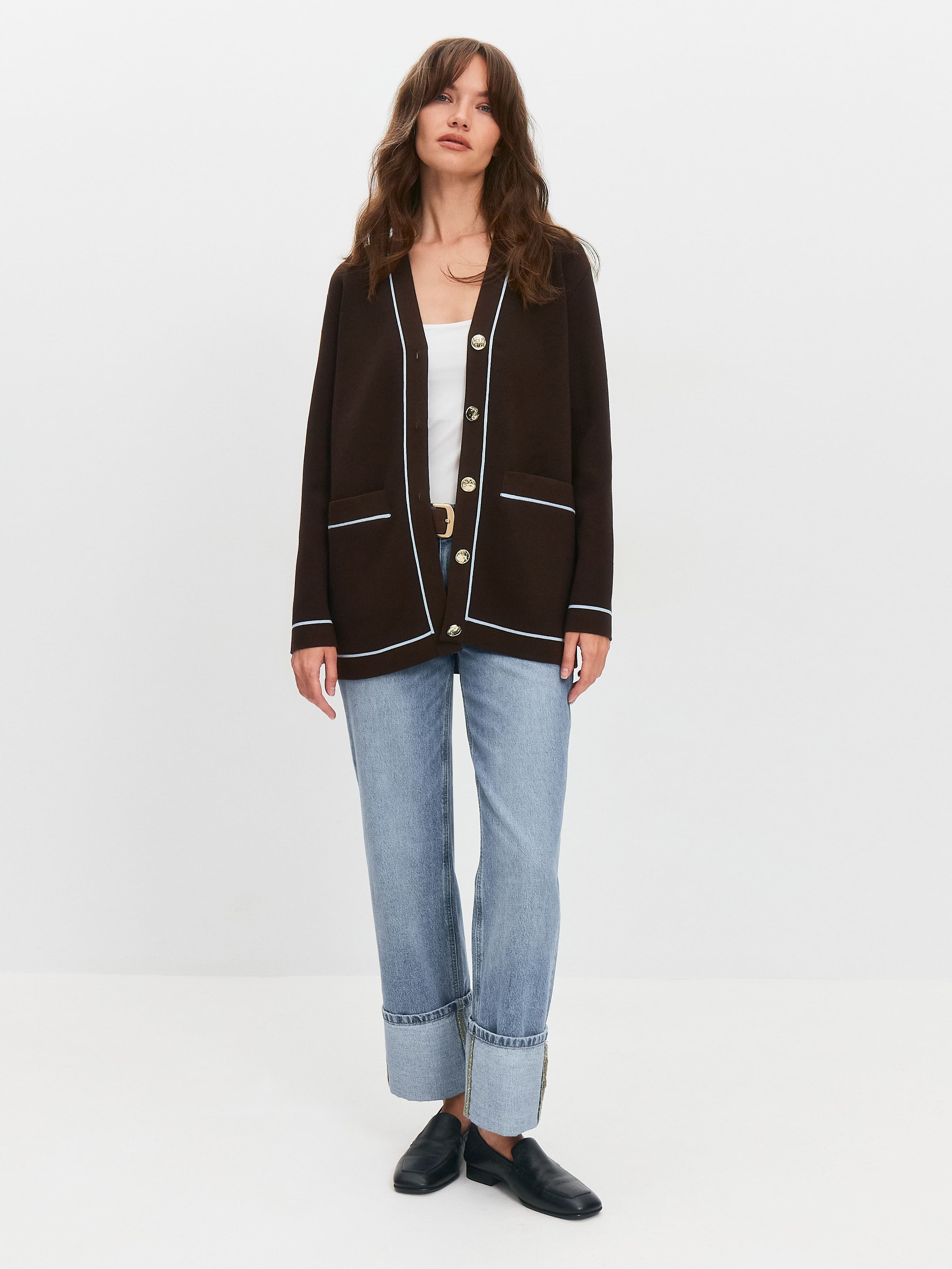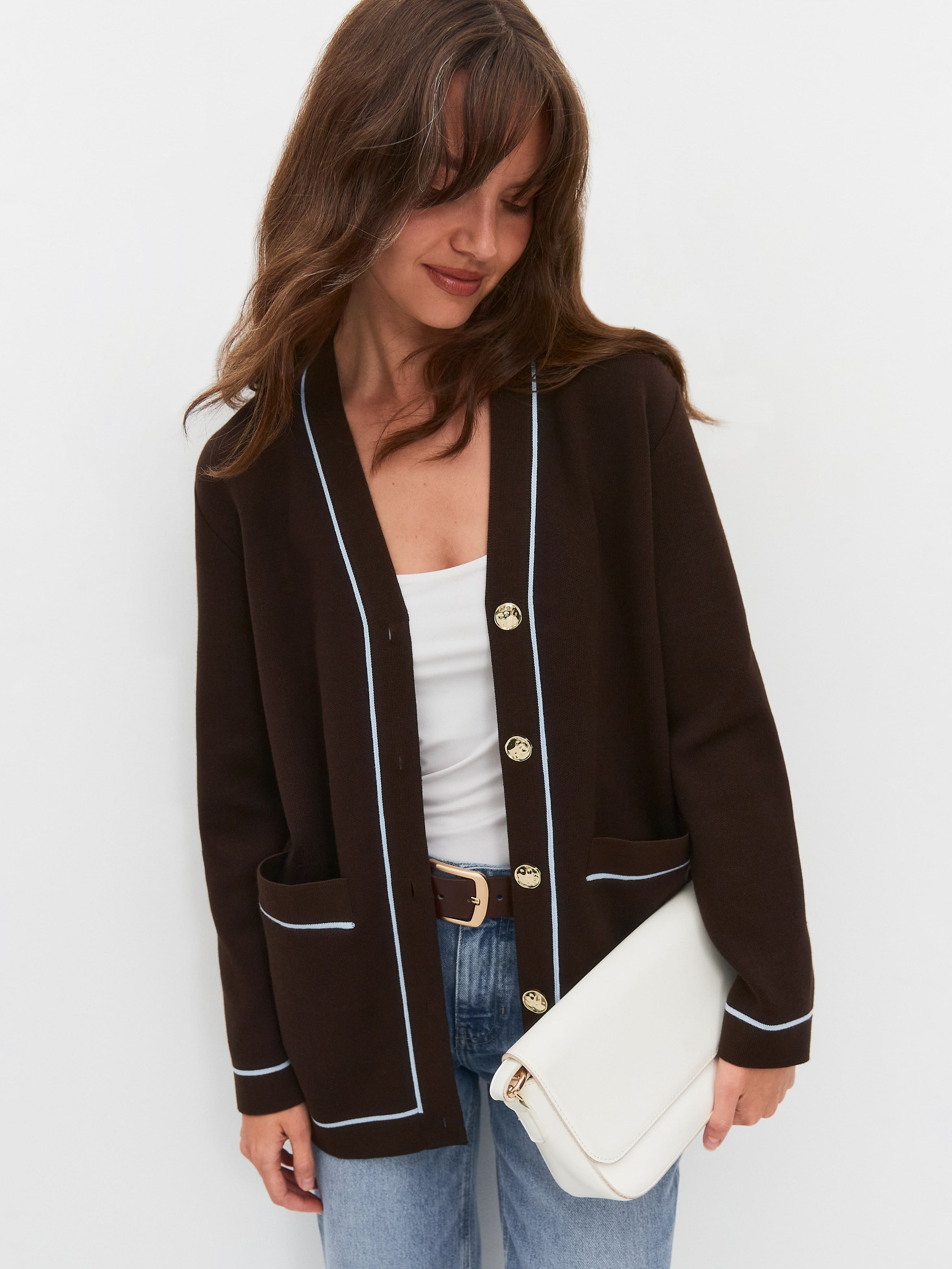 Акцентный кардиган с контрастными вязаными элементами и пуговицами с позолотой. V-образный вырез и актуальный прямой крой рифмуют модель со множеством вещей и аксессуаров. Вместительные внутренние карманы оформлены листочкой с полоской. Сочетание узкого канта вдоль планки с горизонтальными линиями на полочках структурирует и собирает силуэт. Трикотаж плотный на ощупь, шелковисто-гладкий, благодаря смешению хлопка с тонким волокном вискозы.