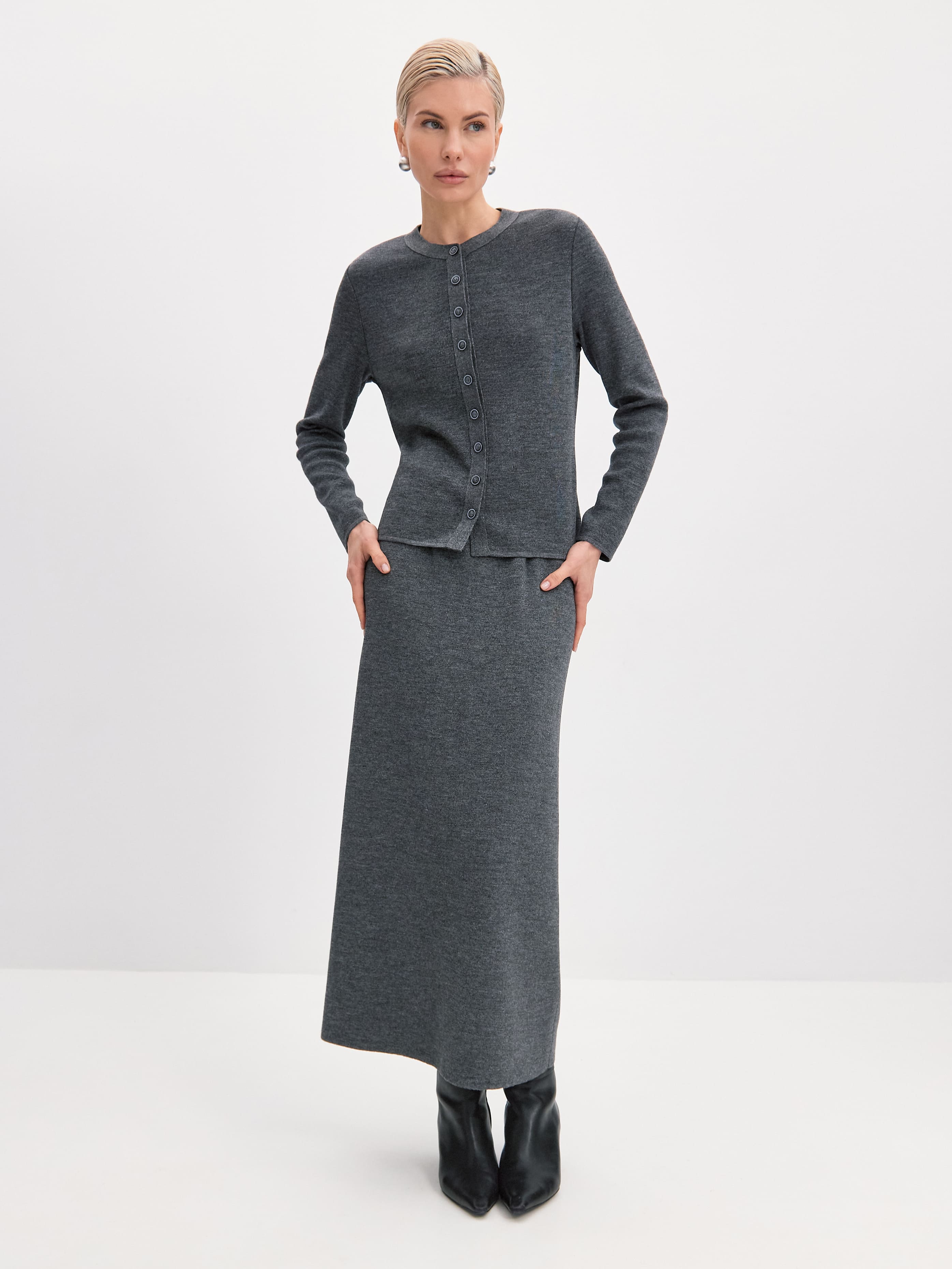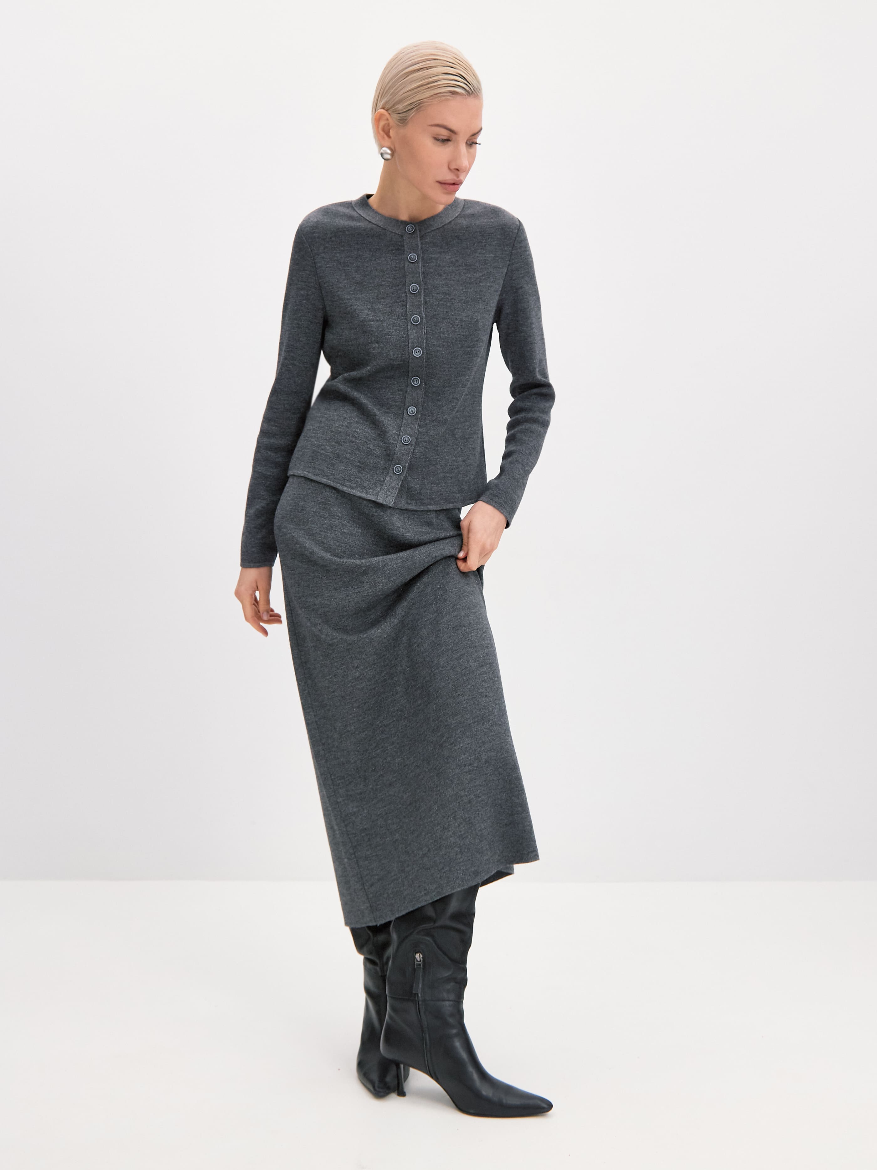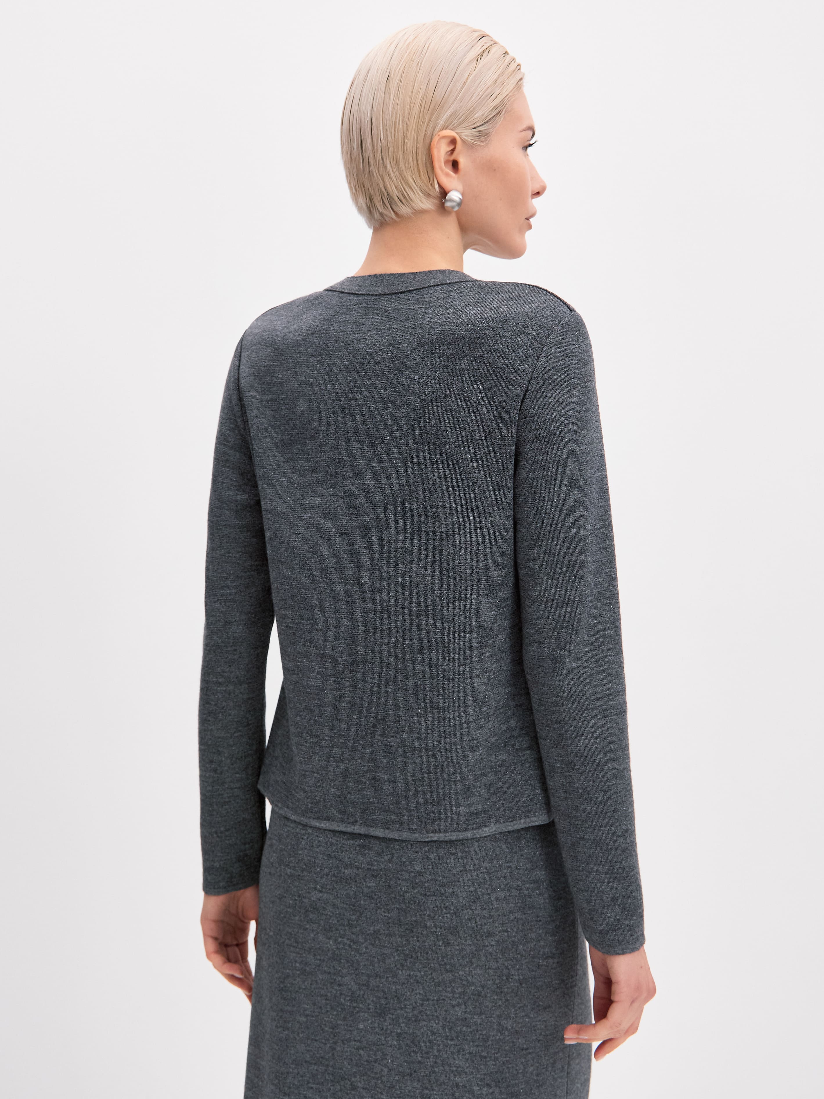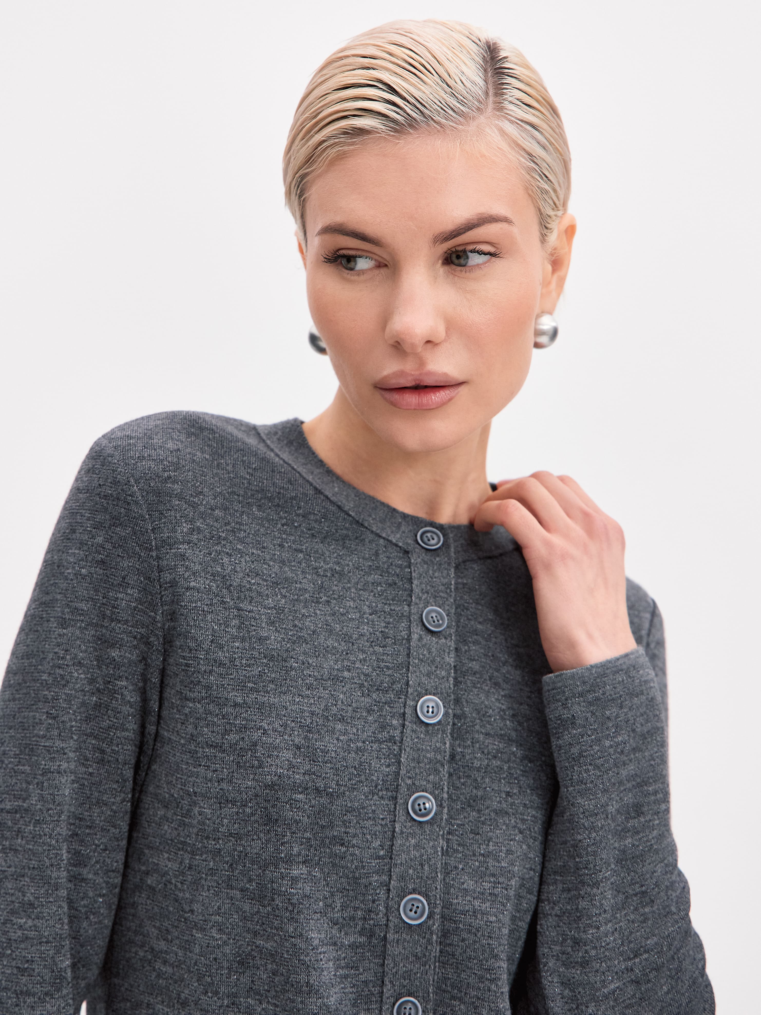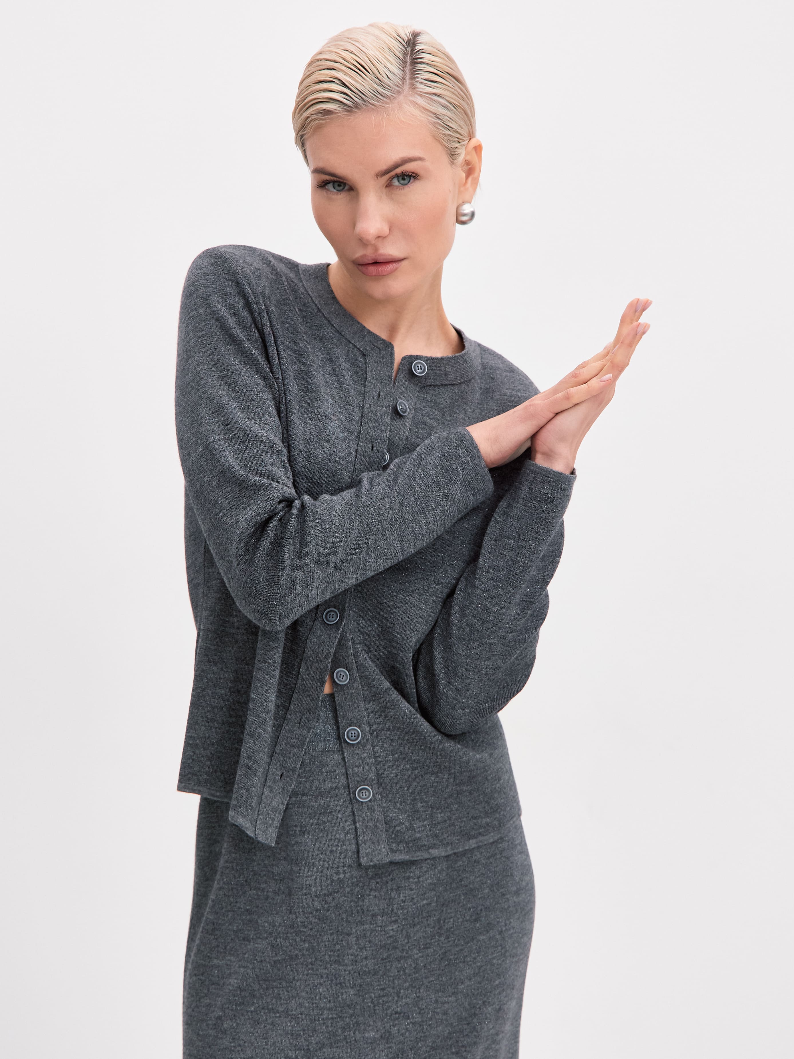 Плавные линии этого классического кардигана вдохновляют на бесконечные стилизации. Основой модели послужил премиальный шерстяной трикотаж с вплетением софт люрекса. Для сохранения всех преимуществ натуральной пряжи мы используем ультратонкую металлизированную нить. Результат: кардиган с софт люрексом сохраняет первоначальные тактильность и пластичность, не оставляя чувства дискомфорта на коже. Идеальный вариант верха в составе праздничных капсул, притягивающий внимание ненавязчивым серебристым блеском.