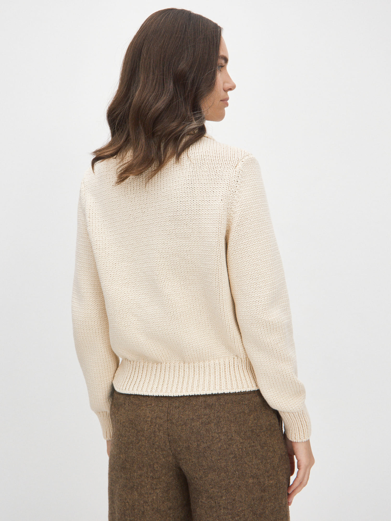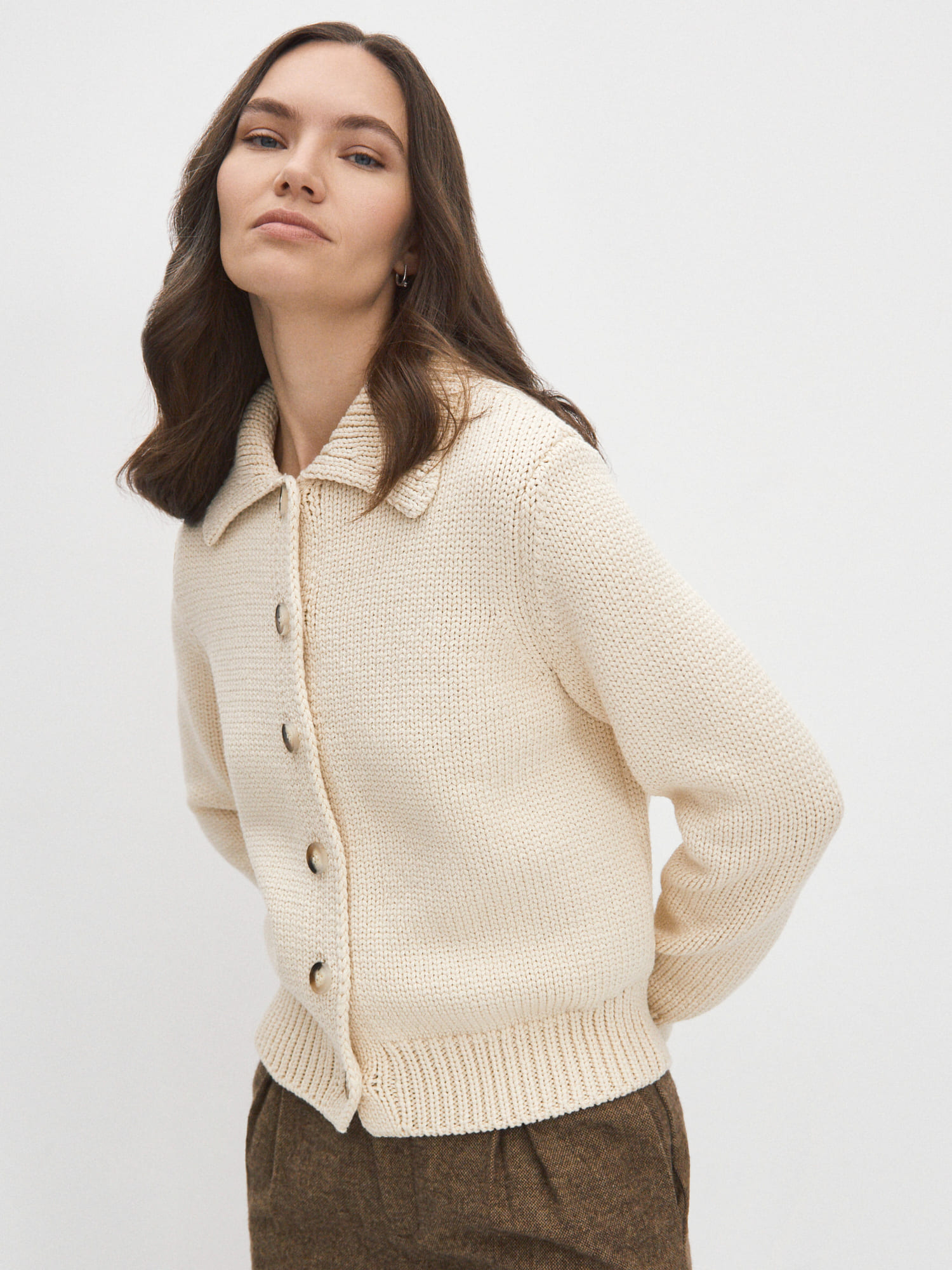 Кардиган-жакет с легким налетом винтажности. Модель из комфортной, дышащей пряжи c хлопком, неуловимо напоминающая hand-made кофточки, связанные на спицах. Элементы отделки – классические манжеты, отложной воротник, объемно-рельефная резинка по низу. Для усиления согревающего эффекта кардигана достаточно задействовать второй слой. В идеале – сочетать его с лонгсливами и футболками MONONAME из тонкого летнего трикотажа.