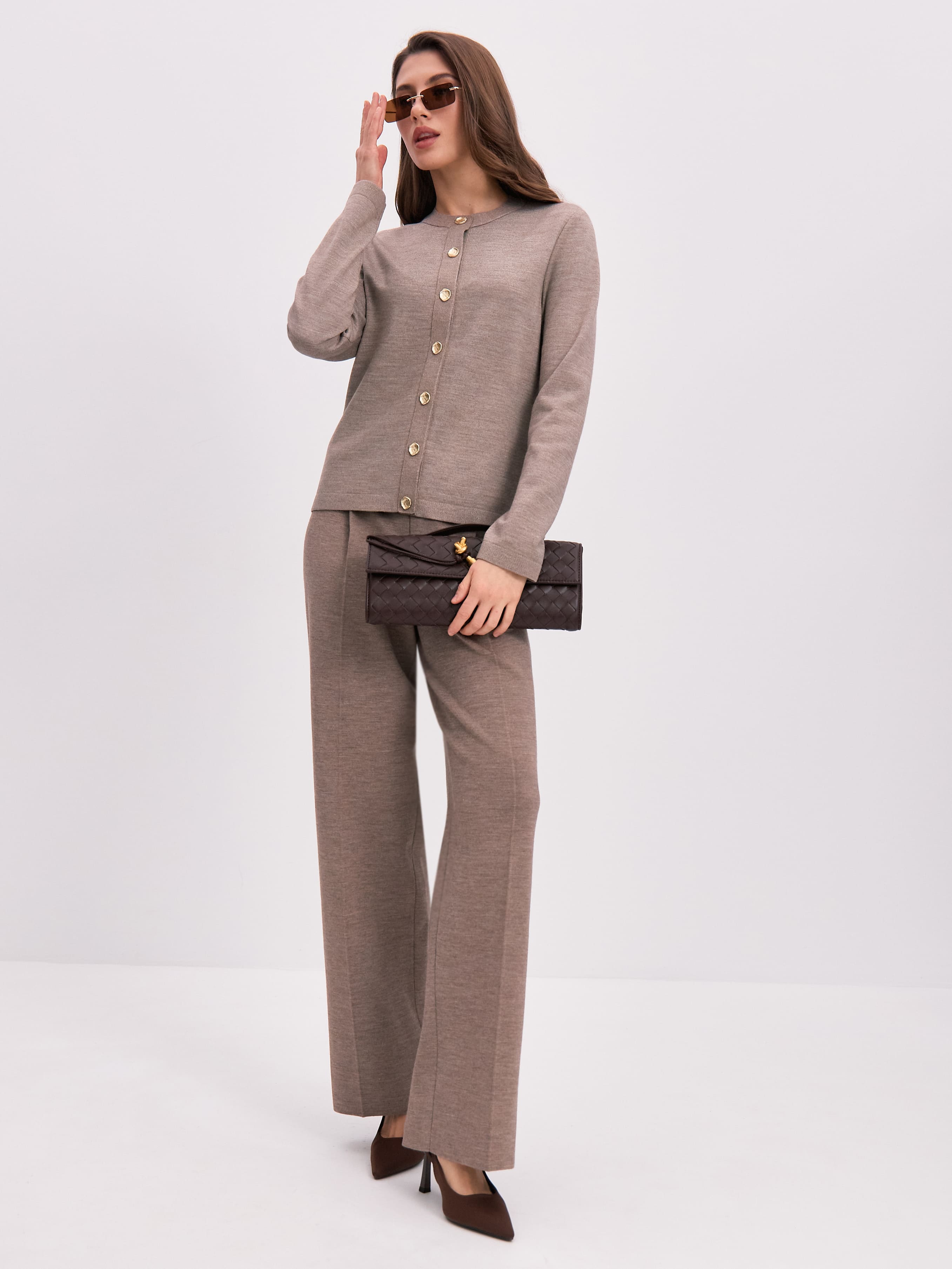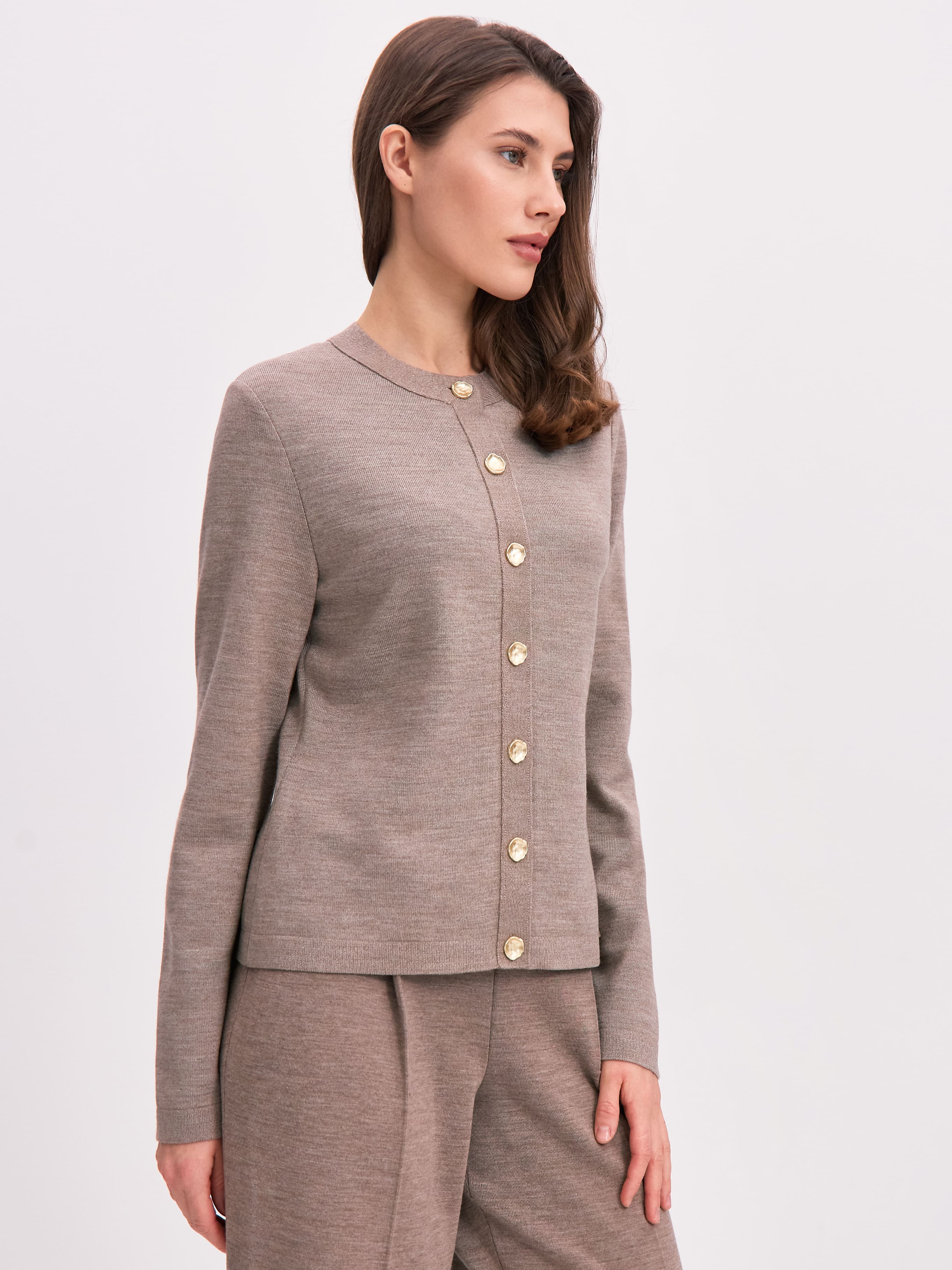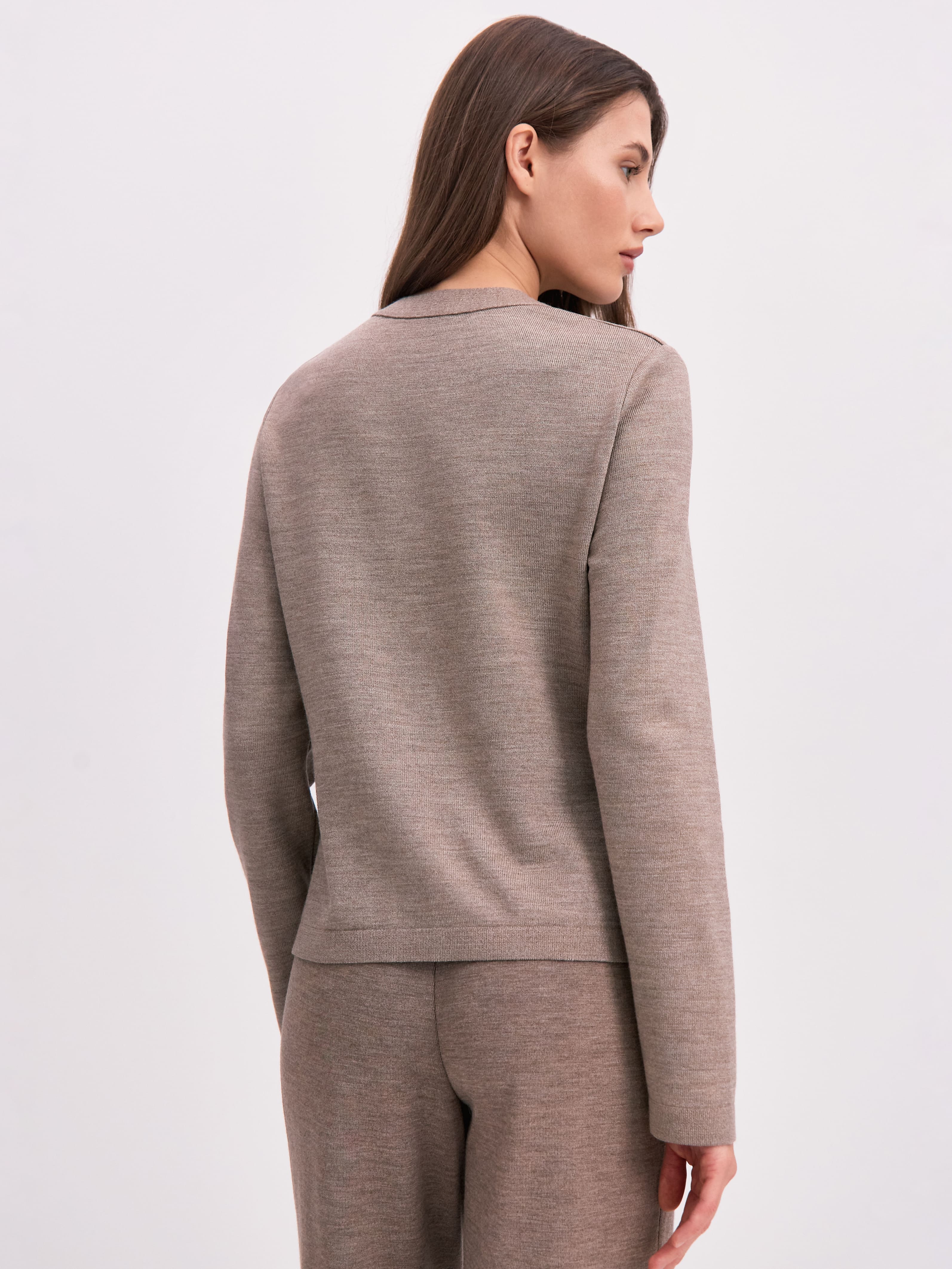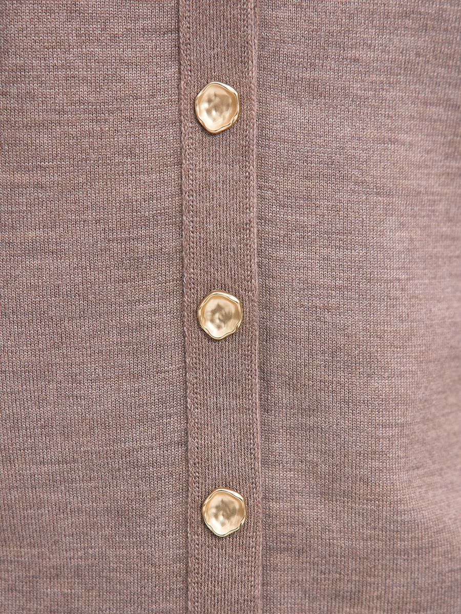 Чтобы придать этому легкому, нежному кардигану дополнительную утонченность, мы декорировали его рядом акцентных пуговиц. Но это не единственное преимущество модели. Состав этой шерстяной кофточки тоже особенный. В данном изделии мы полностью отказались от синтетических волокон, необходимых для устойчивой формы полотна. Вместо них мы включили в пряжу вискозу, которая не просто сделала шерсть более плотной, но и придала ей сдержанный блеск и осязаемую мягкость.