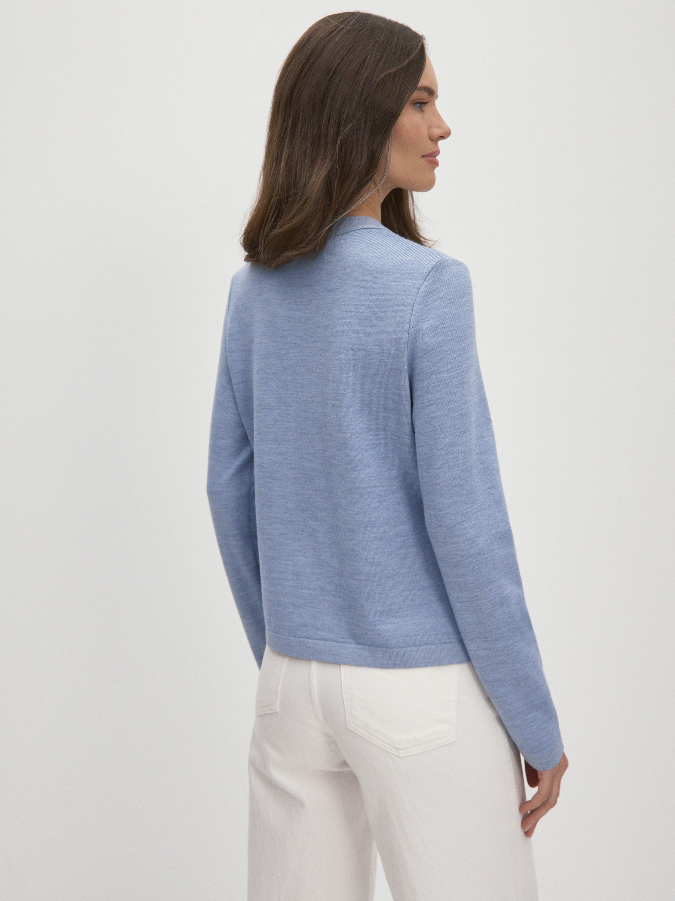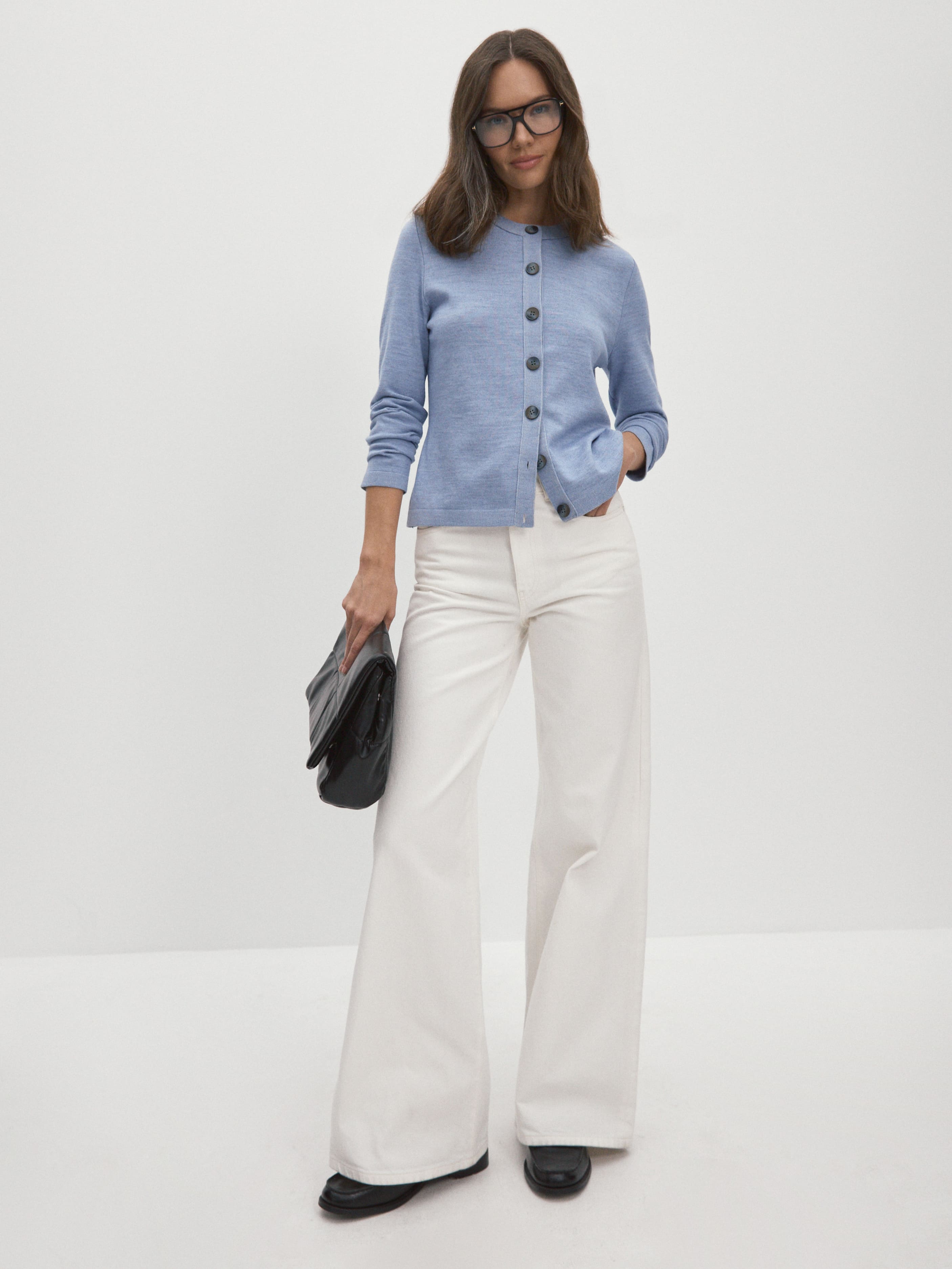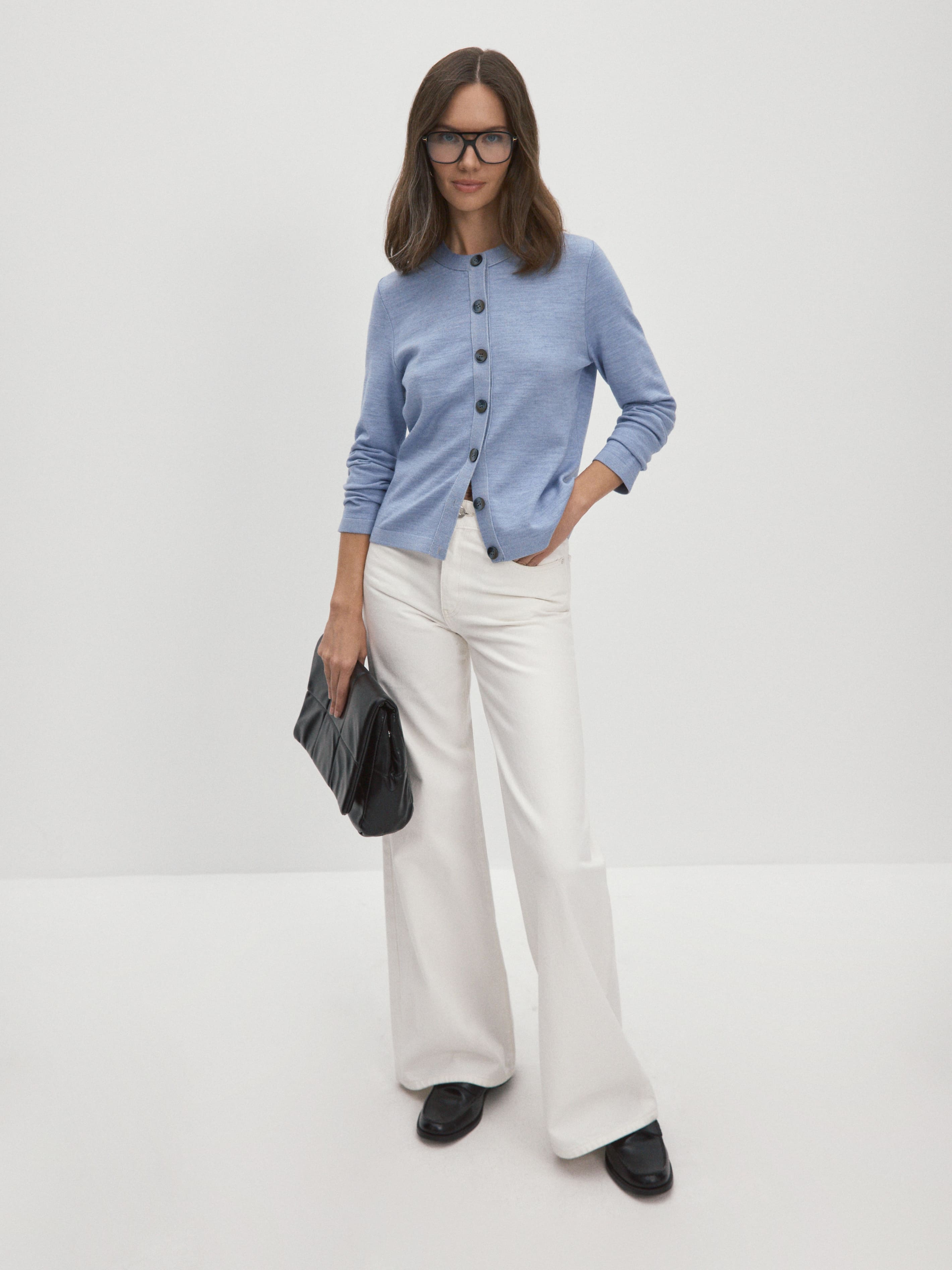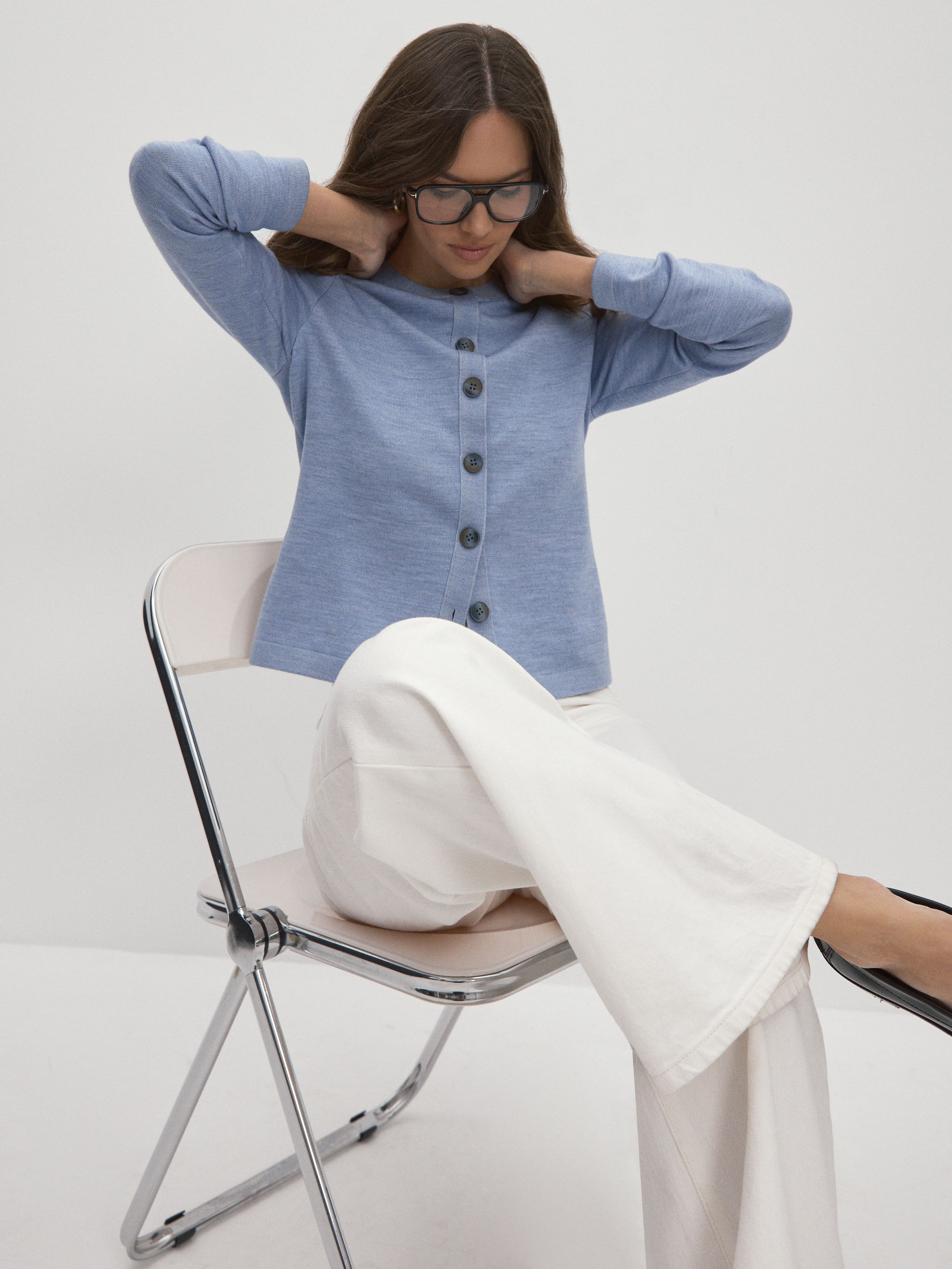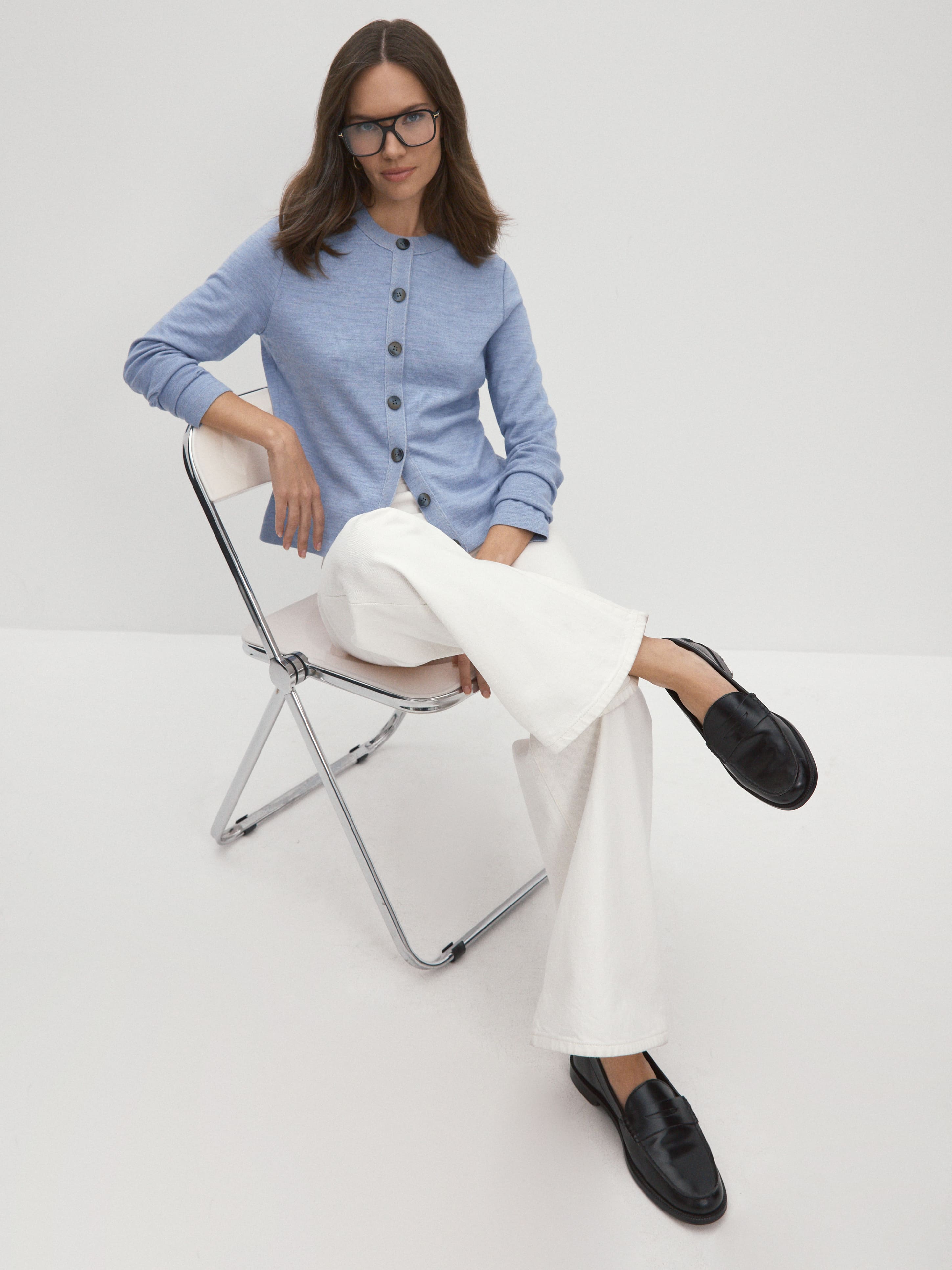 Чтобы придать этому легкому, нежному кардигану дополнительную утонченность, мы декорировали его рядом акцентных пуговиц. Но это не единственное преимущество модели. Состав этой шерстяной кофточки тоже особенный. В данном изделии мы полностью отказались от синтетических волокон, необходимых для устойчивой формы полотна. Вместо них мы включили в пряжу вискозу, которая не просто сделала шерсть более плотной, но и придала ей сдержанный блеск и осязаемую мягкость.