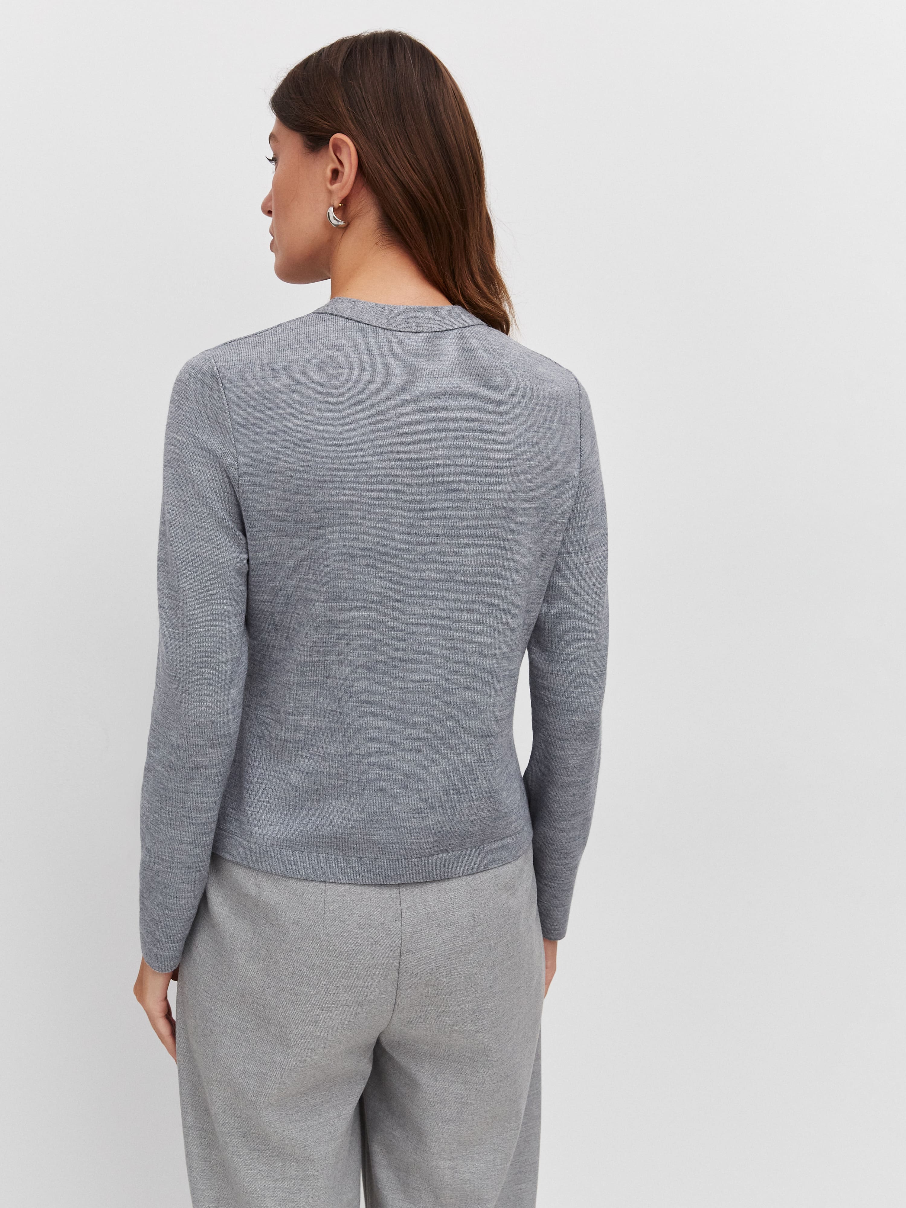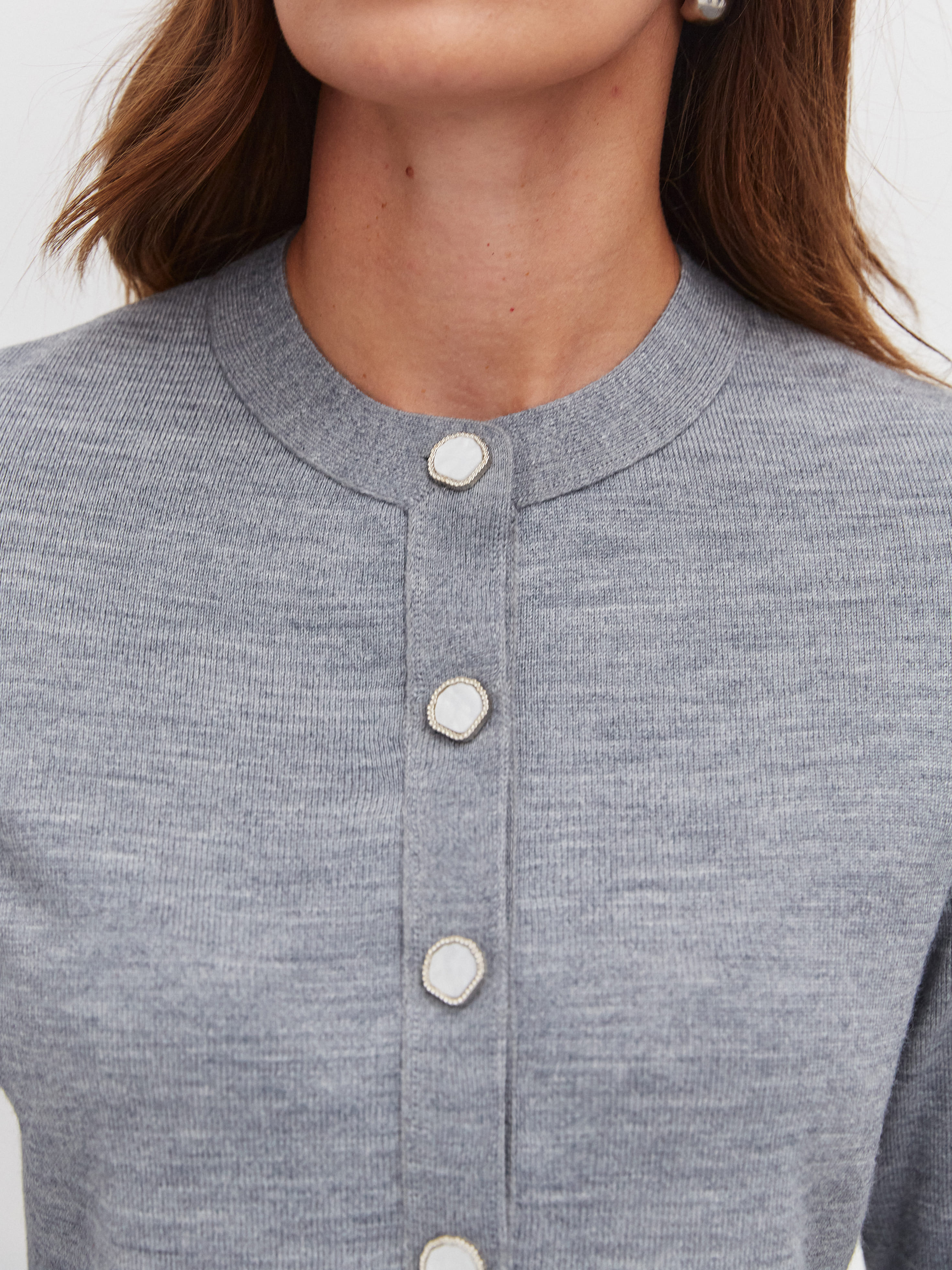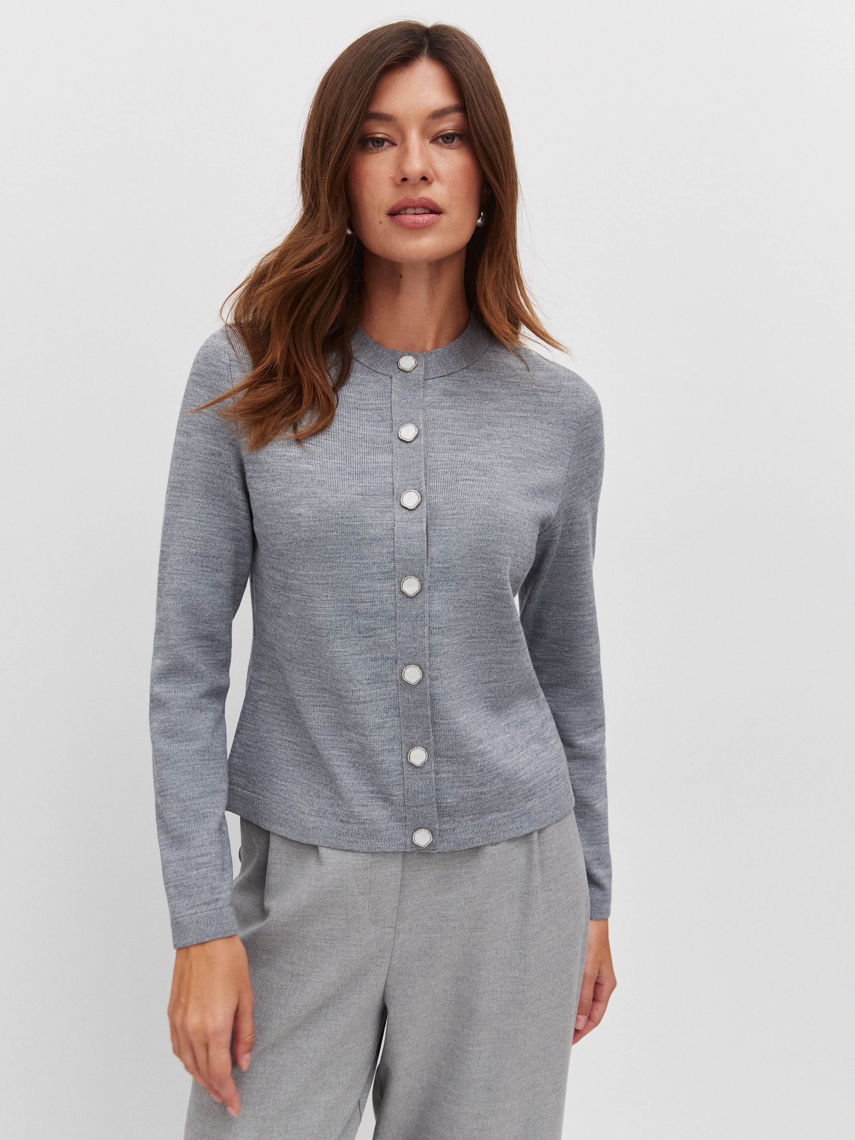Чтобы придать этому легкому, нежному кардигану дополнительную утонченность, мы декорировали его рядом акцентных пуговиц. Но это не единственное преимущество модели. Состав этой шерстяной кофточки тоже особенный. В данном изделии мы полностью отказались от синтетических волокон, необходимых для устойчивой формы полотна. Вместо них мы включили в пряжу вискозу, которая не просто сделала шерсть более плотной, но и придала ей сдержанный блеск и осязаемую мягкость.