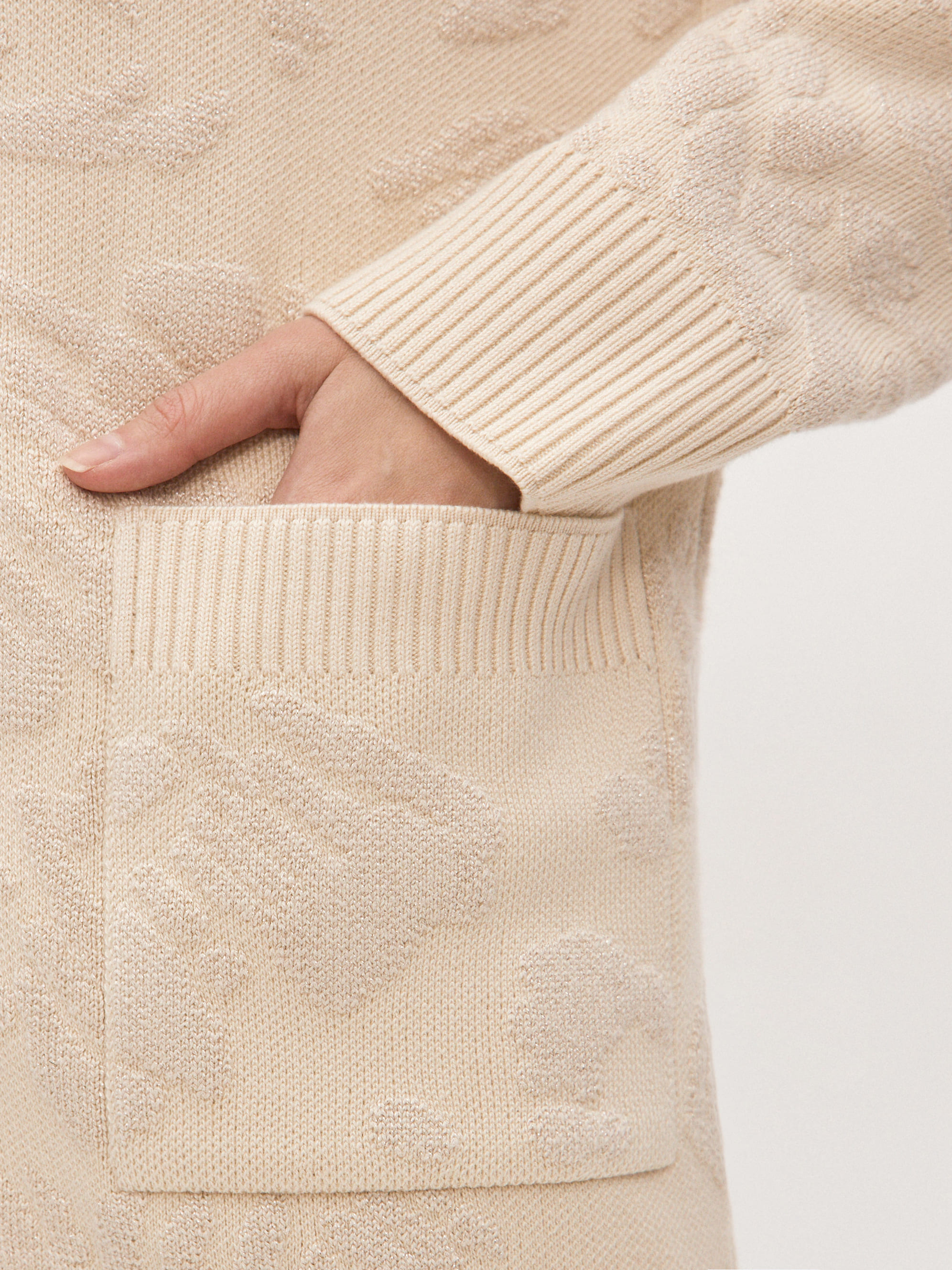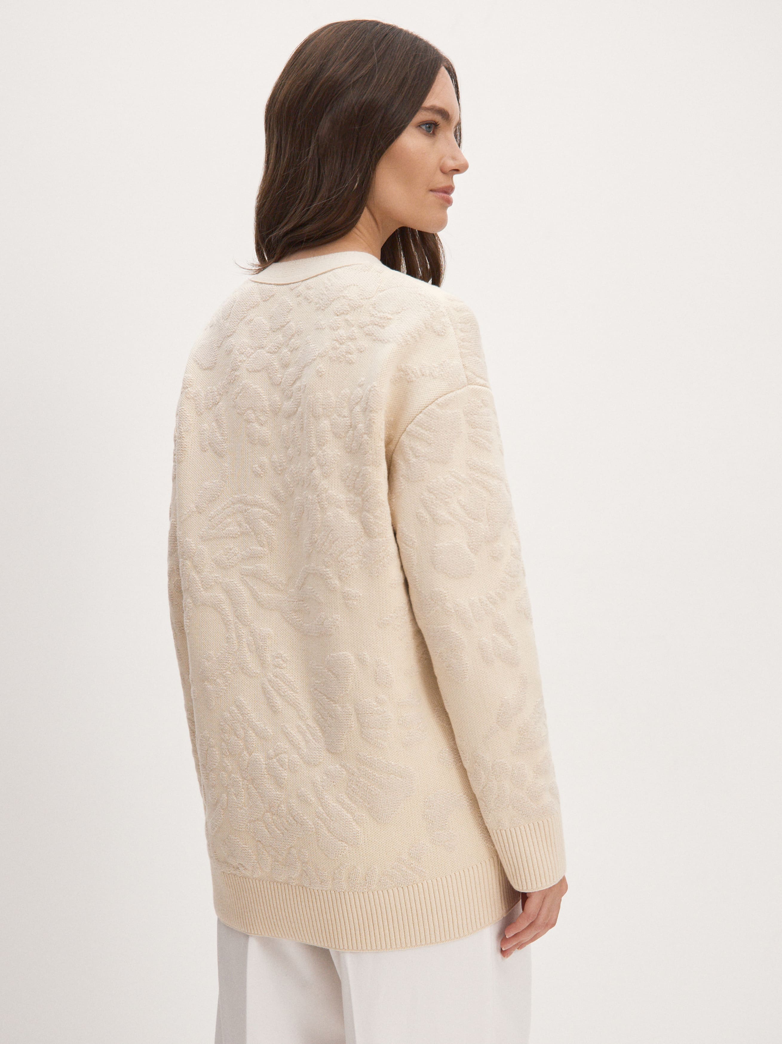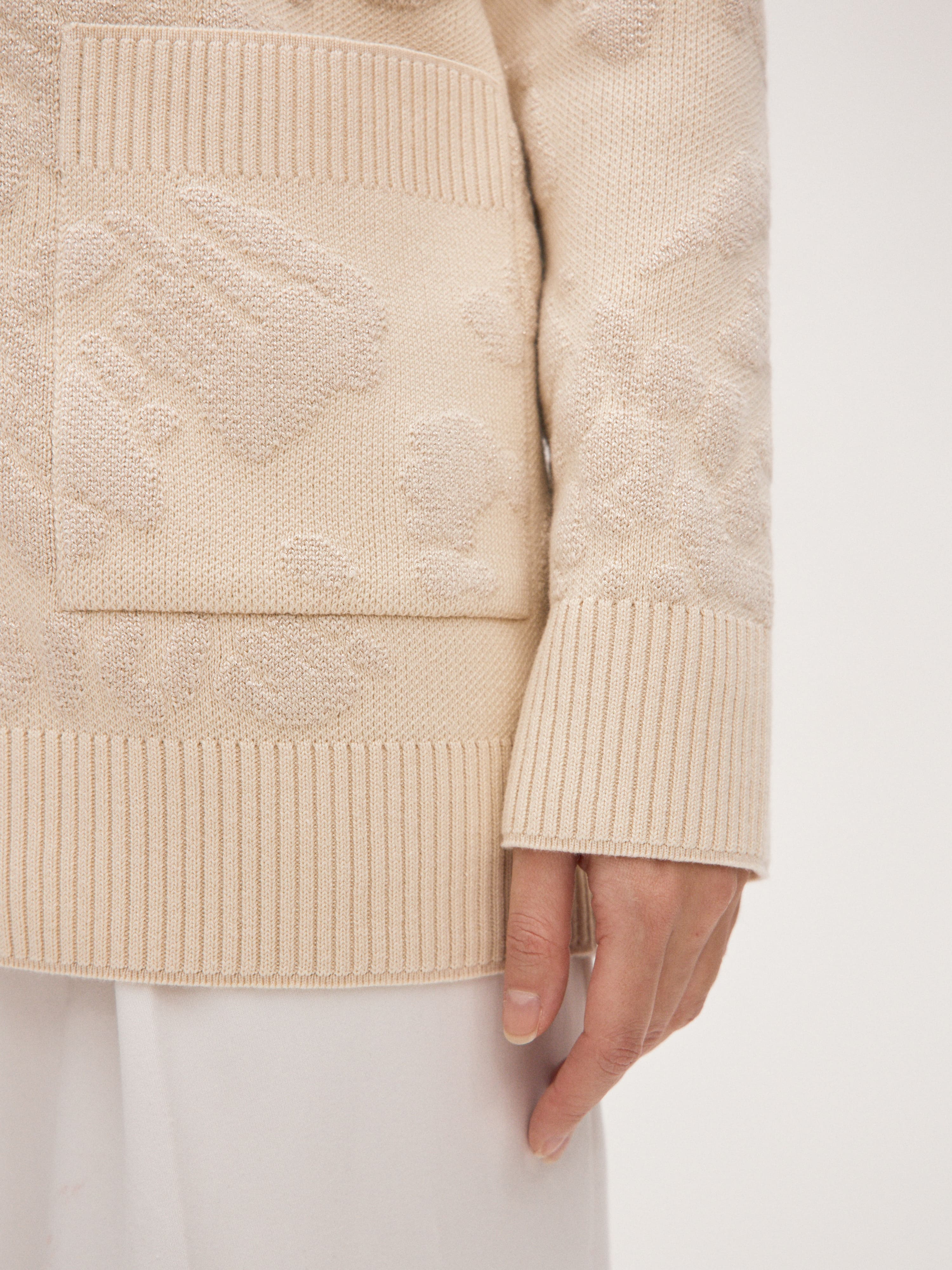 Авторская модель кардигана с v-образным вырезом и объемным принтом. Источником вдохновения для данного изделия послужила технология эмбоссинга, которую мы обыграли на вязаном полотне. Выпуклый рисунок придает модели необходимую фактурность. Тонкие нити люрекса, вплетенные в трикотаж, превращают кардиган в наряд для особенных поводов. Спущенное плечо и свободная пройма рукава отвечают за комфортные движения. Носим модель поверх водолазок и рубашек и прощаемся с чувством скованности в плечевой зоне.