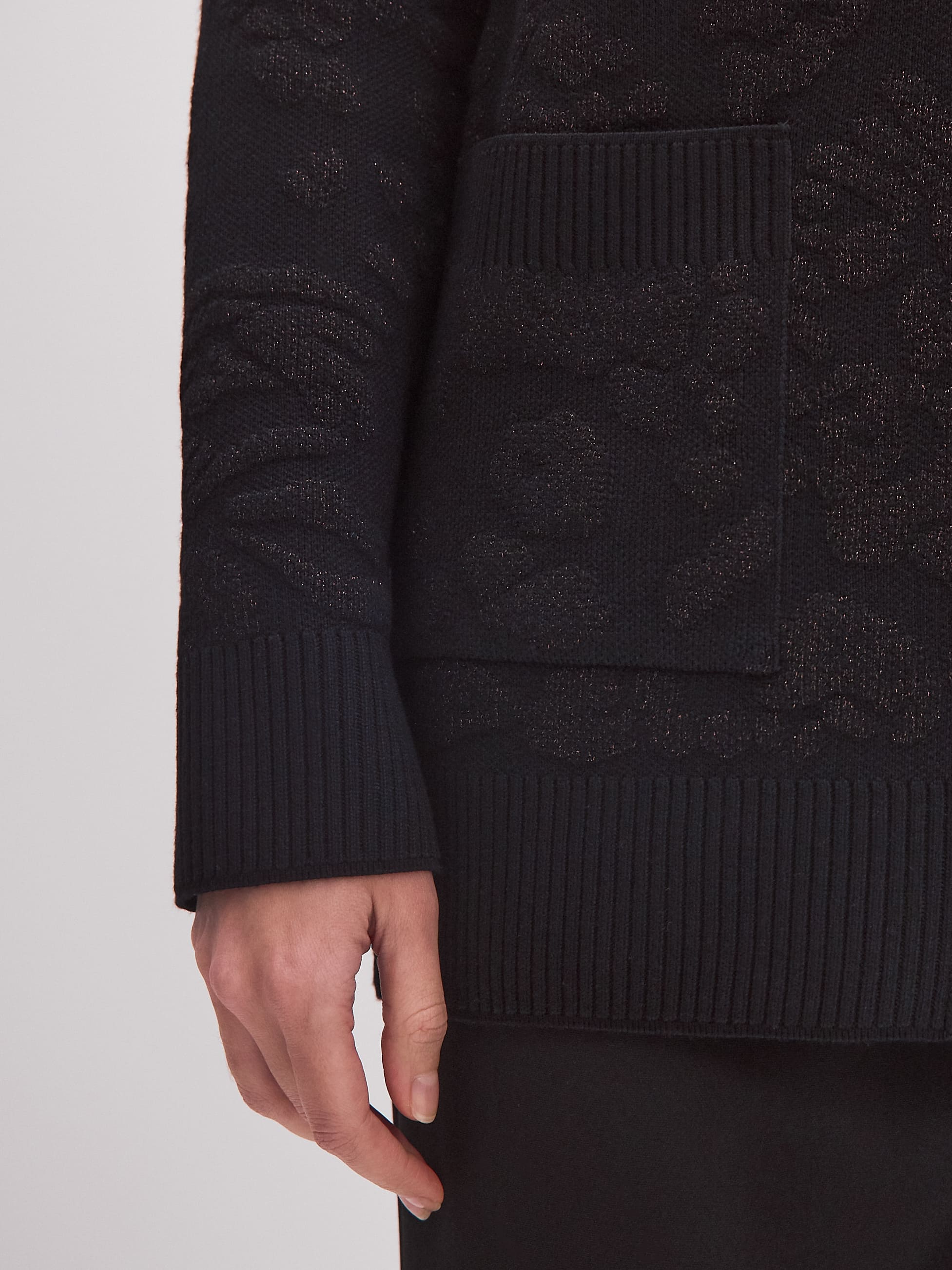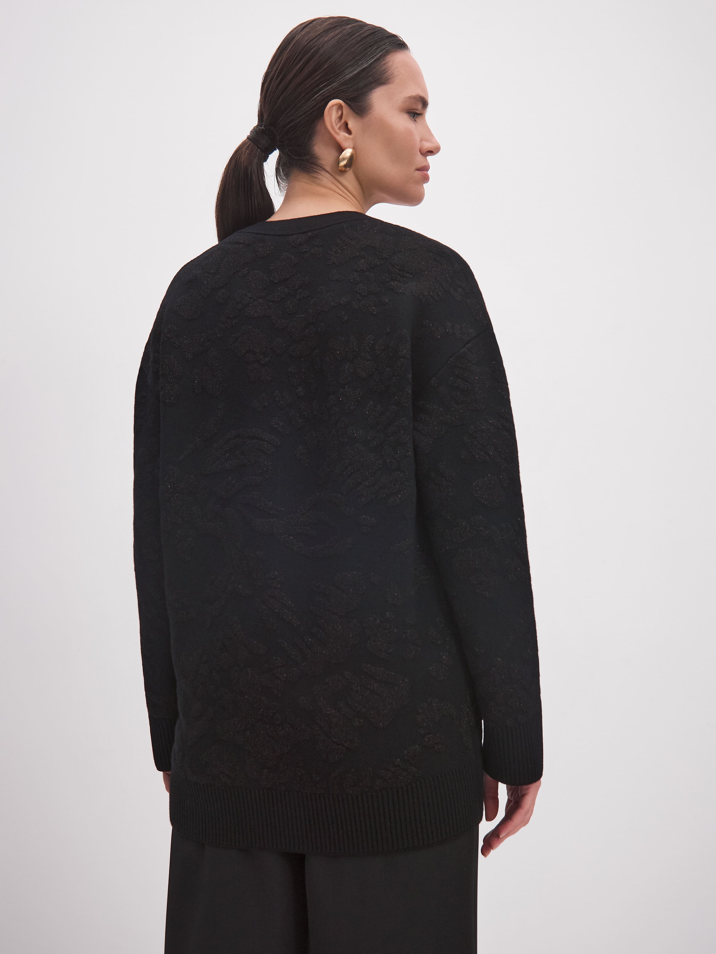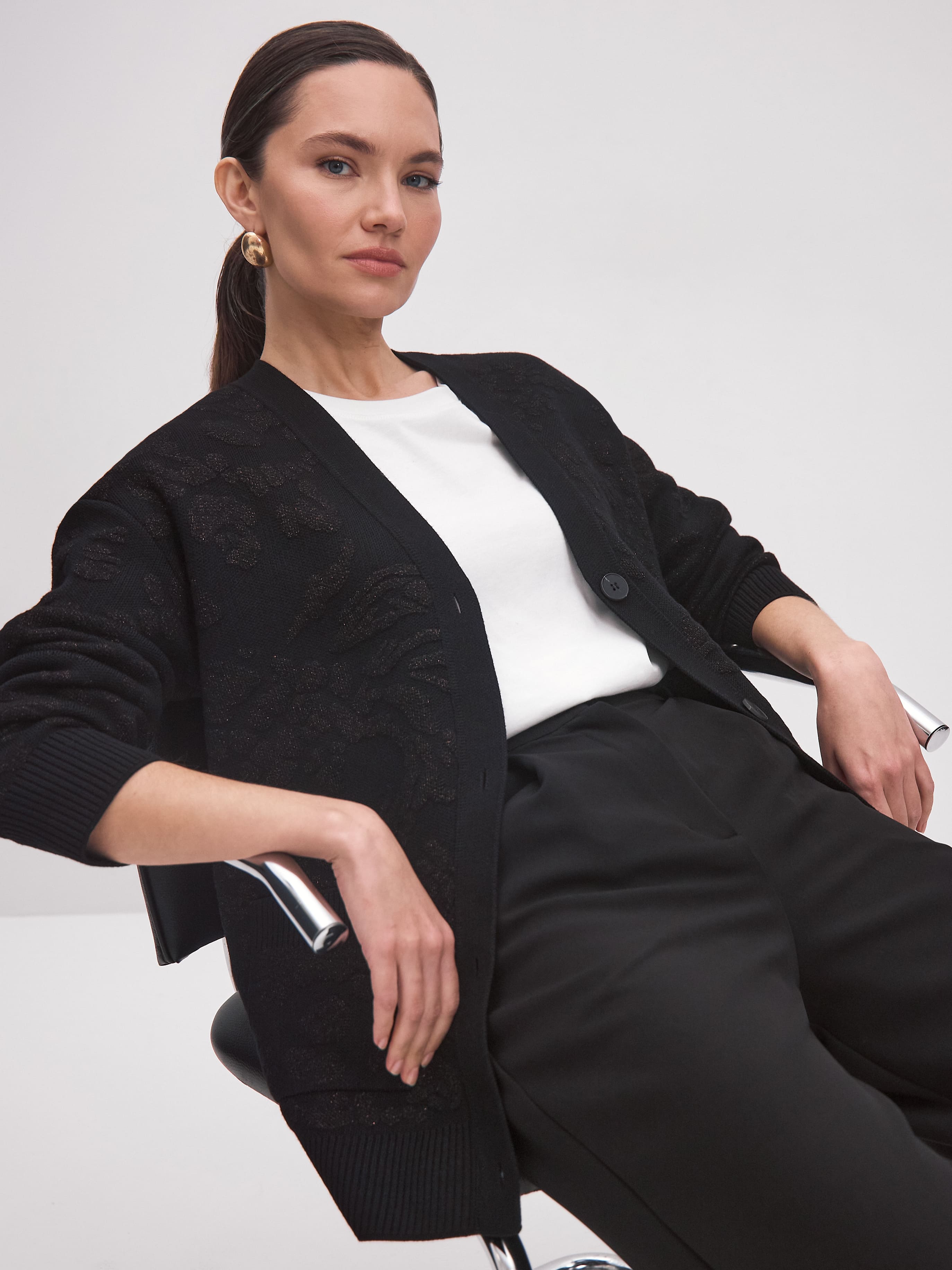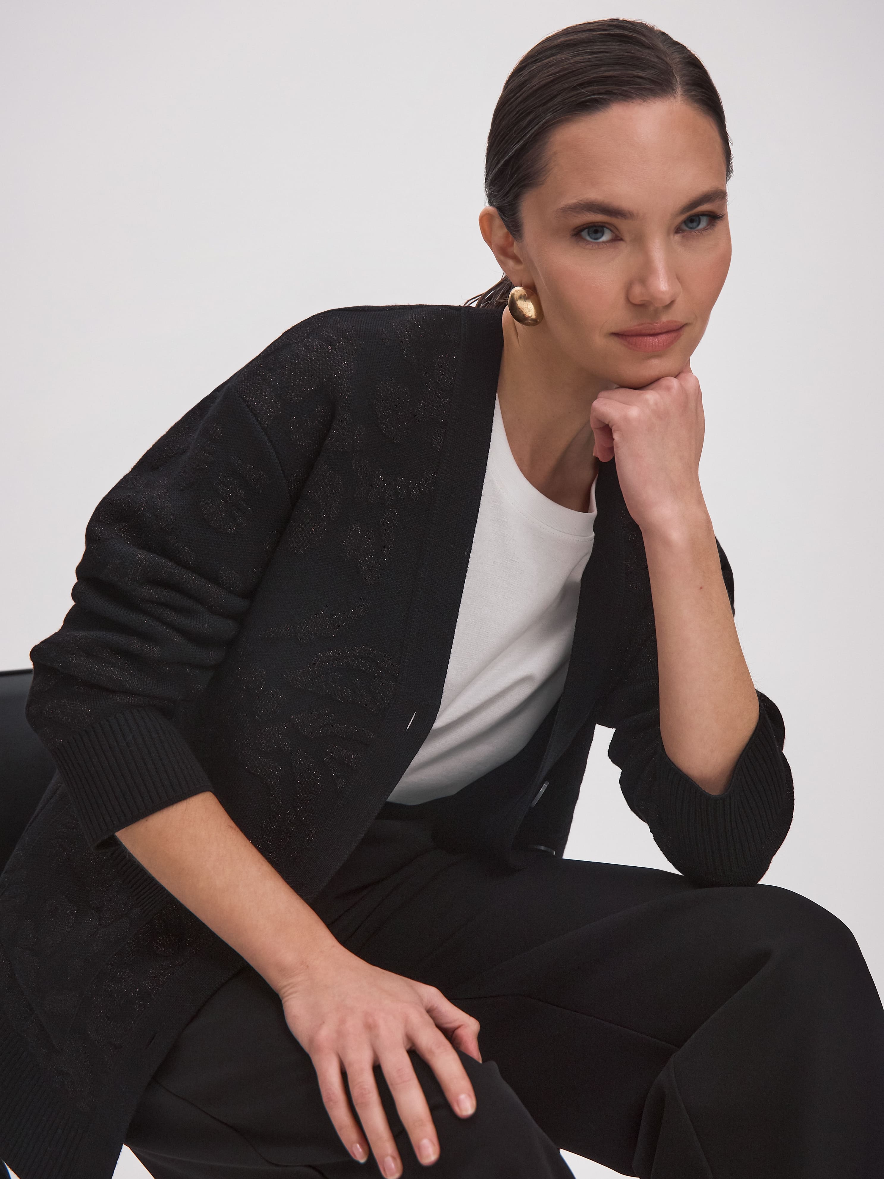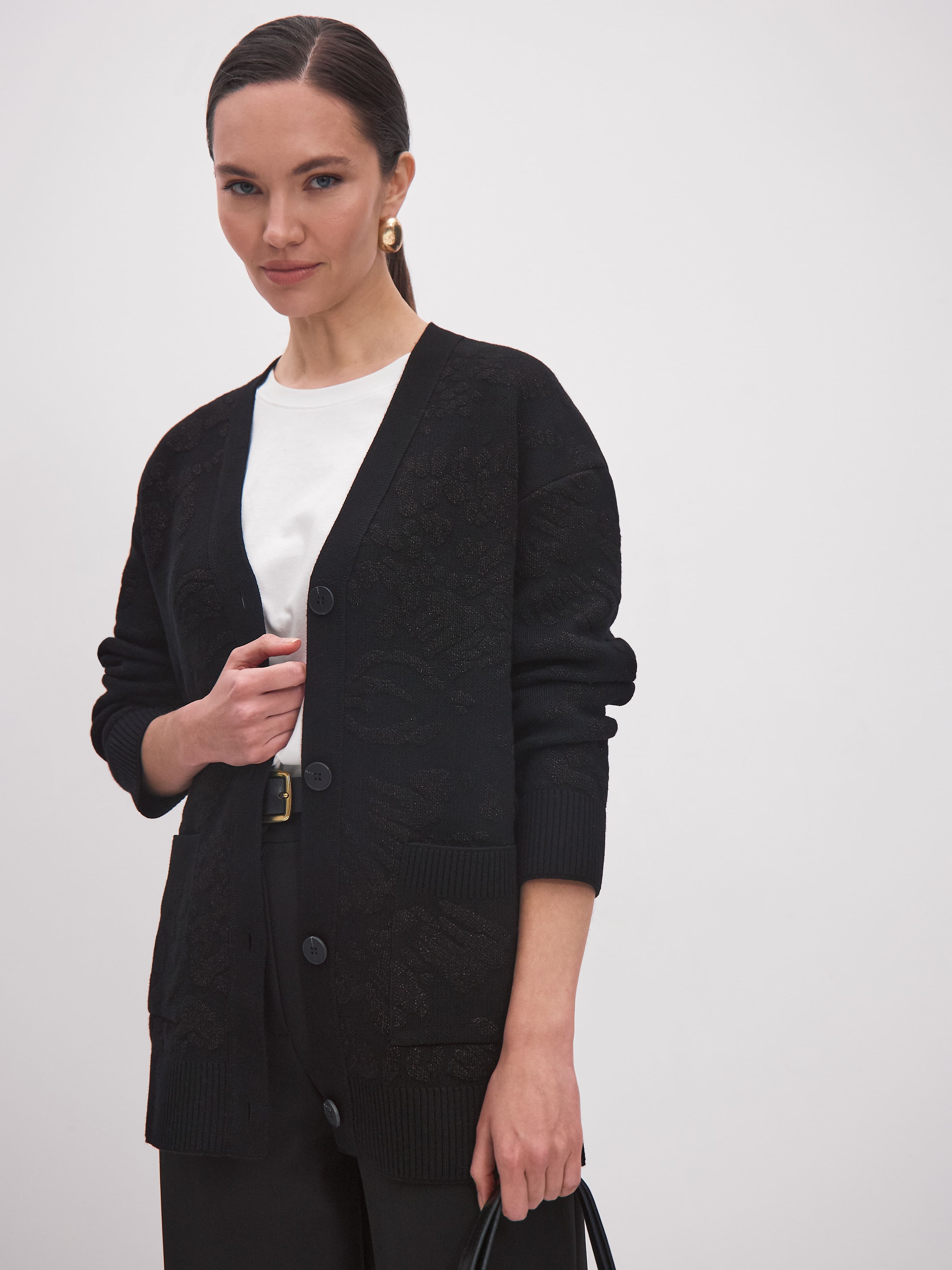 Авторская модель кардигана с v-образным вырезом и объемным принтом. Источником вдохновения для данного изделия послужила технология эмбоссинга, которую мы обыграли на вязаном полотне. Выпуклый рисунок придает модели необходимую фактурность. Тонкие нити люрекса, вплетенные в трикотаж, превращают кардиган в наряд для особенных поводов. Спущенное плечо и свободная пройма рукава отвечают за комфортные движения. Носим модель поверх водолазок и рубашек и прощаемся с чувством скованности в плечевой зоне.