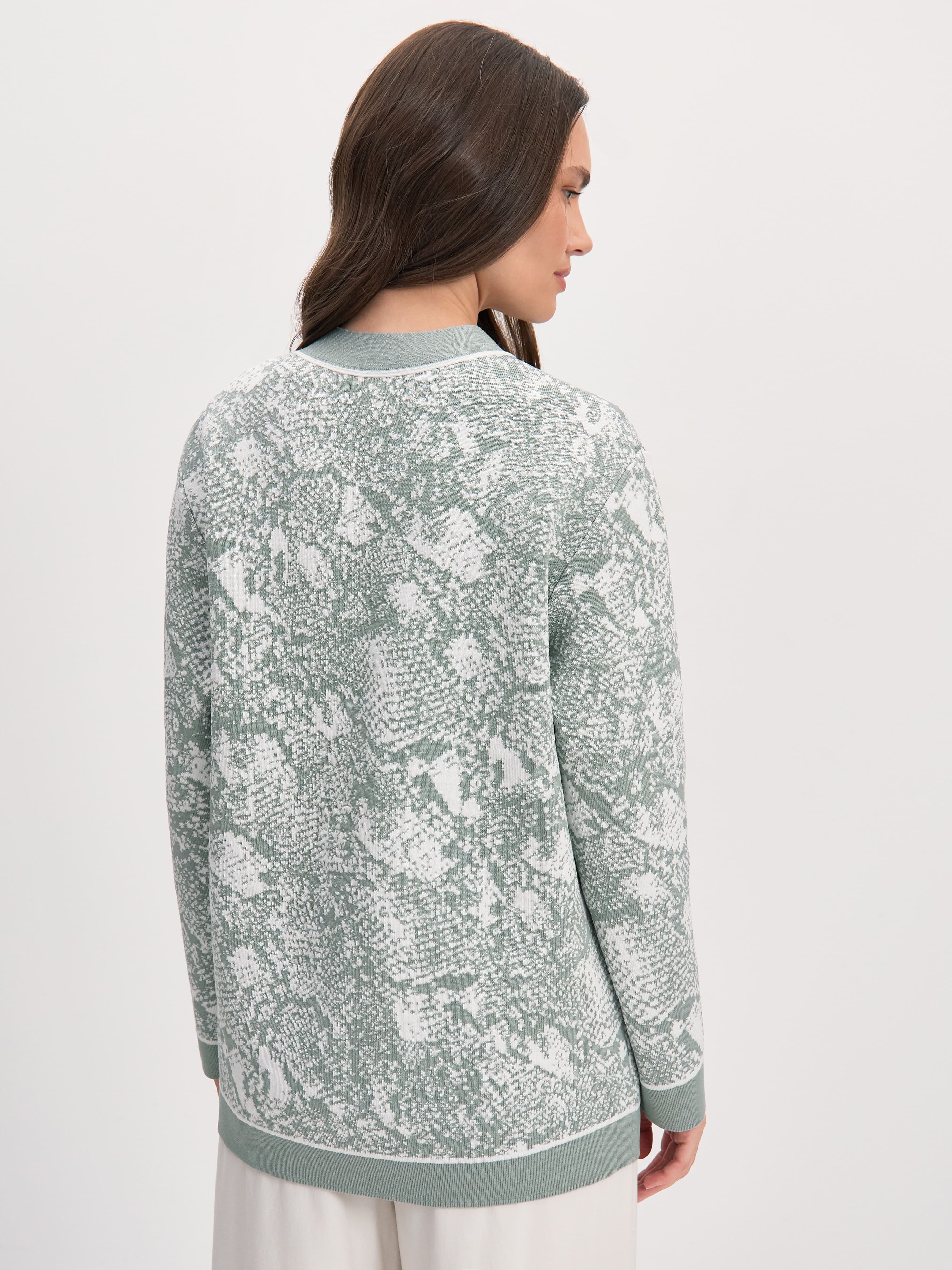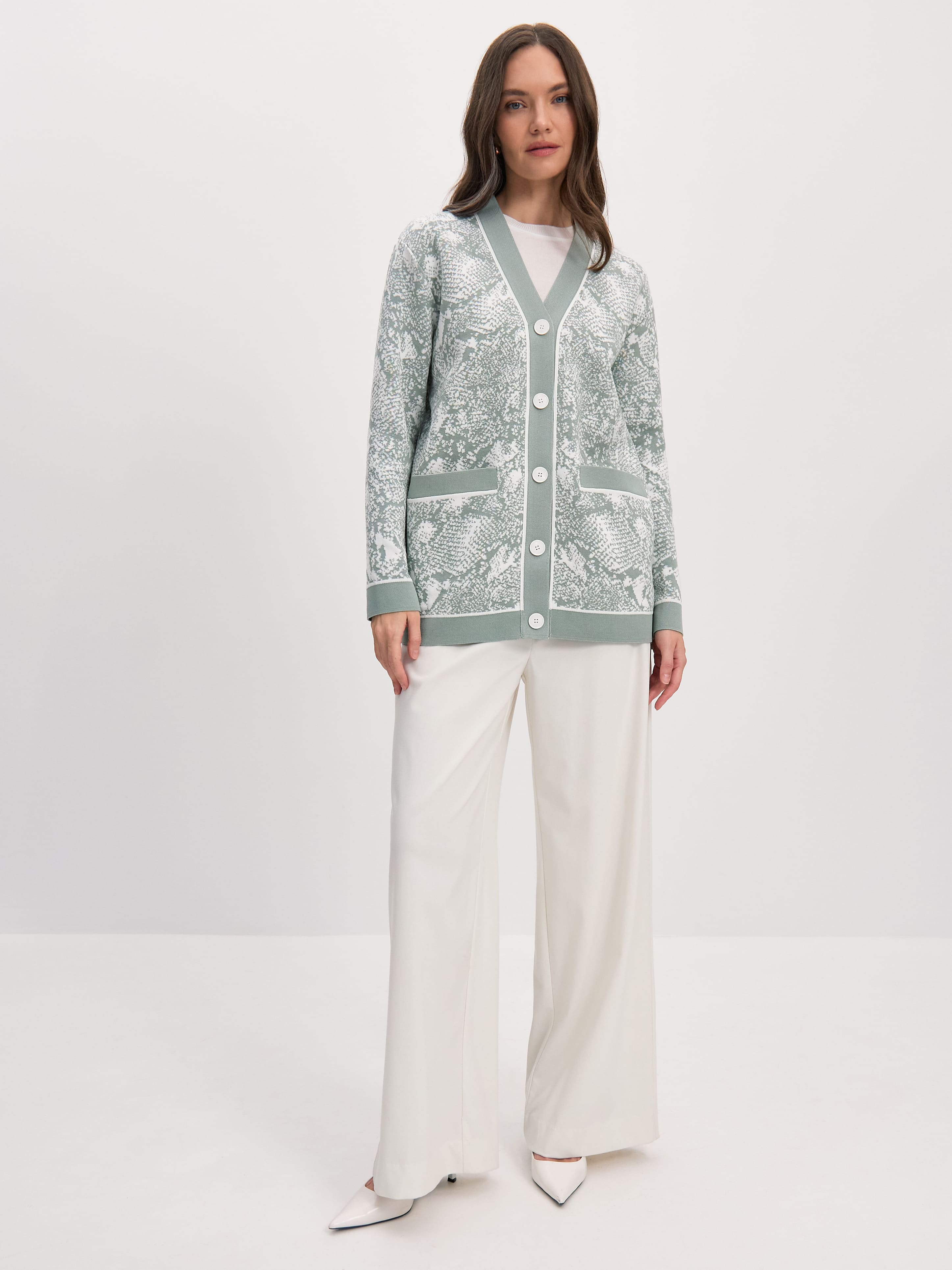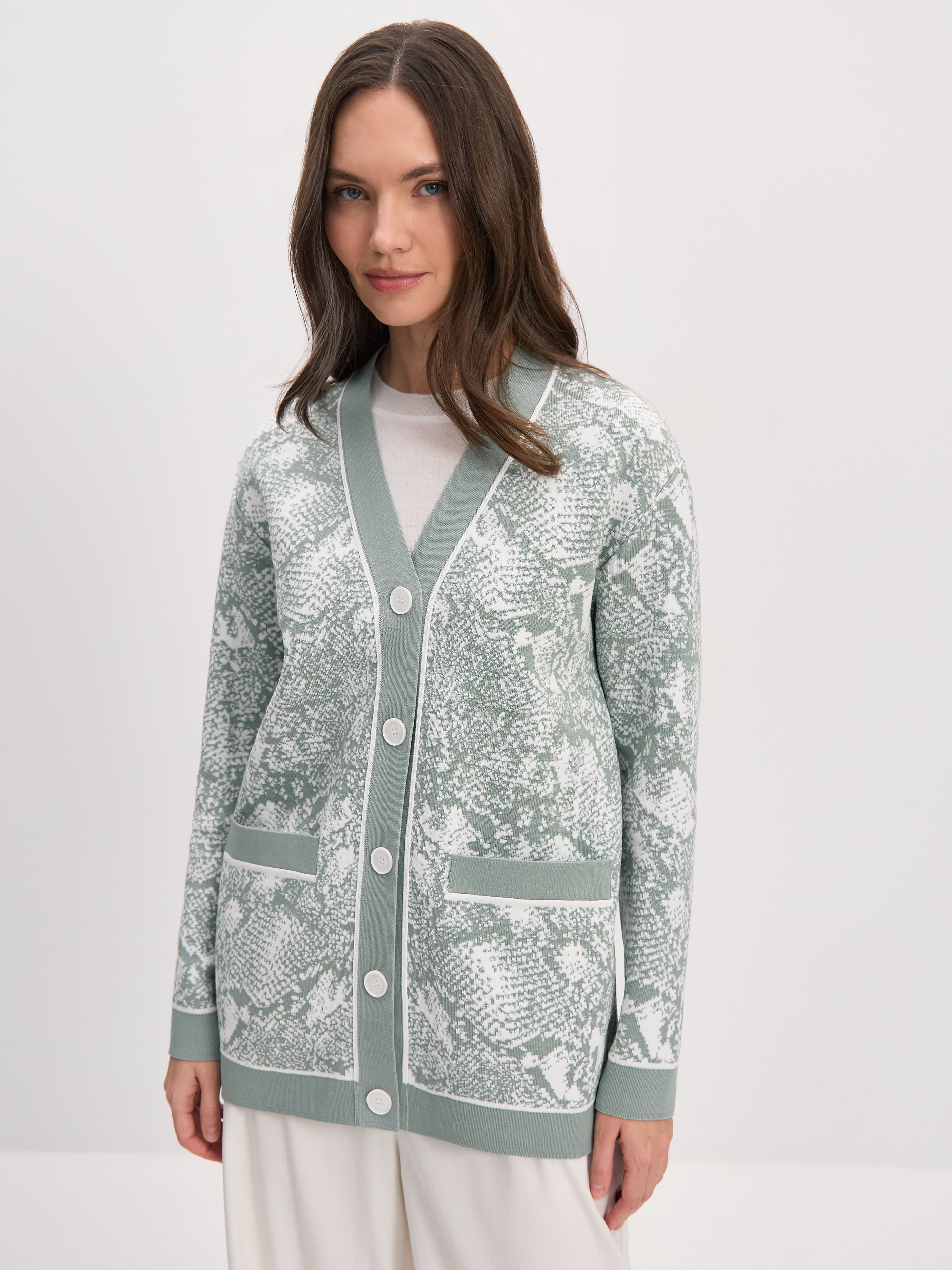 Стильный кардиган из шелковистой, приятной телу вискозы создавался, чтобы поддержать тренд на тактильность. В итоге трикотаж приобрел оптимальную плотность, но остался невероятно комфортным на ощупь. Удлиненная модель дополнительно усилена сложным принтом, так что станет ярким акцентом в любом повседневном образе.