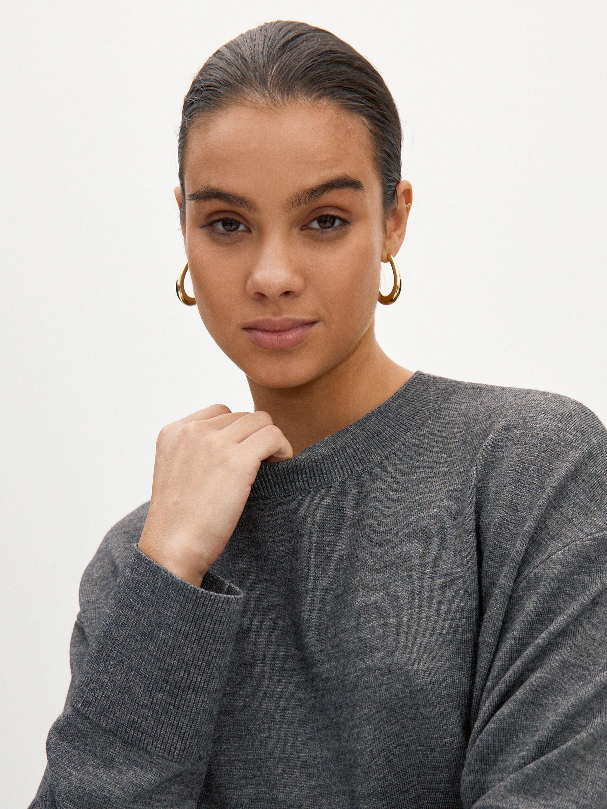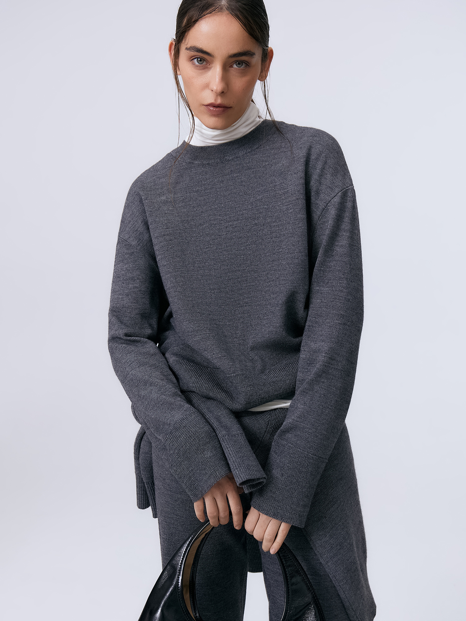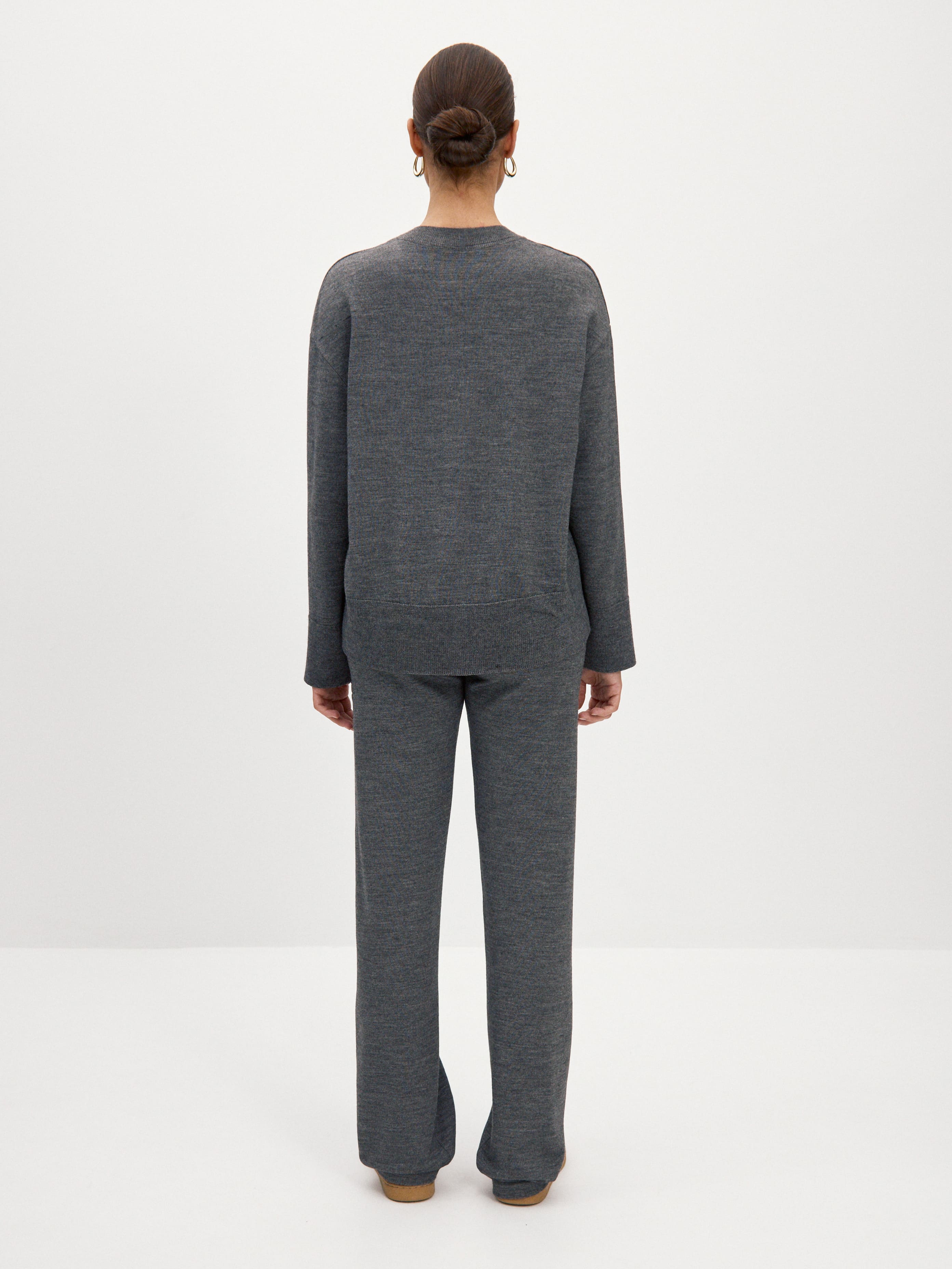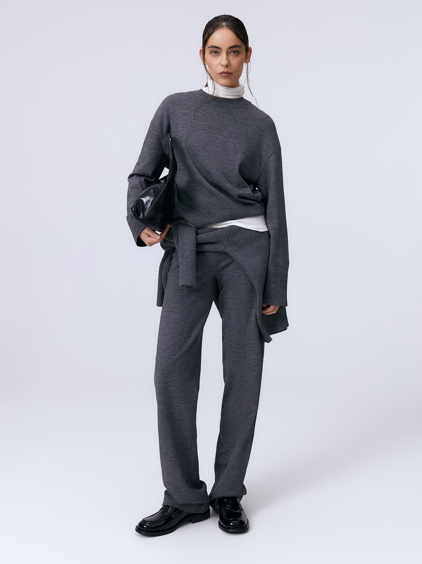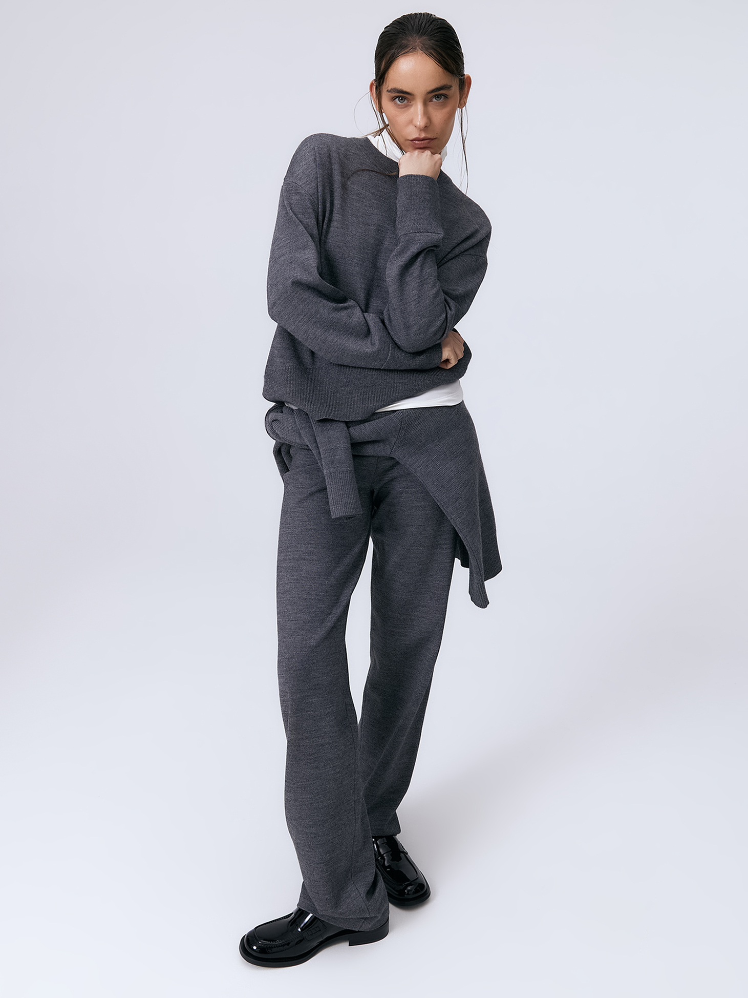 Этот лаконичный костюм с брюками идеально вписывается в концепцию хюгге за счет уютной мягкости и релакс-посадки. Максимально спущенное плечо работает на комфорт движения. Широкая резинка по краю и манжетам выступает фиксатором формы трикотажного полотна. Особенно рекомендуем комплект тем, кто незнаком с тактильными восторгом, который дарит сочетание натуральной шерсти и нежной вискозы.