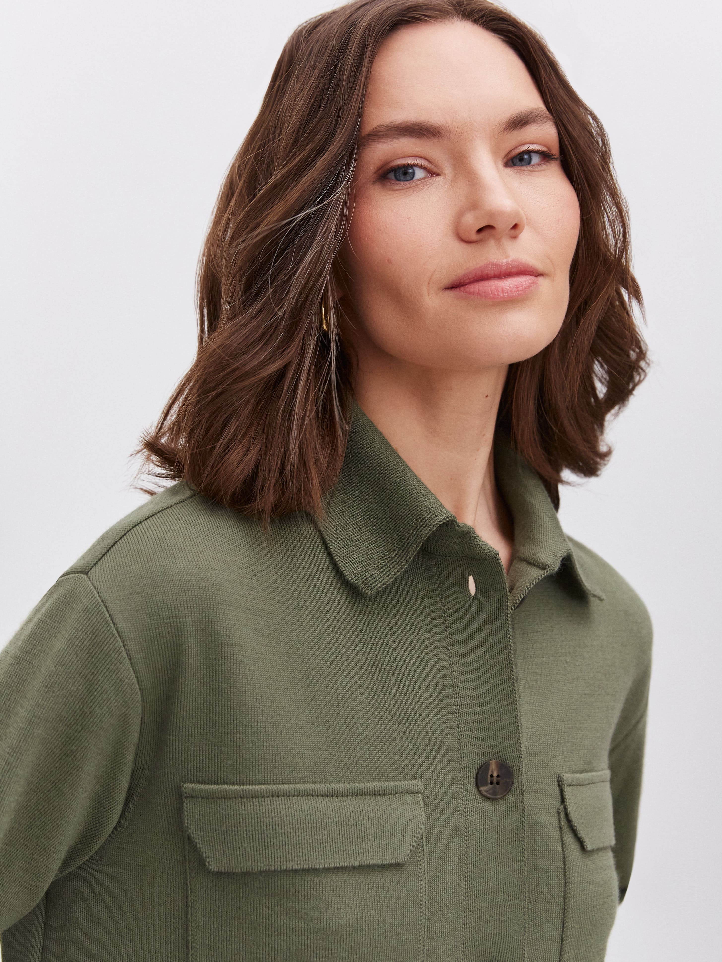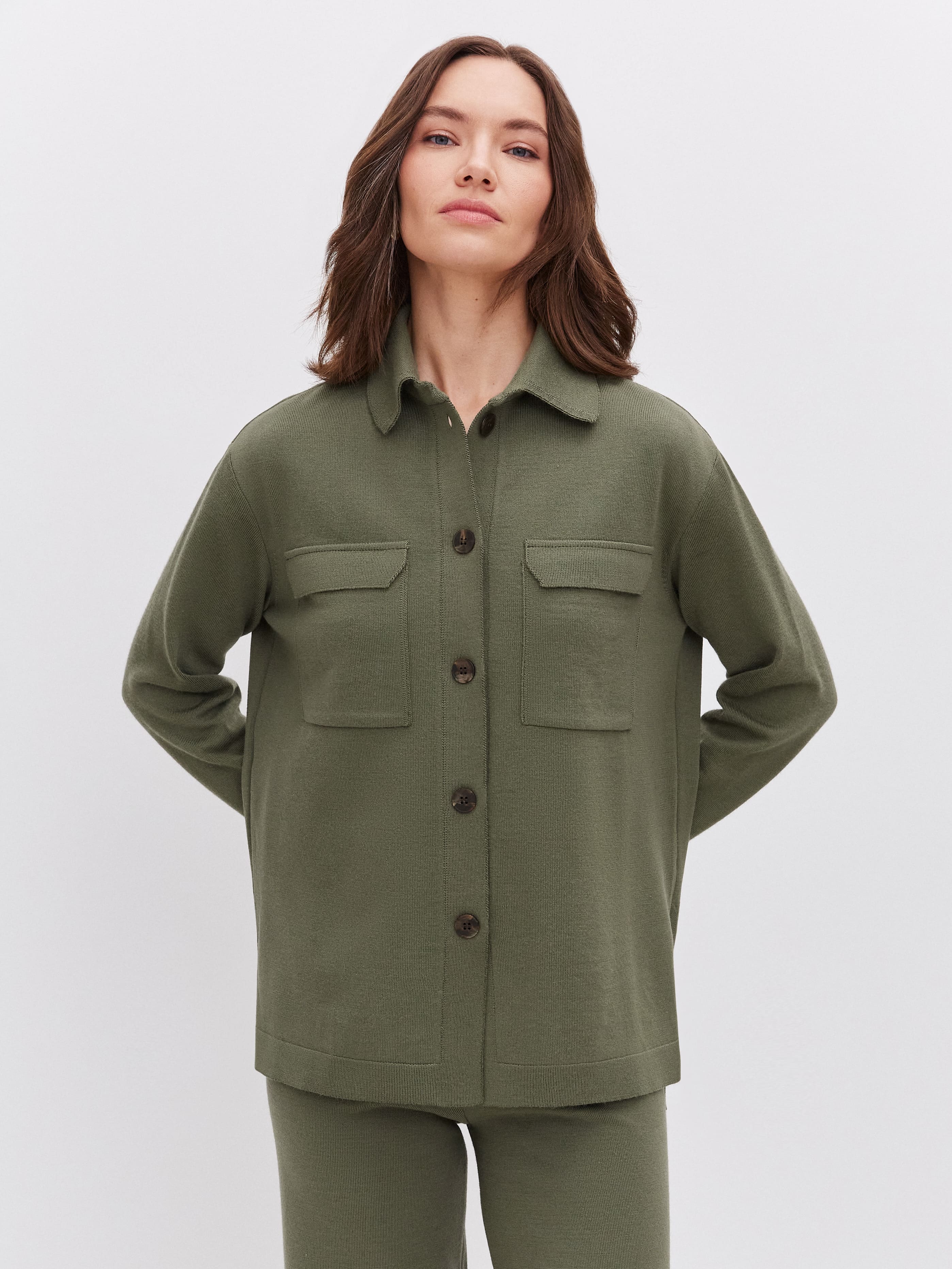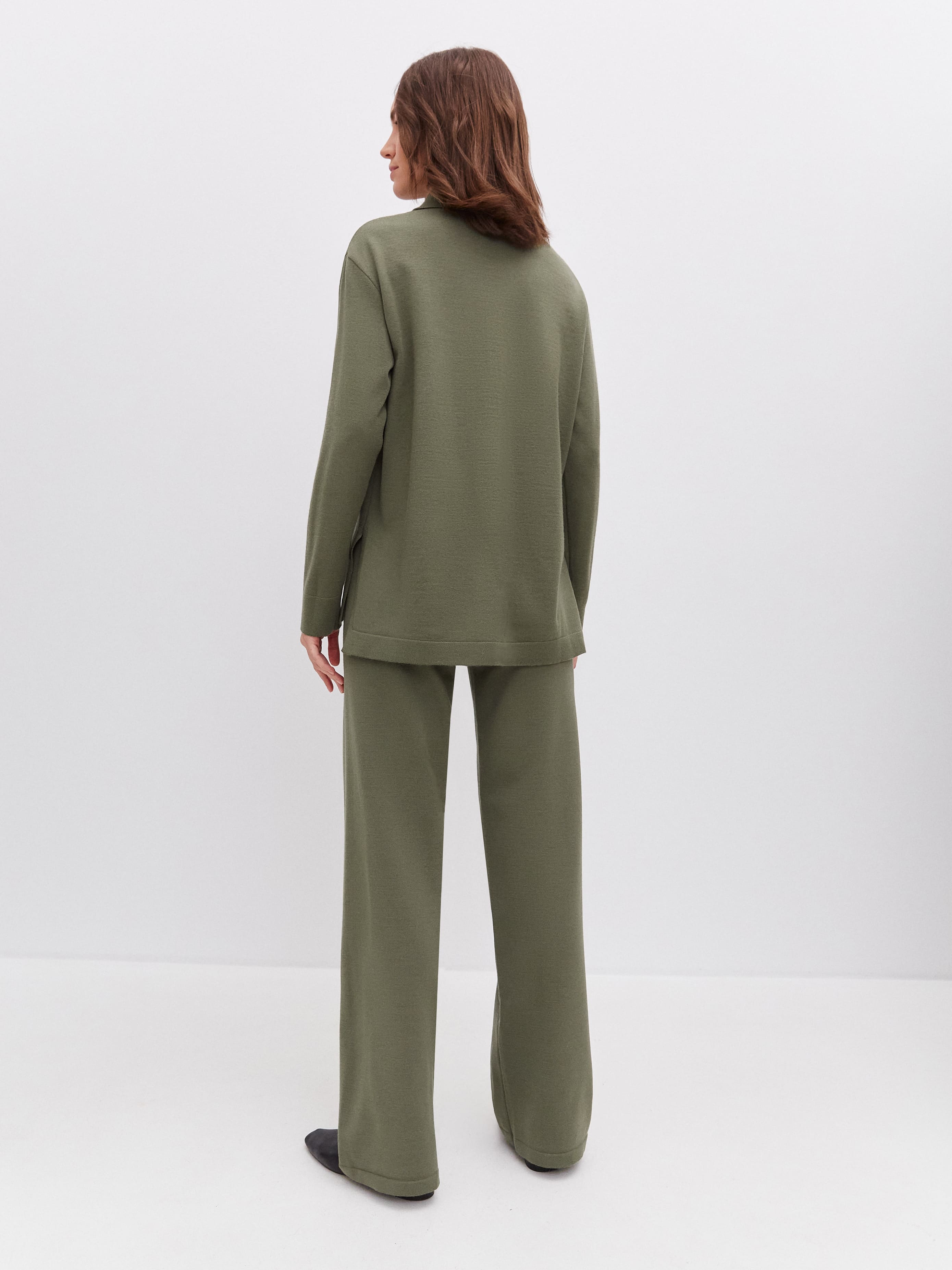 Беспроигрышное сочетание осени – свободные брюки-трубы на регулируемой кулиске и согревающий кардиган-рубашка с накладными карманами. Идеальный комплект, когда хочется получить пластичность и мягкие линии, а не облегание и чрезмерное подчеркивание. Костюм выполнен из тонкого шерстяного трикотажа – воздухопроницаемого, гипоаллергенного, приятного на ощупь.