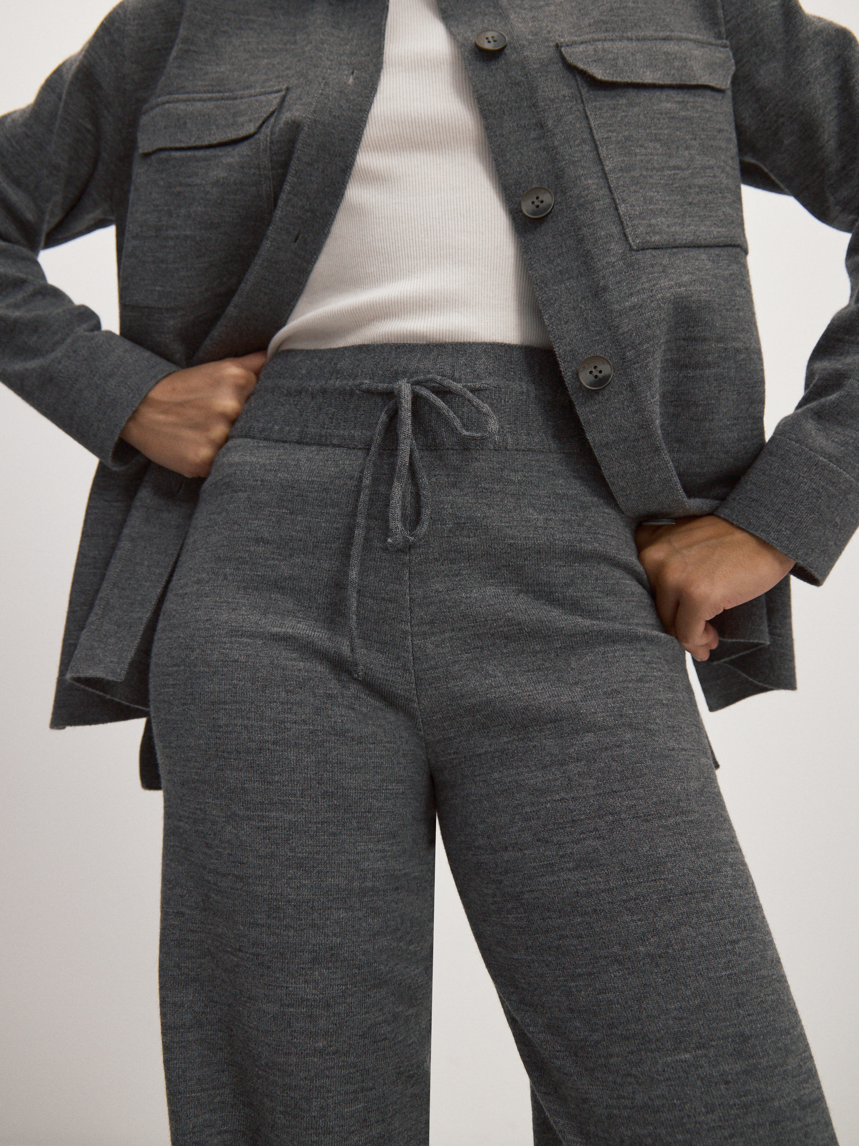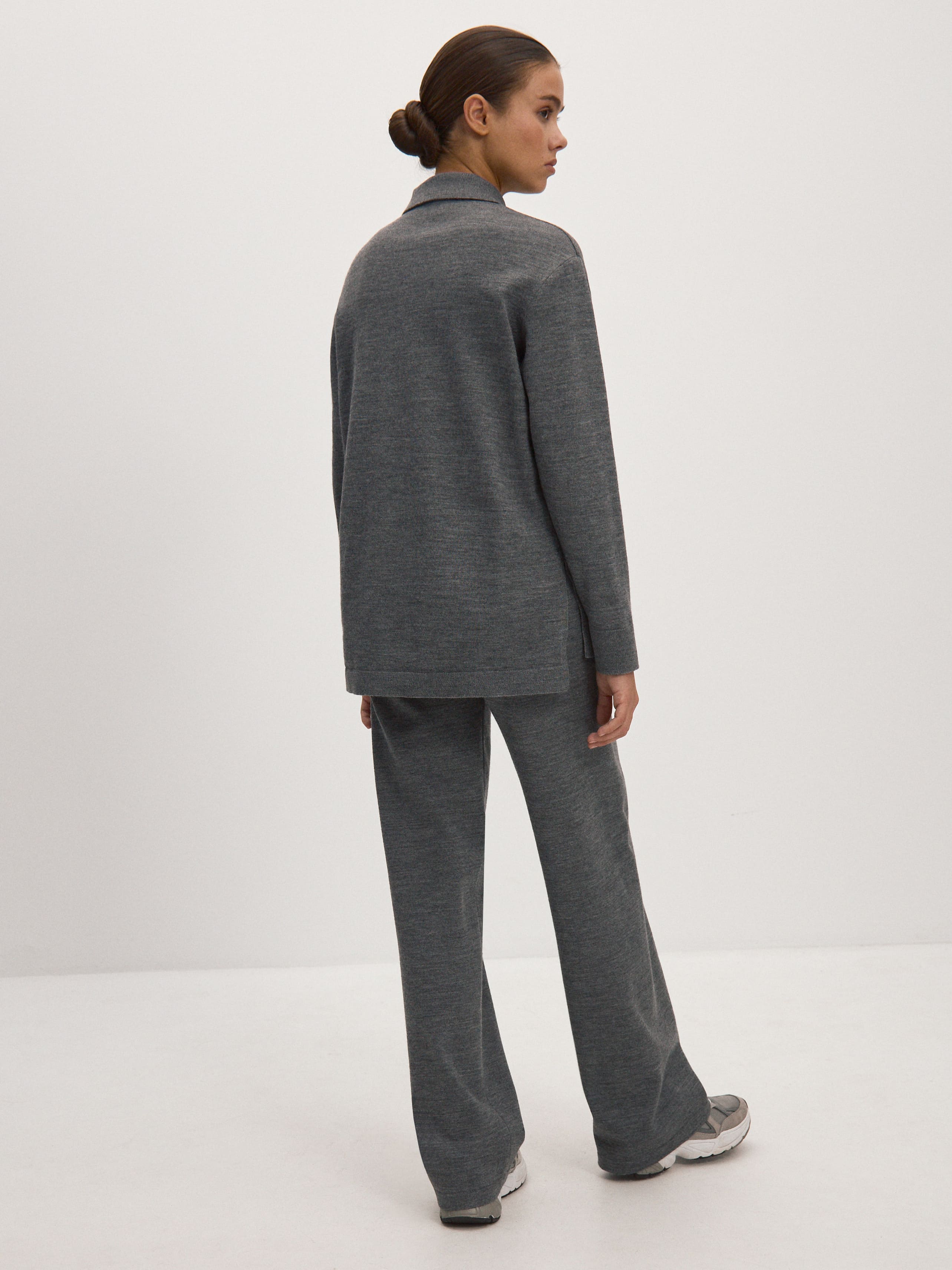 Беспроигрышное сочетание осени – свободные брюки-трубы на регулируемой кулиске и согревающий кардиган-рубашка с накладными карманами. Идеальный комплект, когда хочется получить пластичность и мягкие линии, а не облегание и чрезмерное подчеркивание. Костюм выполнен из тонкого шерстяного трикотажа – воздухопроницаемого, гипоаллергенного, приятного на ощупь.