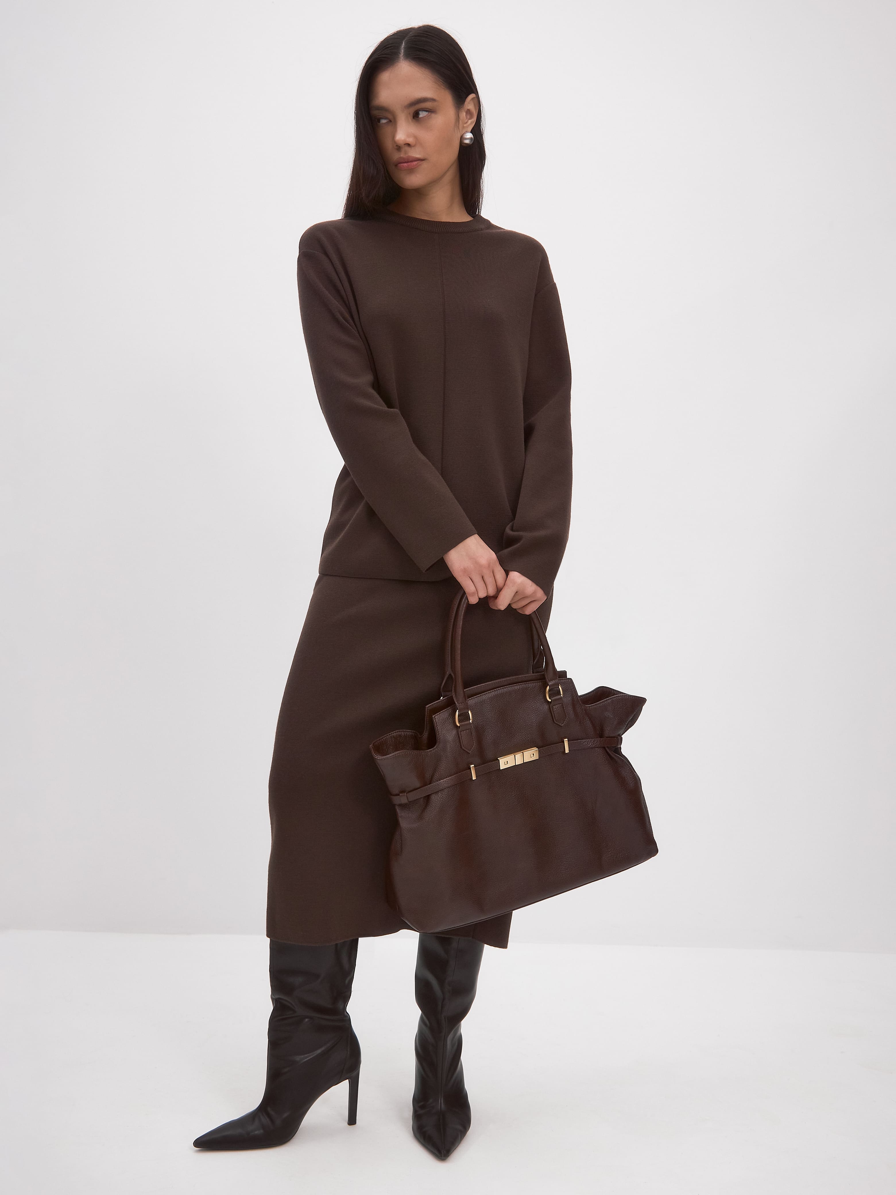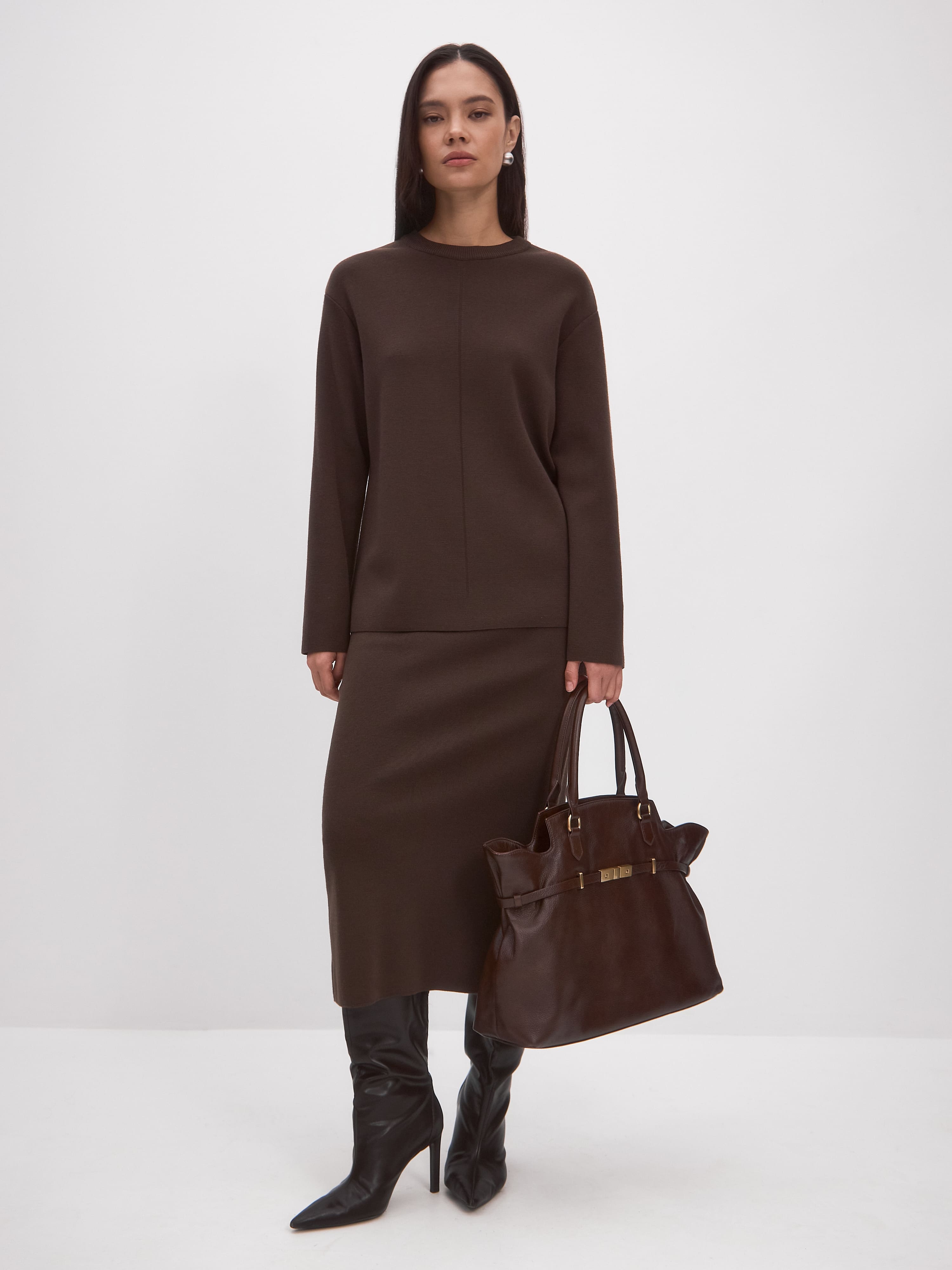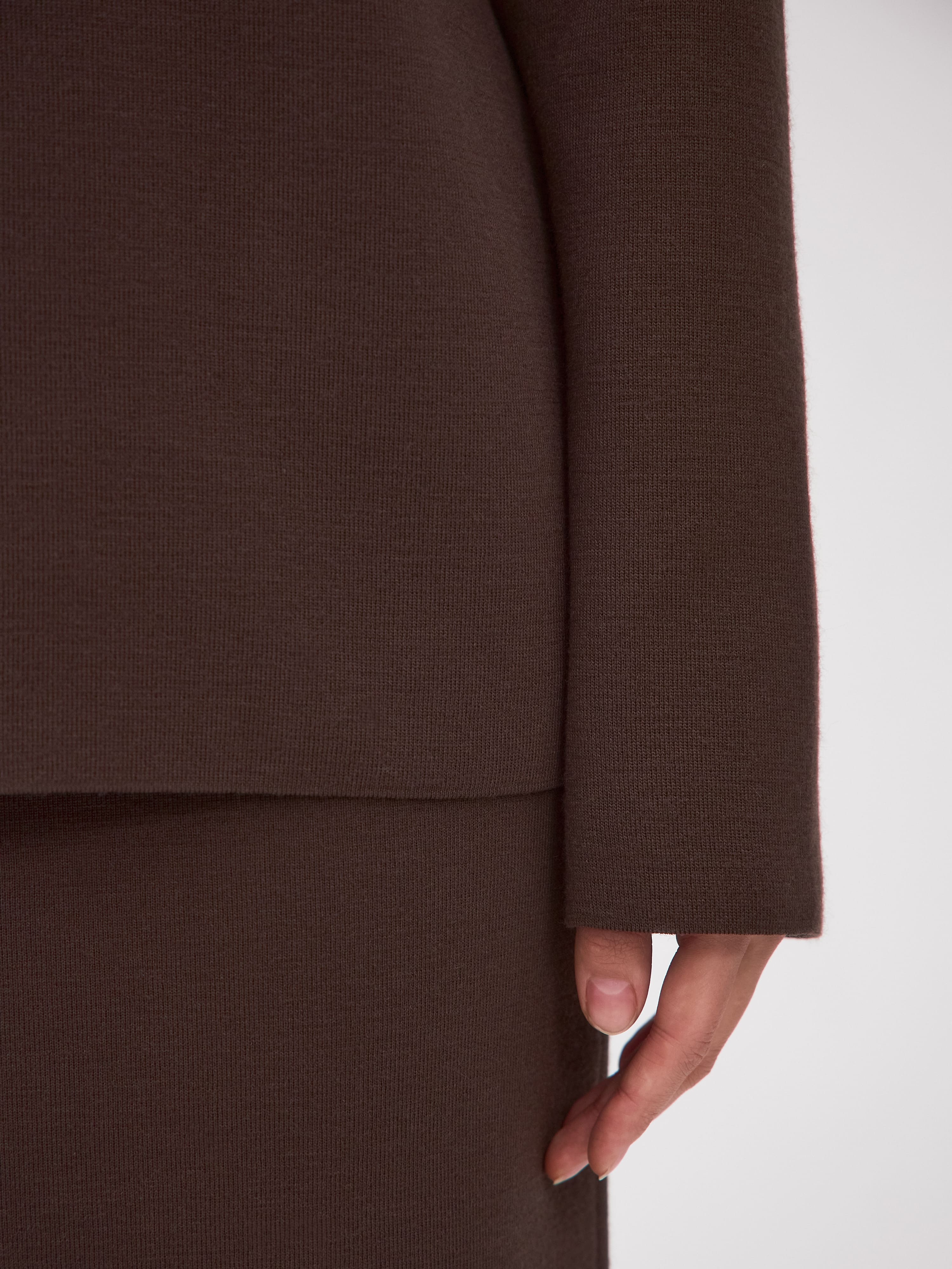 Мягкий силуэт этого костюма станет стилеобразующей базой для монохромных образов. Плотный трикотаж дышит и согревает. А строгий офисный фасон легко преобразовать в дорогой вечерний при помощи модной сумки, акцентных аксессуаров и правильной обуви. Связанный из шерсти тонкорунного мериноса с добавлением вискозы, этот комплект обладает способностью долго не отпускать тепло и не терять первоначальную форму.<br />