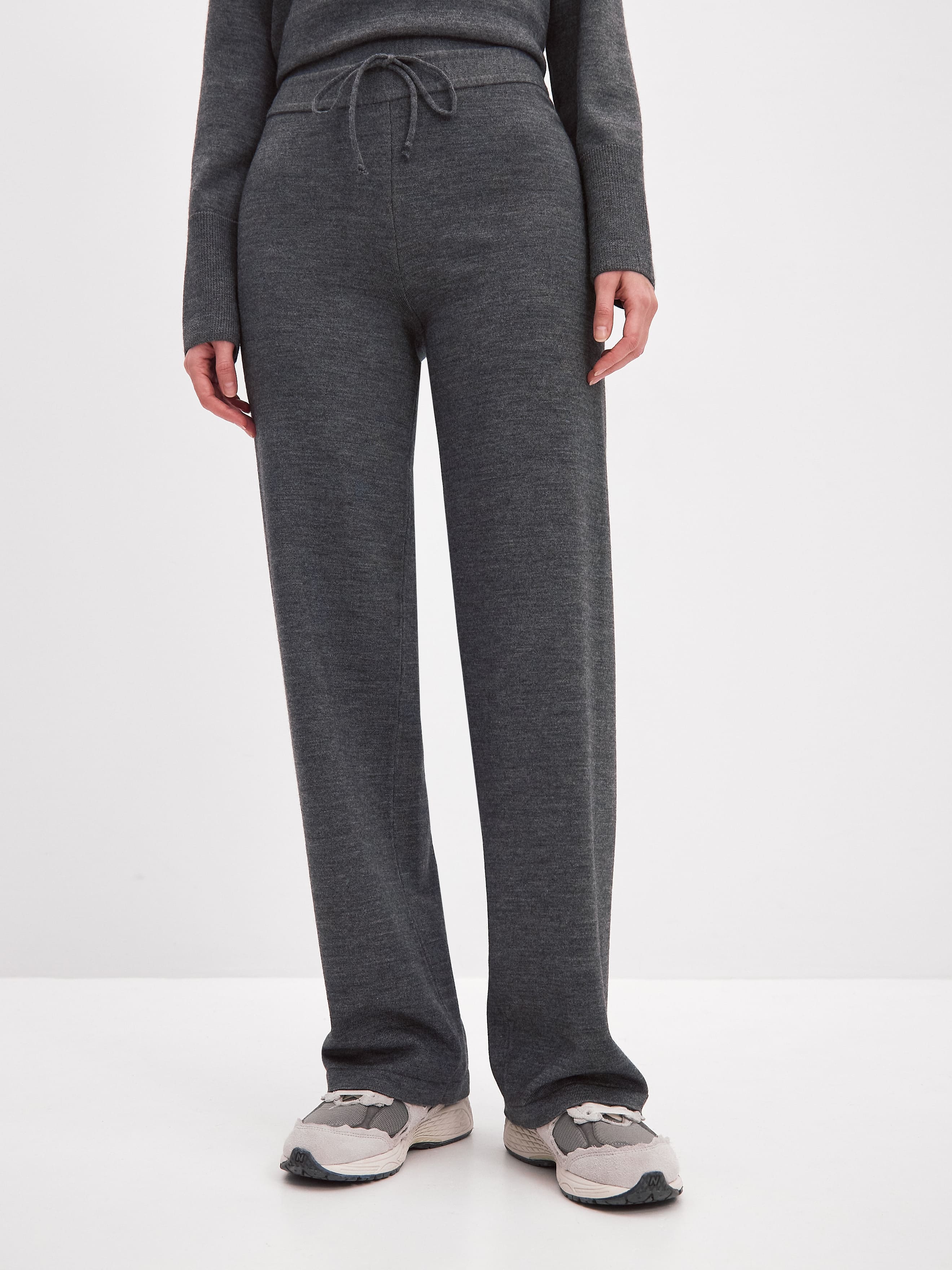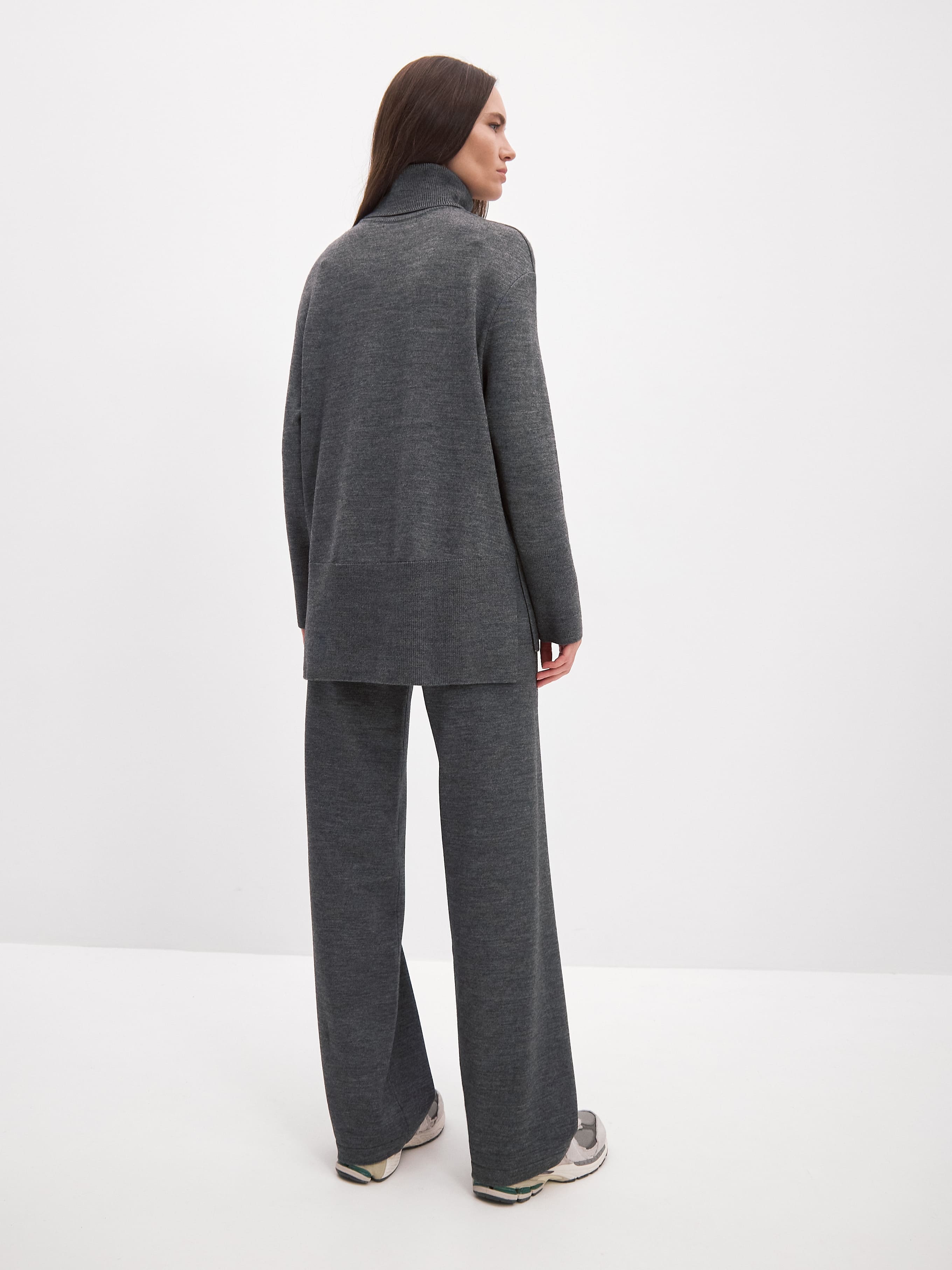 Благородная мягкость этого костюма ощущается даже при одном взгляде на него. Предельно спущенный рукав, уютно расслабленная горловина и комфортная посадка широких, не сковывающих движения брюк – лучше не придумаешь, чтобы посидеть за кофе с подружкой, а затем отправиться по магазинам. Сбалансированный шерстяной трикотаж с вискозой гарантирует бережное прикосновение к коже и красивую тяжелую складку, которой ложится джемпер из комплекта.