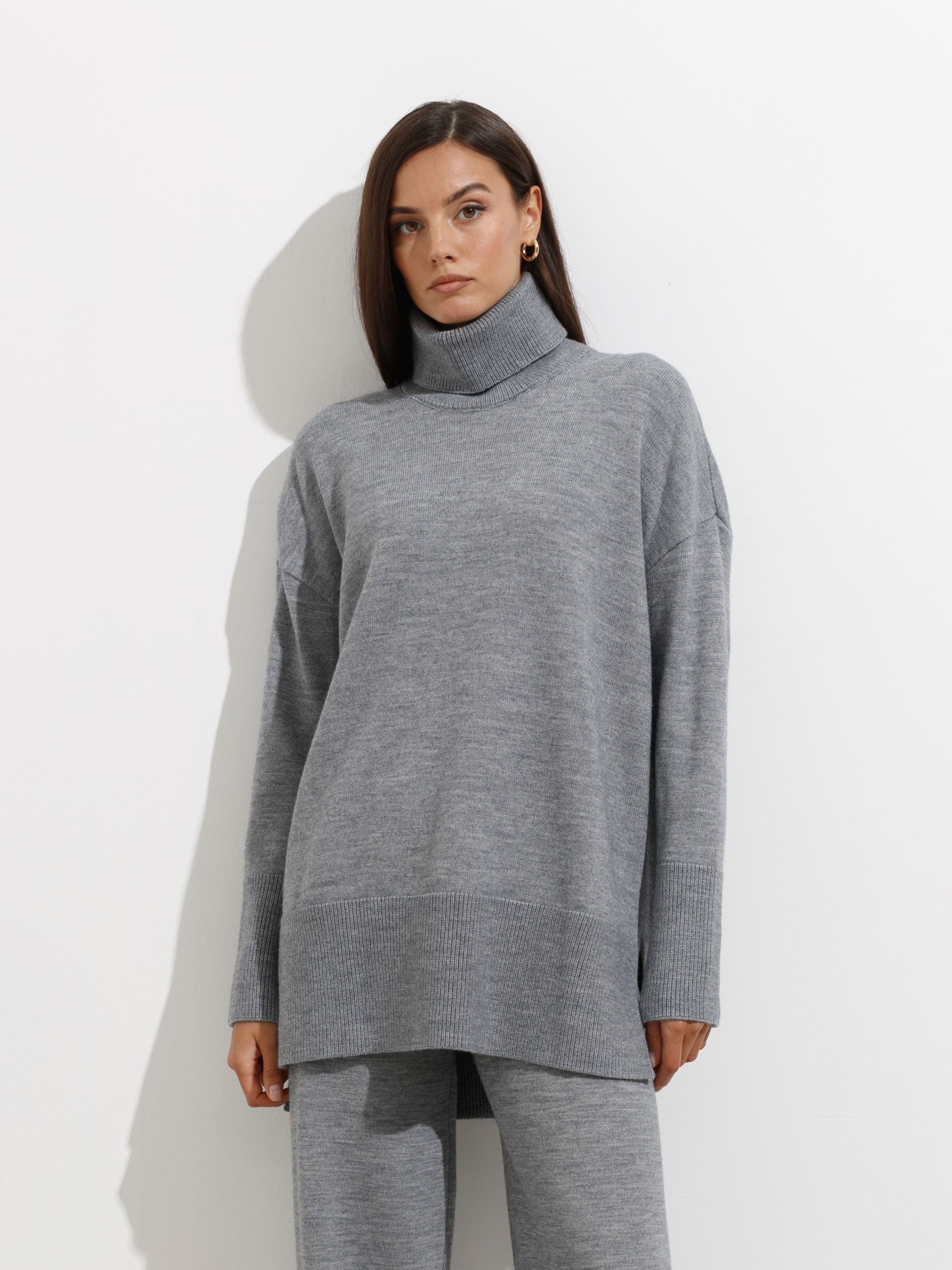 Благородная мягкость этого костюма ощущается даже при одном взгляде на него. Предельно спущенный рукав, уютно расслабленная горловина и комфортная посадка широких, не сковывающих движения брюк – лучше не придумаешь, чтобы посидеть за кофе с подружкой, а затем отправиться по магазинам. Сбалансированный шерстяной трикотаж с вискозой гарантирует бережное прикосновение к коже и красивую тяжелую складку, которой ложится джемпер из комплекта.