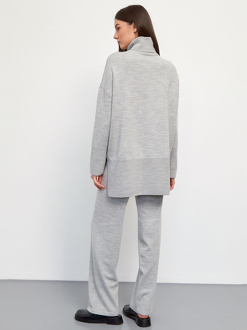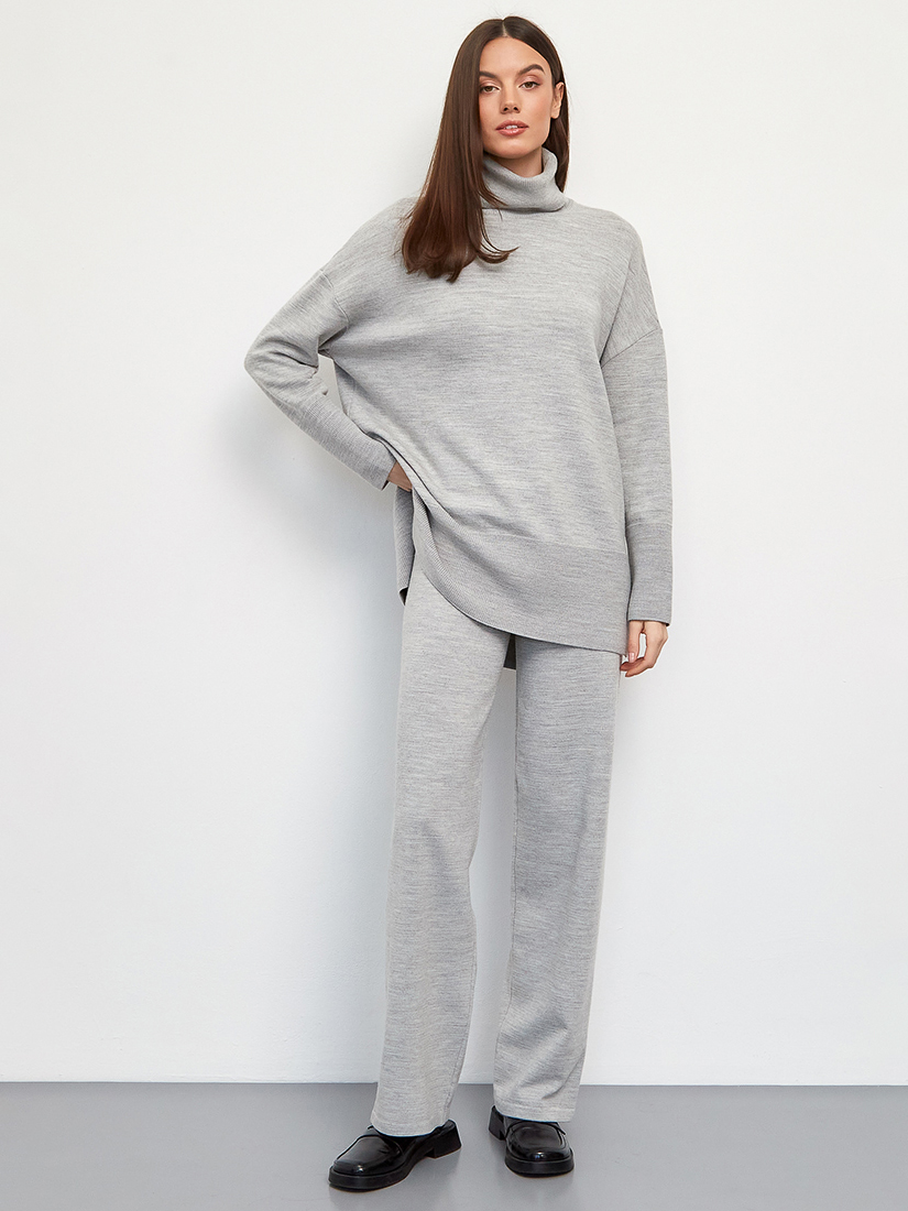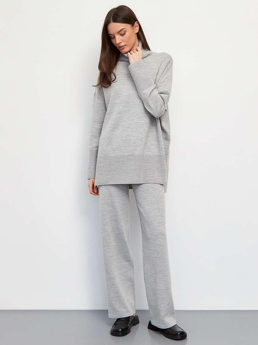 Благородная мягкость этого костюма ощущается даже при одном взгляде на него. Предельно спущенный рукав, уютно расслабленная горловина и комфортная посадка широких, не сковывающих движения брюк – лучше не придумаешь, чтобы посидеть за кофе с подружкой, а затем отправиться по магазинам. Сбалансированный шерстяной трикотаж с вискозой гарантирует бережное прикосновение к коже и красивую тяжелую складку, которой ложится джемпер из комплекта.