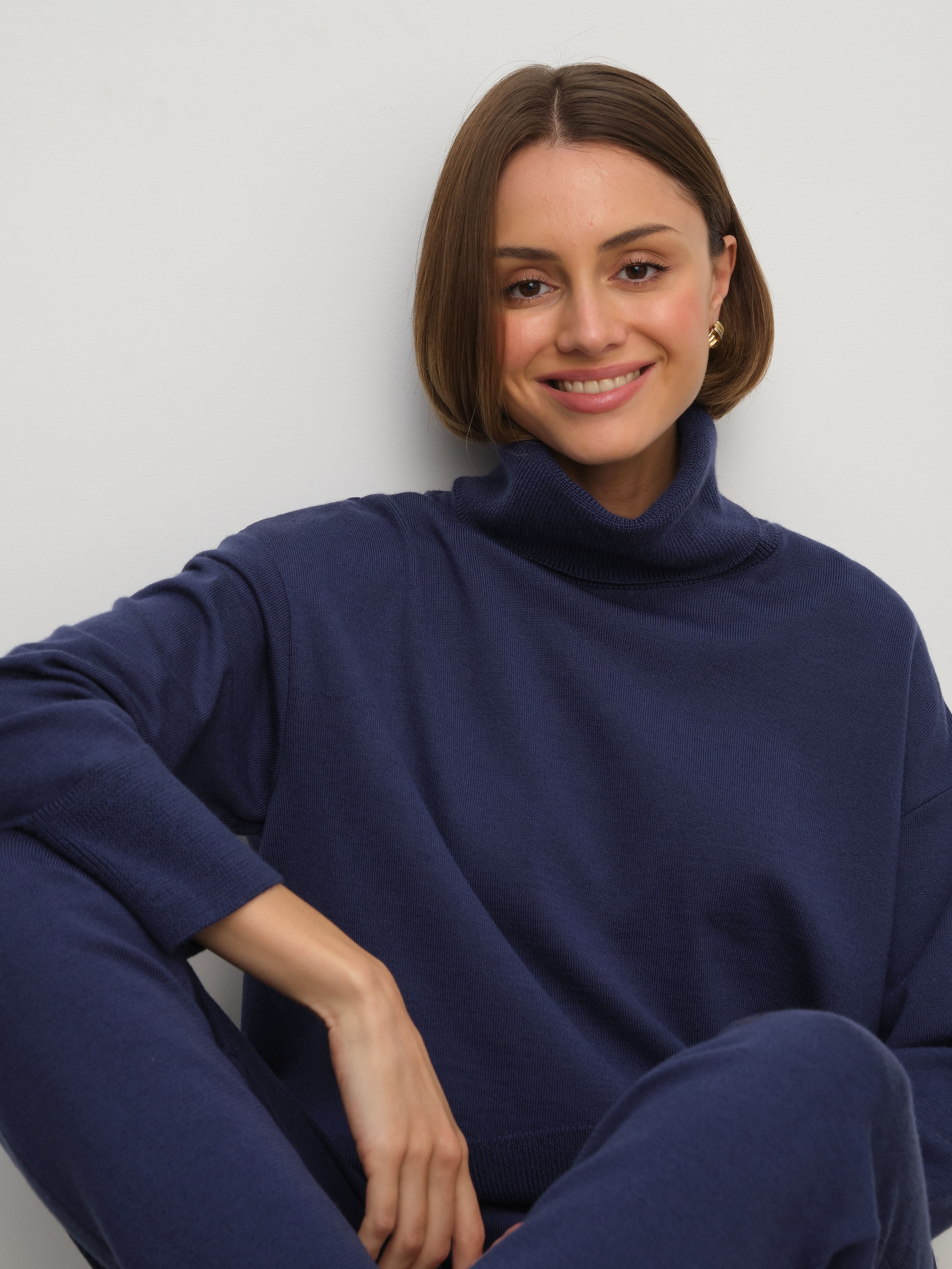 В этой шерстяной двойке мы попытались передать философию расслабленного, мягко струящегося силуэта. Уютный джемпер с высоким горлом гармонично сочетается с удобными брюками на кулиске. А гладкая вискоза в составе сработала на защиту трикотажной формы от обвисания и растягивания. Можно носить полноценным комплектом или использовать каждую вещь как самостоятельную составляющую образа.
