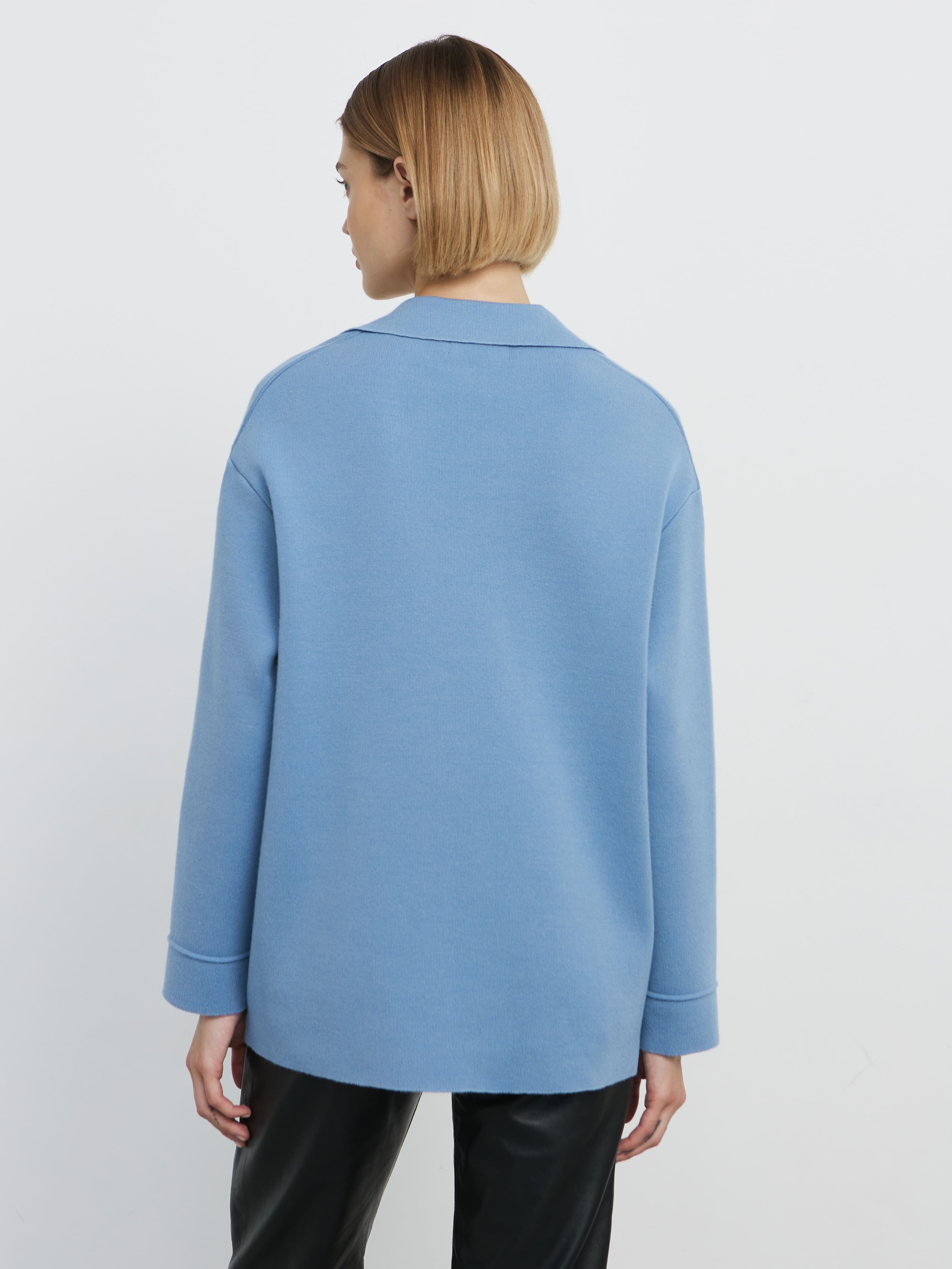 Просторный, утепленный шерстью жакет из формоустойчивого трикотажа. Чтобы слегка отойти от объемного силуэта, мы добавили в него графичные элементы – прямоугольные карманы, английский воротник, косой срез на борте. При желании строгость прямых линий легко «разбавляется» воздушной блузкой, летящим платьем или широкими пластичными брюками.