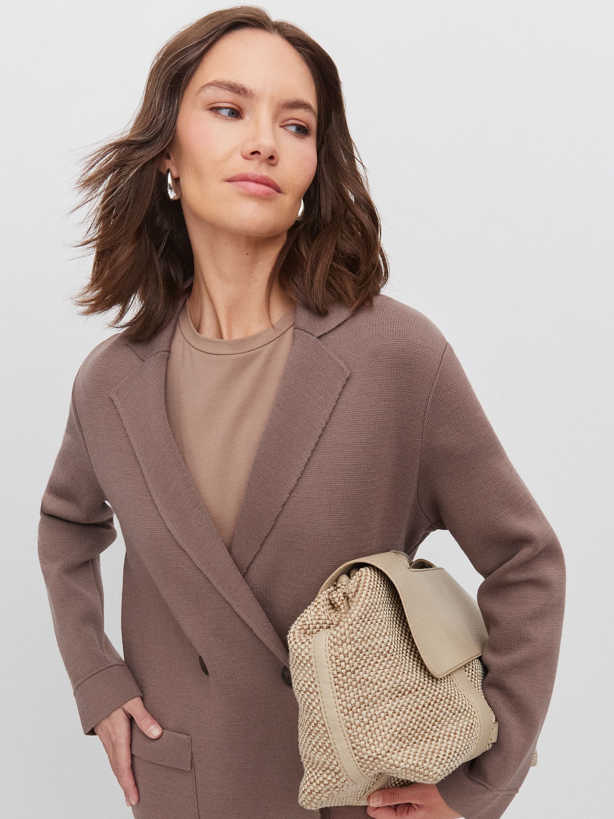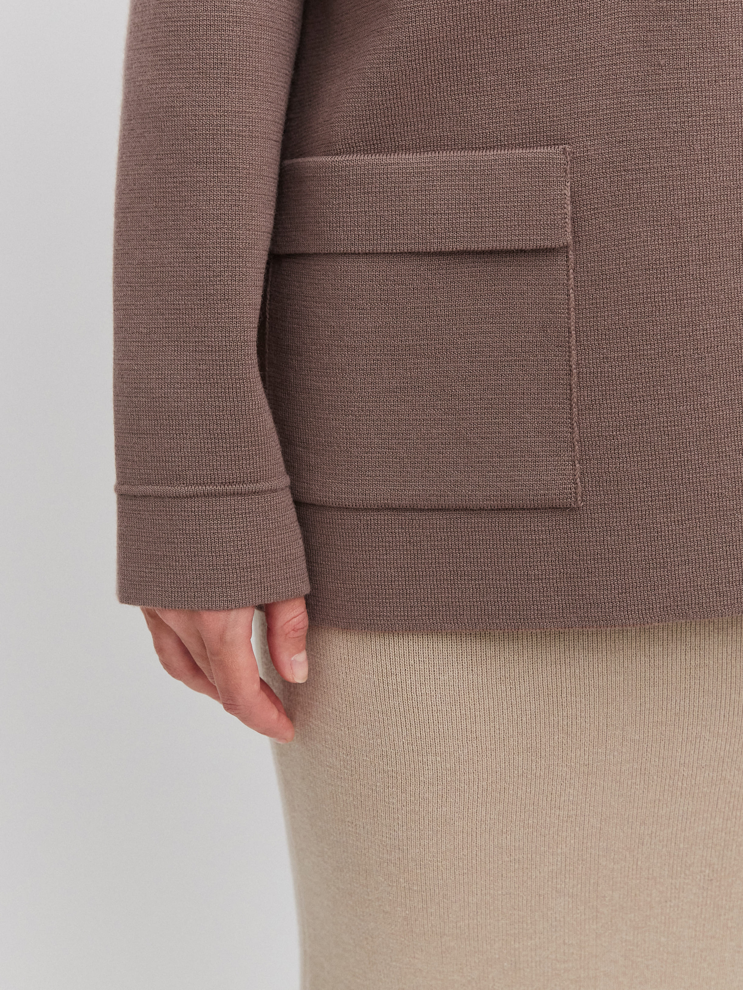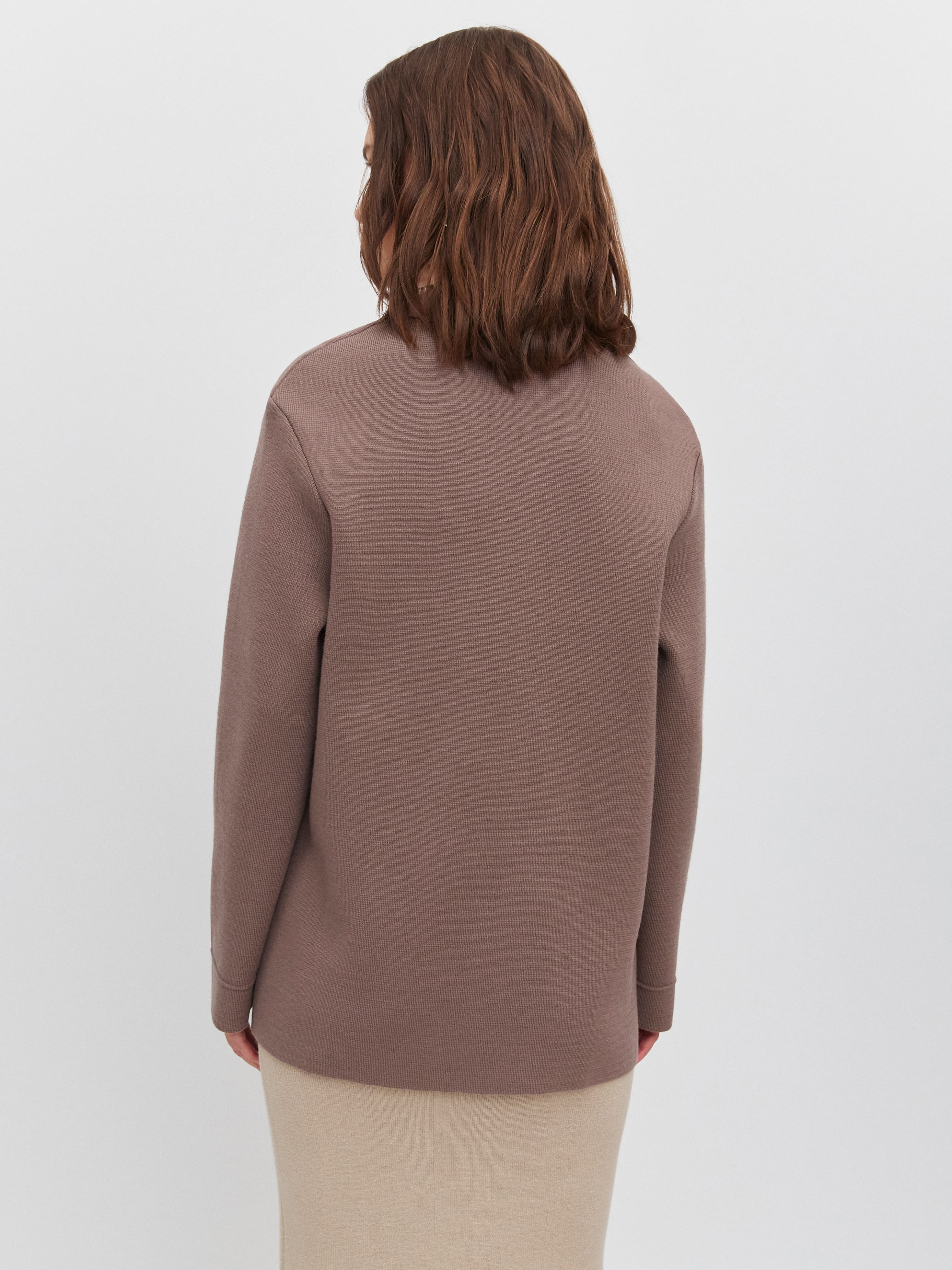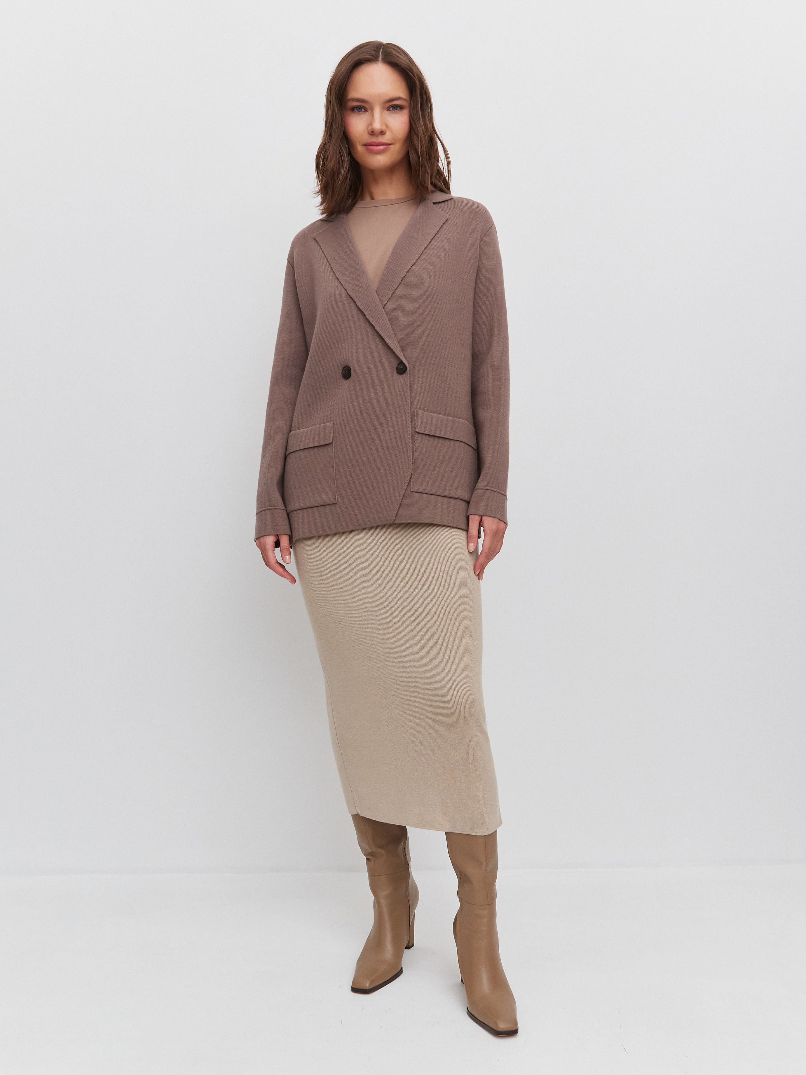 Просторный, утепленный шерстью жакет из формоустойчивого трикотажа. Чтобы слегка отойти от объемного силуэта, мы добавили в него графичные элементы – прямоугольные карманы, английский воротник, косой срез на борте. При желании строгость прямых линий легко «разбавляется» воздушной блузкой, летящим платьем или широкими пластичными брюками.