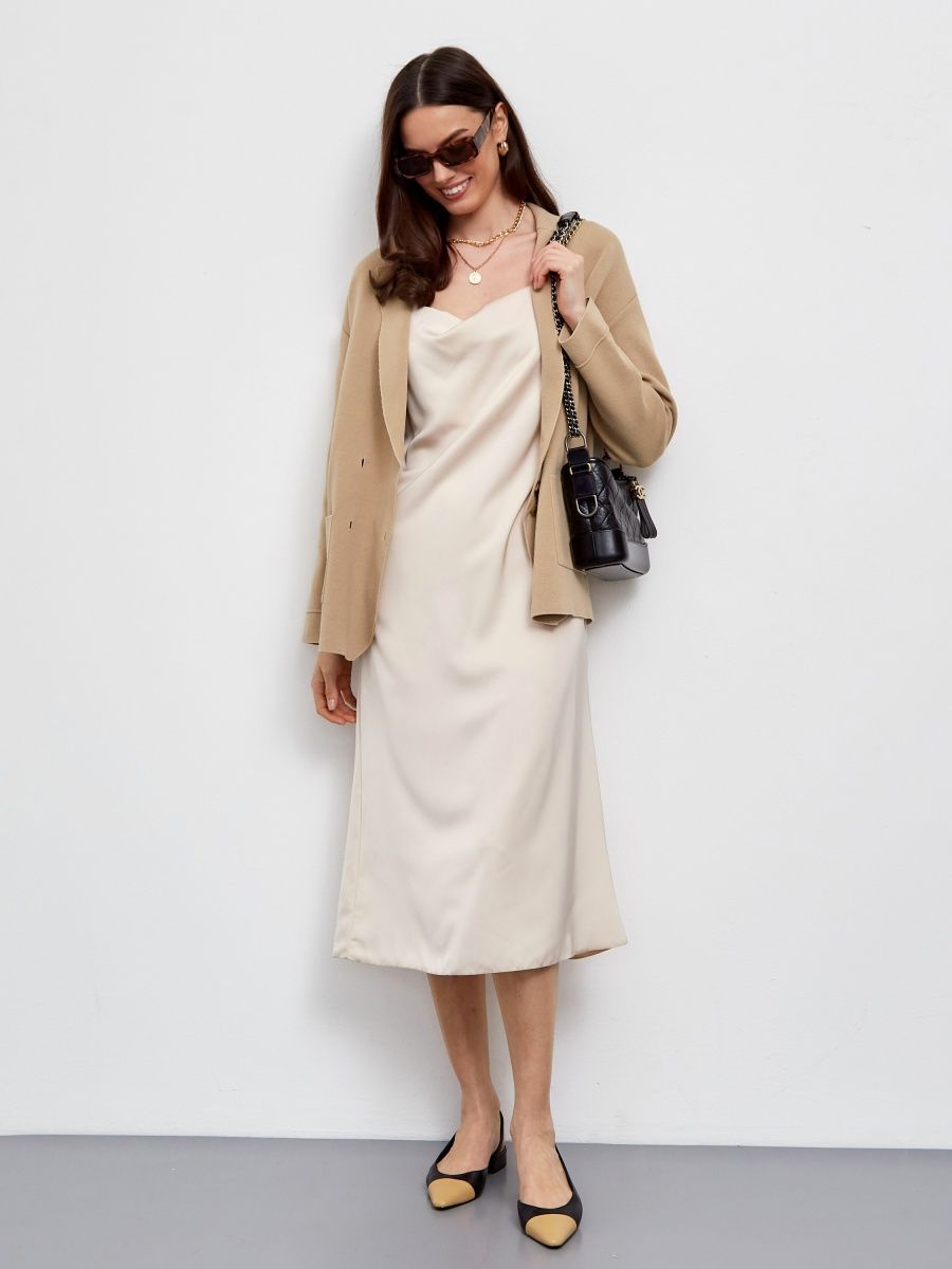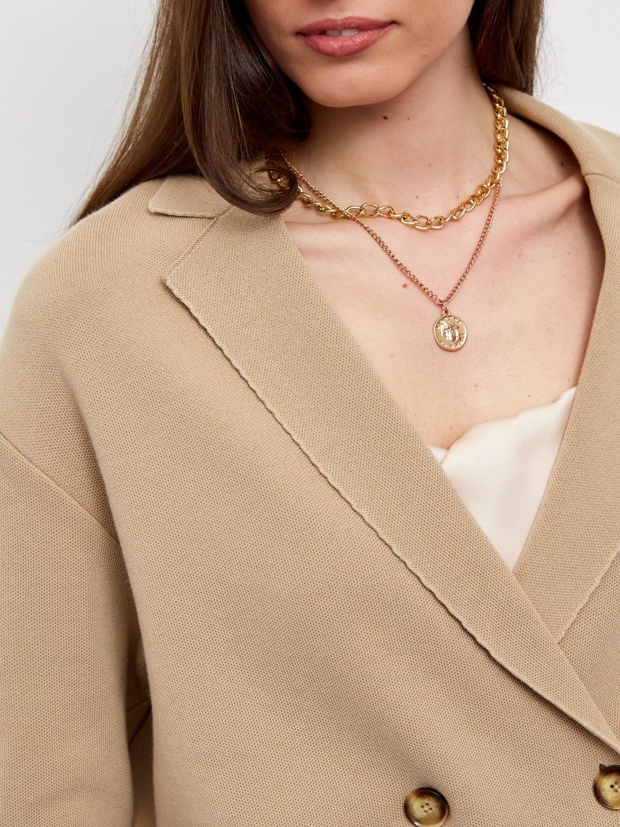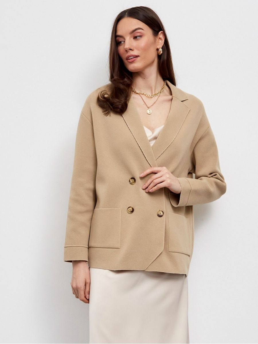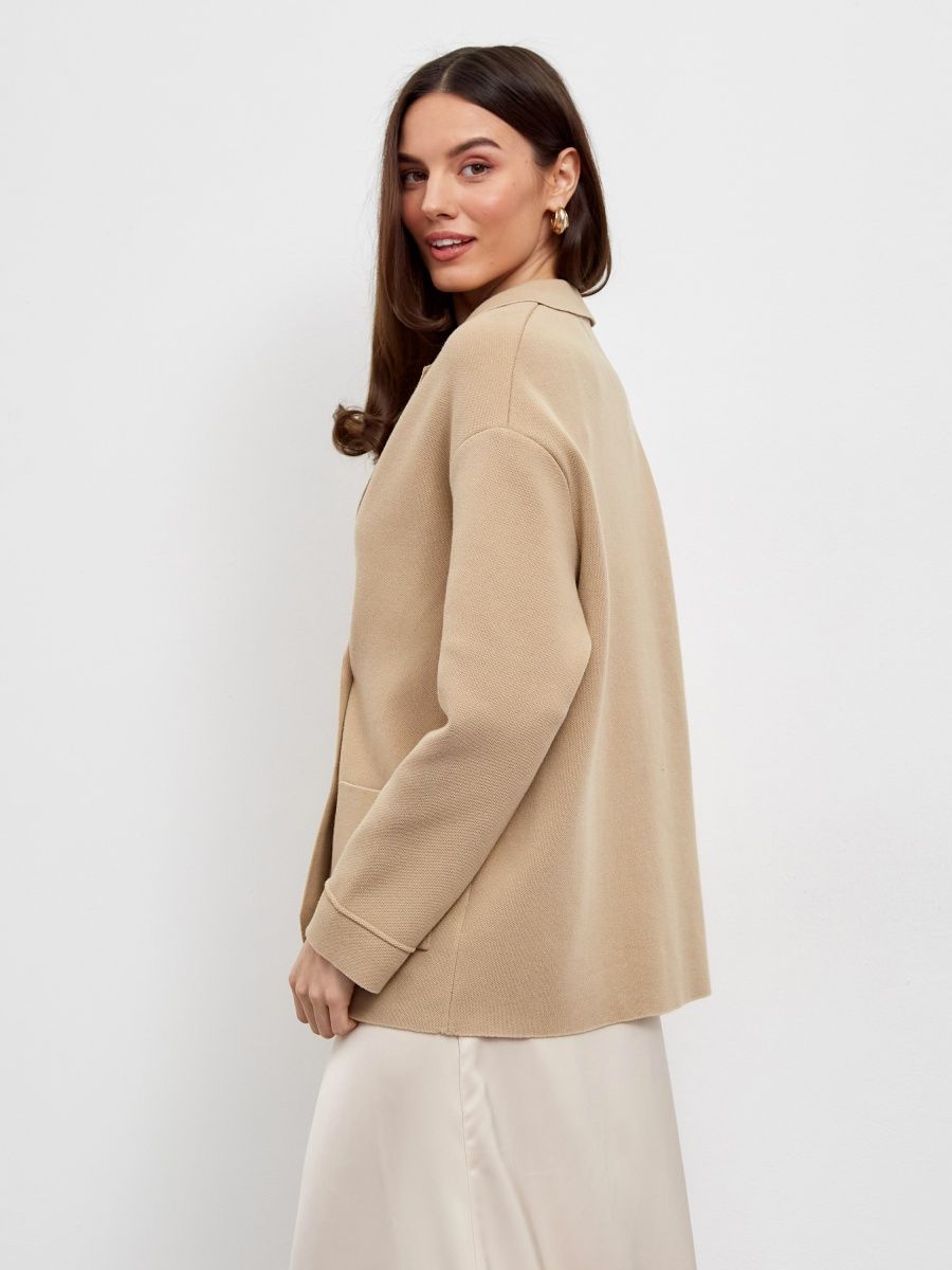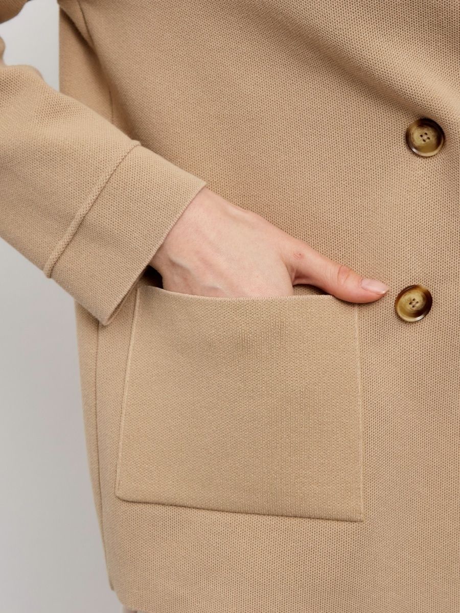 Объемный трикотажный пиджак из длинноволокнистого, не распушивающегося хлопка. Большие квадратные карманы и английский воротник уравновешиваются мягко приспущенным плечом и не уводят лук в откровенную маскулинность. Это позволяет подружить жакет как со строгим офисным гардеробом, так и с эклектичными отпускными капсулами. Натуральный трикотаж обладает уникальными терморегулирующими характеристиками – согревает, когда нужно и отводит избыток тепла в знойные дни.