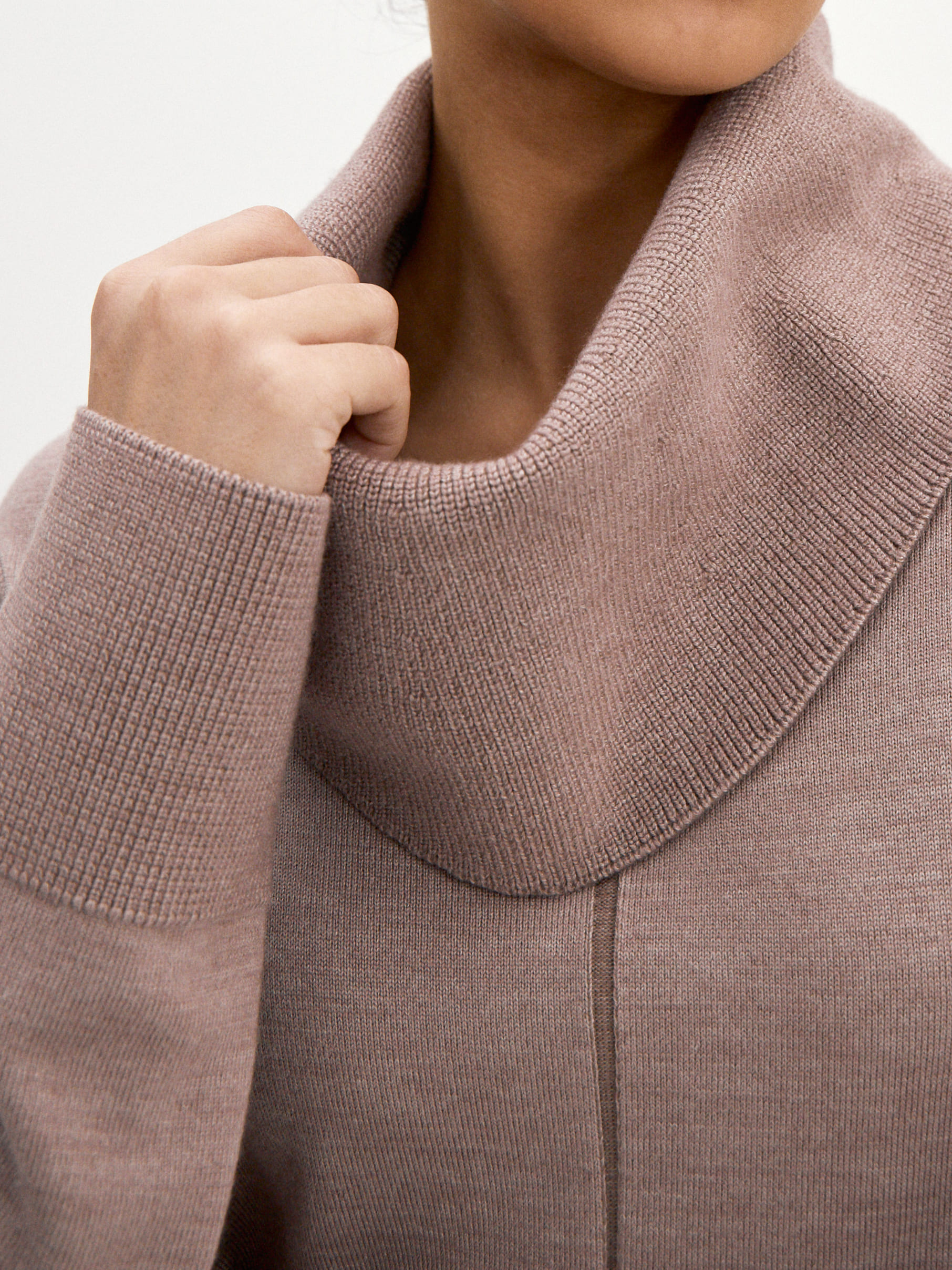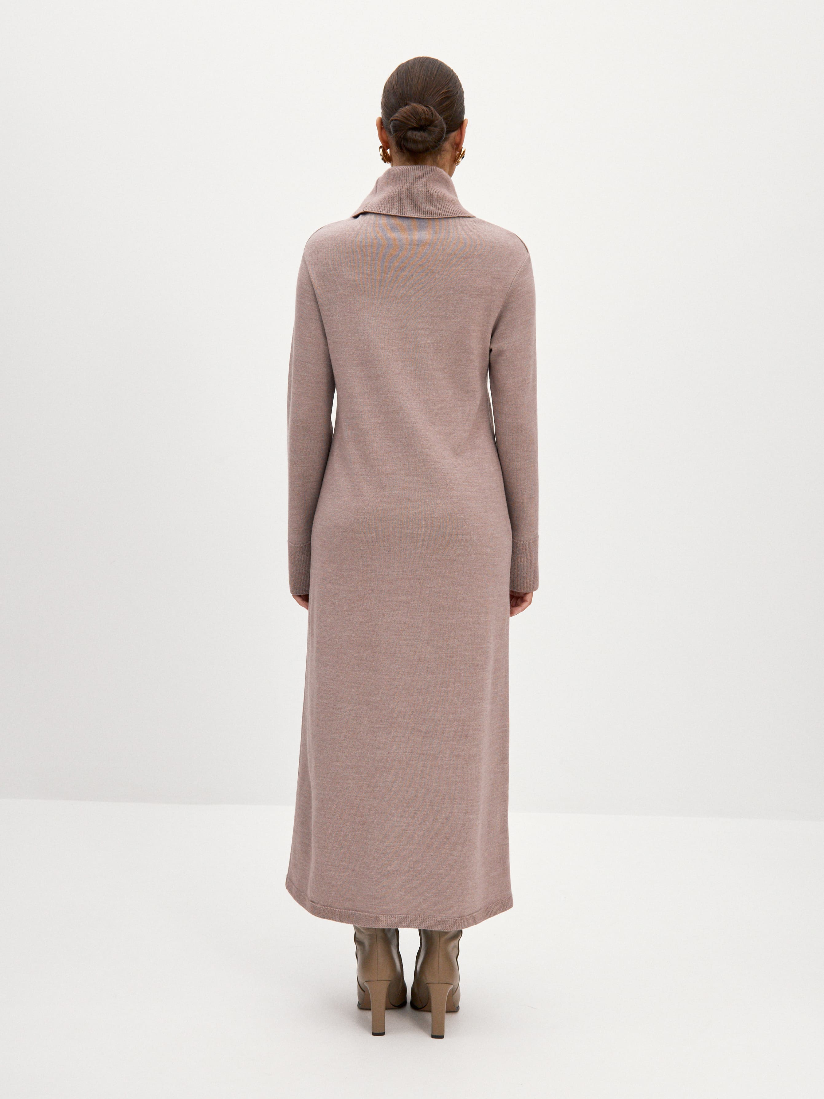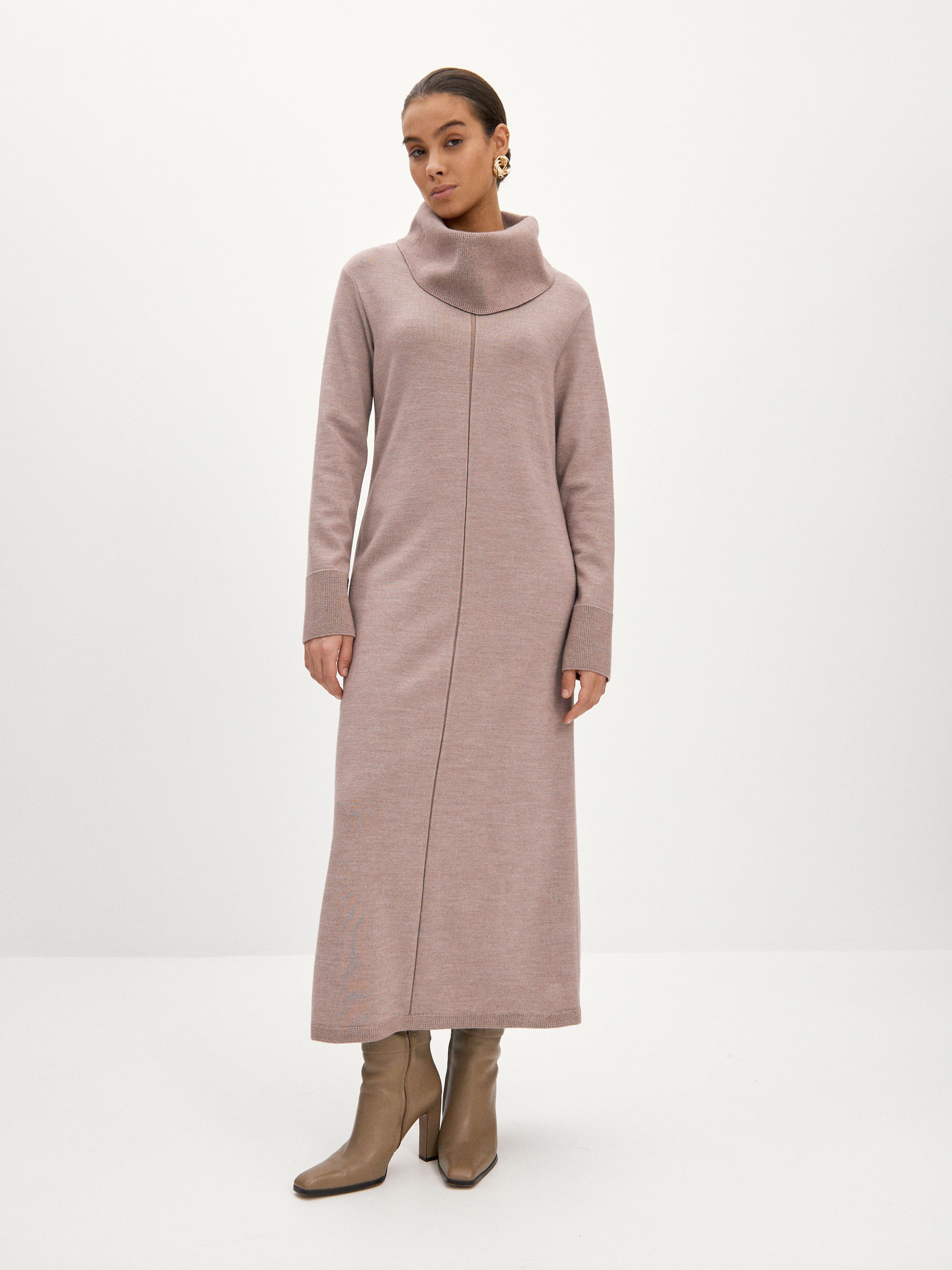 Вязаное платье макси из мериносовой полушерсти. Базовая модель из трикотажа плотного плетения с высокой, подворачивающейся горловиной. Безупречно справляется с двумя важными функциями – окутывает комфортом от шеи до щиколоток и формирует красивый силуэт. Ключевые нюансы фасона: крой с полуприлеганием и полноценные втачные рукава. Края рукавов и подола, несущие на себе основную нагрузку, защищены от вытягивания уплотненной кромкой. Внимание! Чтобы платье корректно село по фигуре, рекомендуем сочетать его с бесшовным/корректирующим бельем.