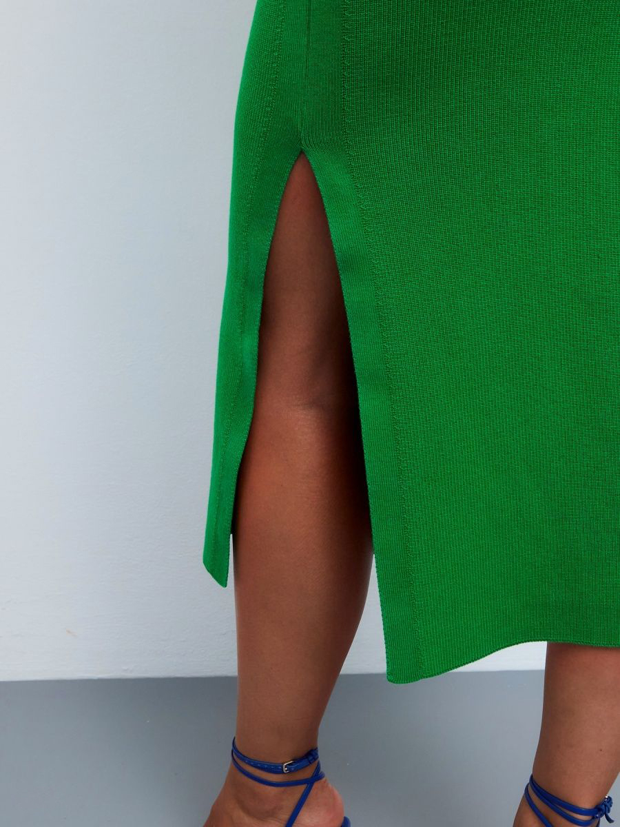 Силуэтное платье из вискозы с беспроигрышным комбо – вырезом «американка» и сексуальным разрезом до бедра. Плотный шелковистый трикотаж красиво ложится по самым выступающим точкам силуэта. Результат: идеальное облегание без просвечивания и акцента на мелких несовершенствах. Идеально смотрится в тандеме с бесшовным бельем.